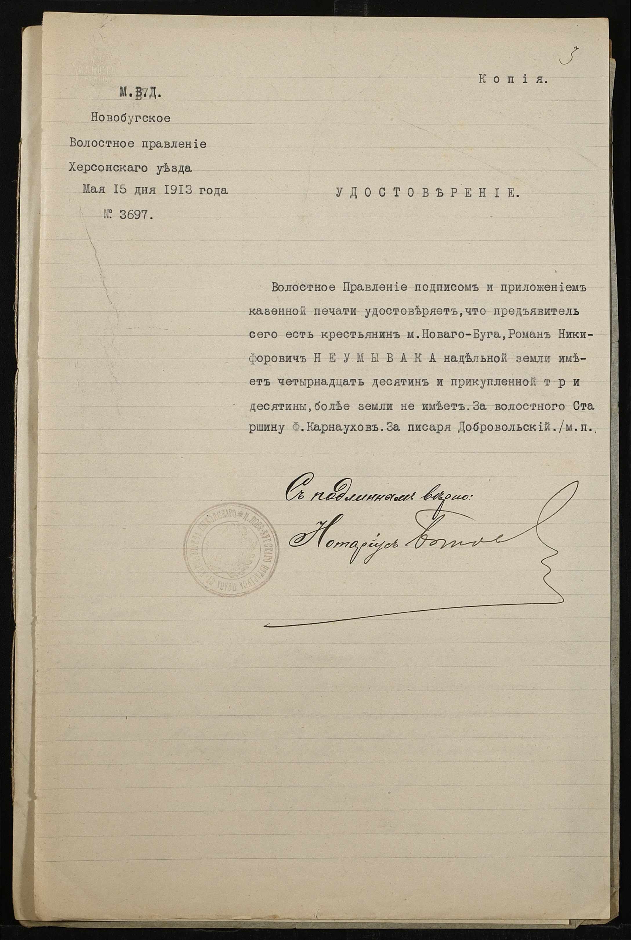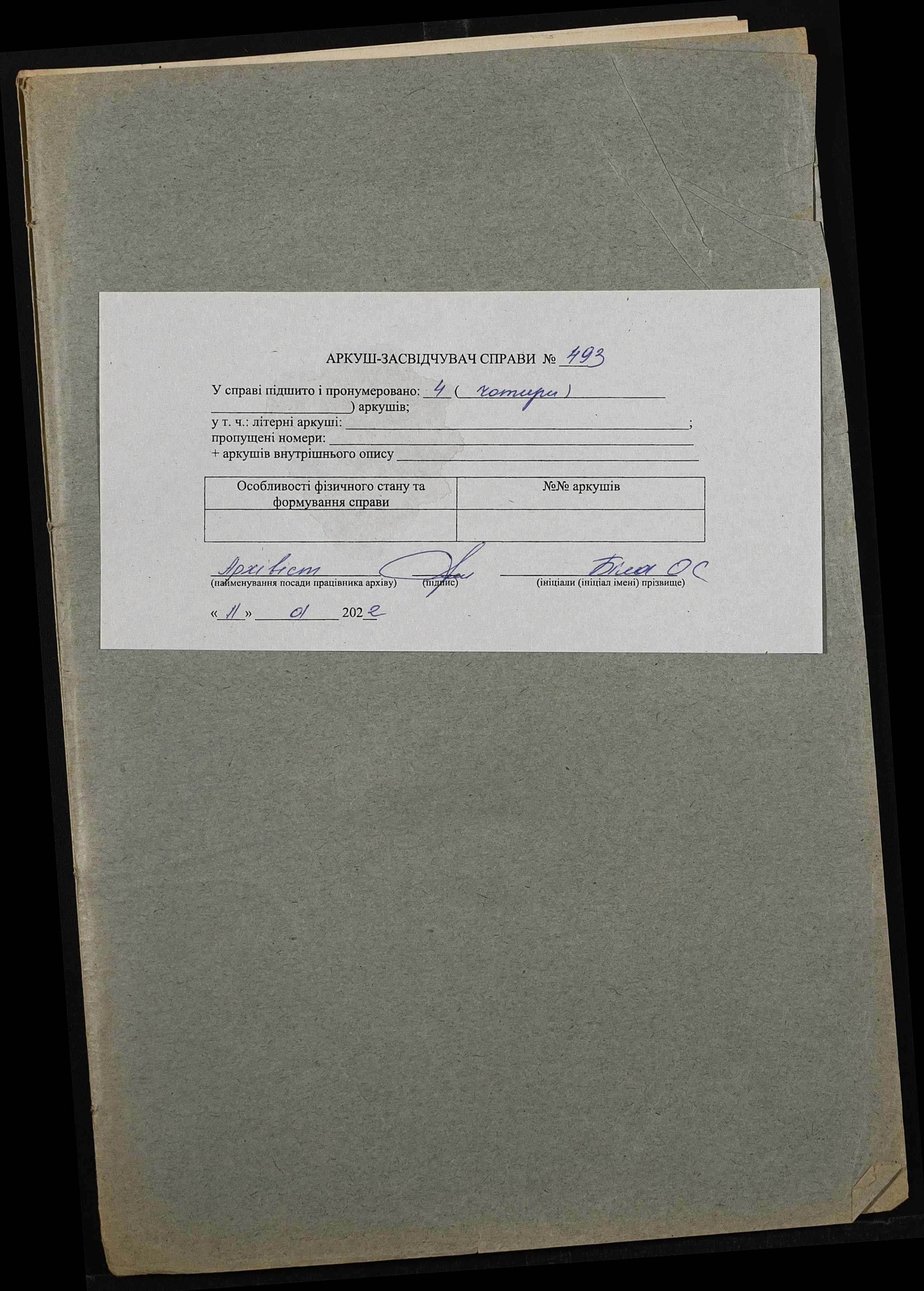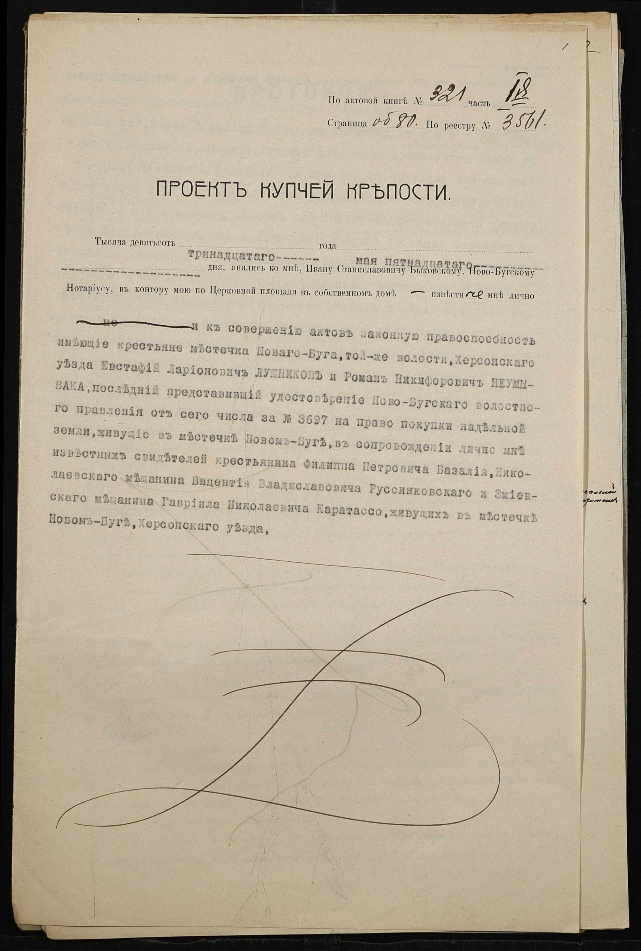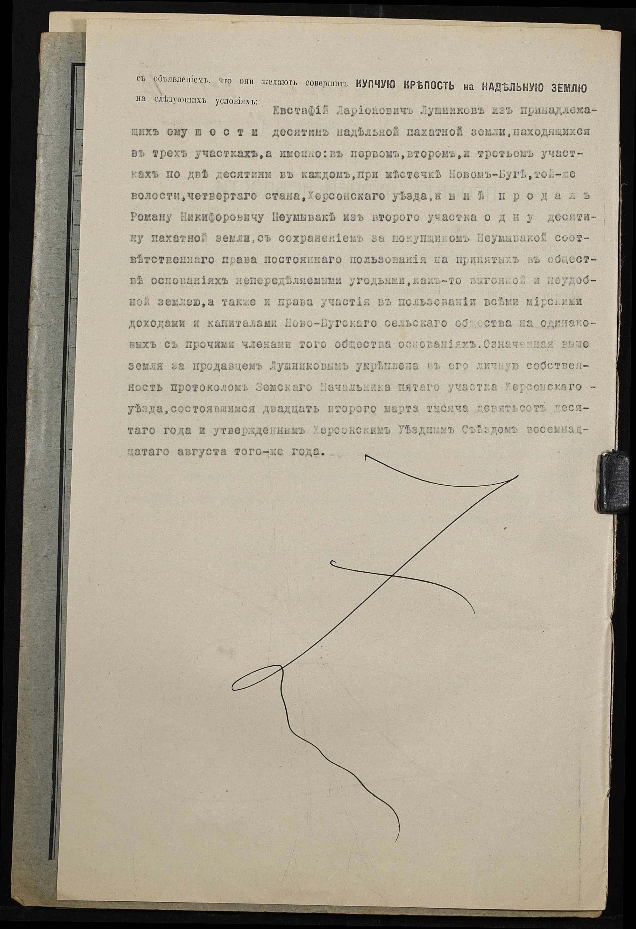 • • • • Справа № 493 “Справа про вчинення купчої про продаж землі селянином Лушниковим Євстафієм Ларіоновичем (Лушниковым Евстафием Ларионовичем) на користь селянина Неумиваки (Неумываки) Романа Никифоровича”