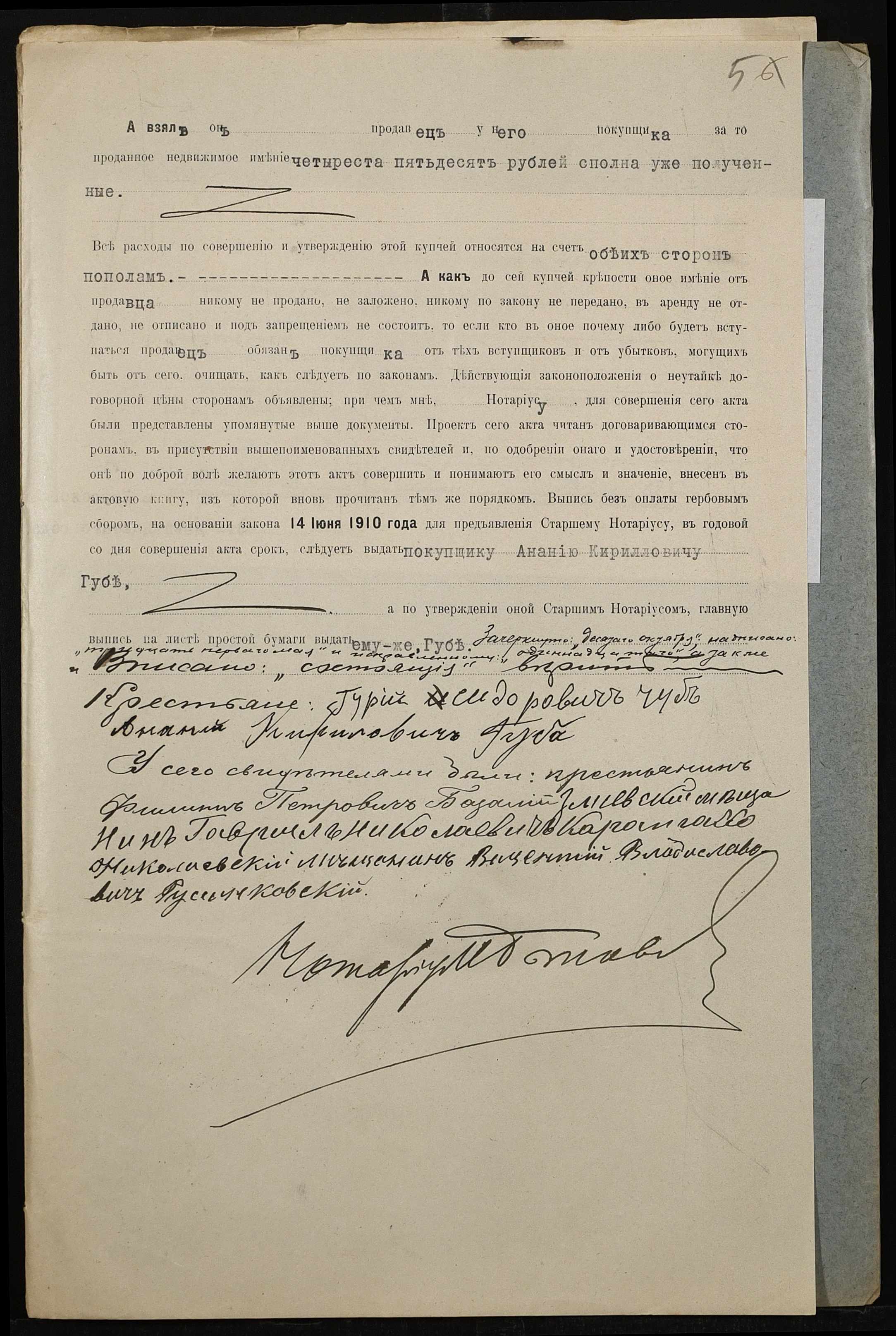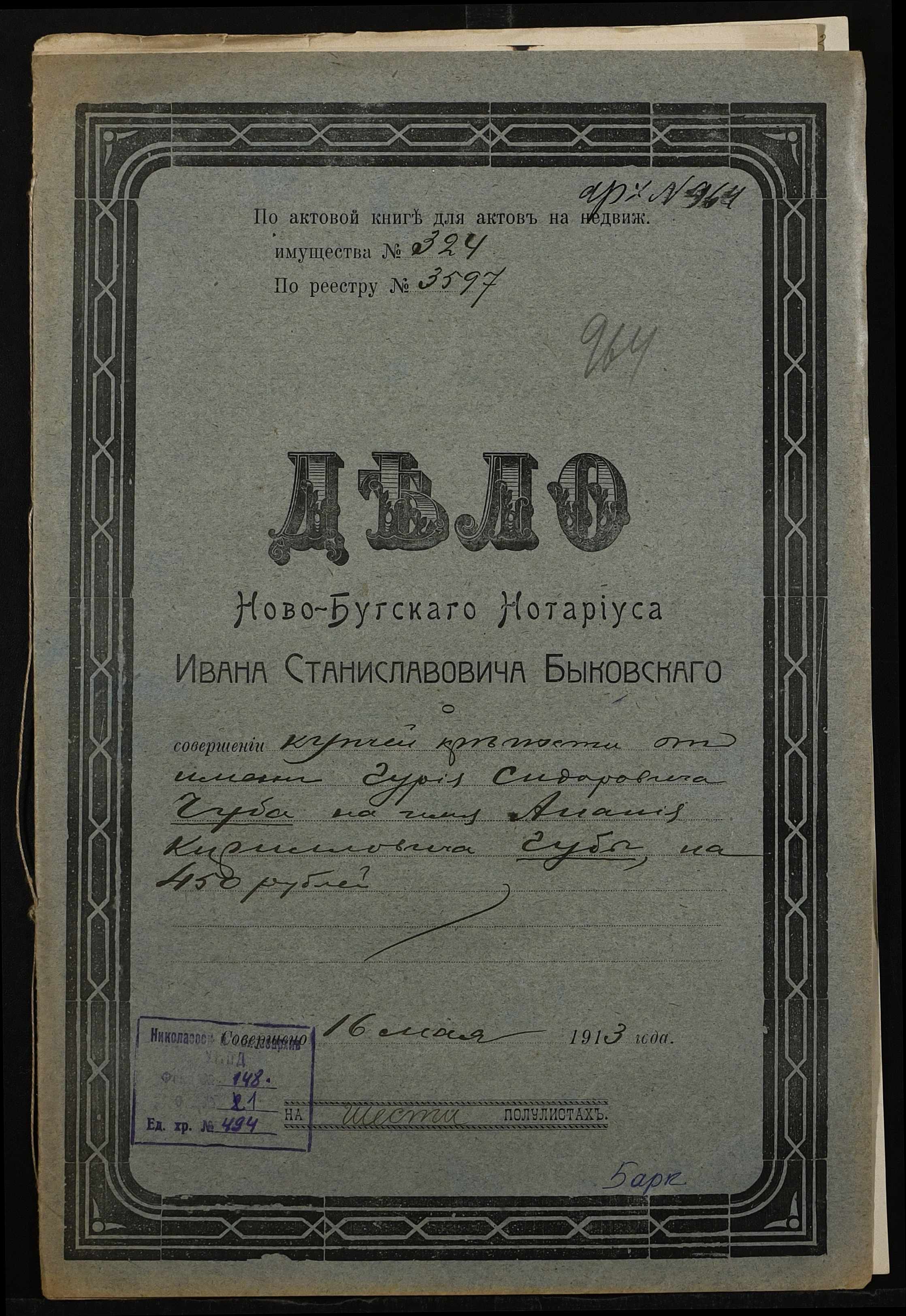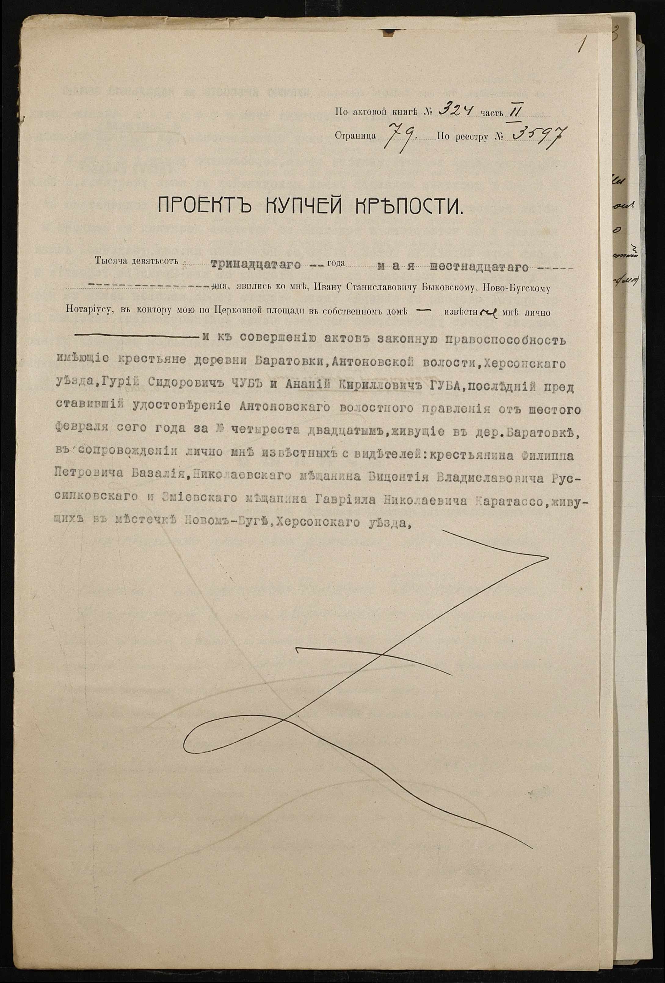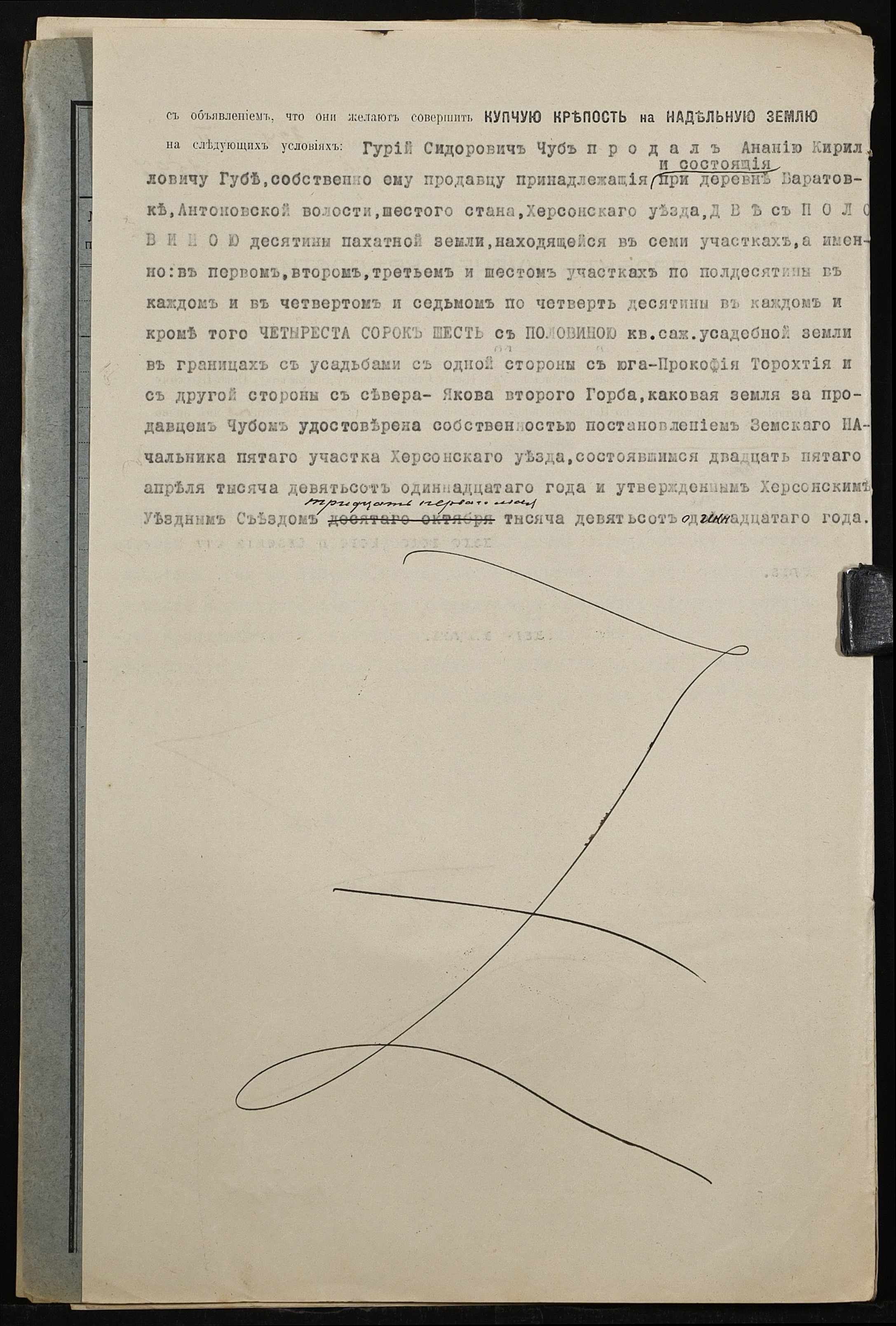 • • • • Справа № 494 “Справа про вчинення купчої про продаж землі селянином Чубом Гурієм (Гурием) Сидоровичем на користь селянина Губи Ананія Кириловича (Губы Анания Кирилловича)”