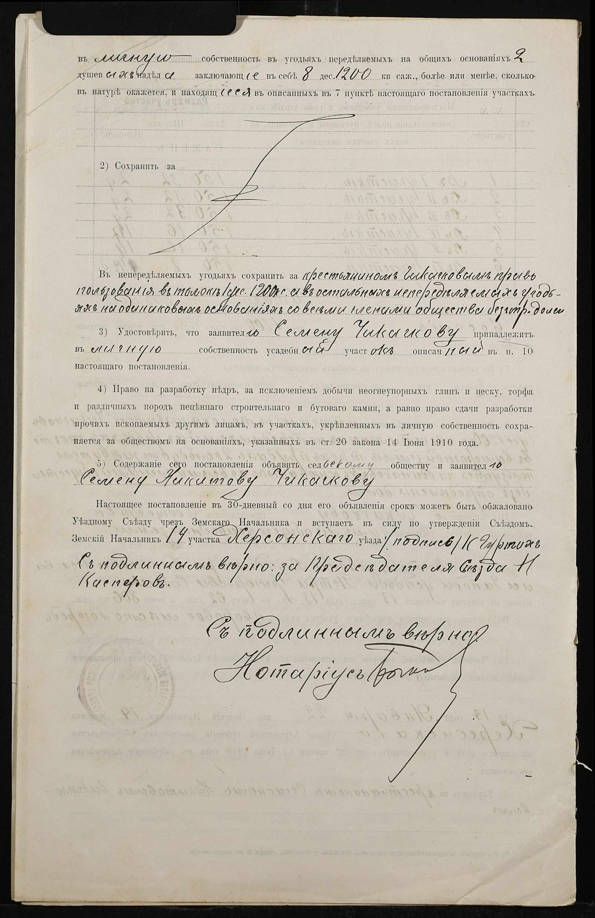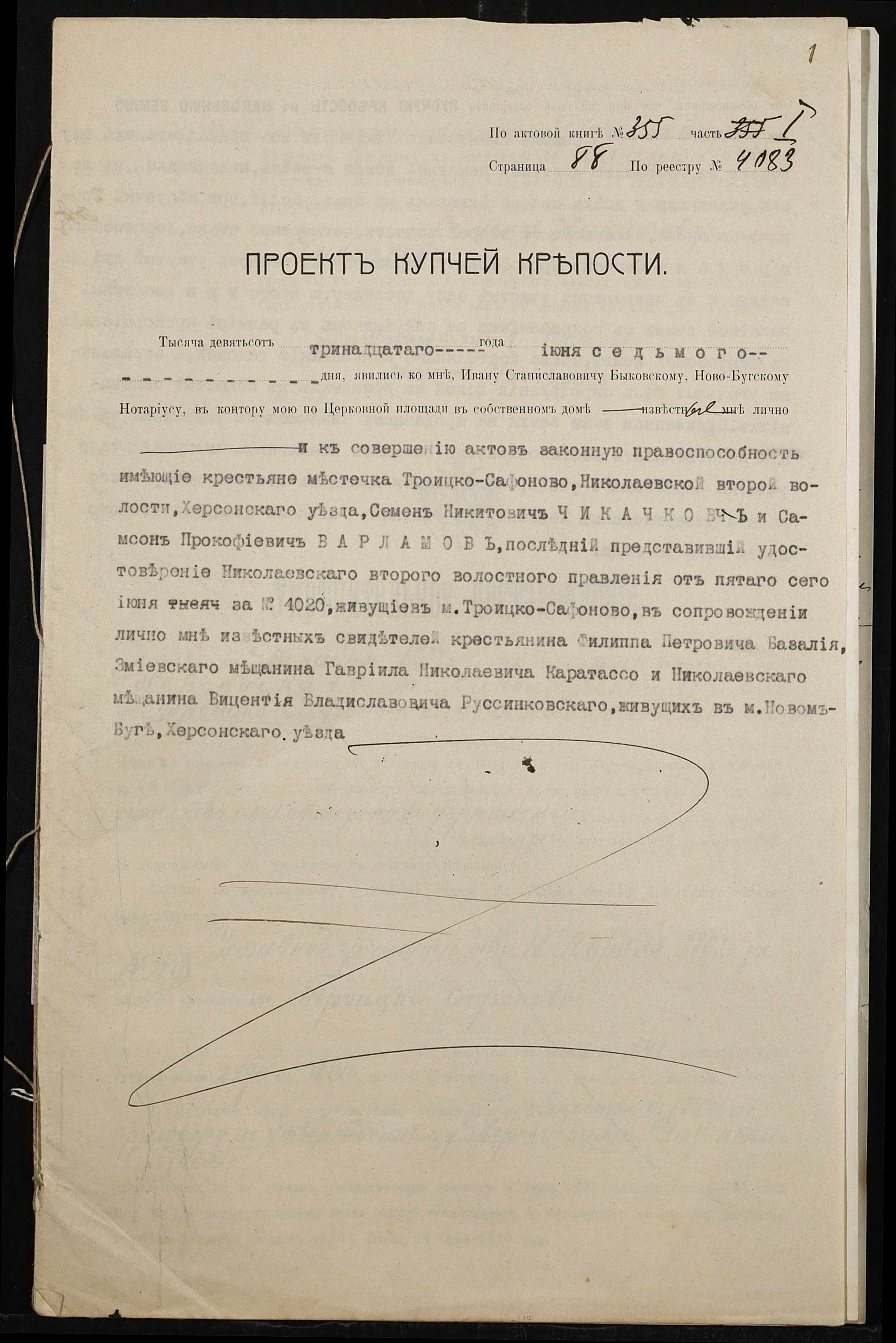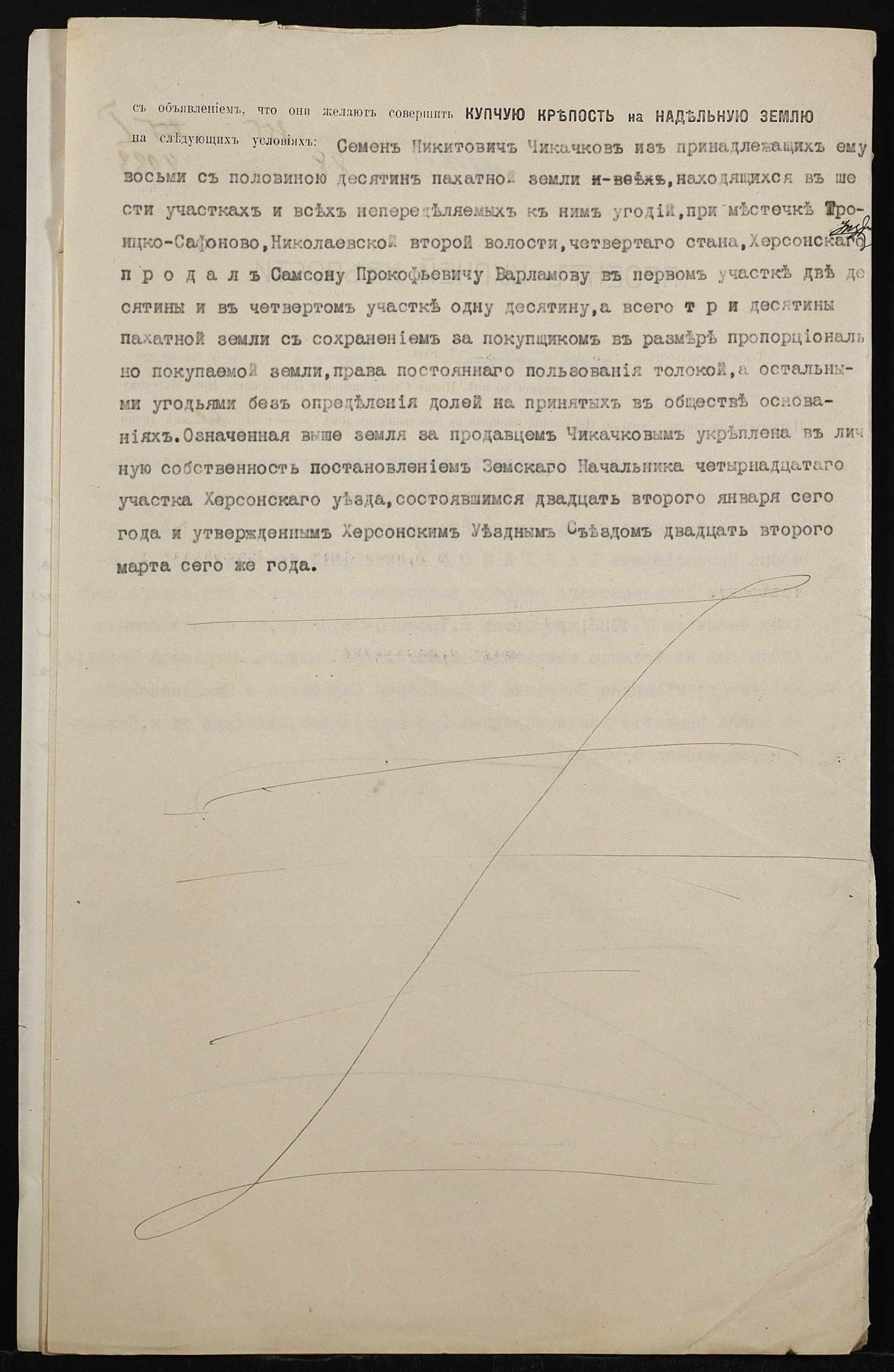 • • • • Справа № 506 “Справа про вчинення купчої про продаж землі селянином Чикачковим (Чикачковым) Семеном Микитовичем (Никитовичем) на користь селянина Варламова Самсона Прокоповича (Прокофьевича)”