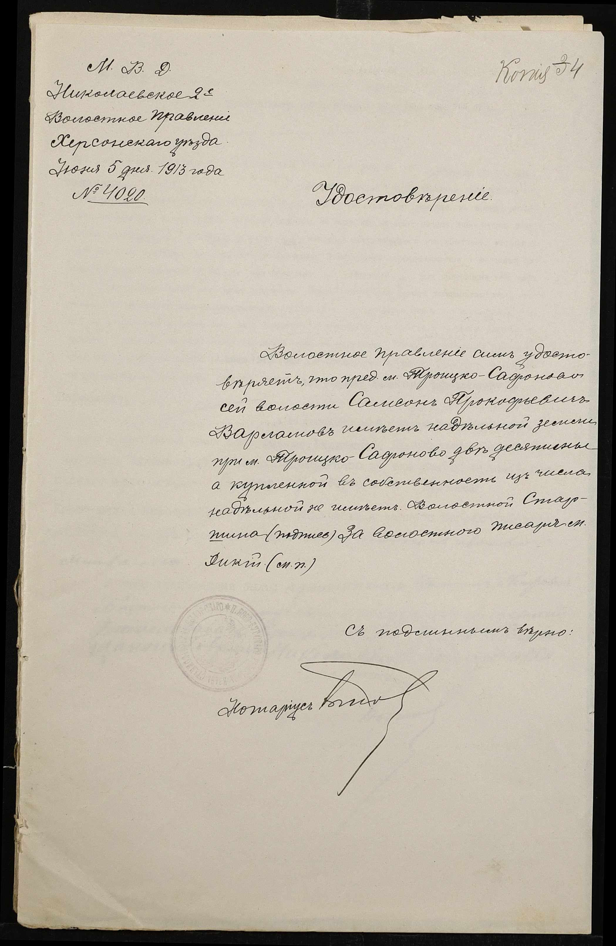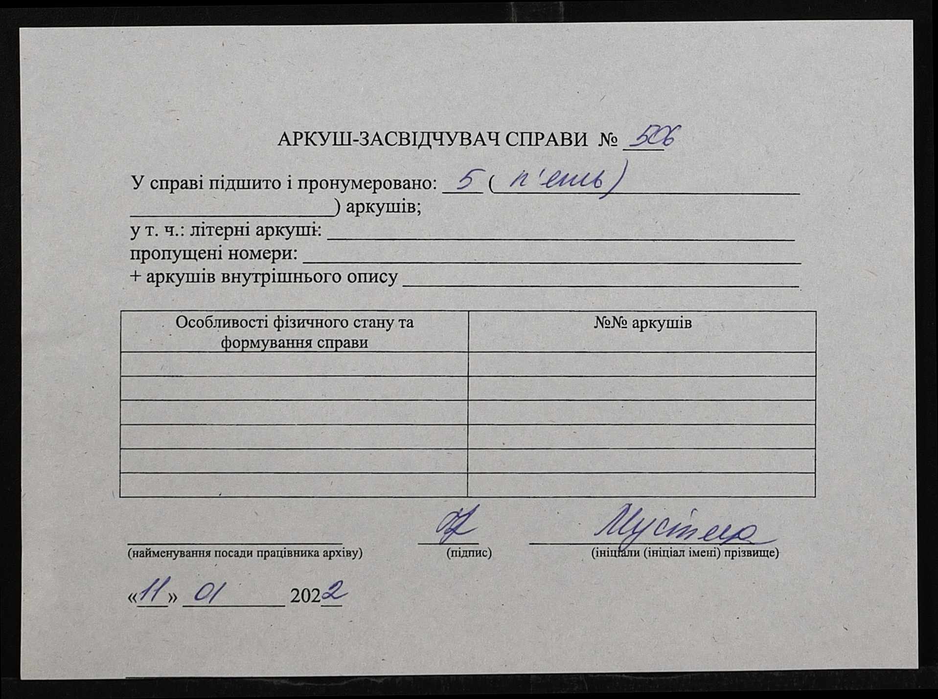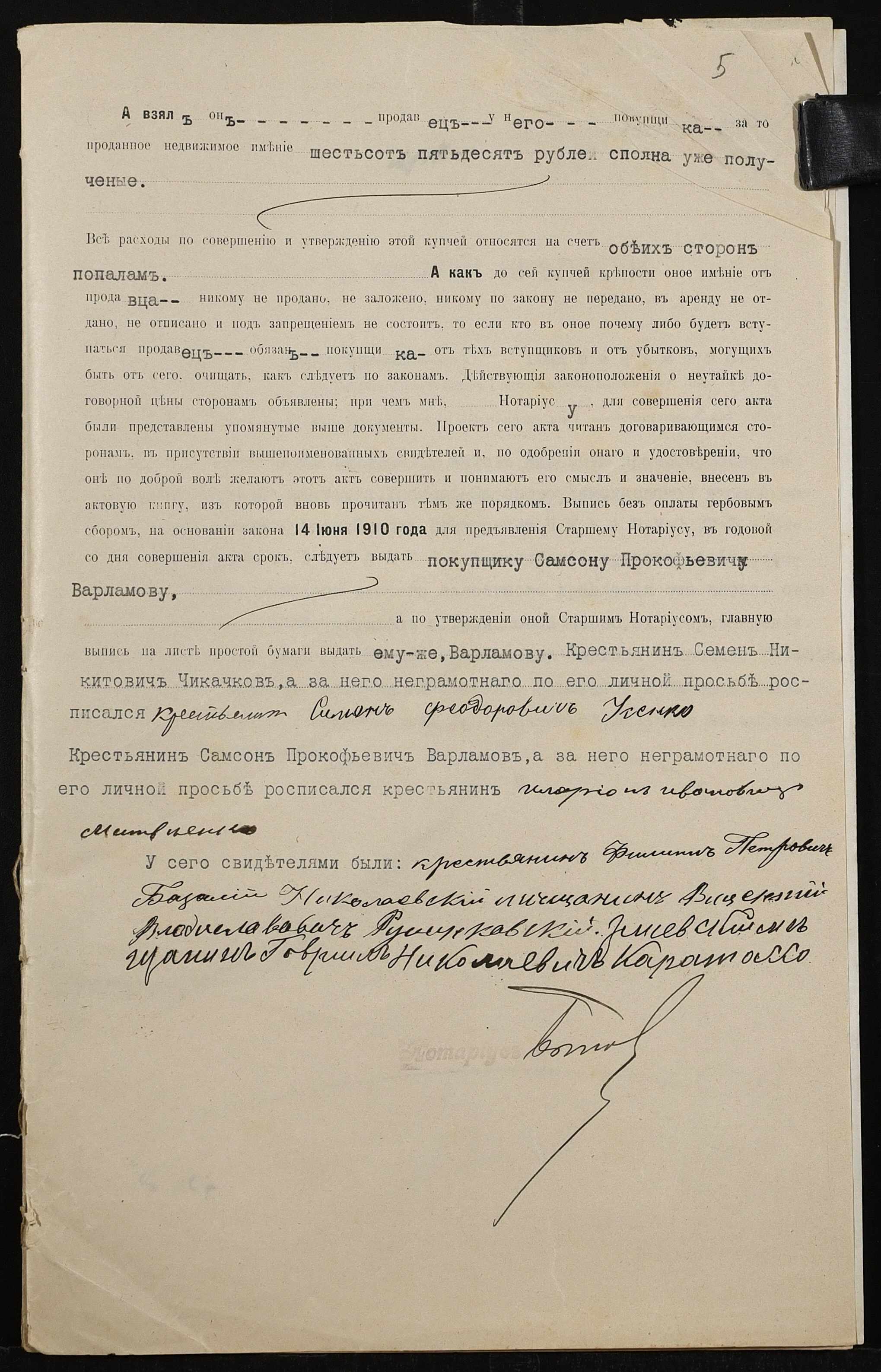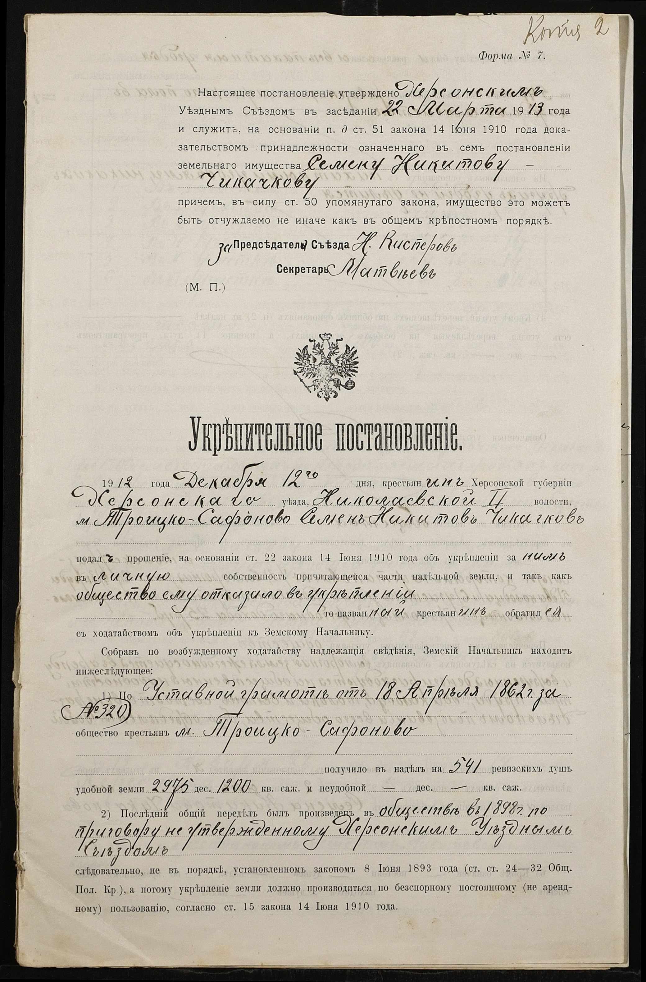 • • • • Справа № 506 “Справа про вчинення купчої про продаж землі селянином Чикачковим (Чикачковым) Семеном Микитовичем (Никитовичем) на користь селянина Варламова Самсона Прокоповича (Прокофьевича)”