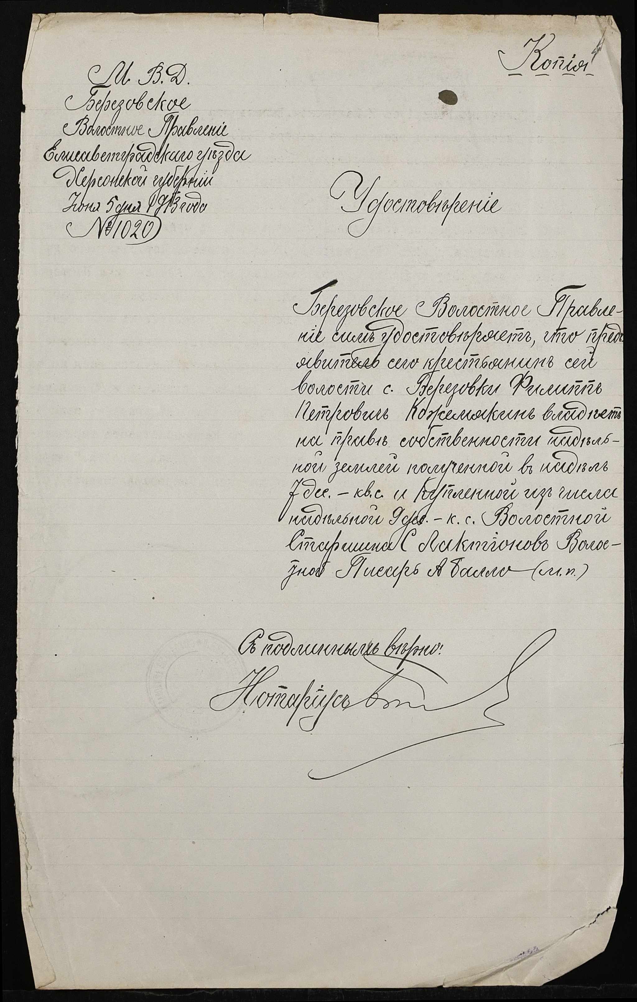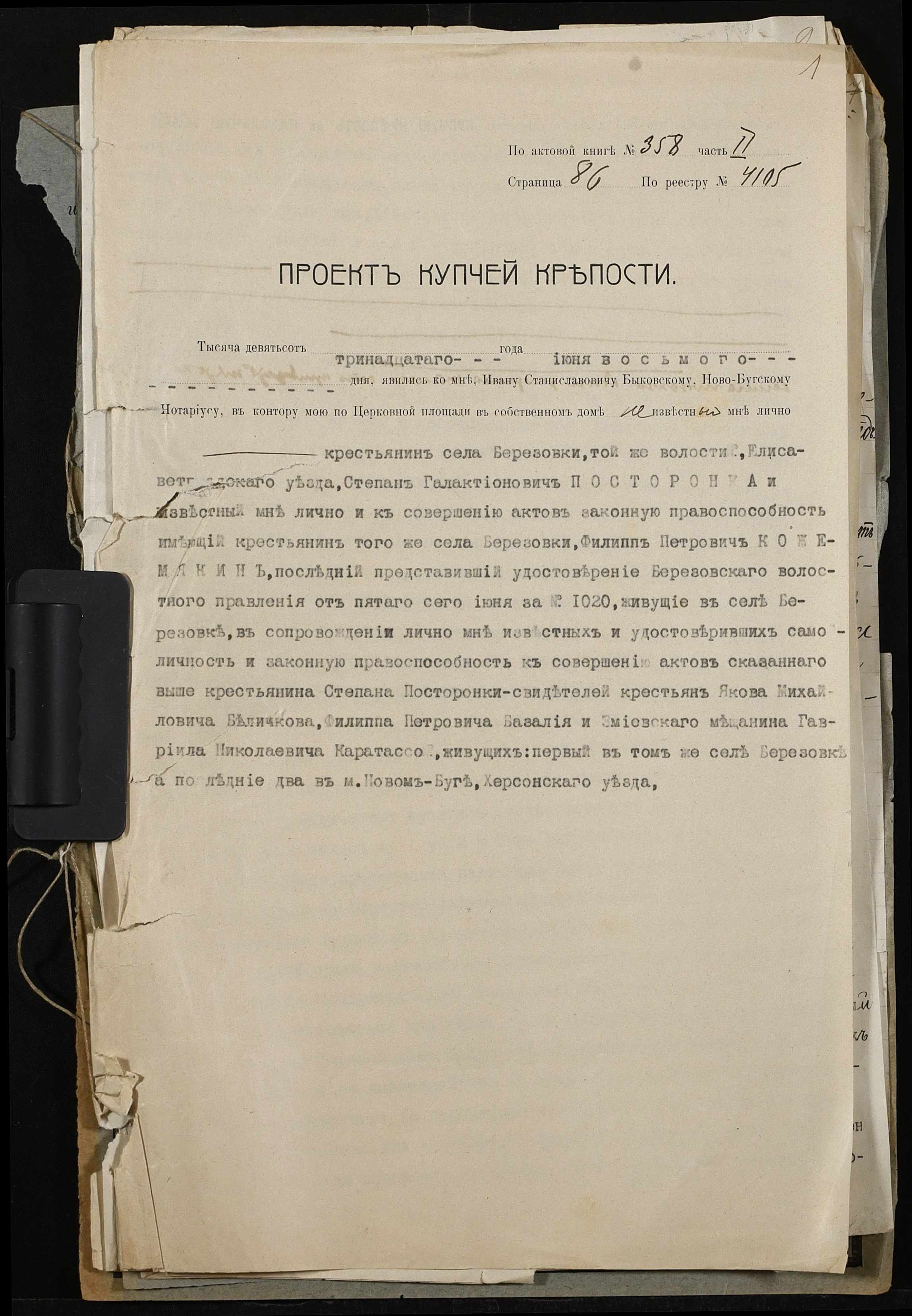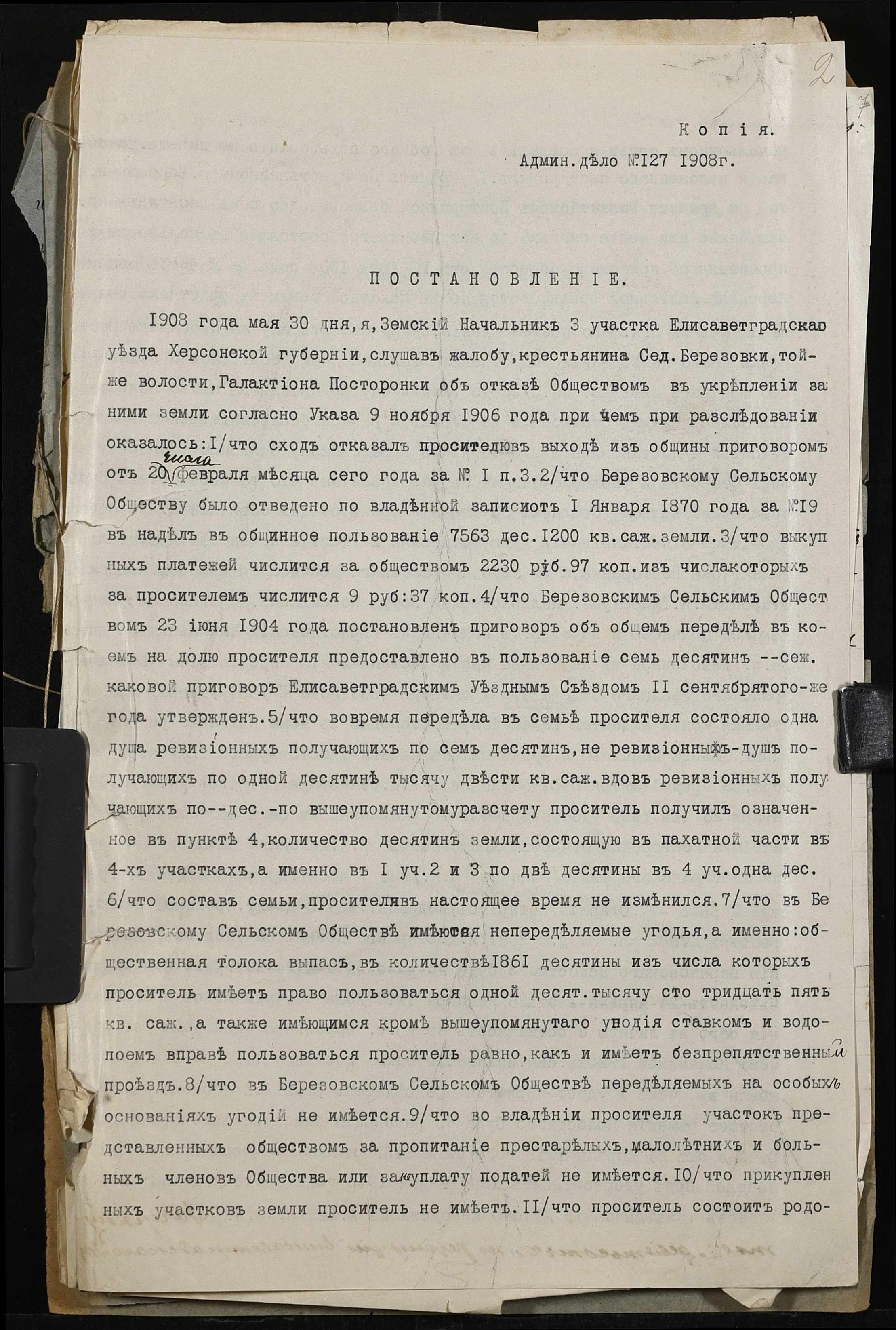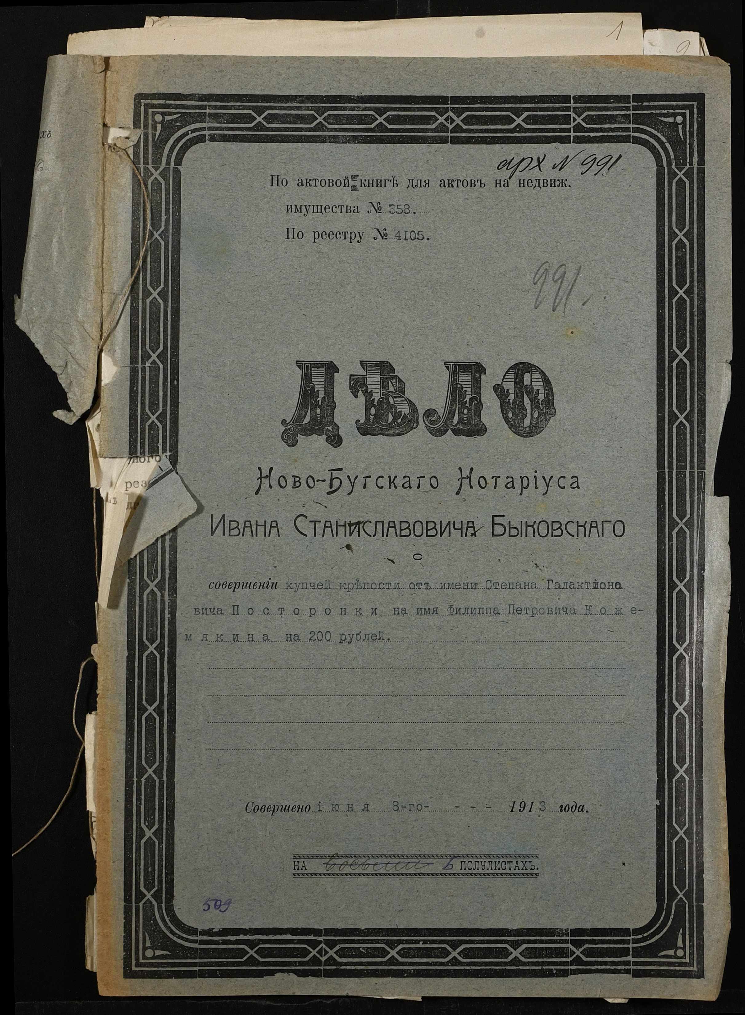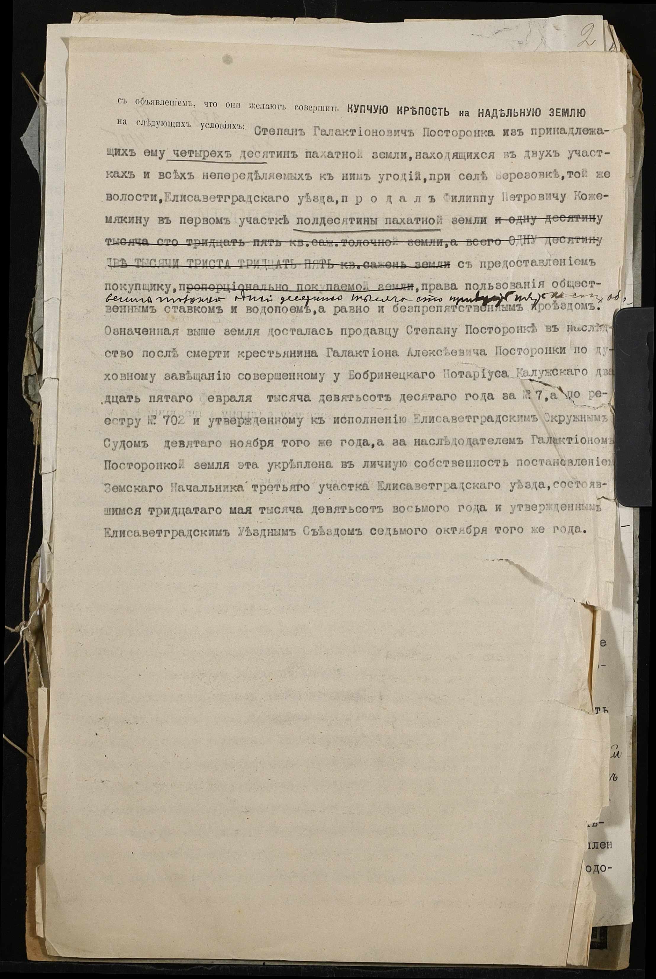 • • • • Справа № 509 “Справа про вчинення купчої про продаж землі селянином Посторонкою (Посторонкой) Степаном Галактіоновичем (Галактионовичем) на користь селянина Кожемякіна Пилипа (Кожемякина Филиппа) Петровича”