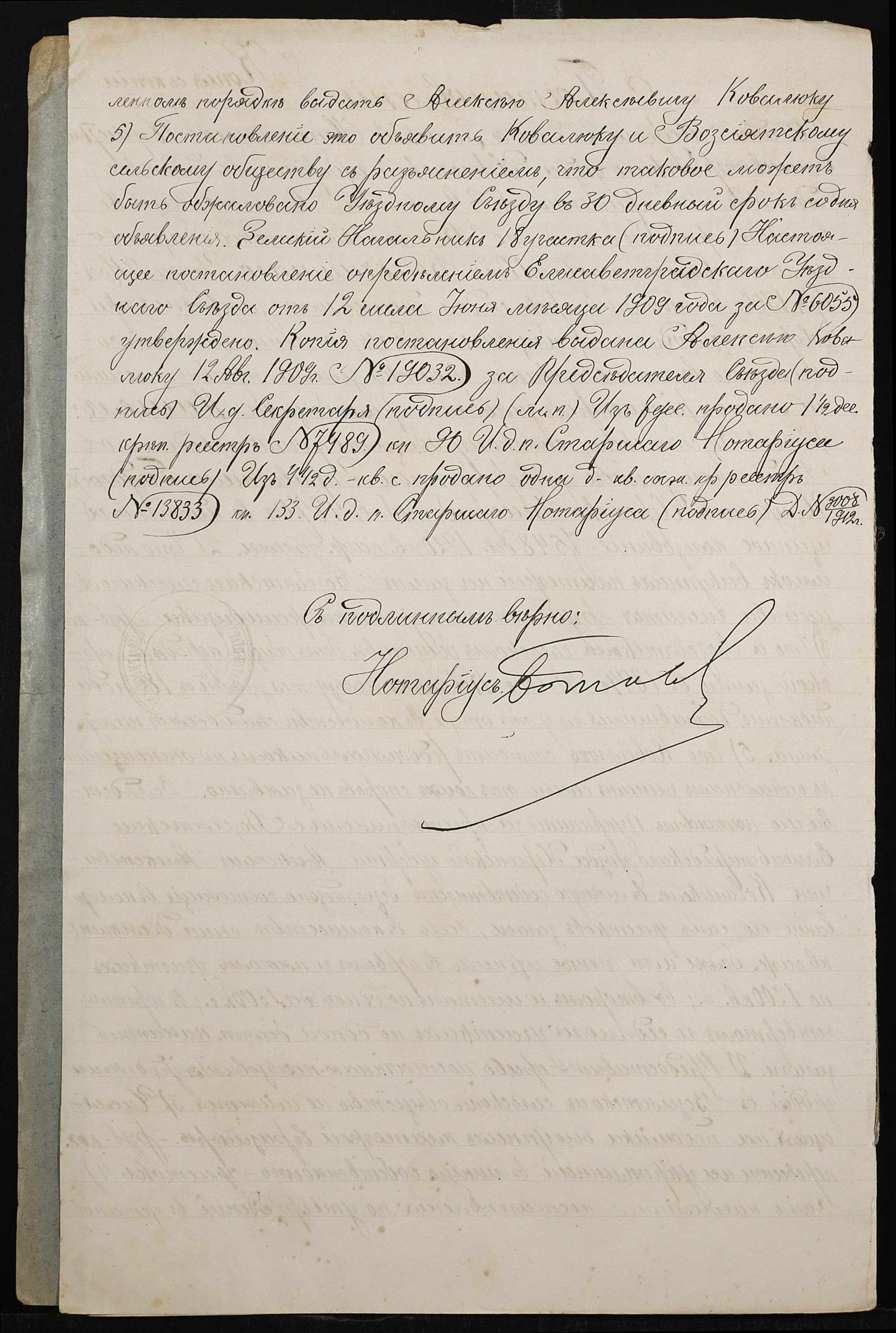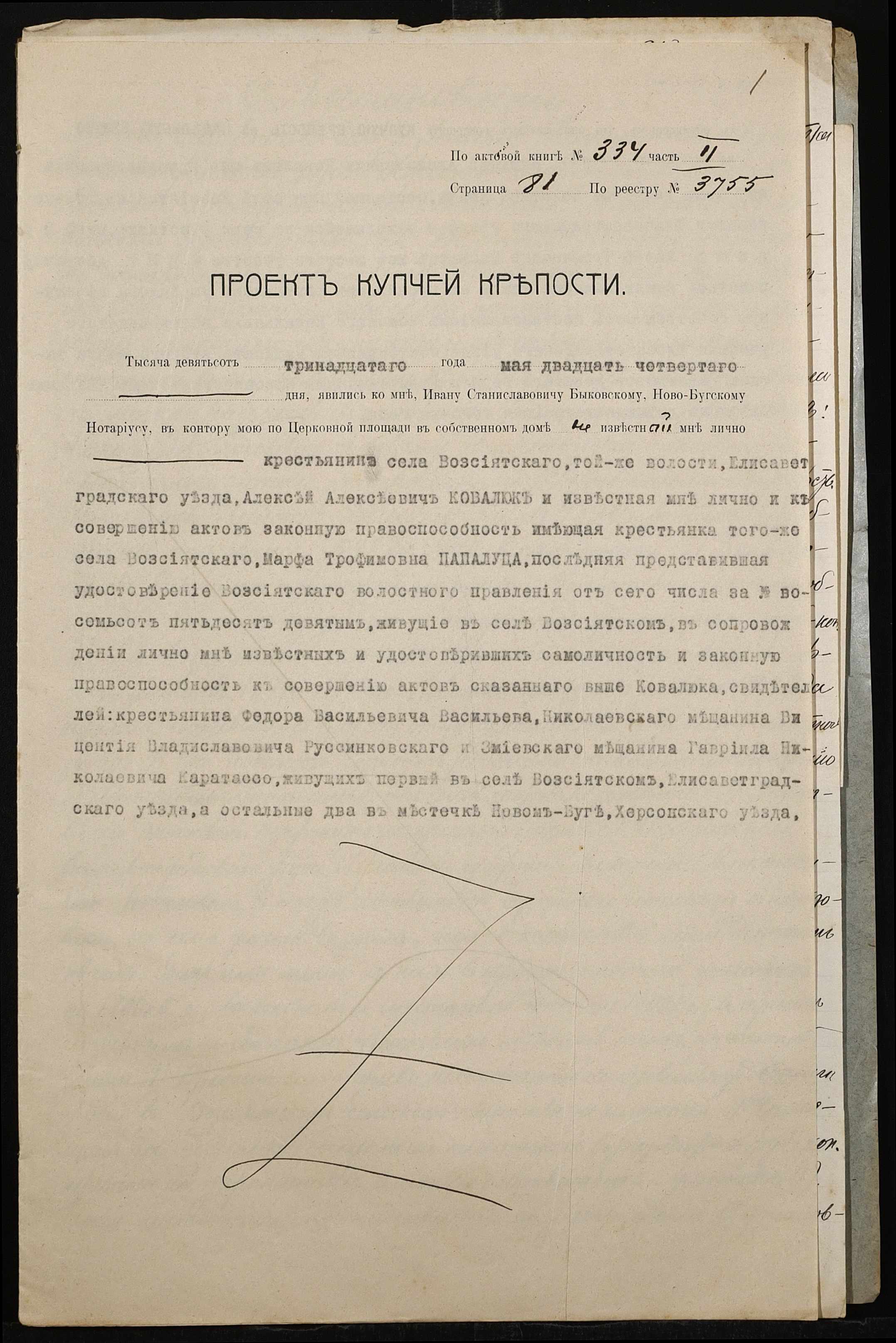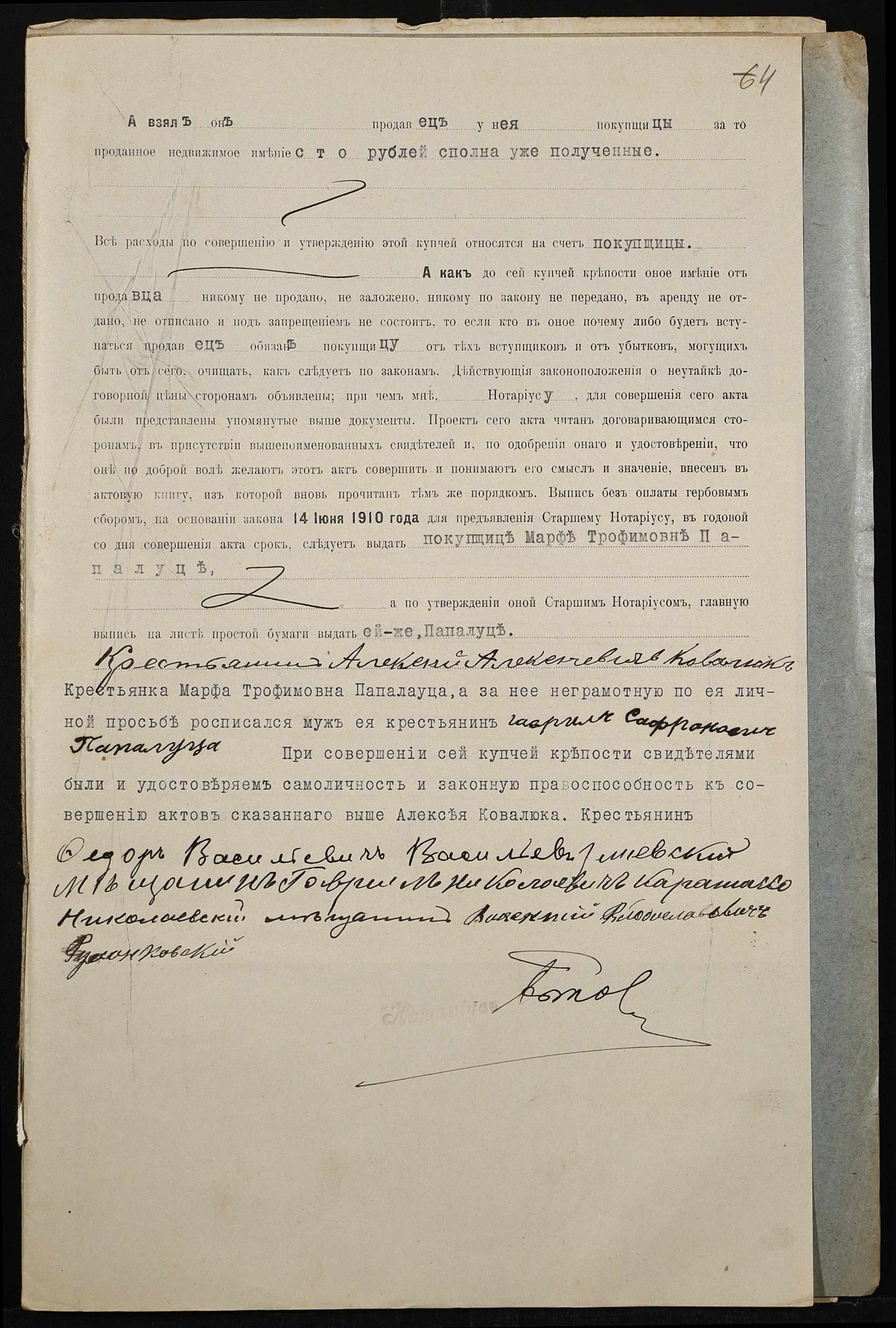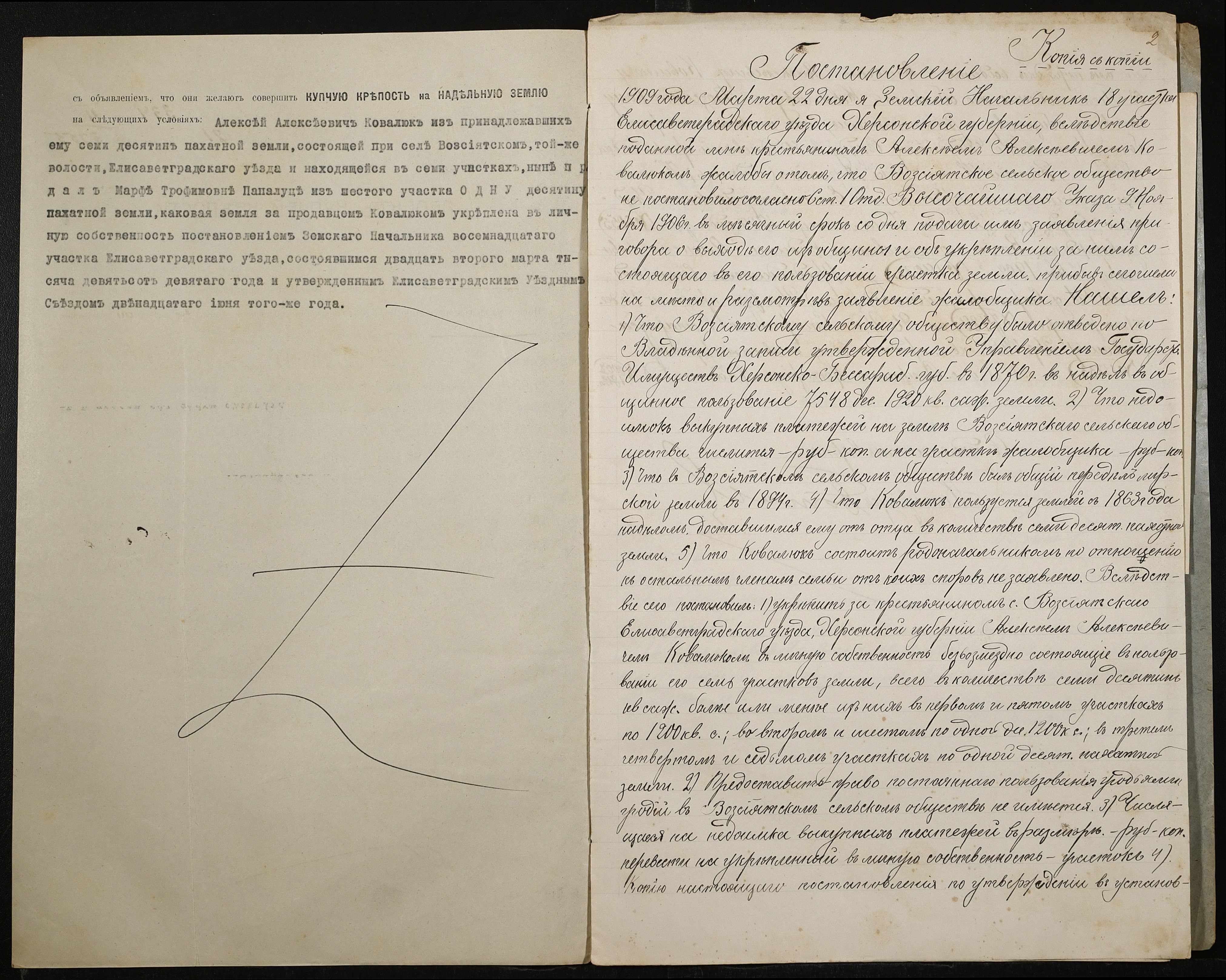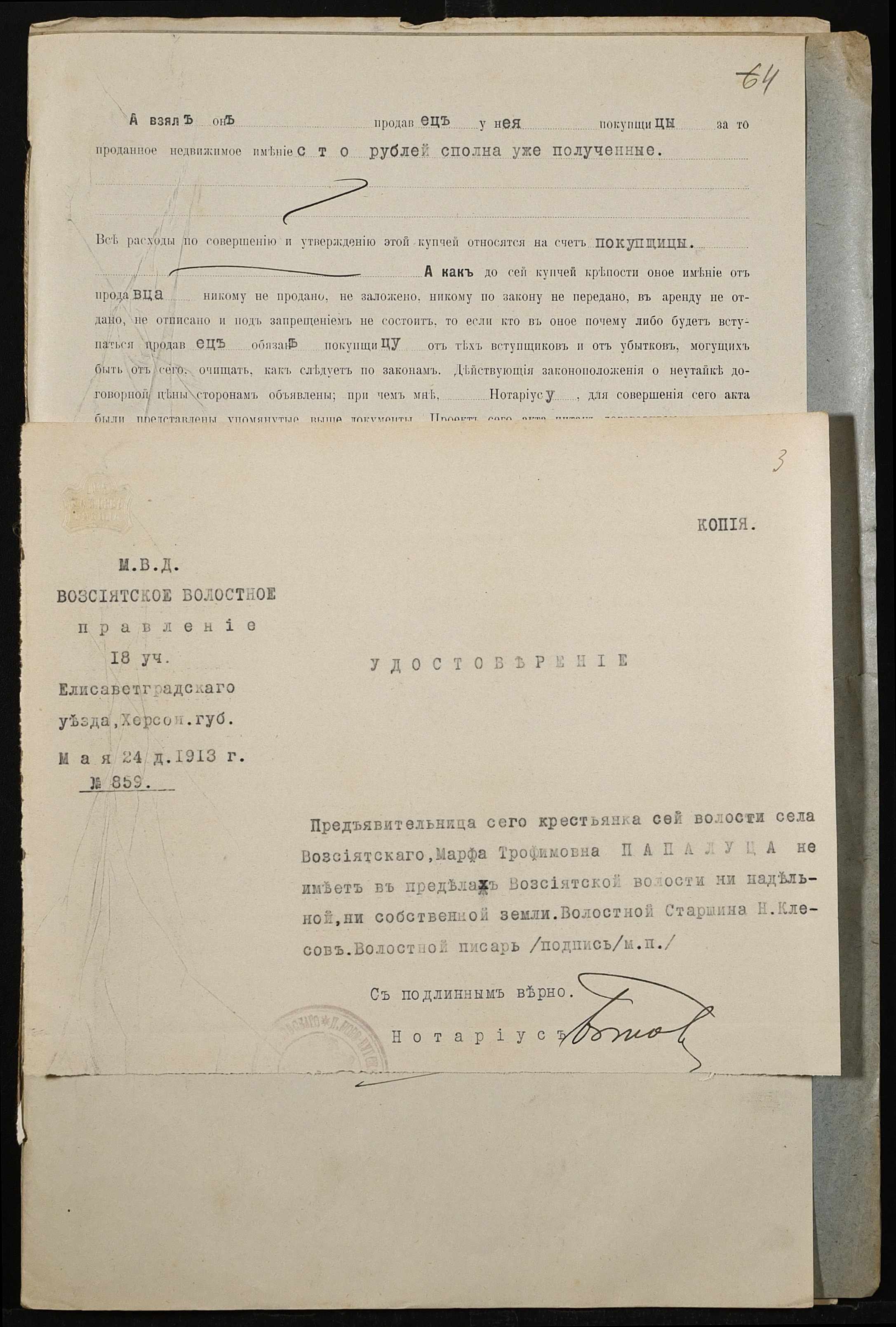 • • • • Справа № 516 “Справа про вчинення купчої про продаж землі селянином Ковалюком Олексієм Олексійовичем (Алексеем Алексеевичем) на користь селянки Папалуци Марфи Трохимівни (Папалуцы Марфы Трофимовны)”