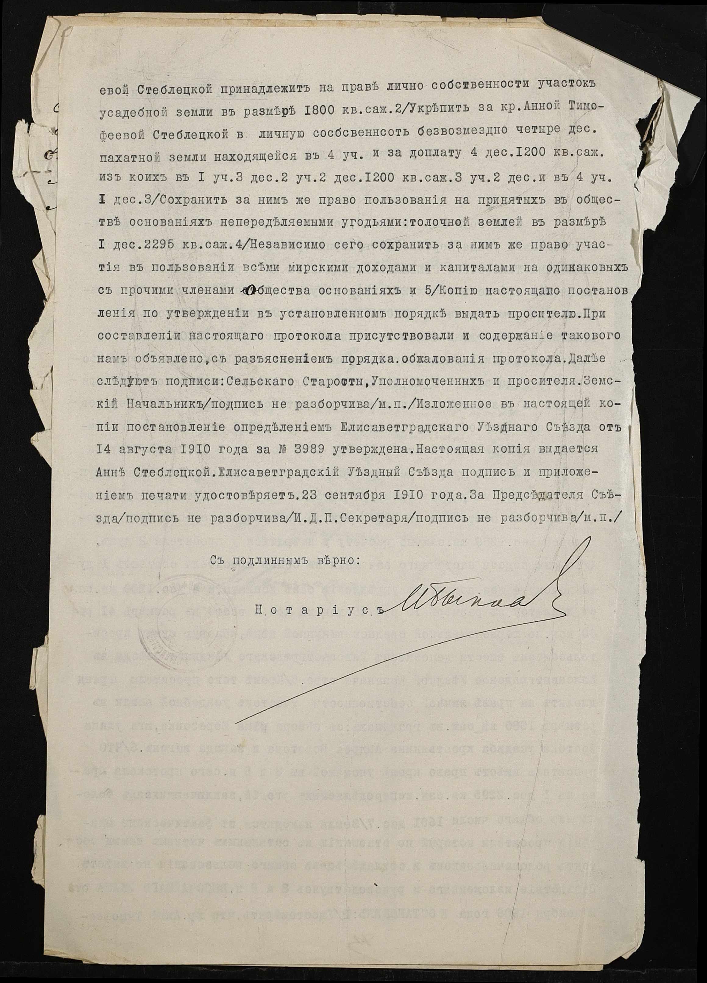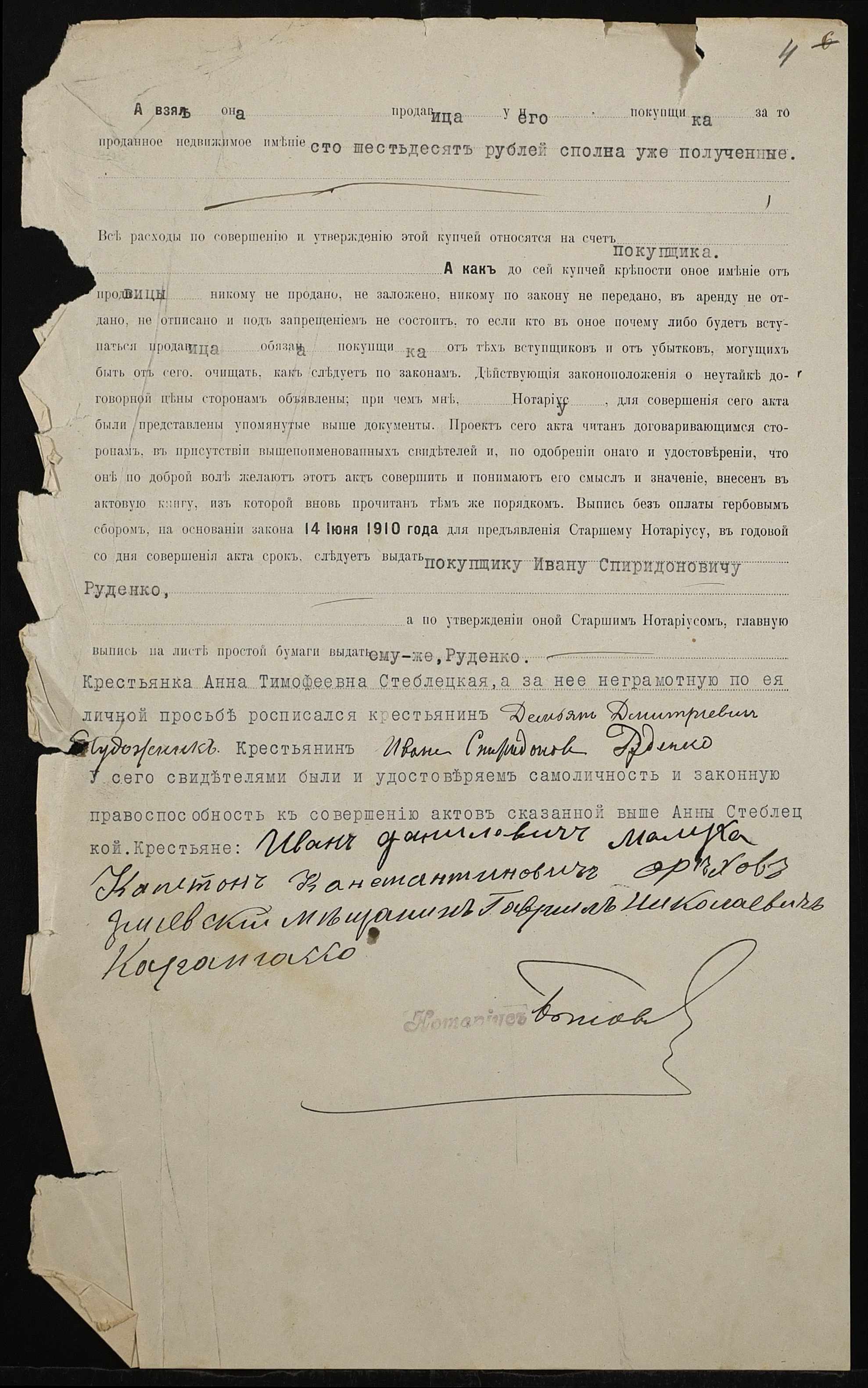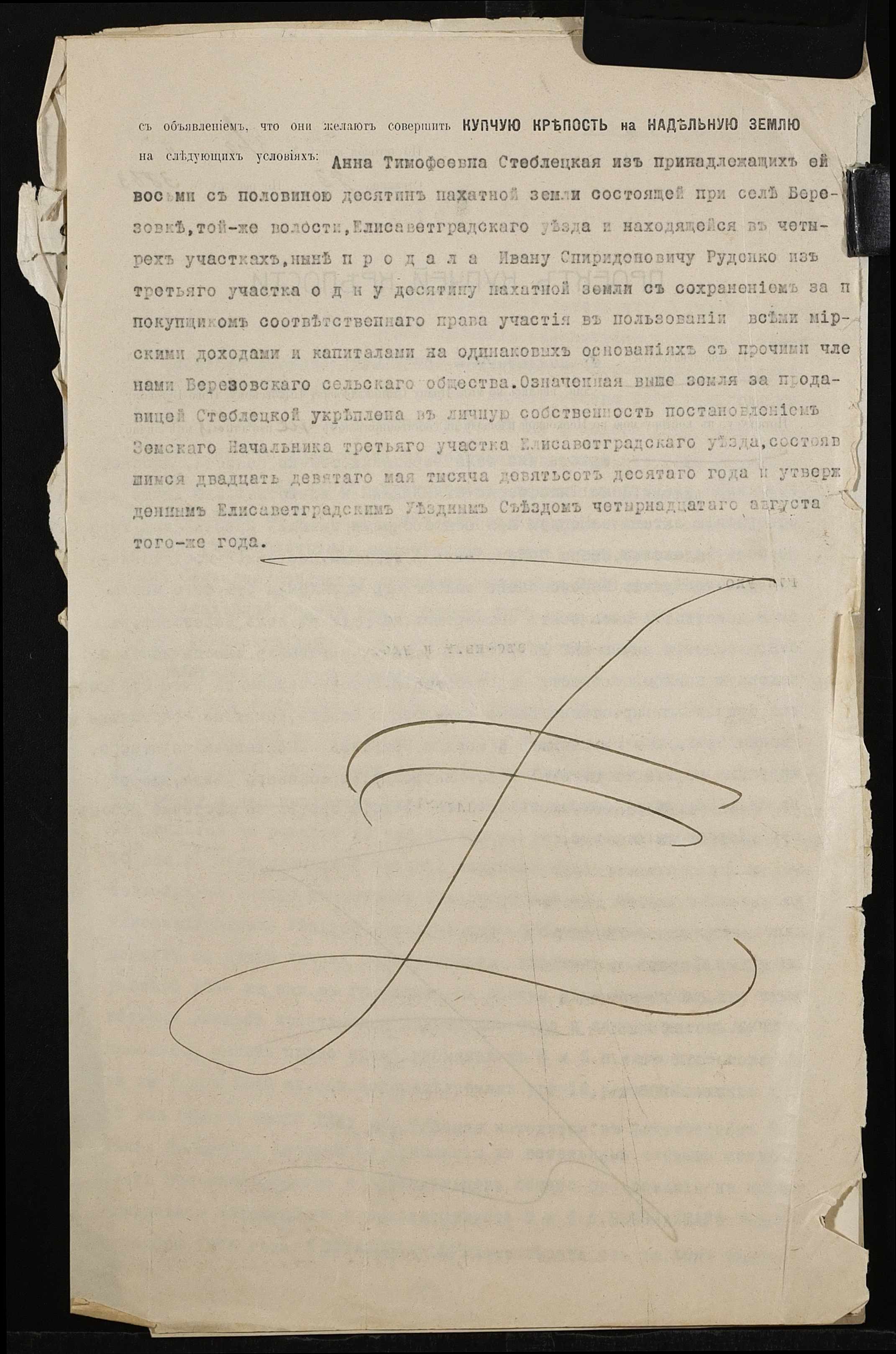 • • • • Справа № 518 “Справа про вчинення купчої про продаж землі селянкою Стеблецькою Ганною Тимофіївною (Стеблецкой Анной Тимофеевной) на користь селянина Руденка Івана (Руденко Ивана) Спиридоновича”