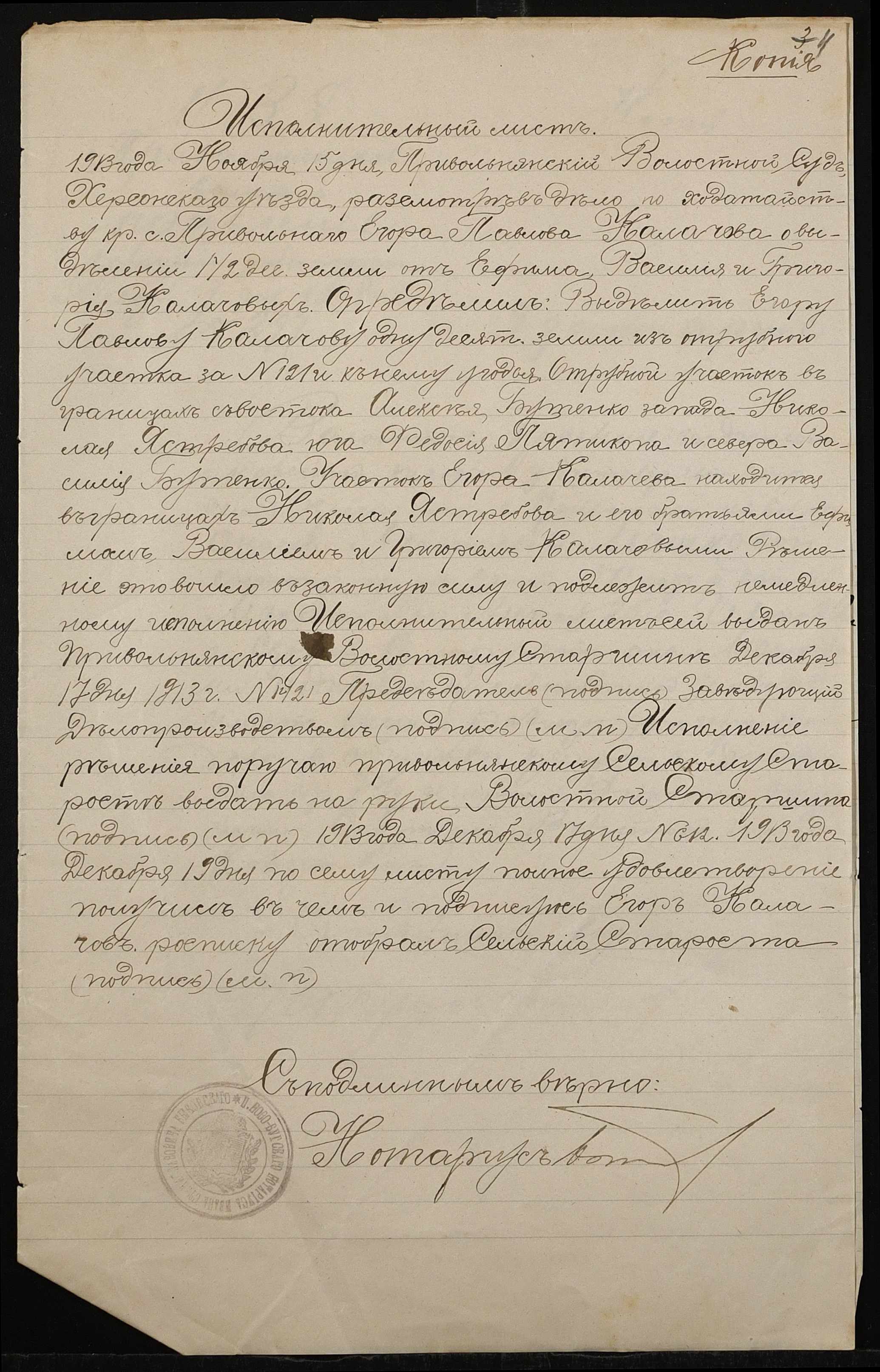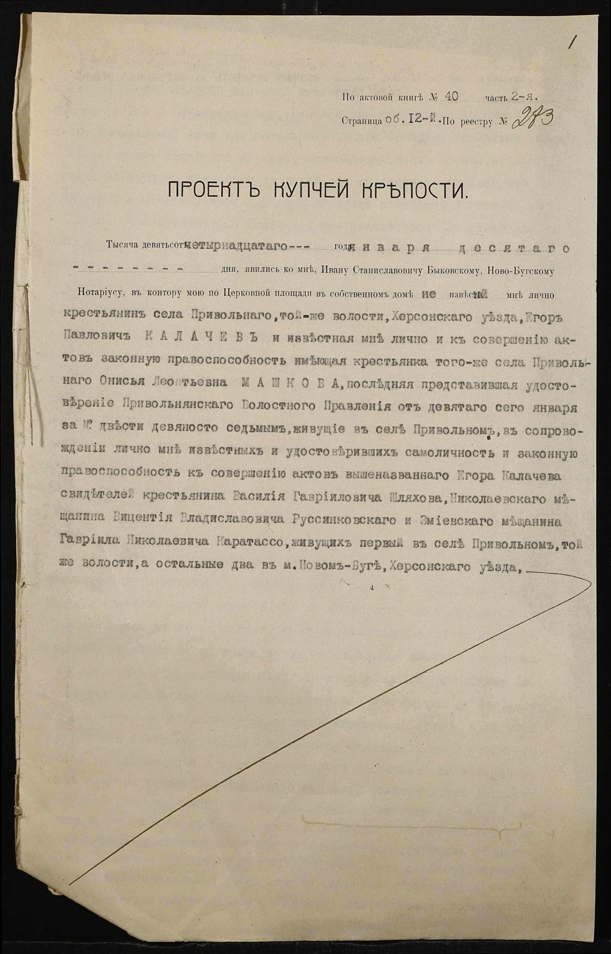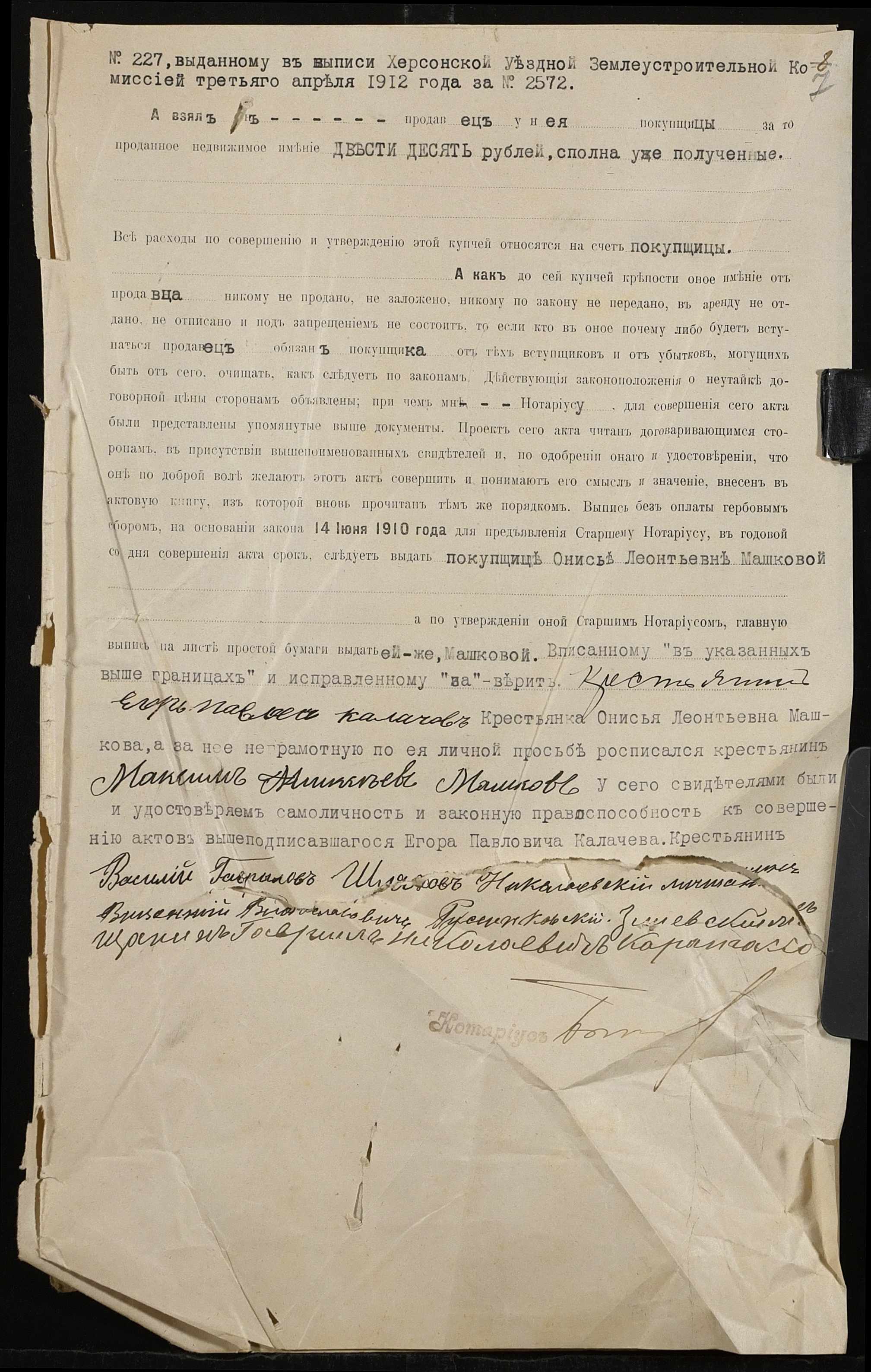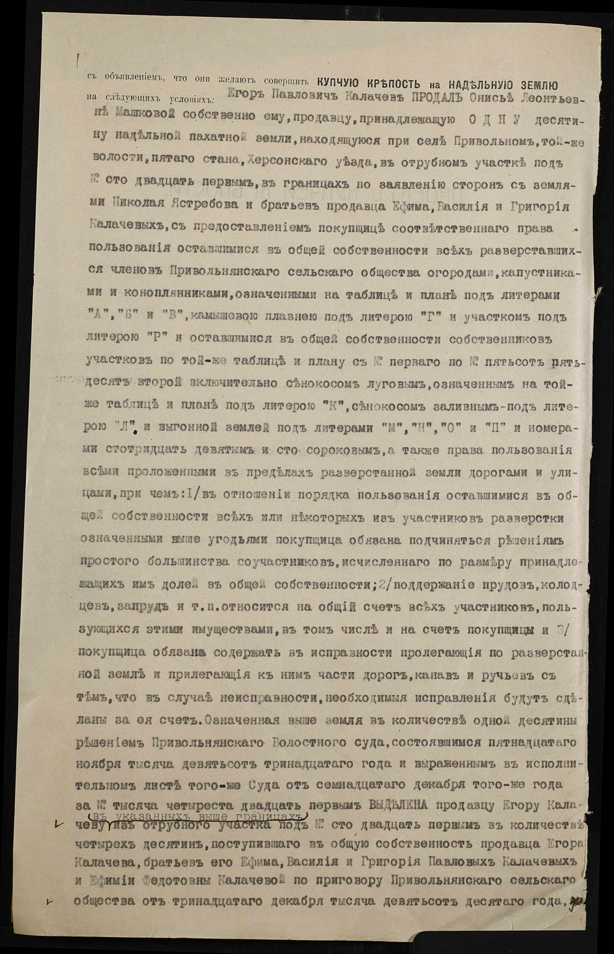 • • • • Справа № 529 “Справа про вчинення купчої про продаж землі селянином Калачовим Єгором (Калачевым Егором) Павловичем на користь селянки Машкової Онисії Леонтіївни (Машковой Анисии Леонтьевны)”