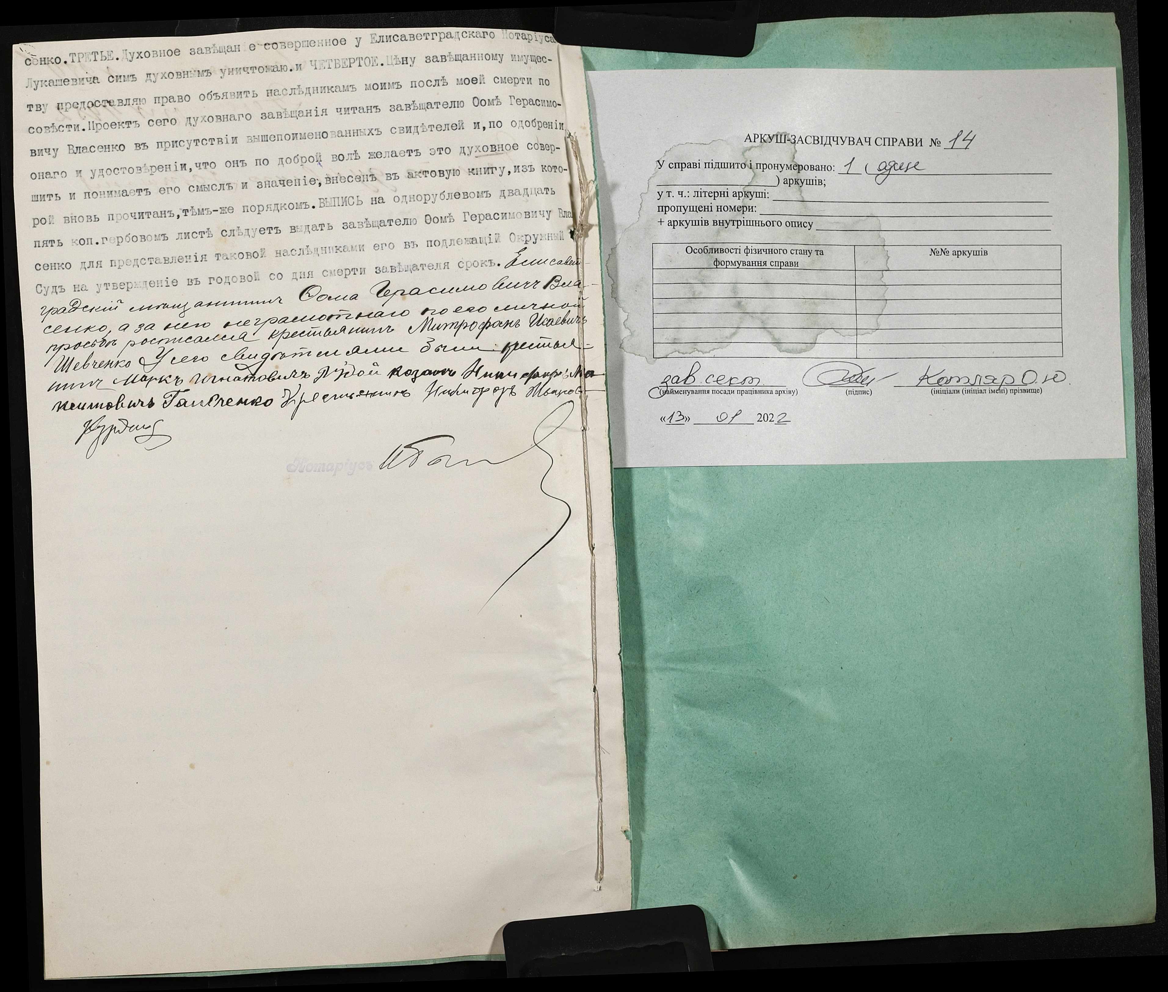 • • • • Справа № 14 “Проєкт духівниці на нерухоме майно єлисаветградського міщанина Власенка Хоми (Власенко Фомы) Герасимовича”