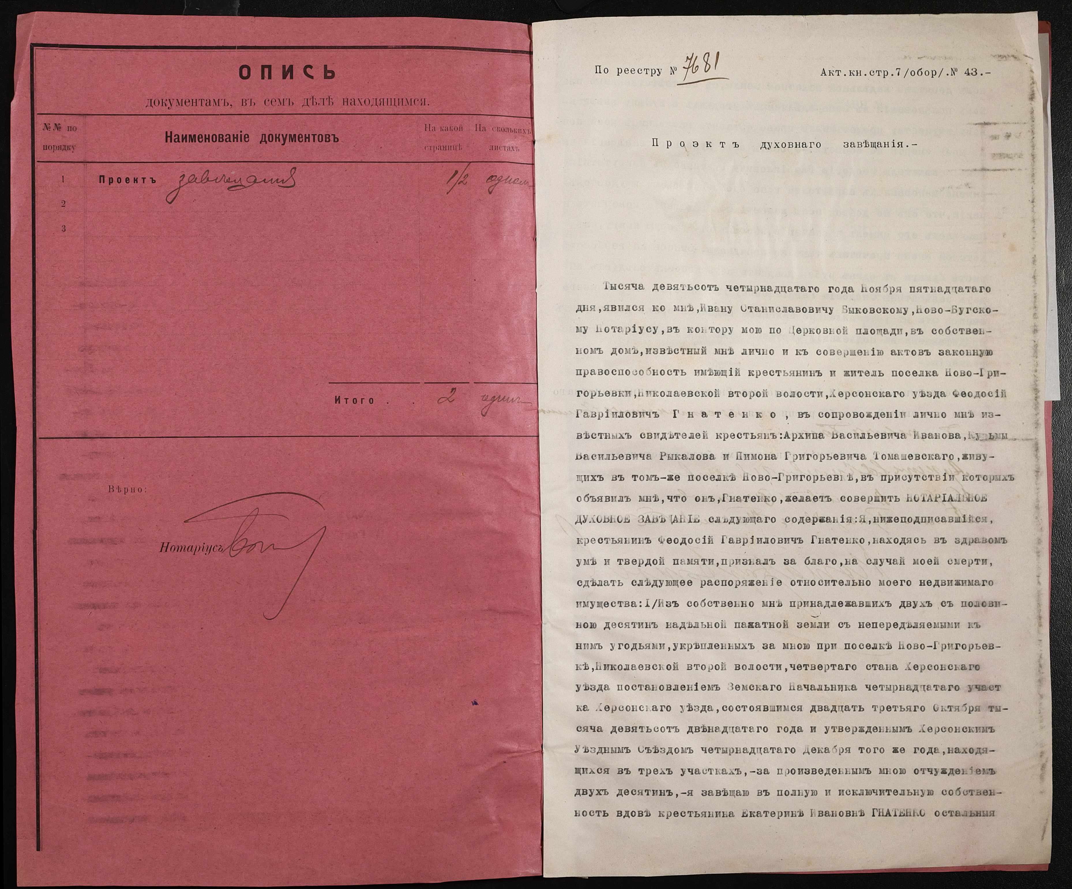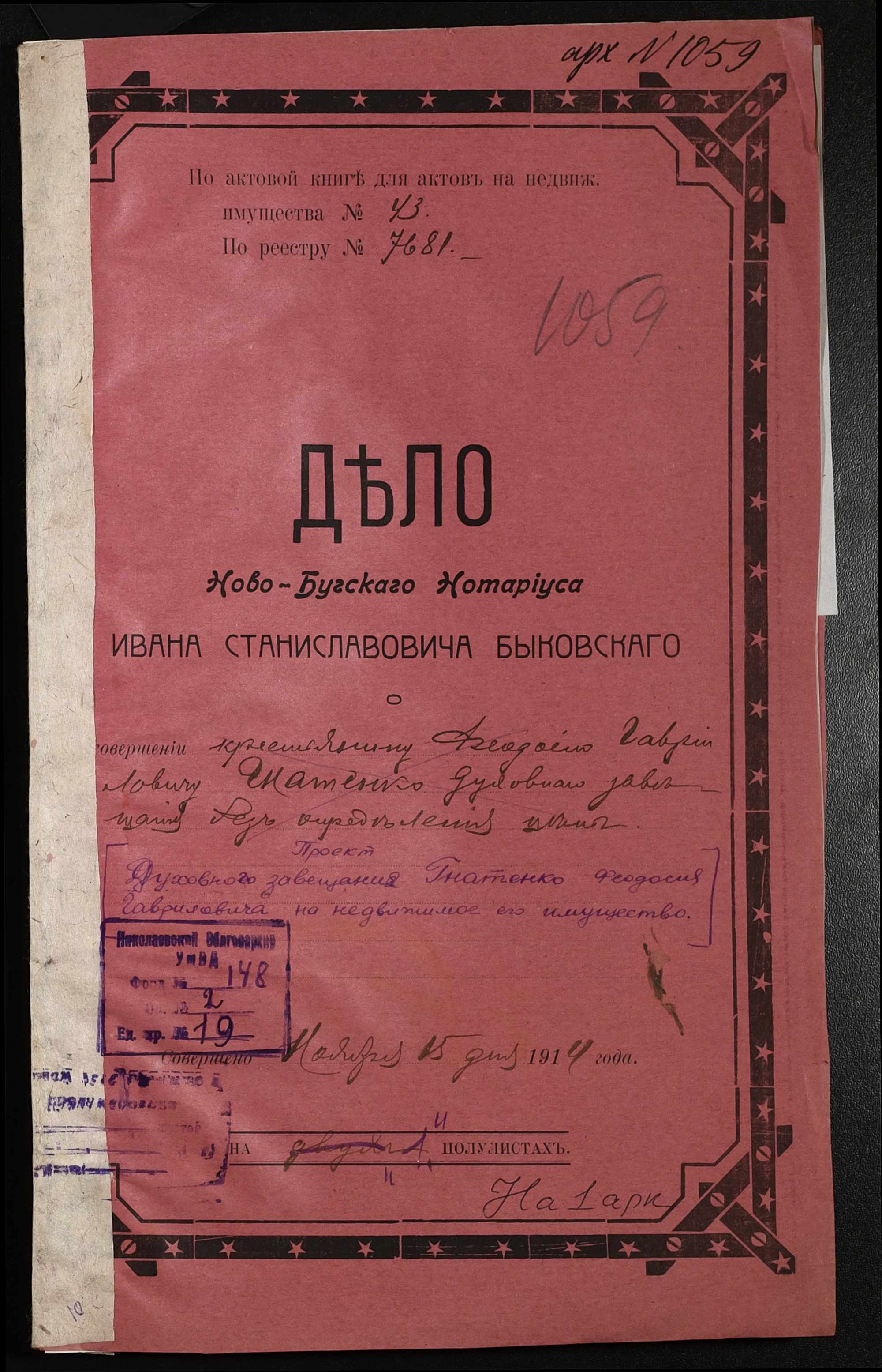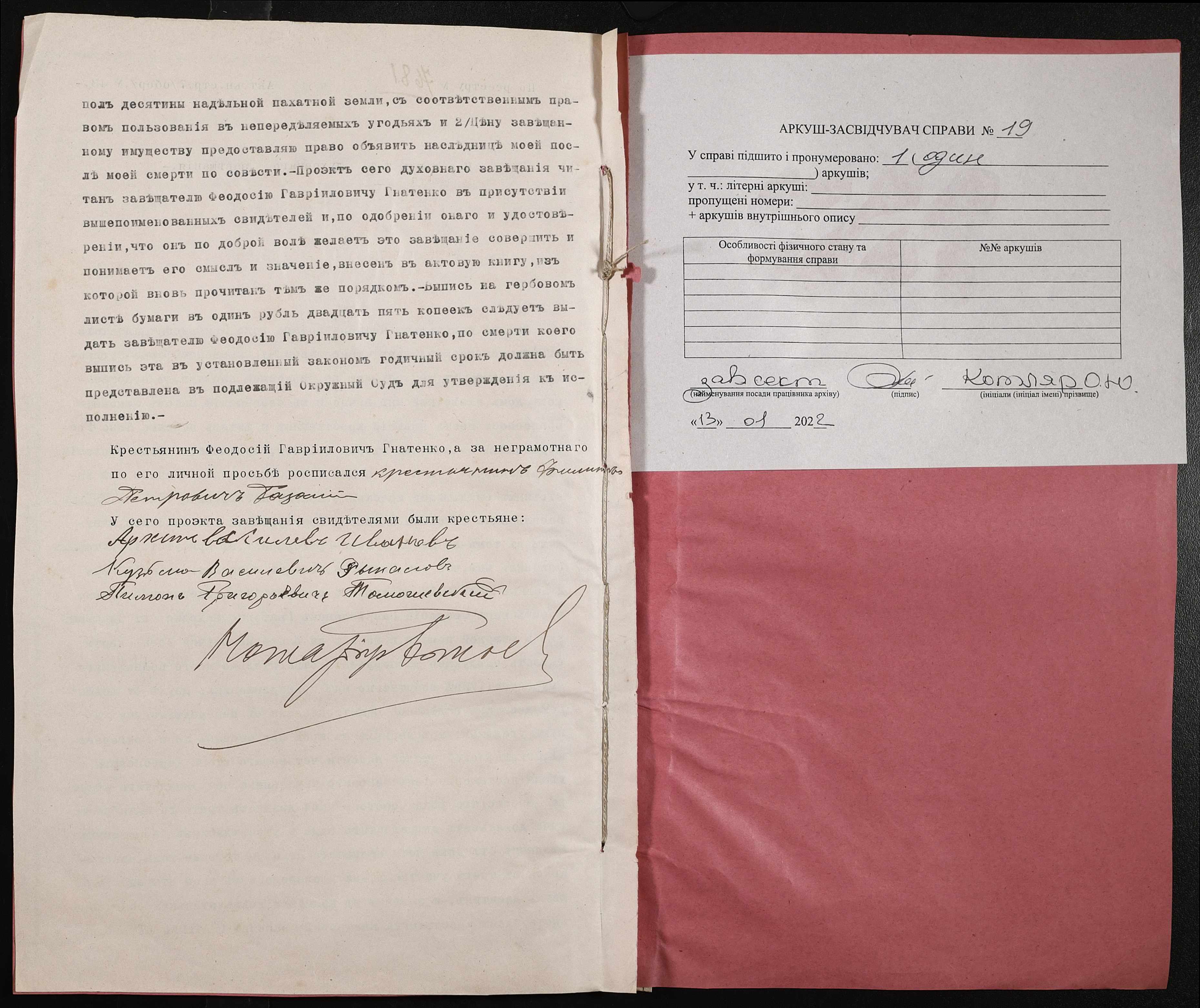 • • • • Справа № 19 “Проєкт духівниці на нерухоме майно Гнатенка Феодосія Гавриловича (Гнатенко Феодосия Гаврииловича)”