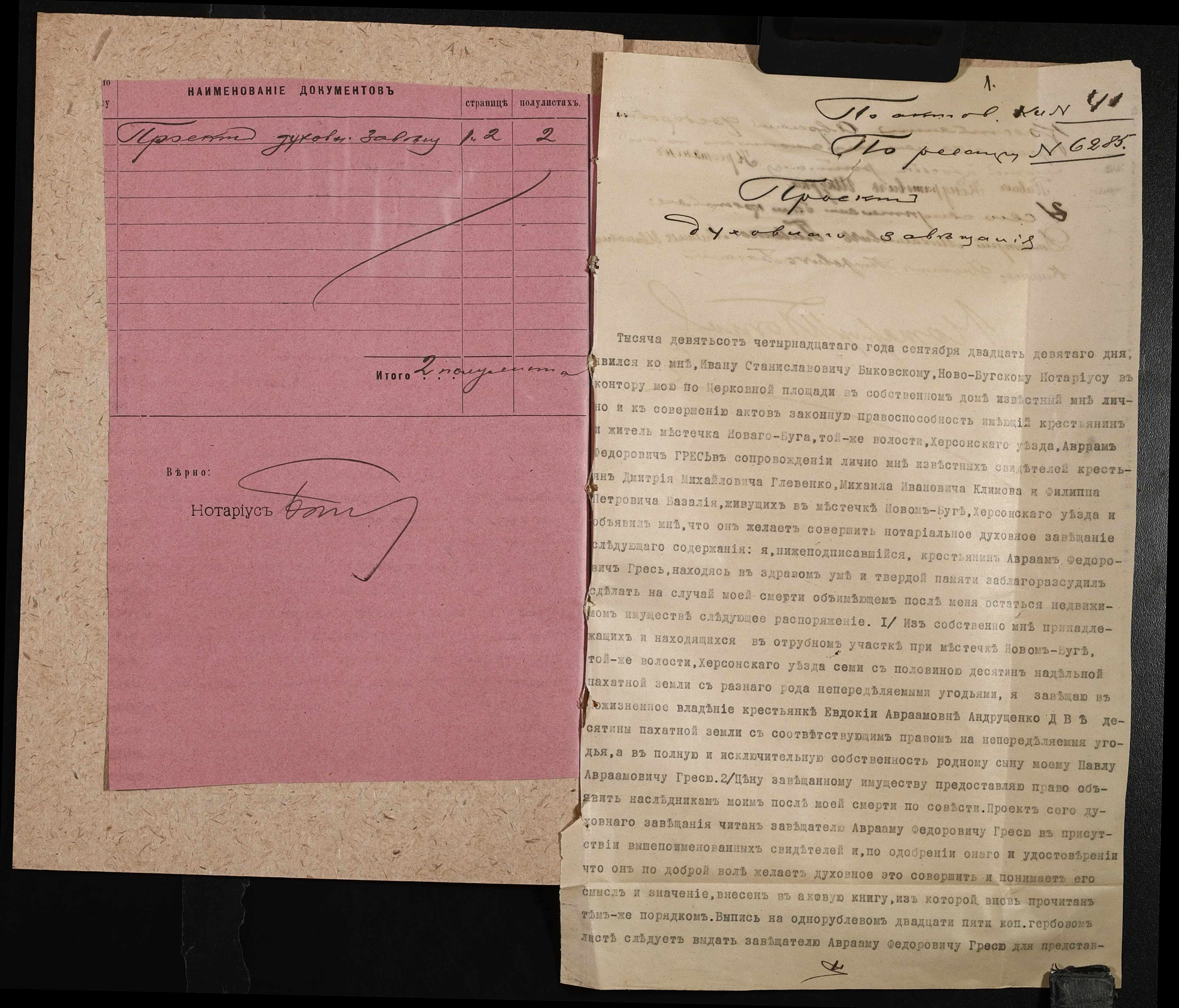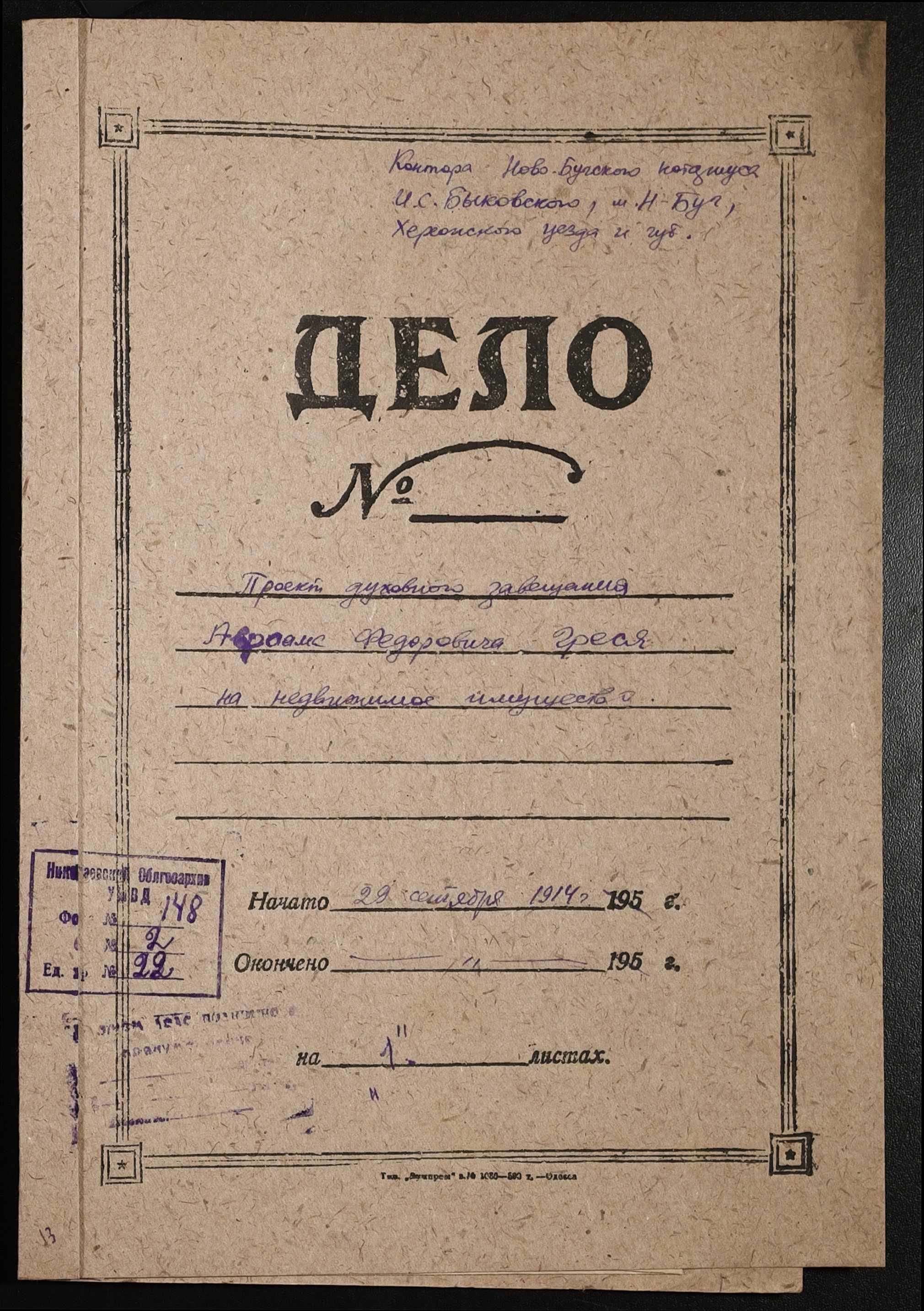 • • • • Справа № 22 “Проєкт духівниці на нерухоме майно Греся Авраама Федоровича”
