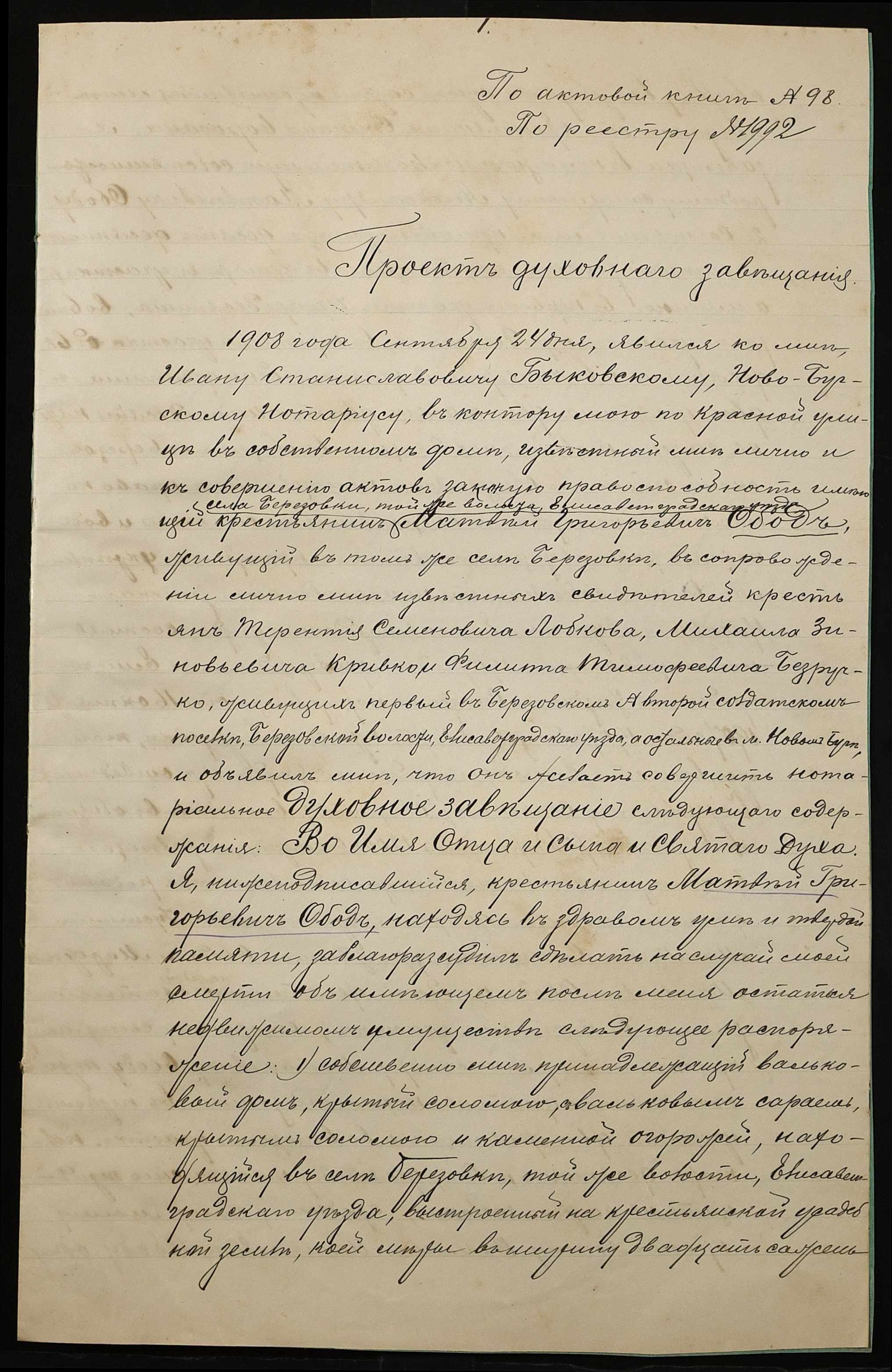 • • • • Справа № 45 “Проєкт духівниці на нерухоме майно Обода Матвія Григоровича (Матвея Григорьевича)”