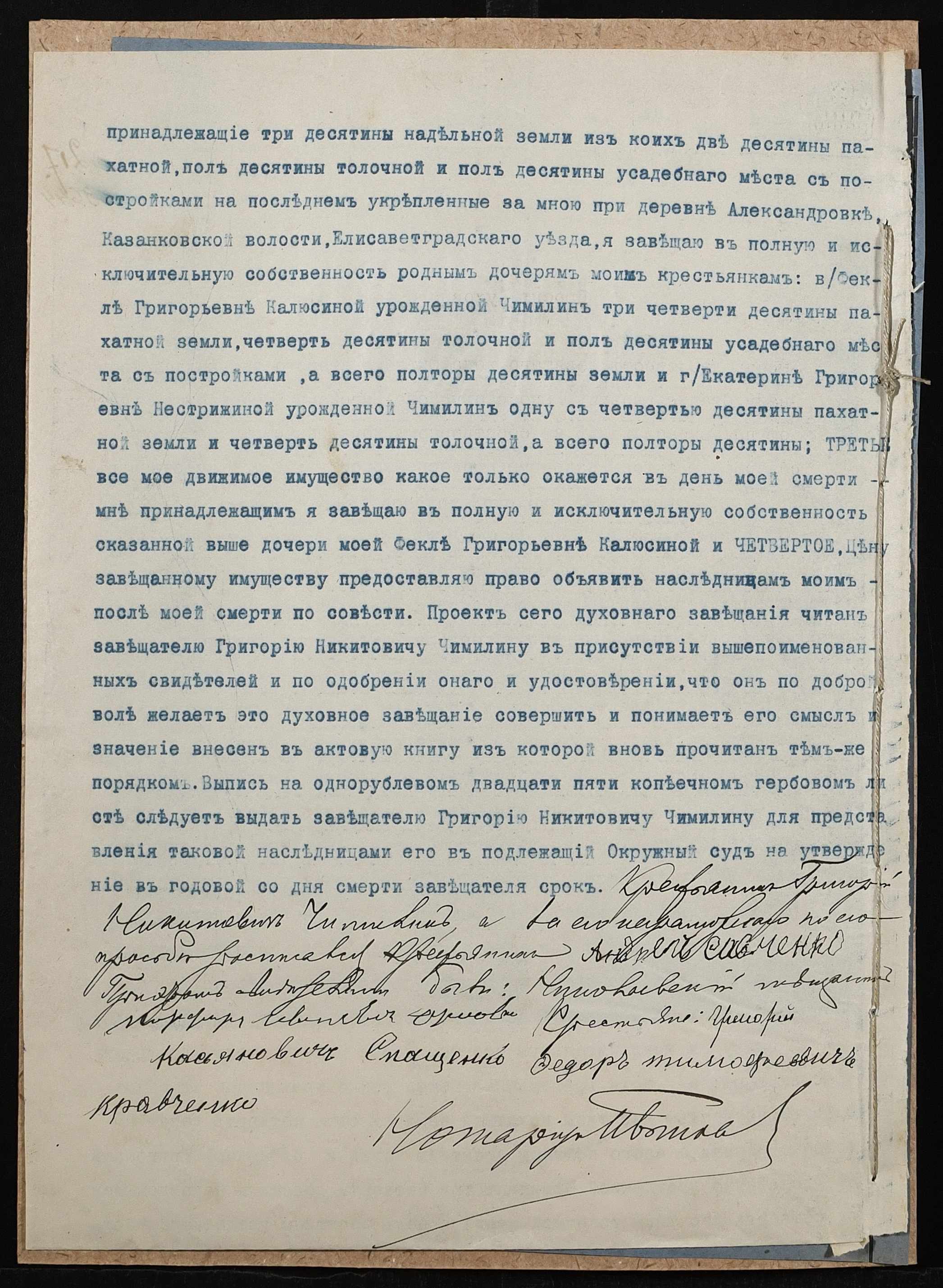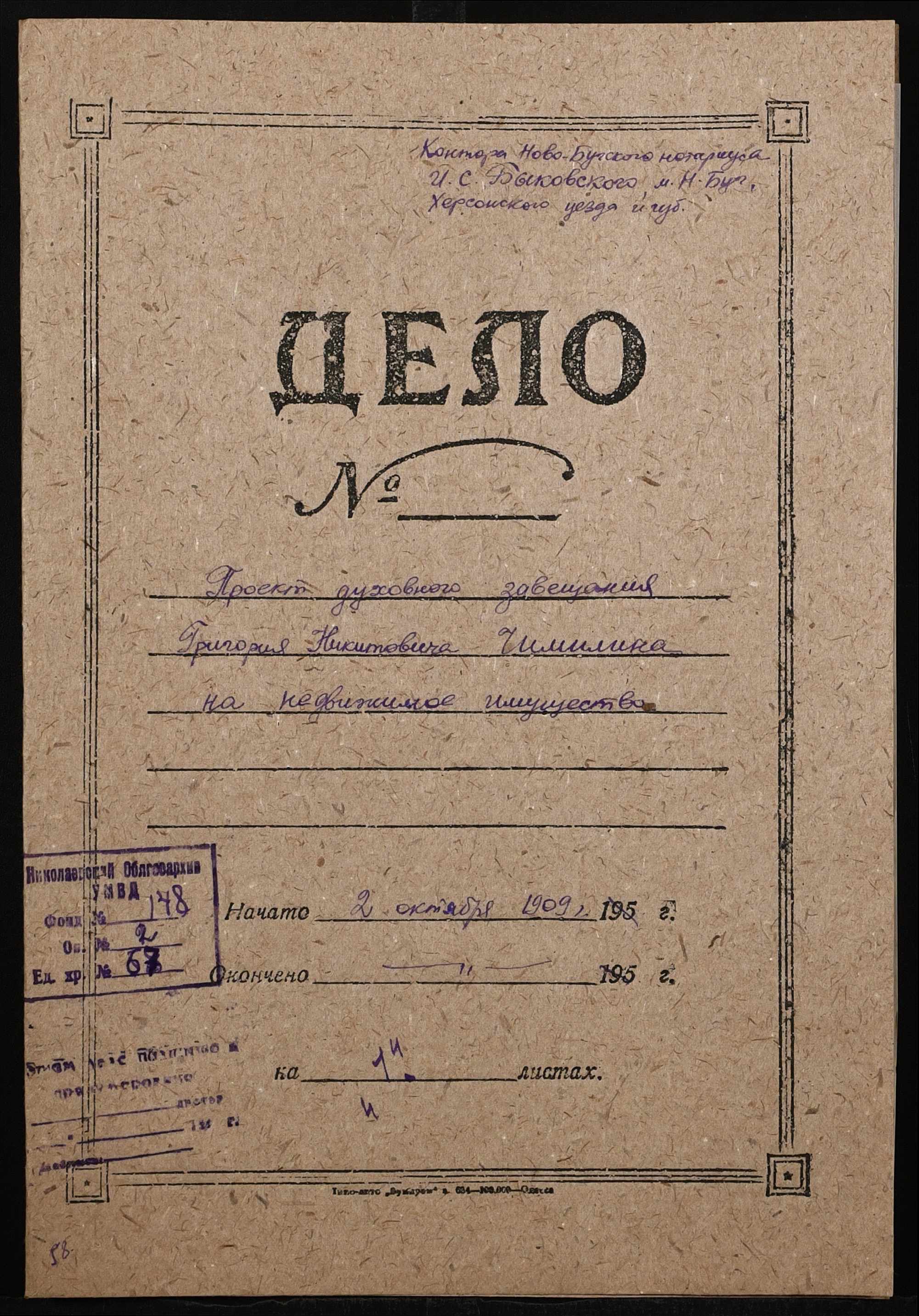 • • • • Справа № 67 “Проєкт духівниці на нерухоме майно Чиміліна Григорія Микитовича (Чимилина Григория Никитовича)”