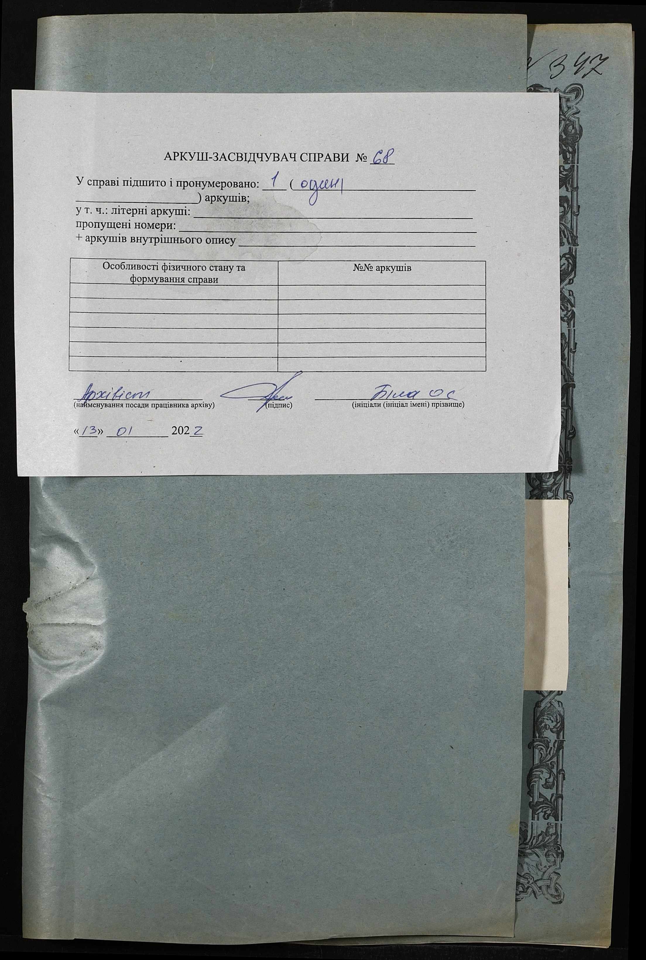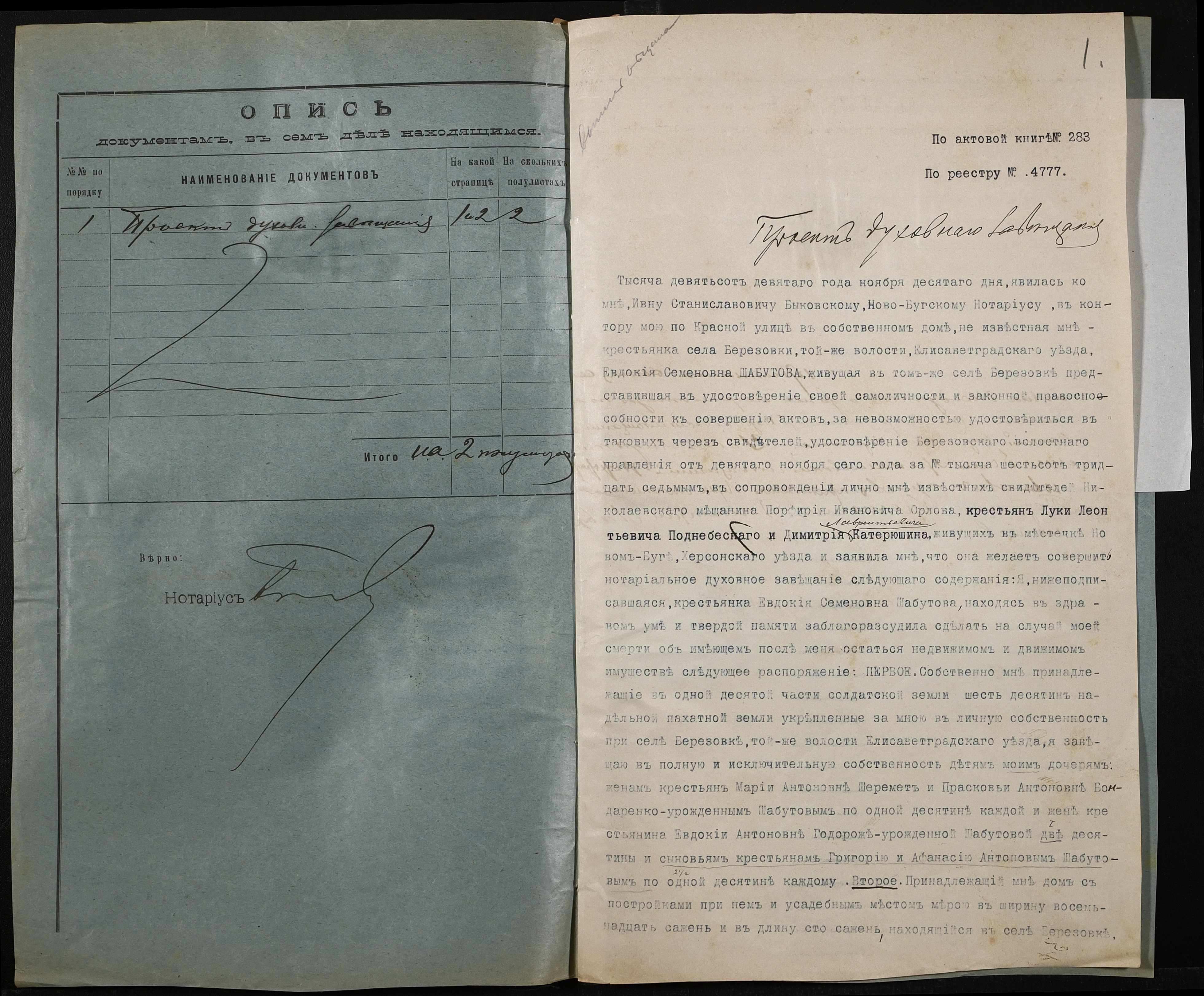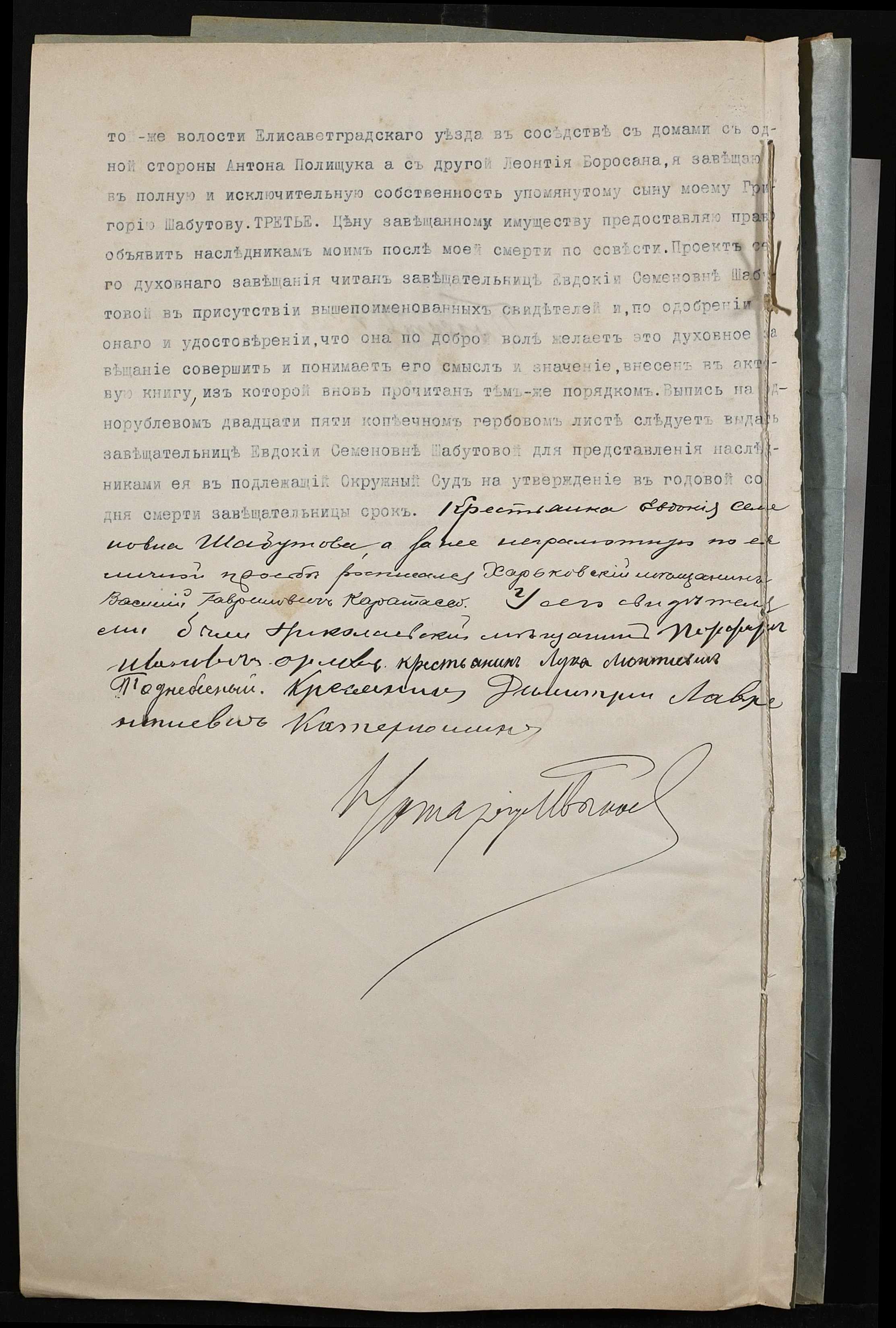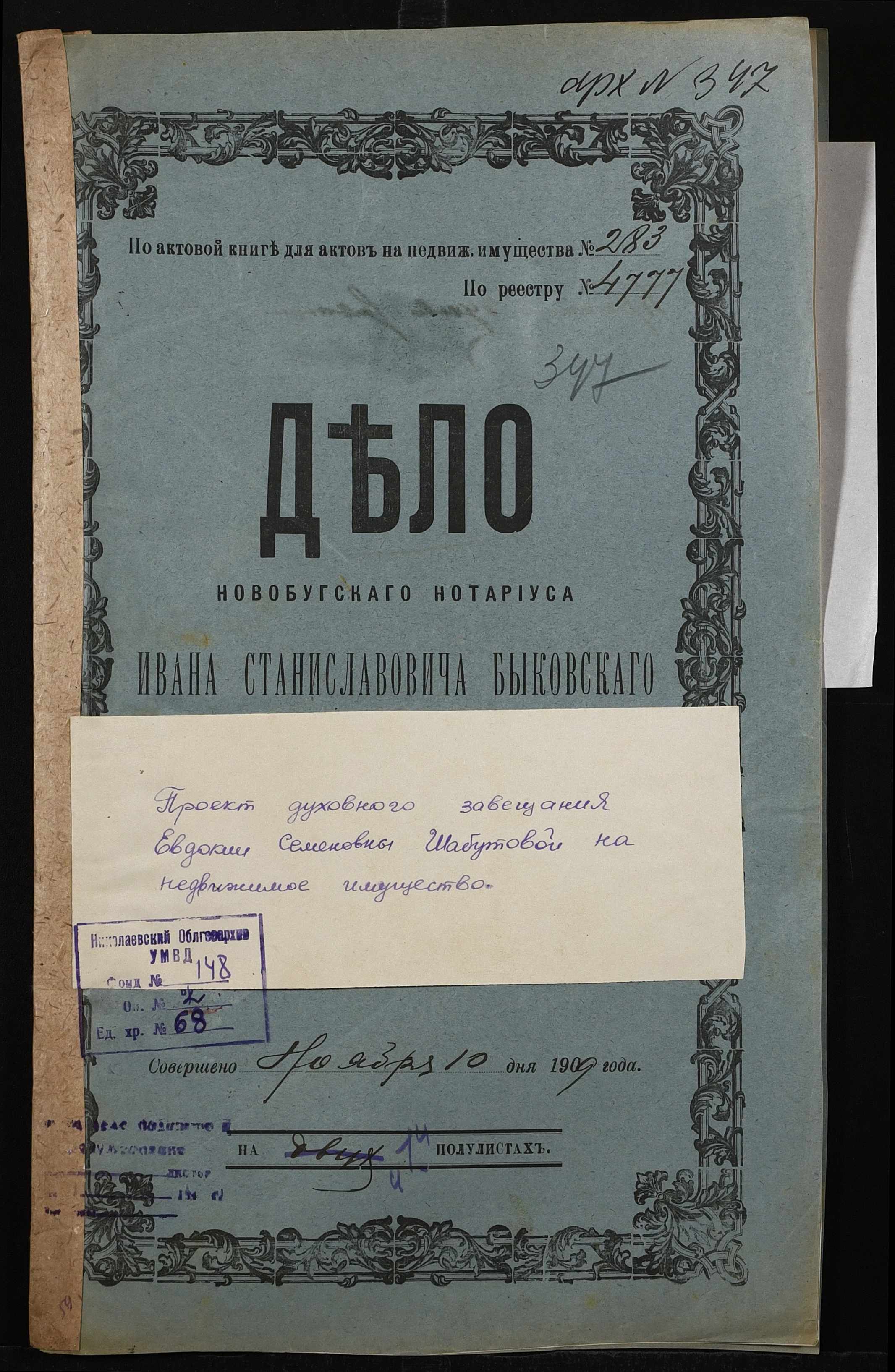 • • • • Справа № 68 “Проєкт духівниці на нерухоме майно Шабутової Євдокії Семенівни (Шабутовой Евдокии Семеновны)”