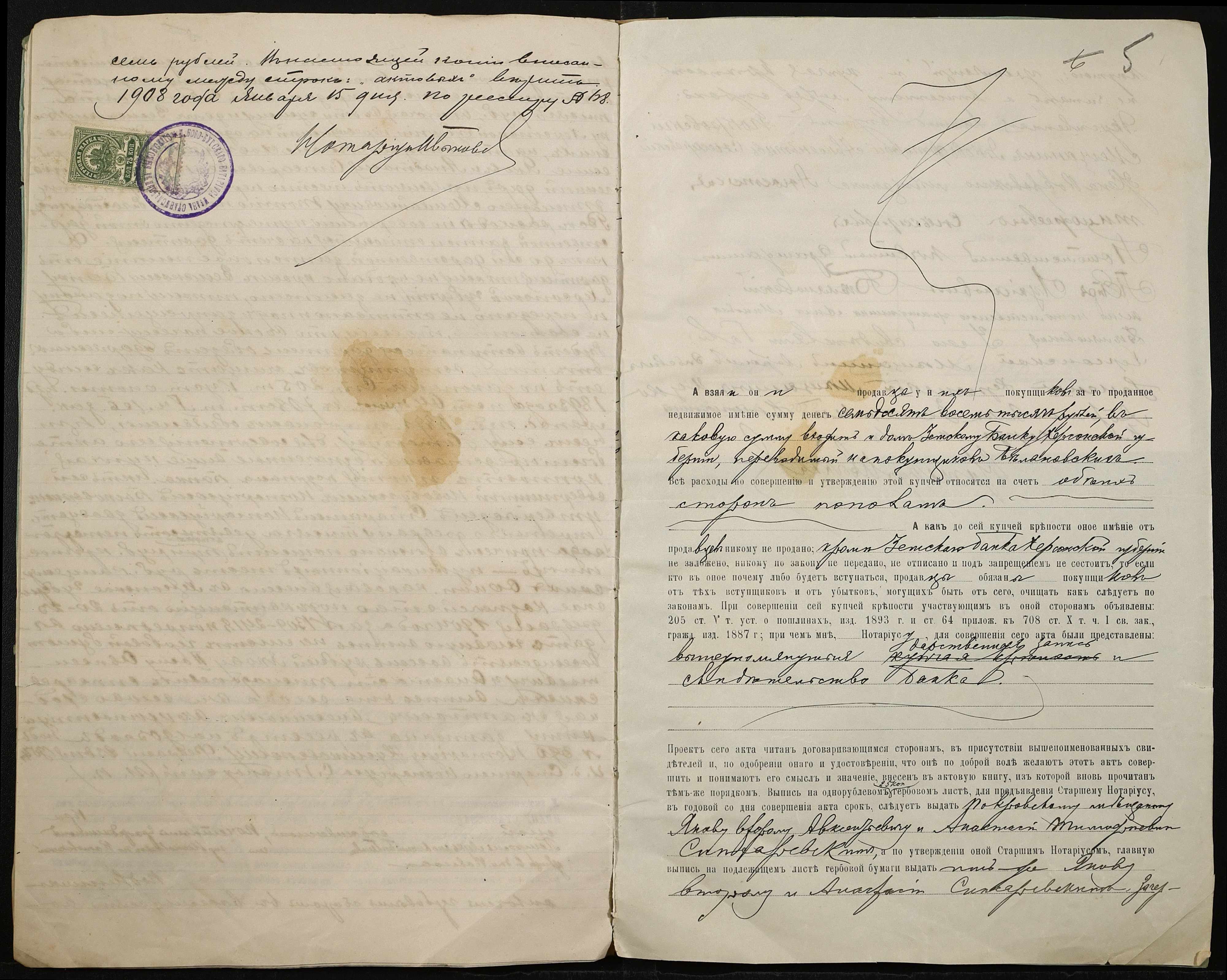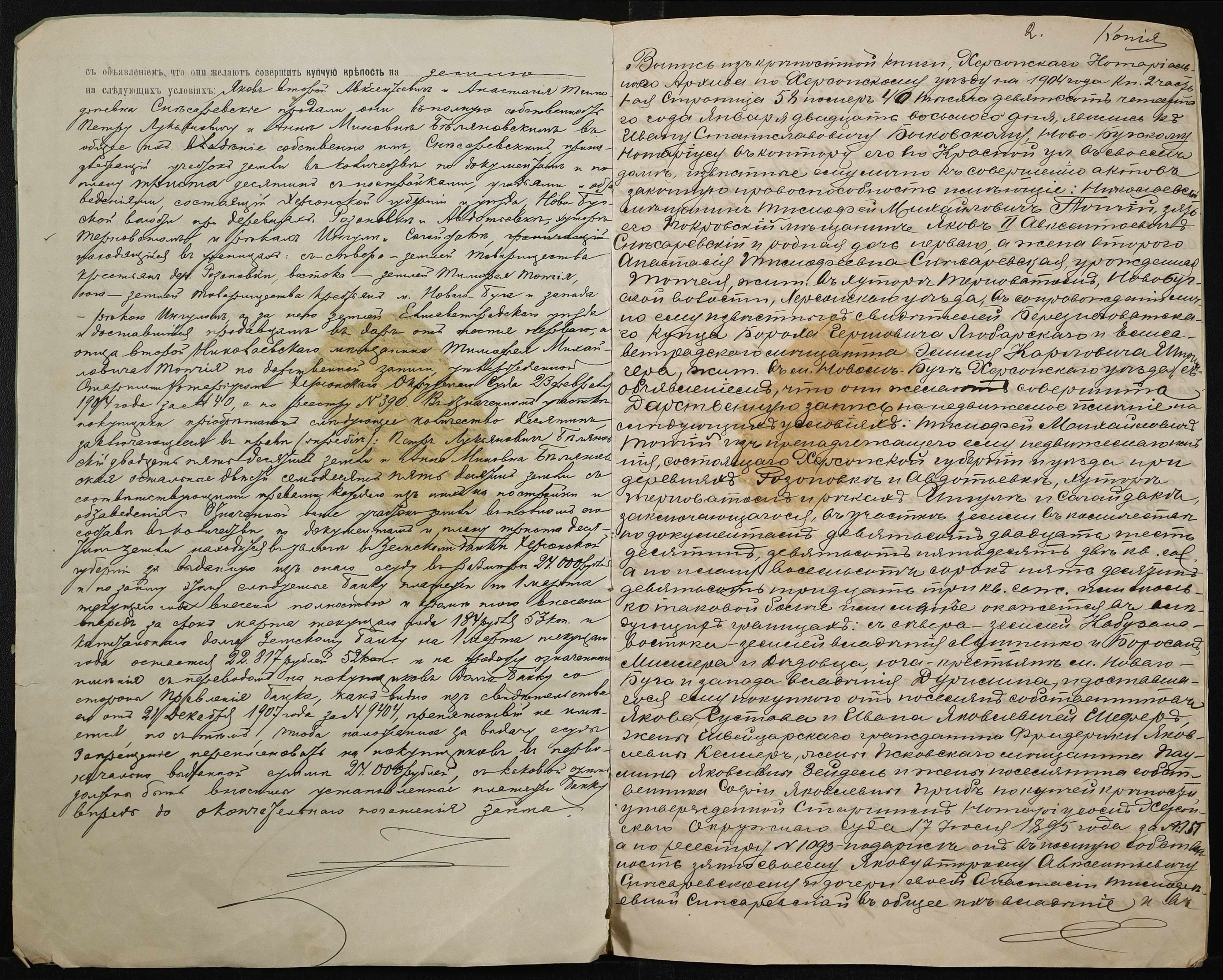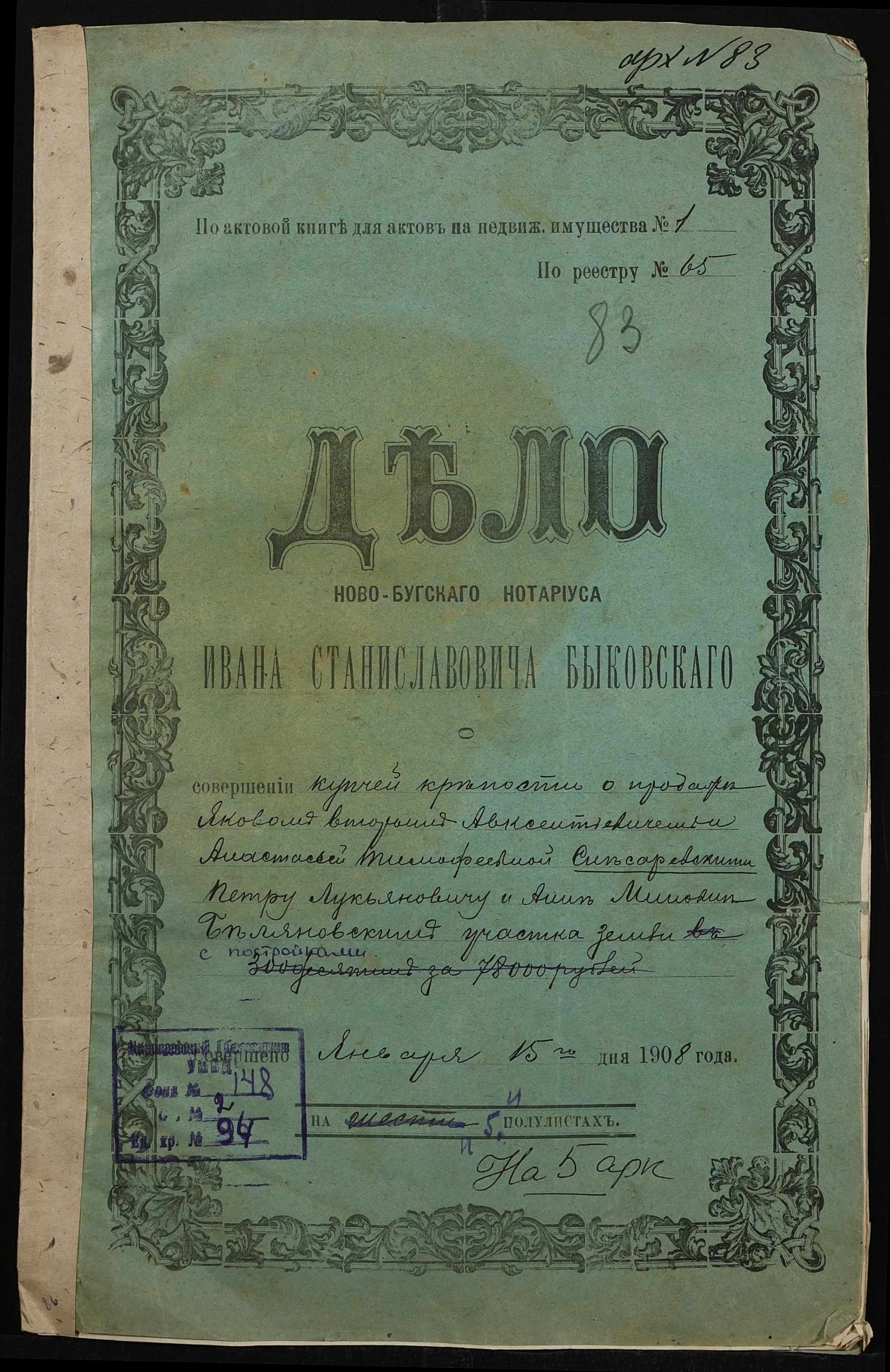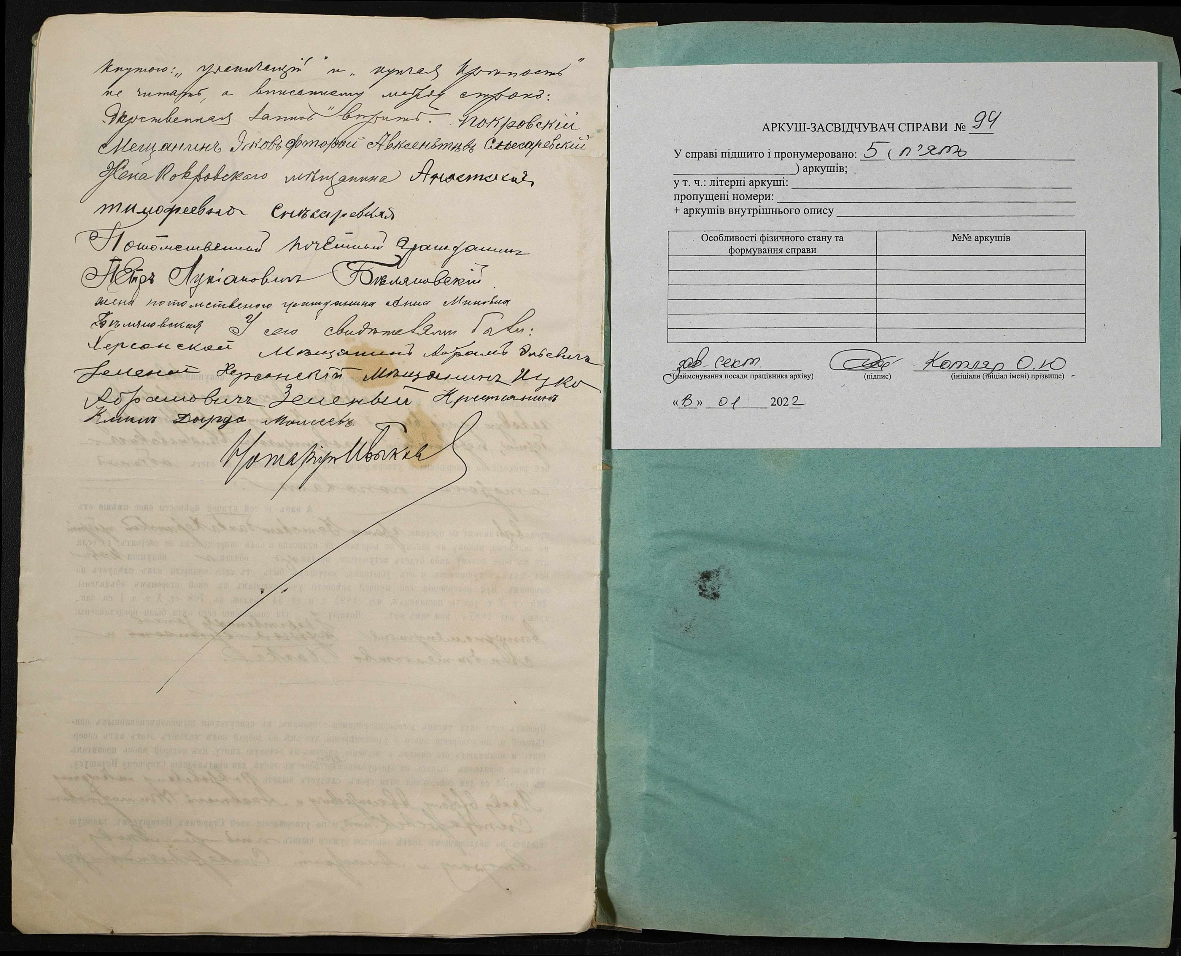 • • • • Справа № 94 “Справа про вчинення купчої про продаж землі Слесаревським (Слесаревским) Яковом другим Овксентійовичем (Авксентьевичем) і Слесаревською Анастасією Тимофіївною (Слесаревской Анастасией Тимофеевной) на користь Бєляновського (Беляновского) Петра Лук’яновича (Лукьяновича) і Бєляновської Ганни Минівни (Беляновской Анны Миновны)”