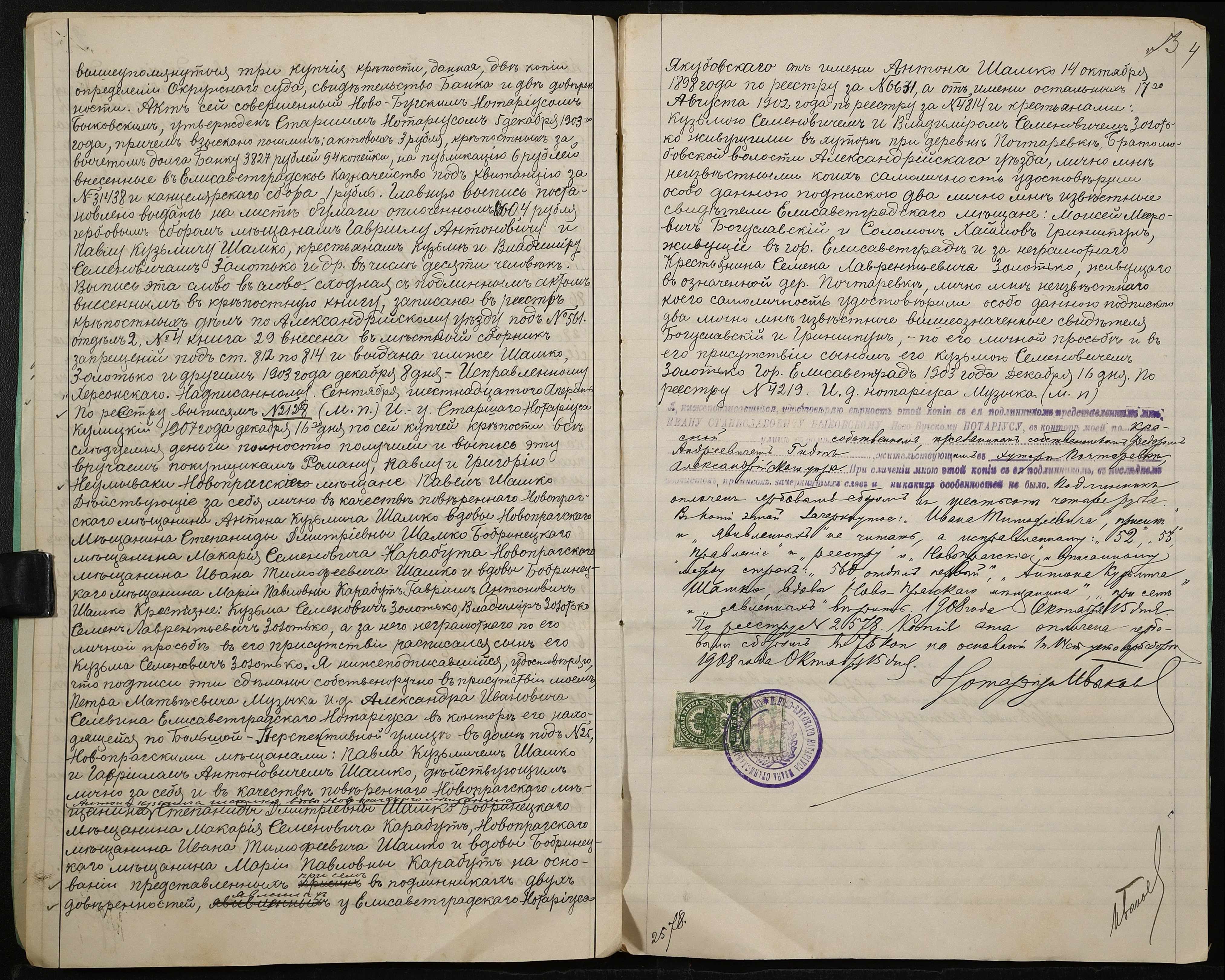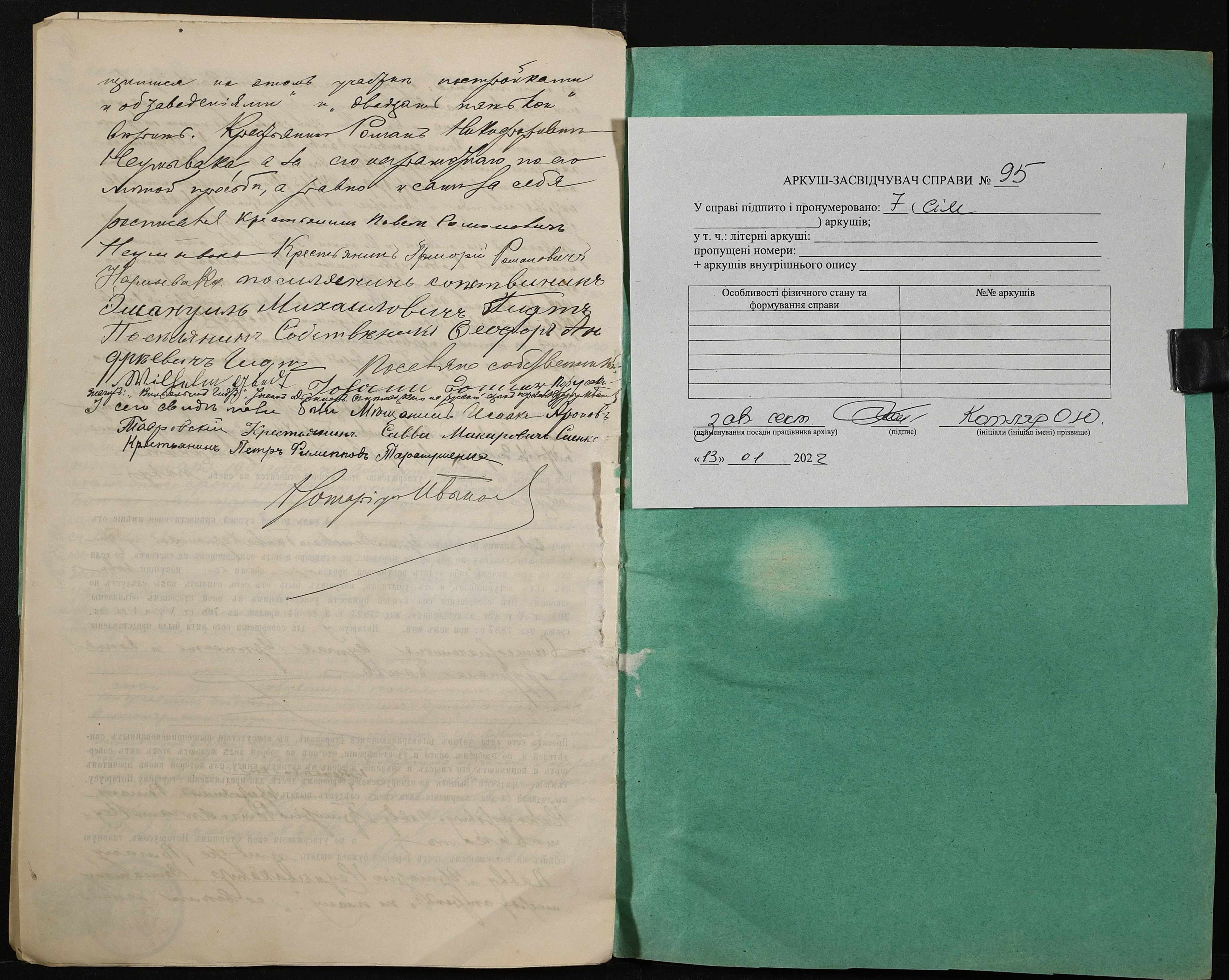 • • • • Справа № 95 “Справа про вчинення купчої про продаж землі селянами Неумивакою (Неумывакой) Романом Никифоровичем, Неумивакою (Неумывакой) Павлом Романовичем і Неумивакою Григорієм (Неумывакой Григорием) Романовичем на користь селян-власників Гідта Еммануїла (Гидта Эммануила) Михайловича, Гідта Вільгельма Фрідріховича (Гидта Вильгельма Фридриховича), Гідта (Гидта) Федора Андрійовича (Андреевича) і Доннера Йоганна (Иоганна) Петровича”