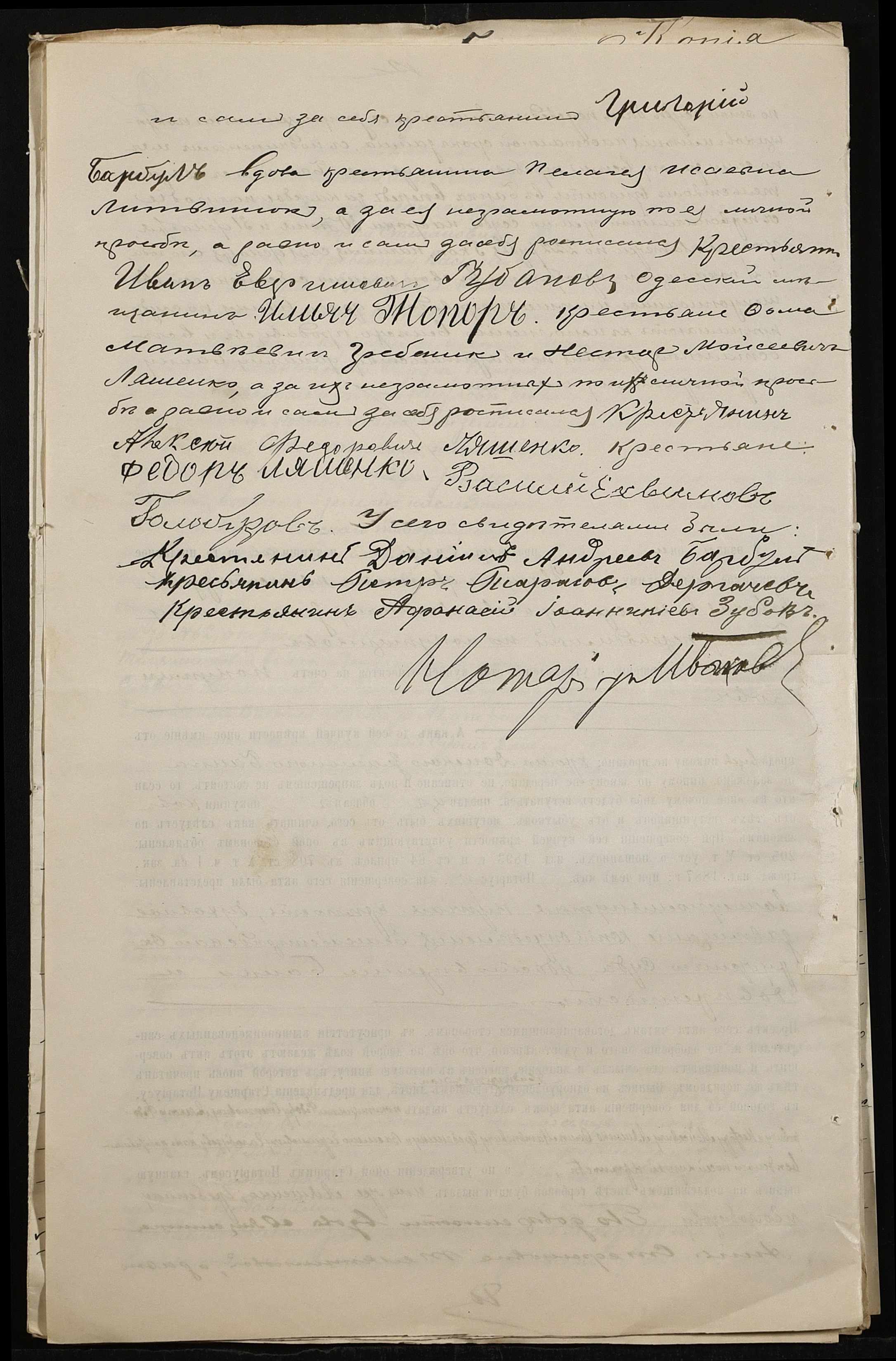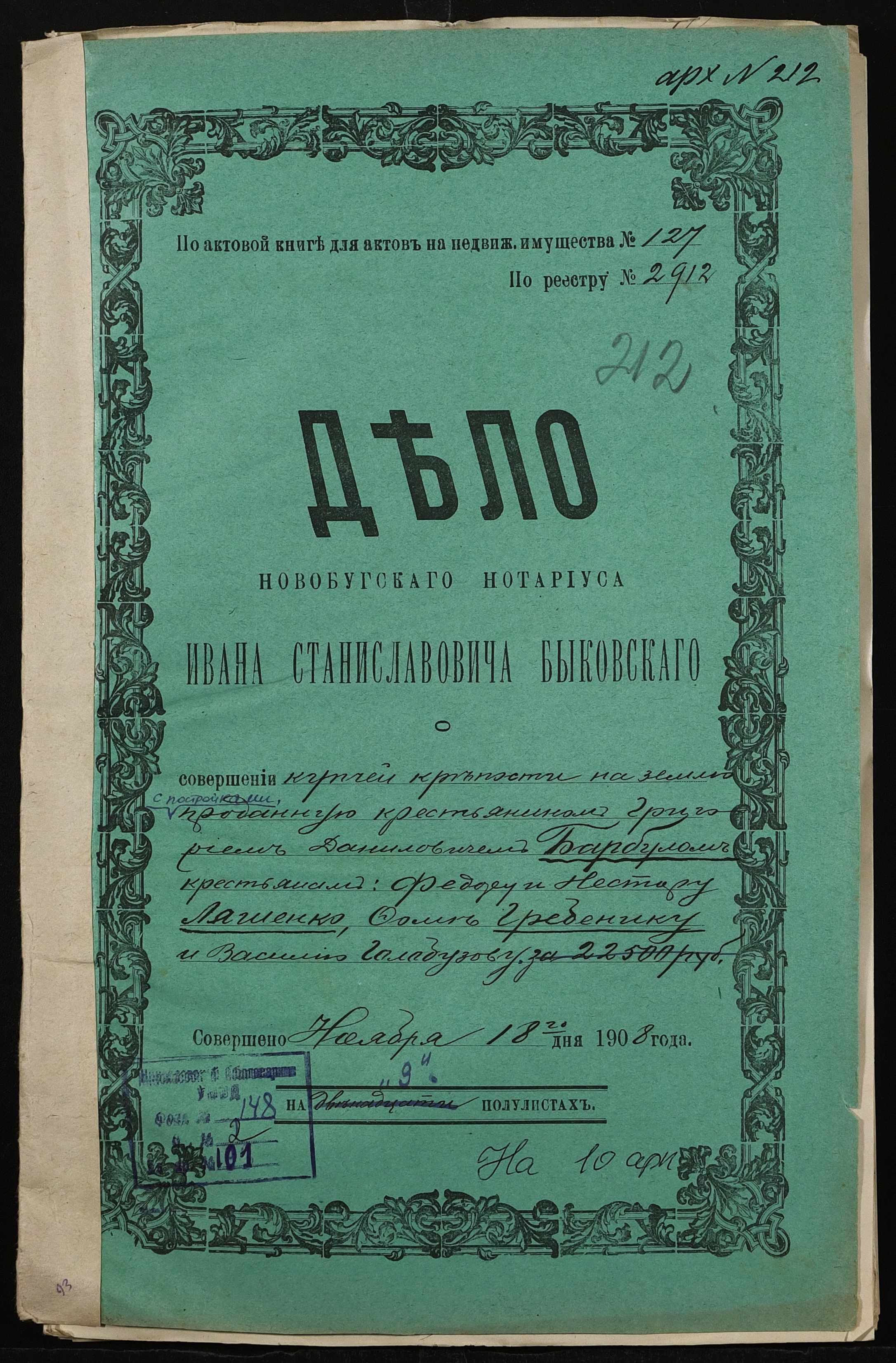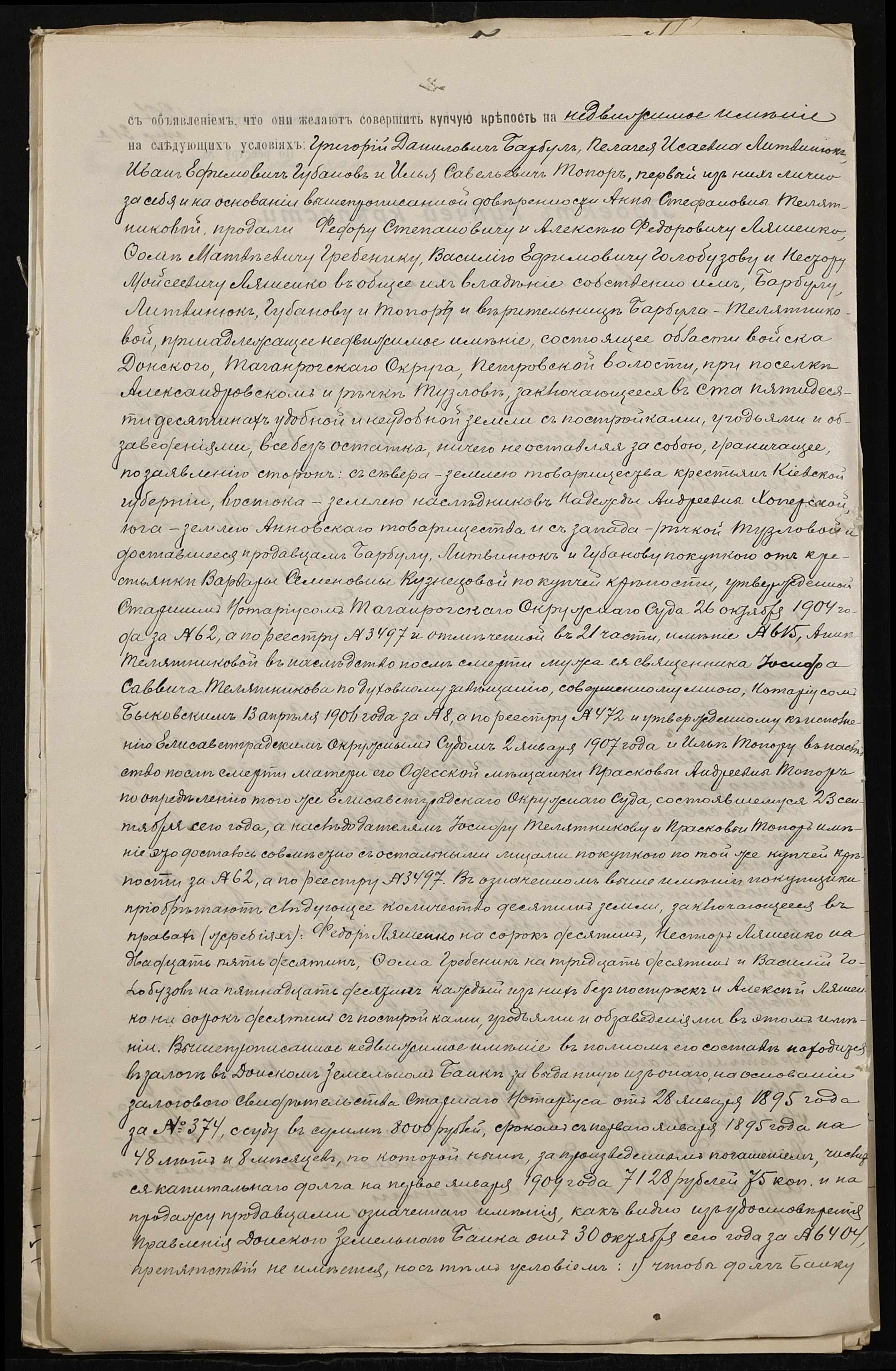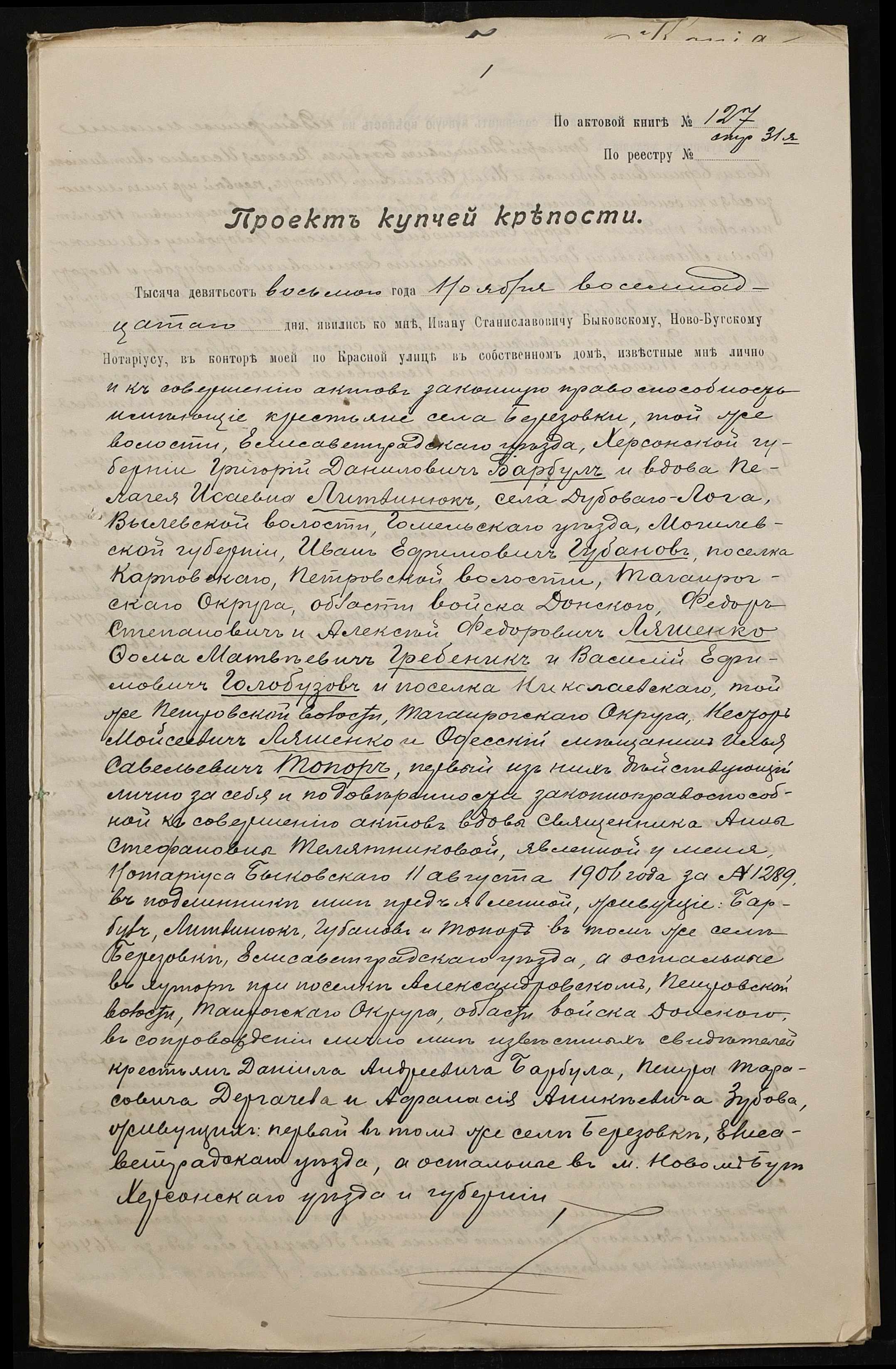 • • • • Справа № 101 “Справа про вчинення купчої про продаж землі селянином Барбулом Григорієм (Григорием) Даниловичем на користь селян Ляшенка (Ляшенко) Федора, Ляшенка (Ляшенко) Нестора, Гребеника Хоми (Фомы) і Галабузова Василя (Василия)”