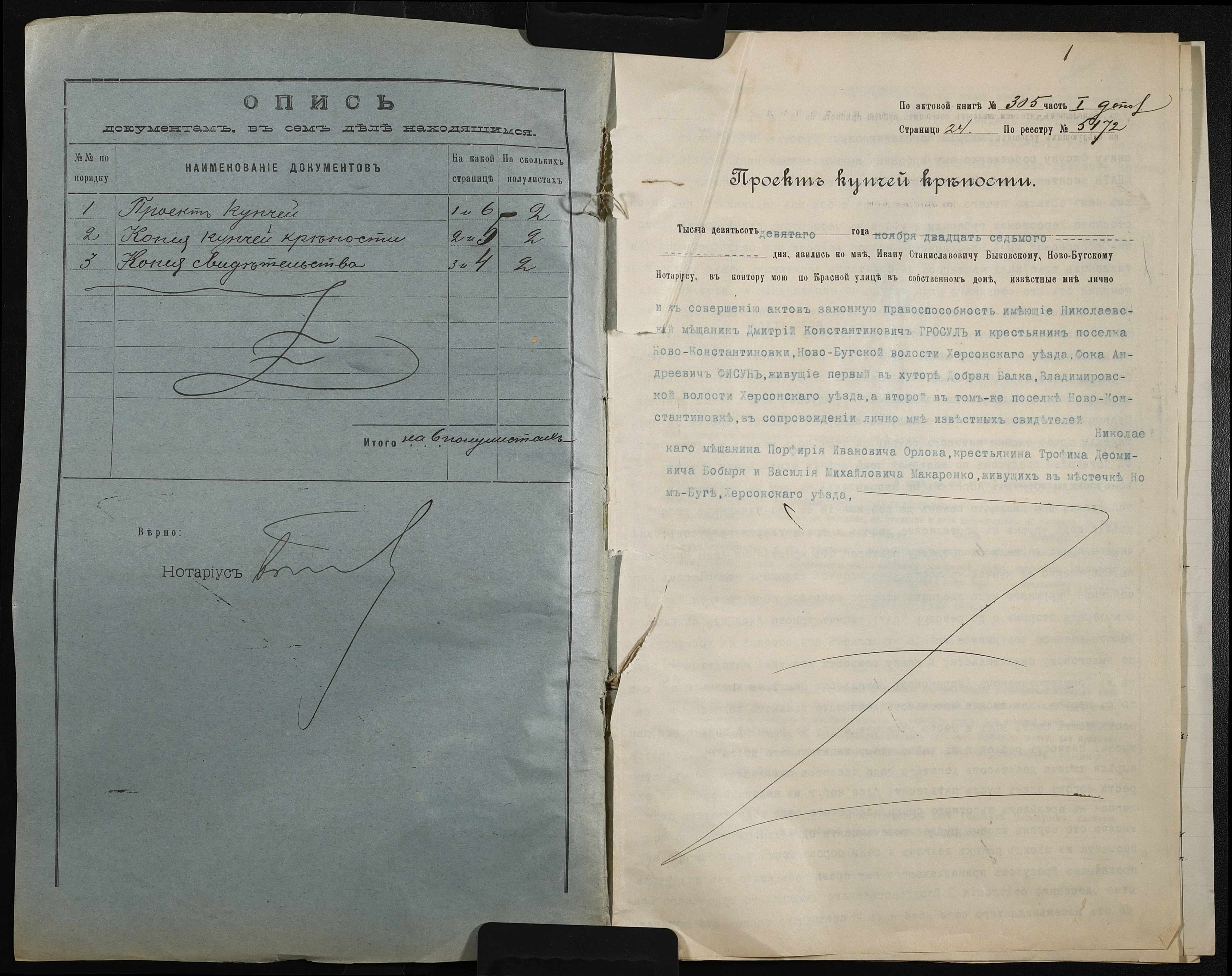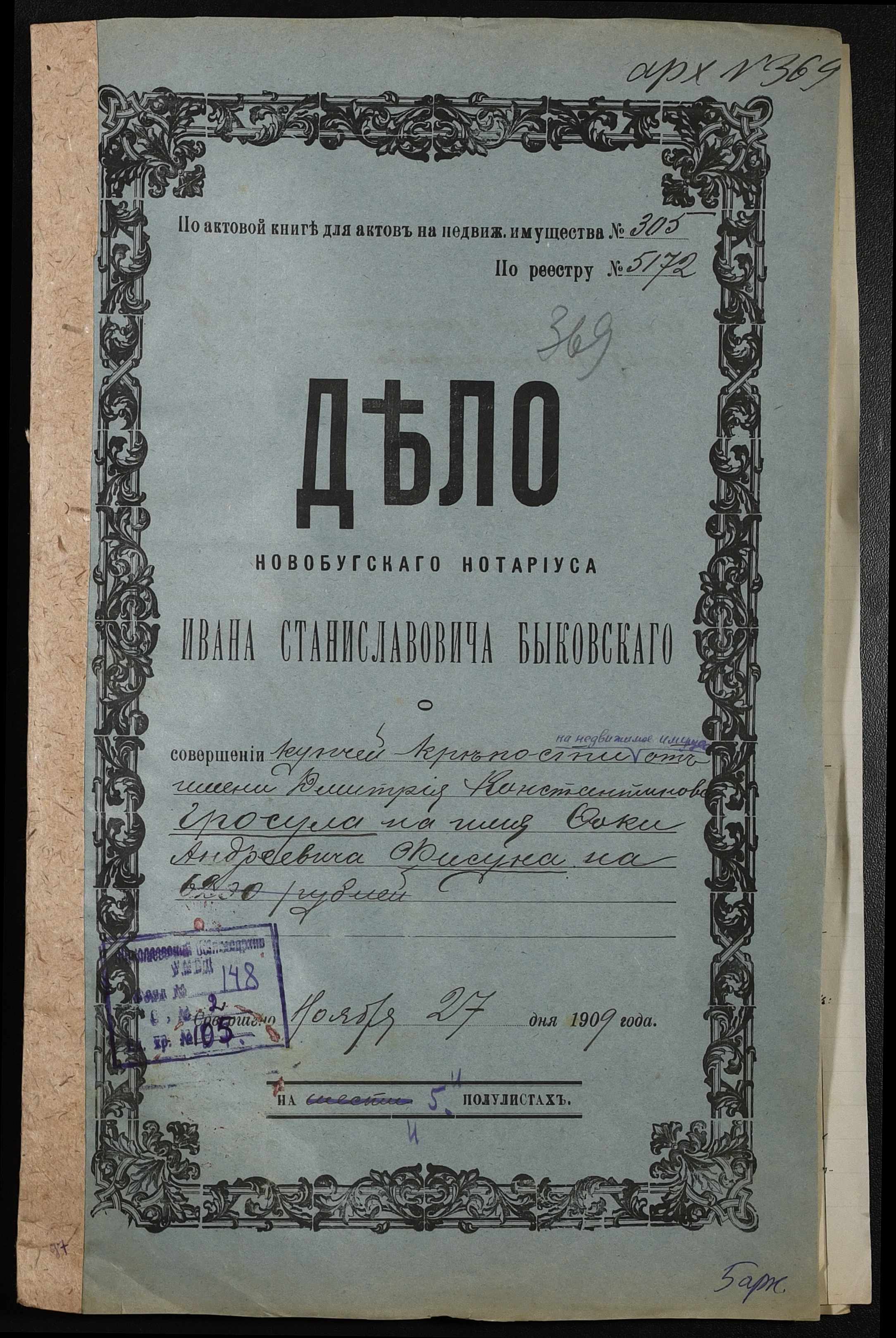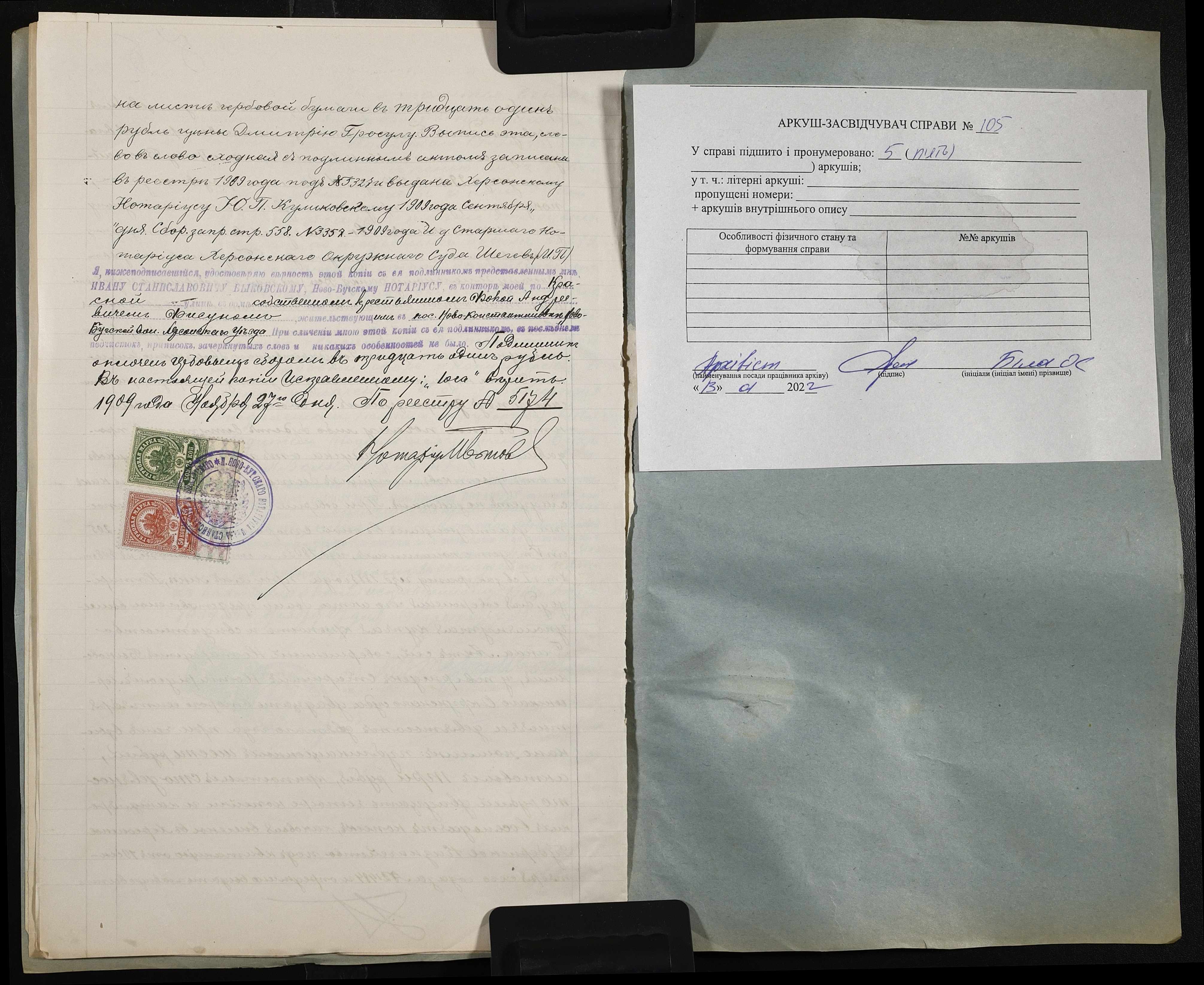 • • • • Справа № 105 “Справа про вчинення купчої про продаж нерухомого майна міщанином Гросулом Дмитром Костянтиновичем (Дмитрием Константиновичем) на користь селянина Фісуна (Фисуна) Фоки Андрійовича (Андреевича)”