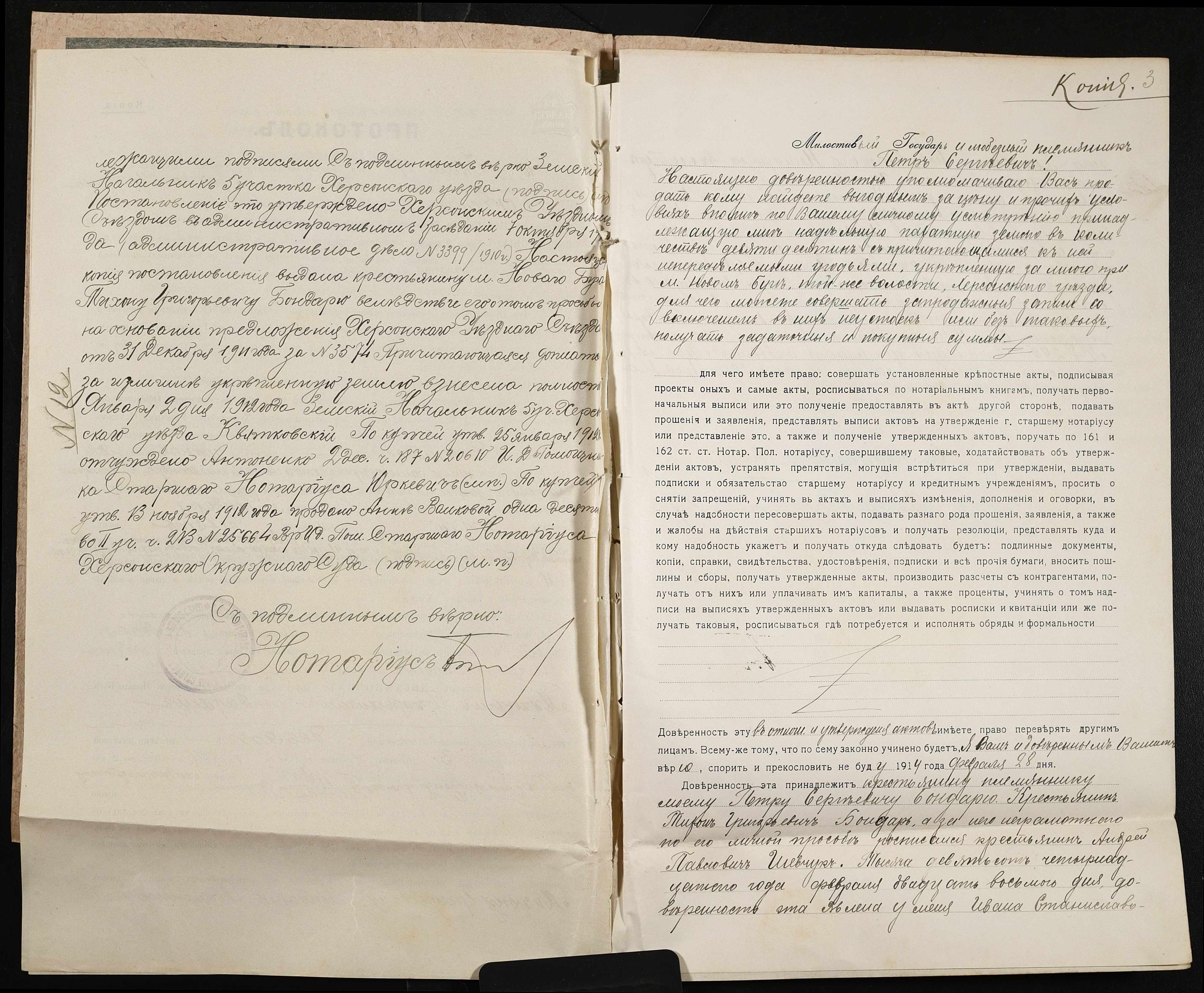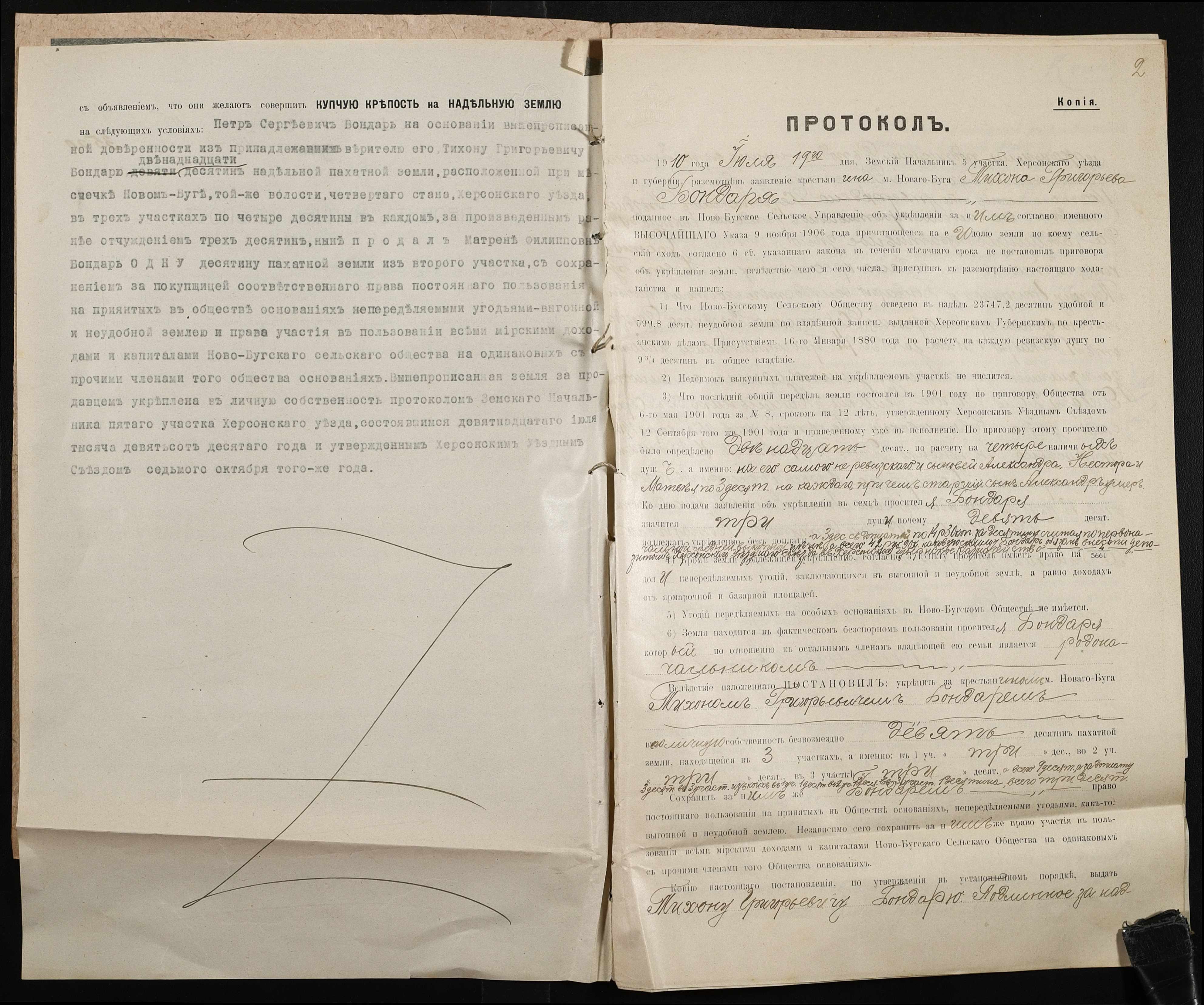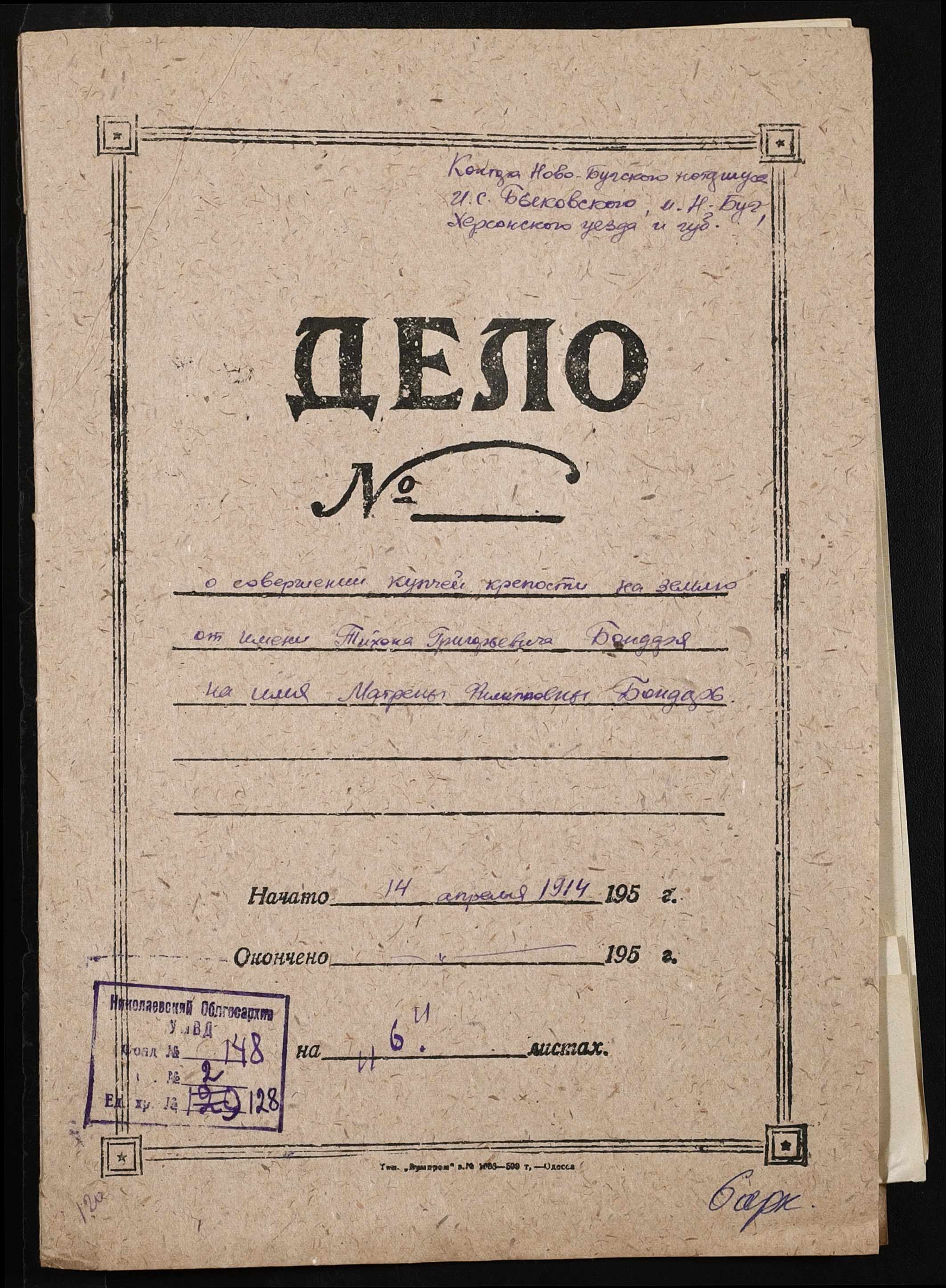 • • • • Справа № 128 “Справа про вчинення купчої про продаж землі селянином Бондарем Тихоном Григоровичем (Григорьевичем) на користь селянки Бондар Матрони Пилипівни (Бондарь Матрены Филипповны)”
