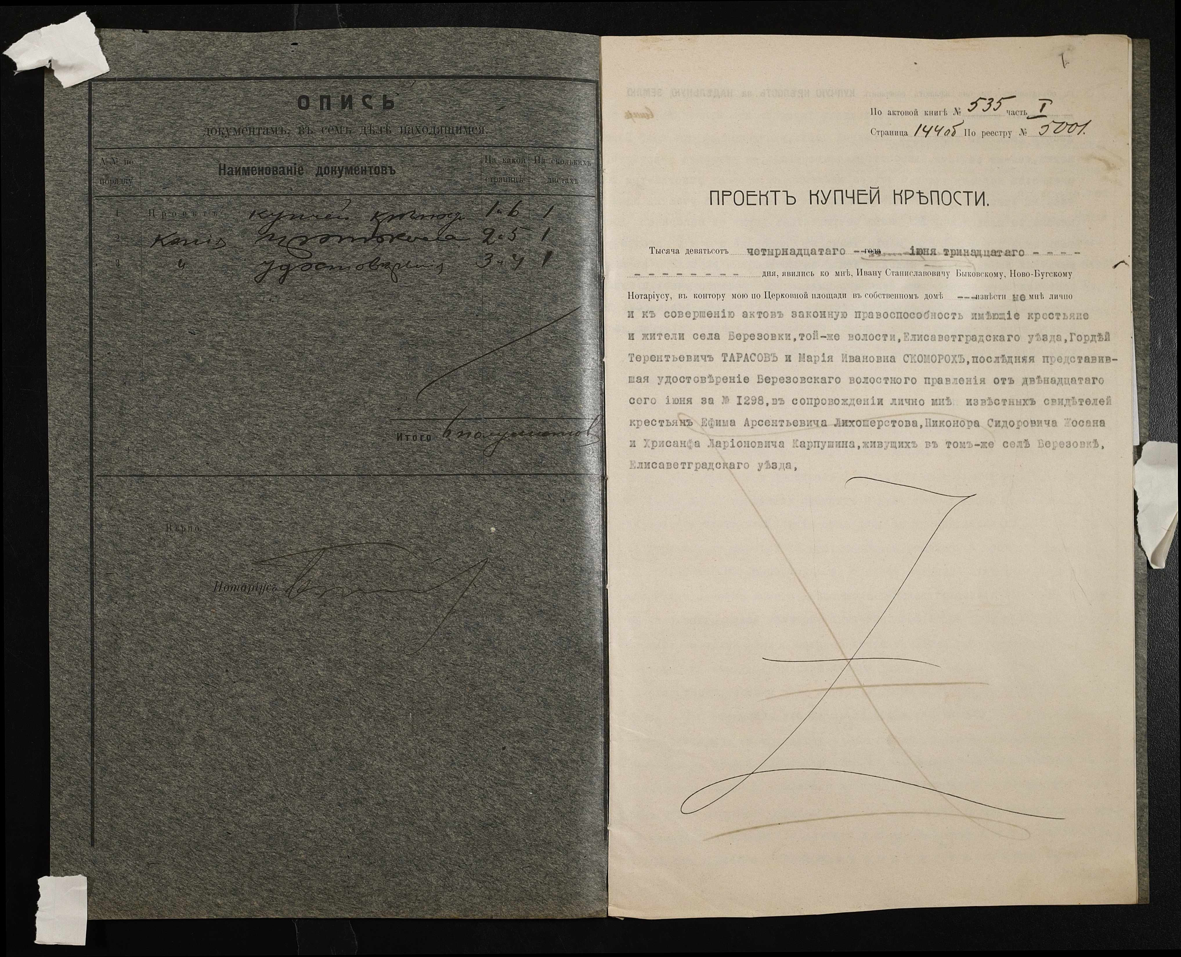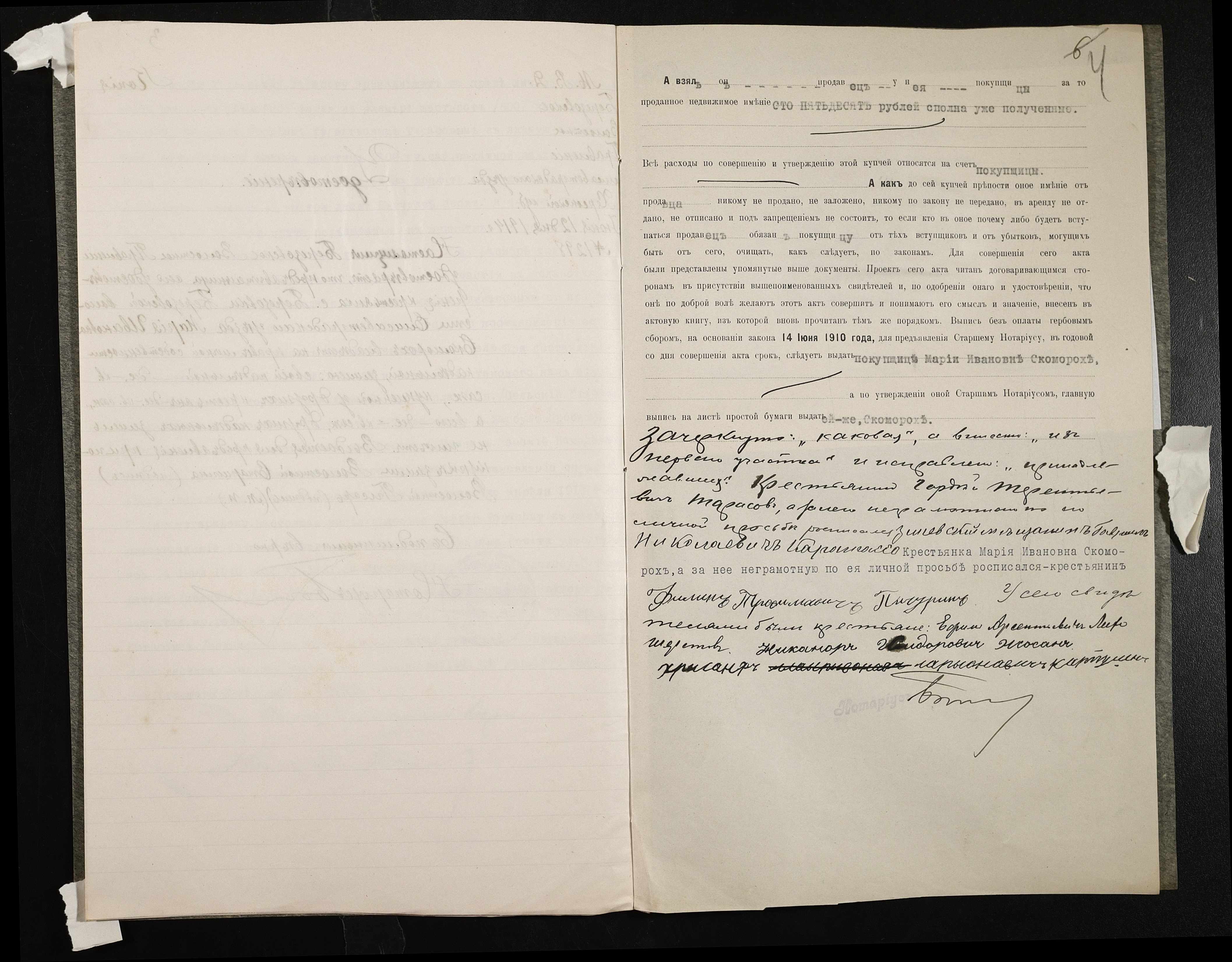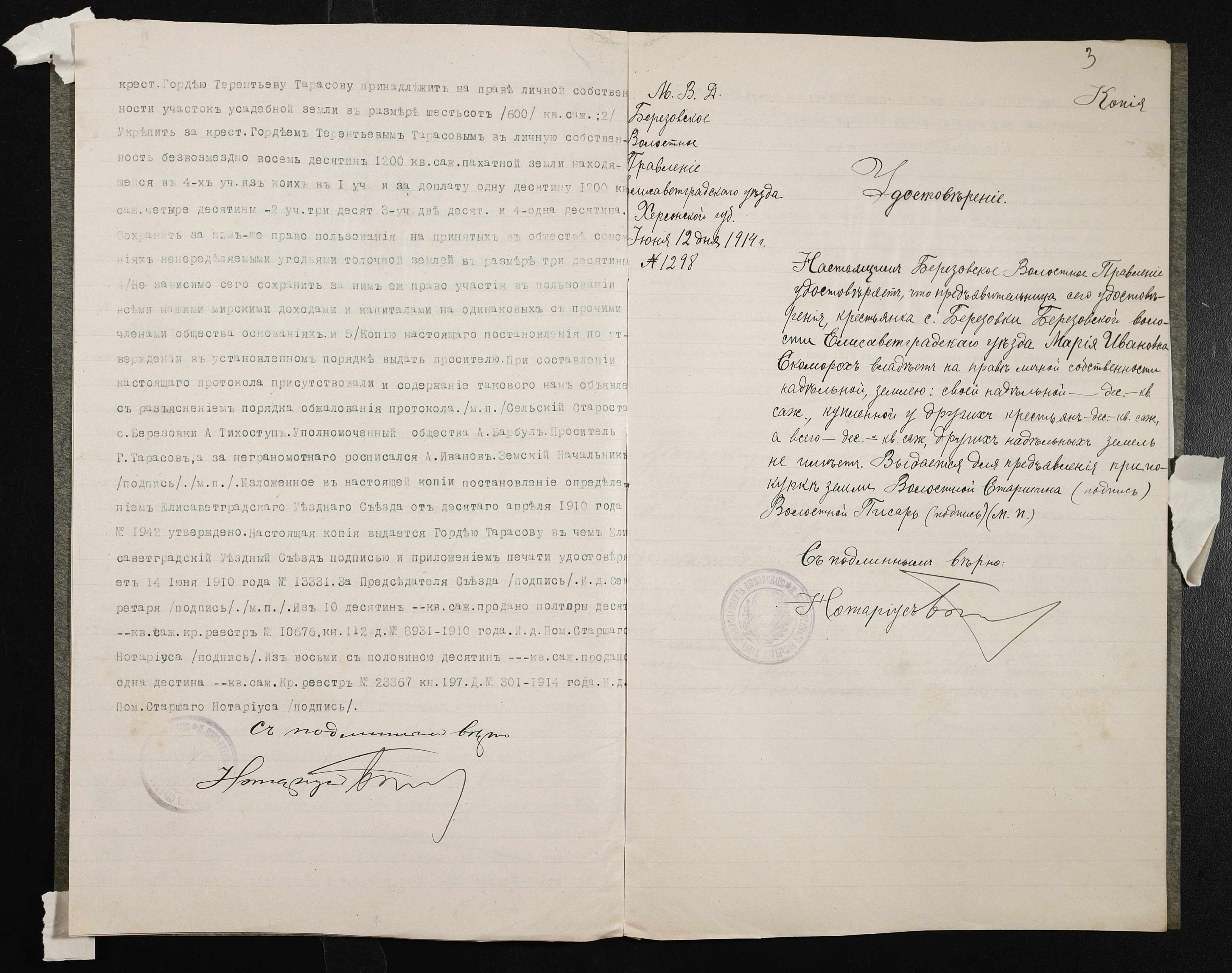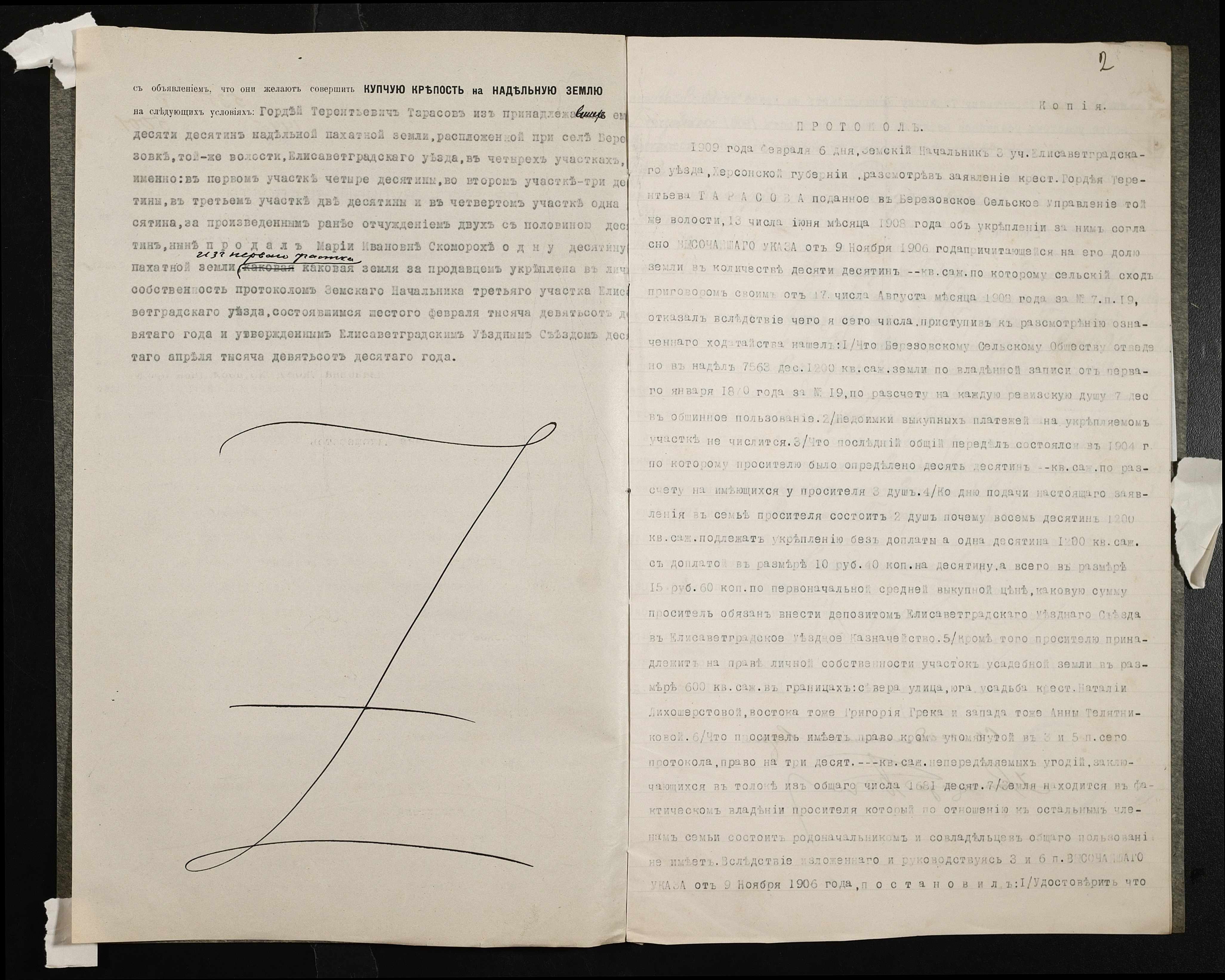 • • • • Справа № 133 “Справа про вчинення купчої про продаж землі селянином Тарасовим Гордієм (Тарасовым Гордеем) на користь селянки Скоморох Марії (Марии)”