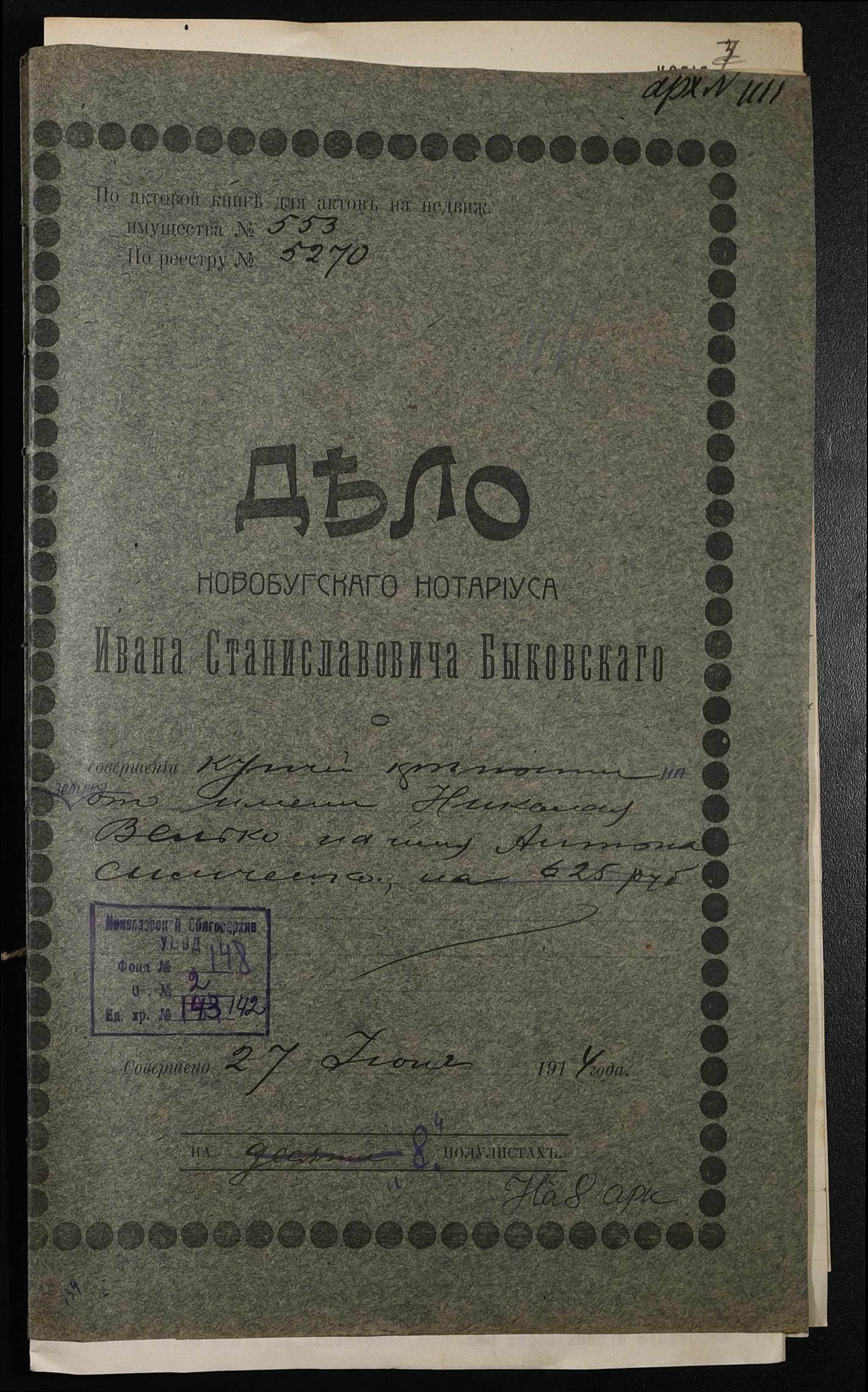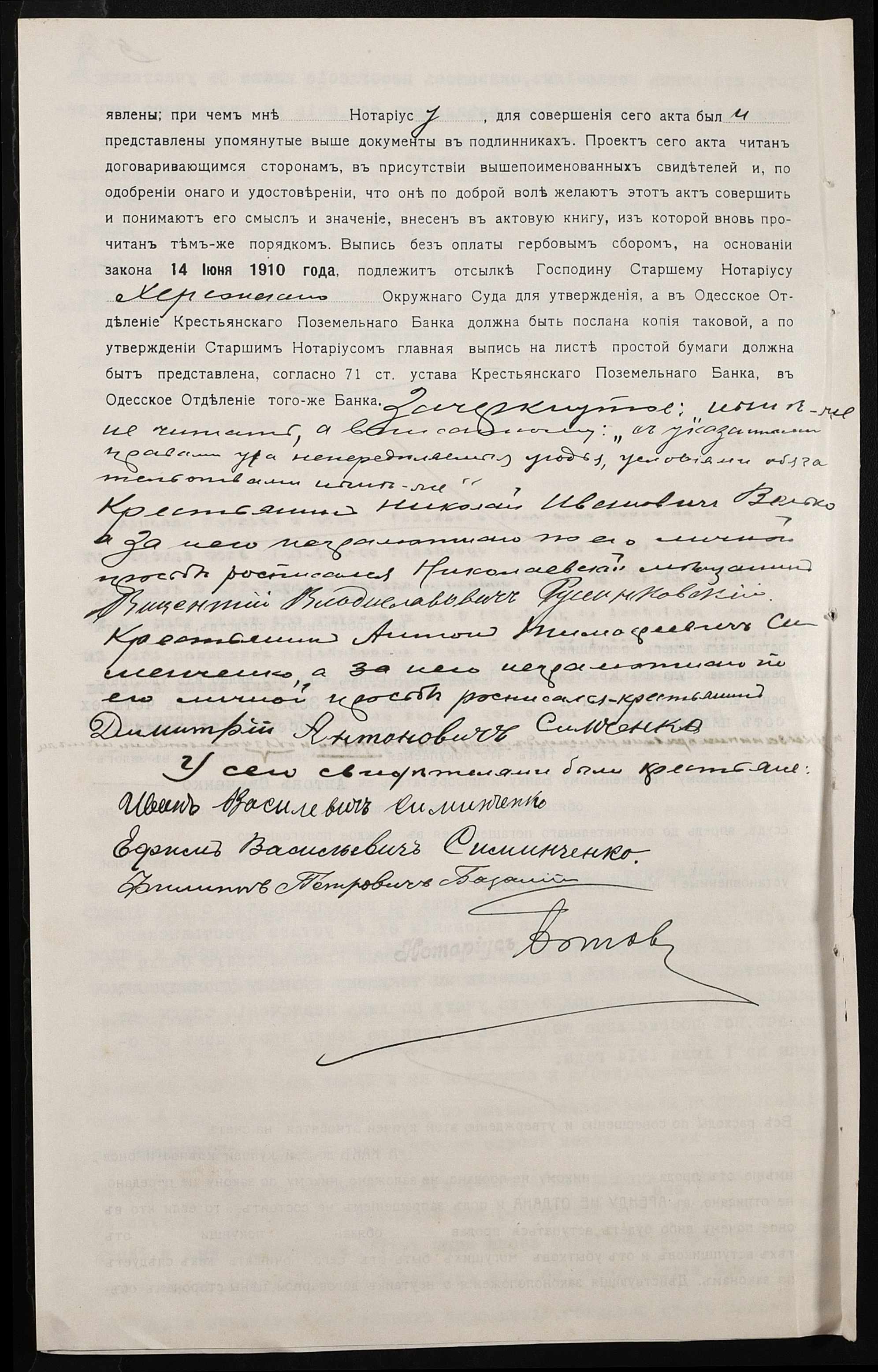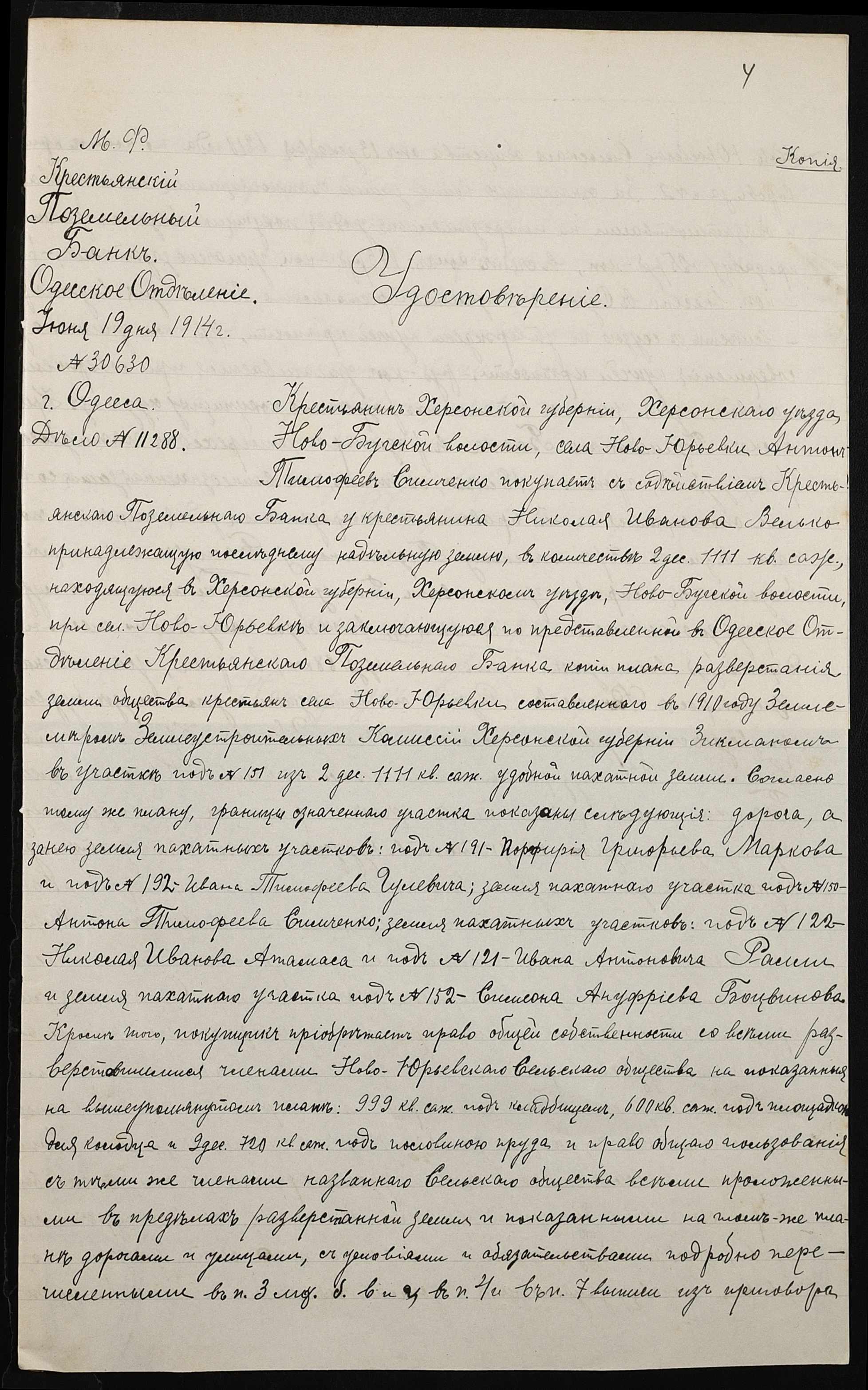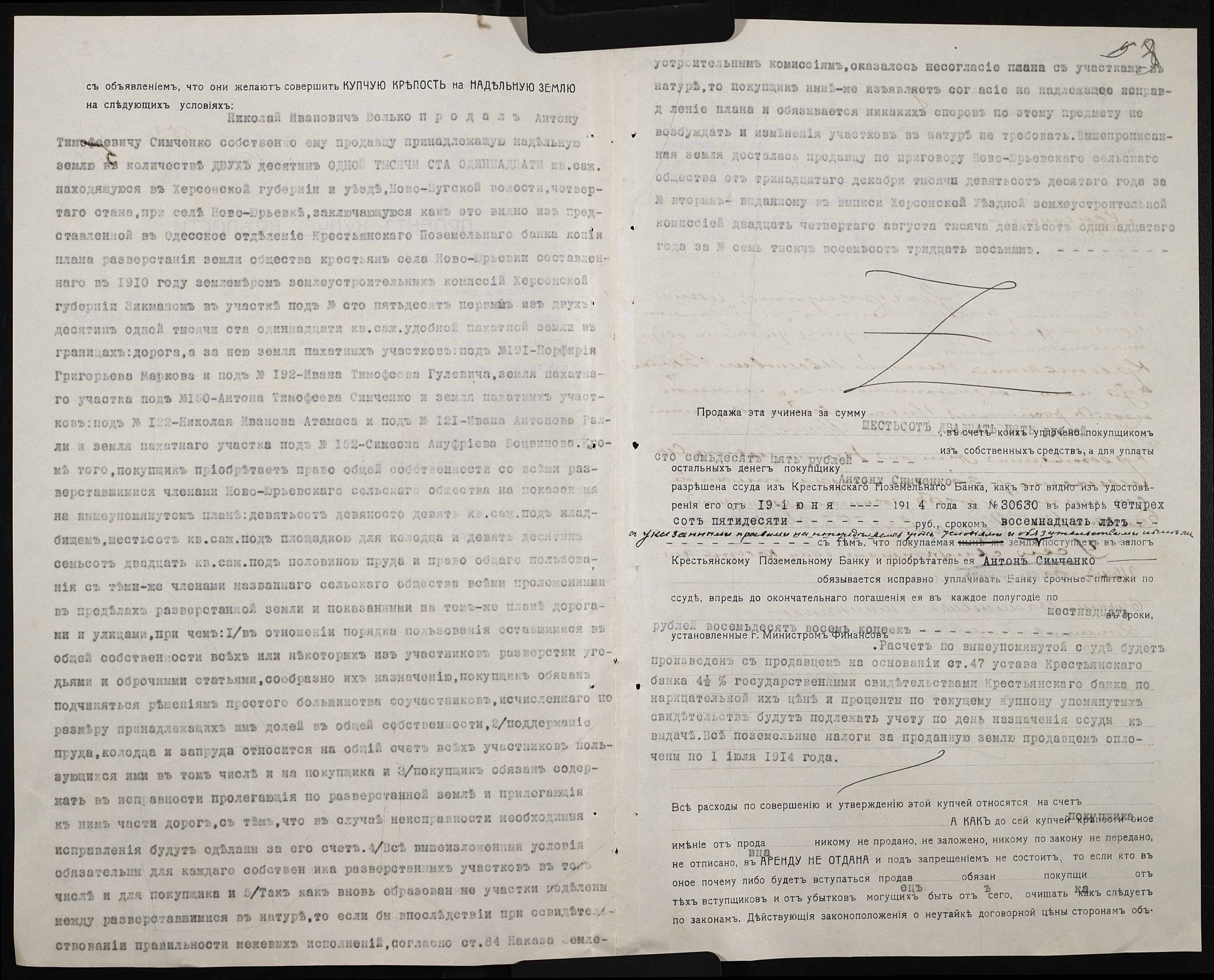 • • • • Справа № 142 “Справа про вчинення купчої про продаж землі селянином Вельком Миколою (Велько Николаем) на користь селянина Сімченка (Симченко) Антона”