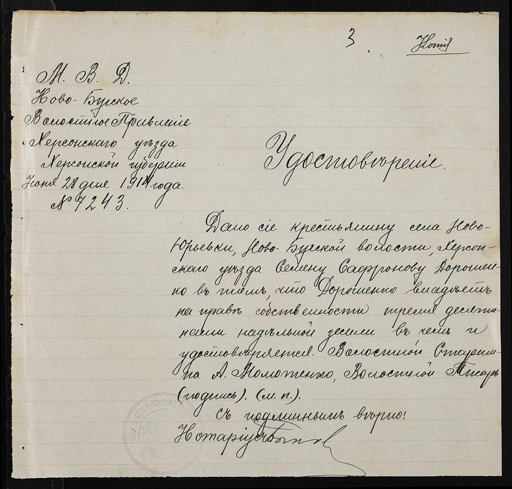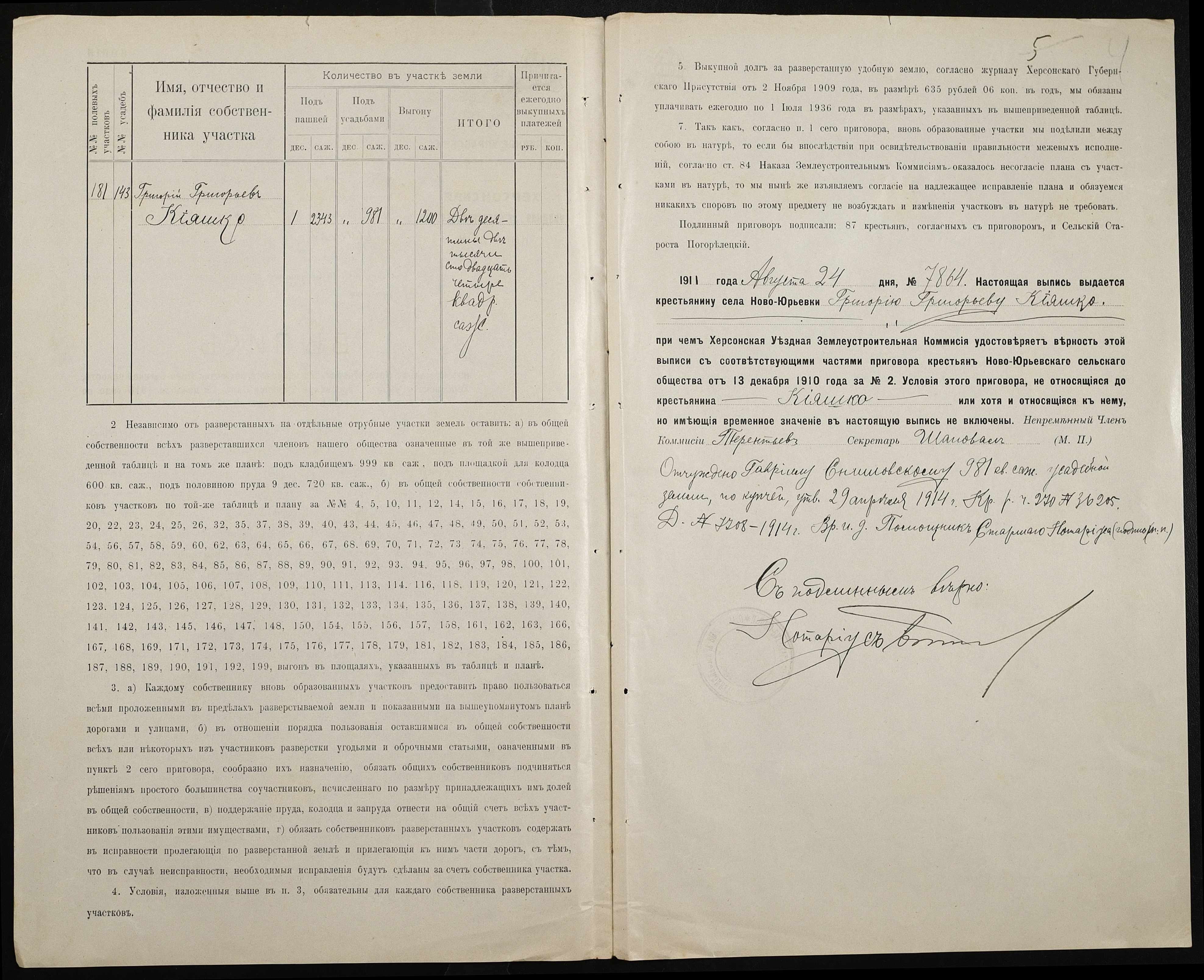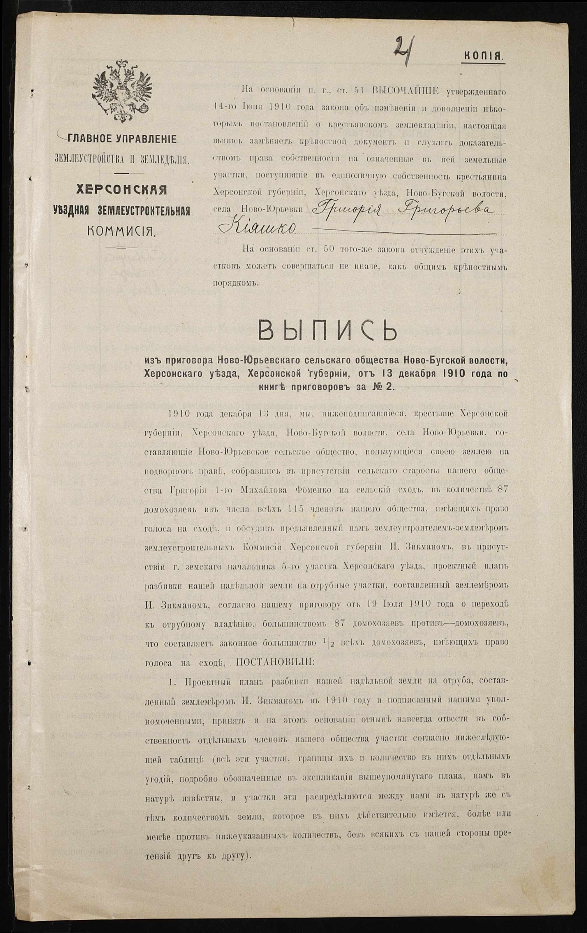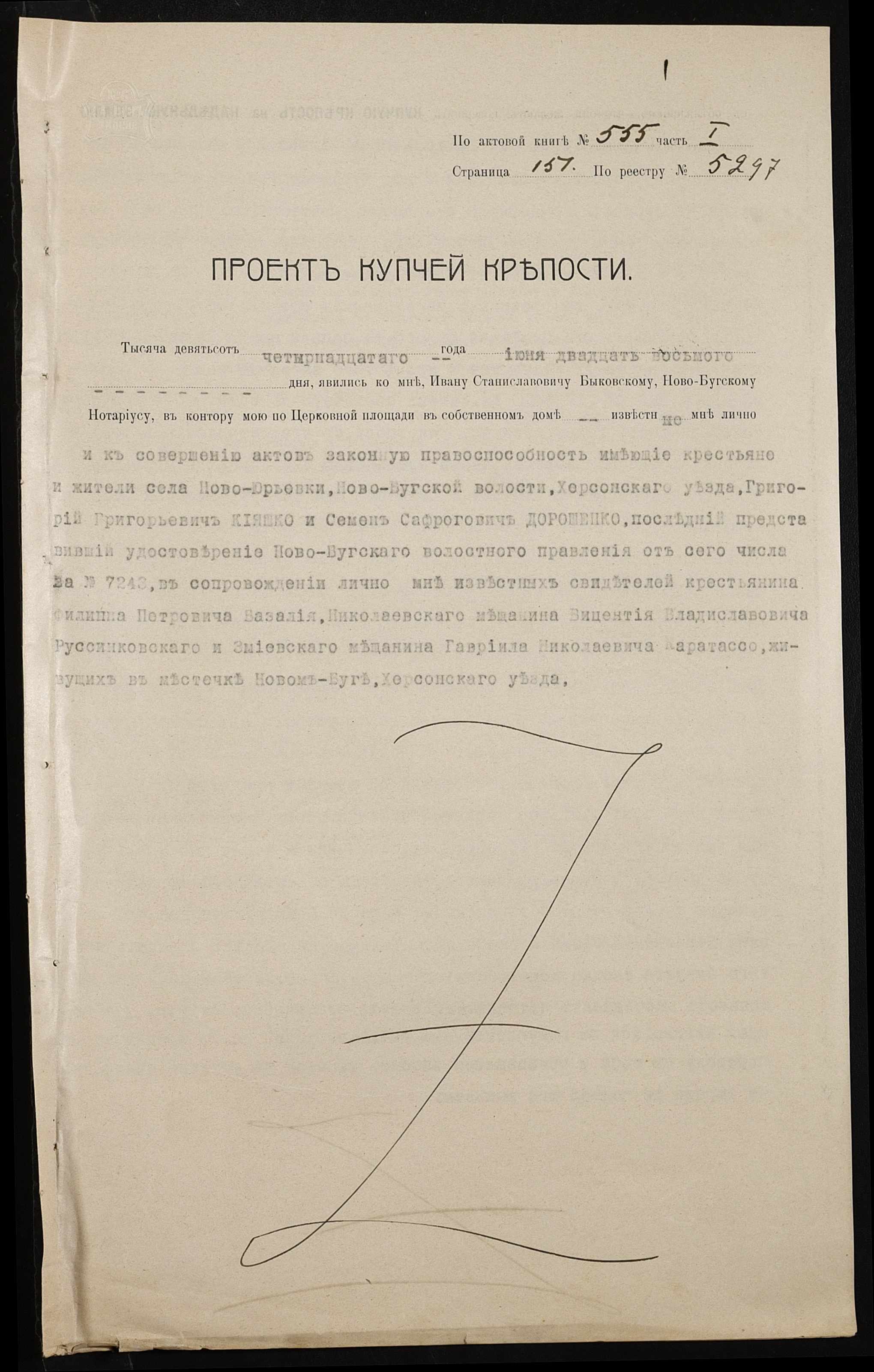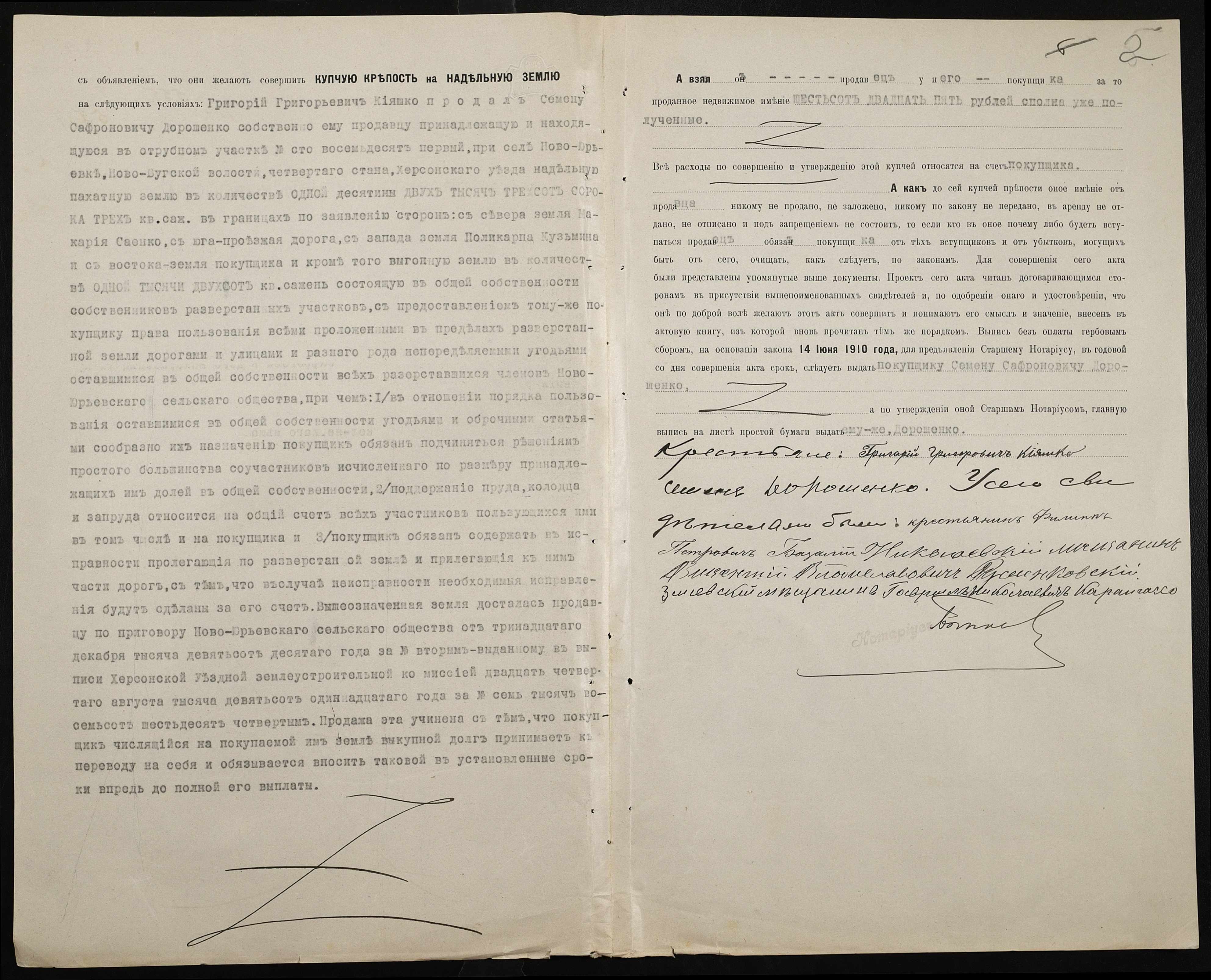 • • • • Справа № 144 “Справа про вчинення купчої про продаж землі селянином Кияшком Григорієм (Кияшко Григорием) на користь селянина Дорошенка (Дорошенко) Семена”