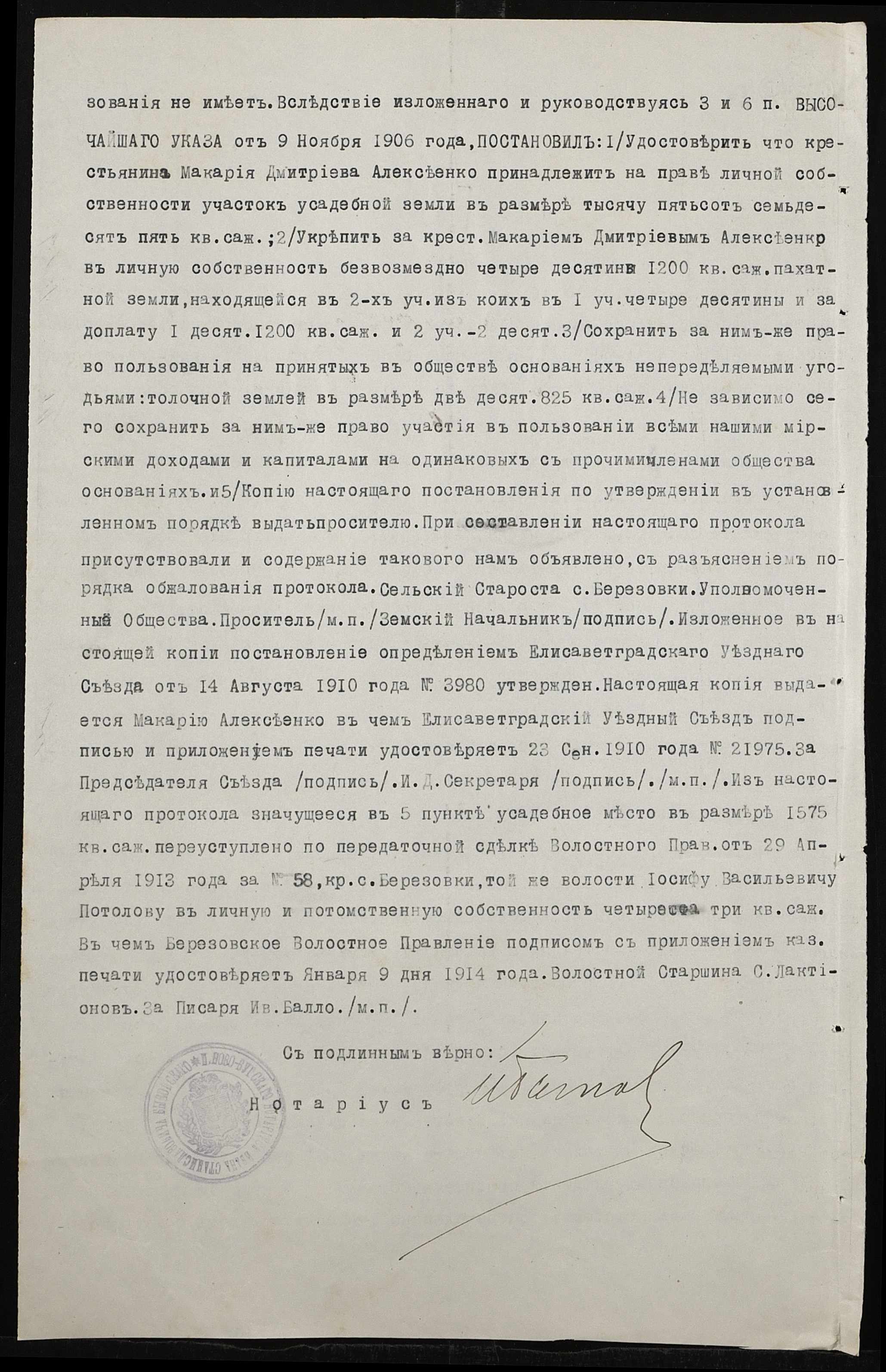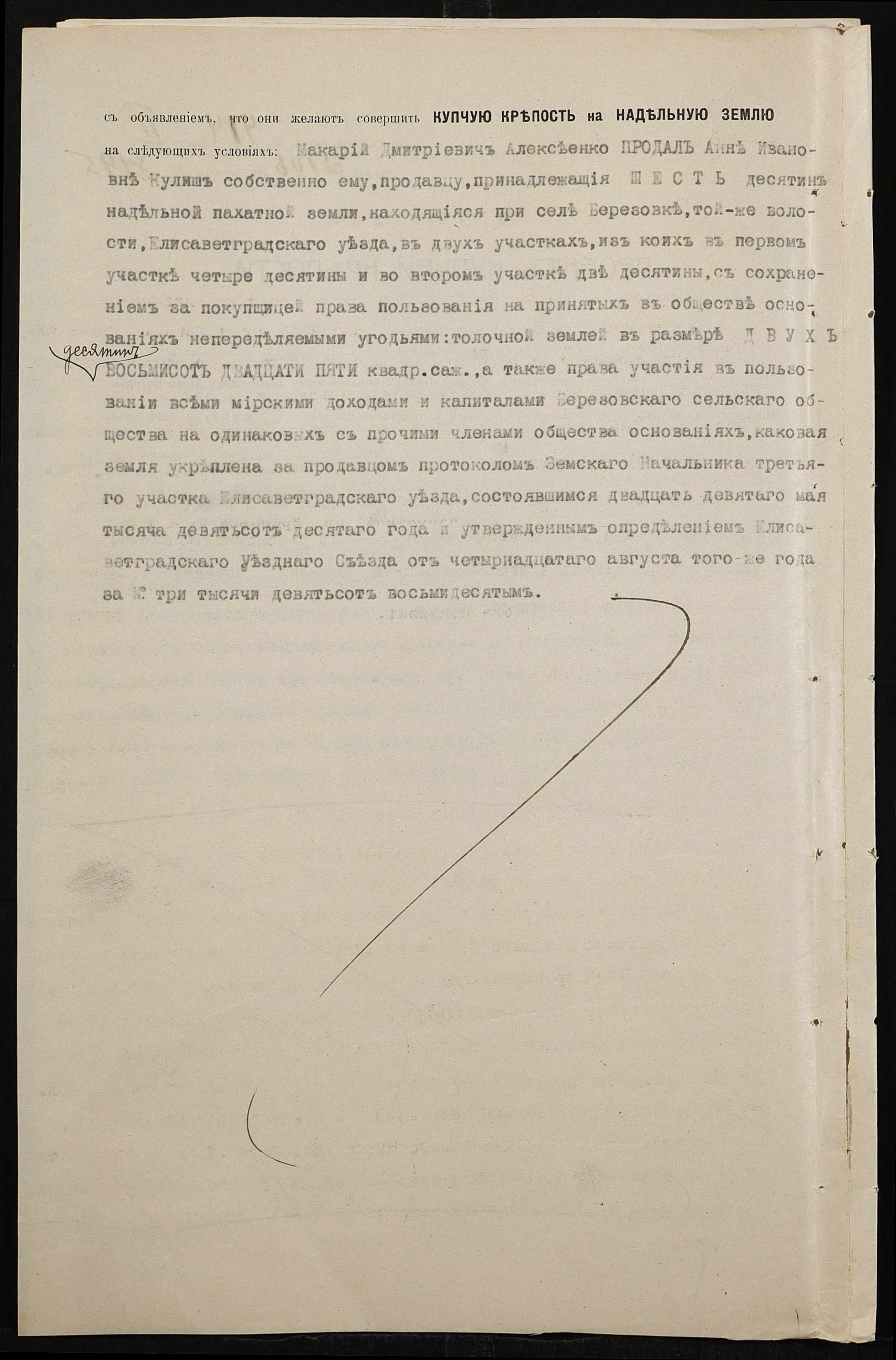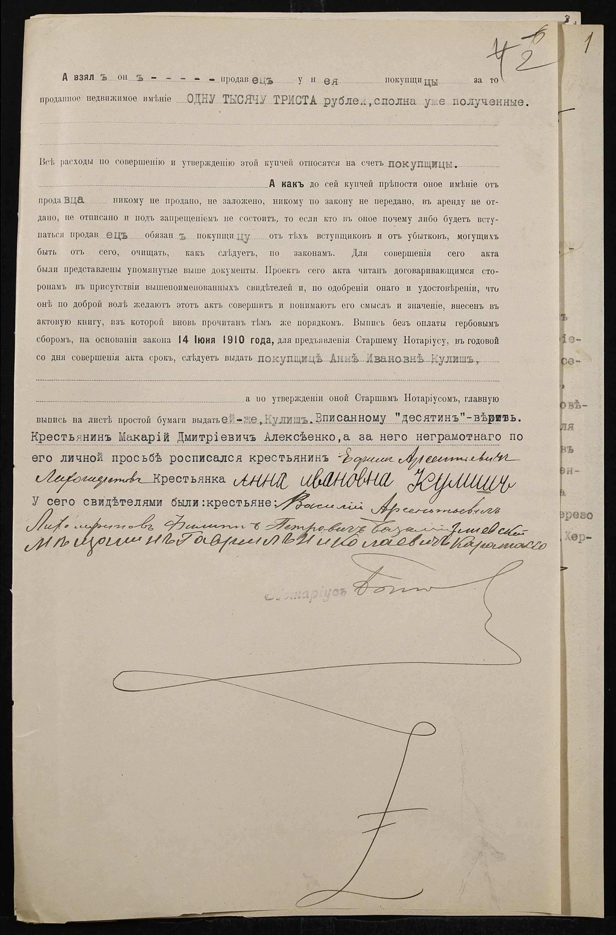 • • • • Справа № 152 “Справа про вчинення купчої про продаж землі селянином Алексєєнком Макарієм (Алексеенко Макарием) на користь селянки Куліш Ганни (Кулиш Анны)”