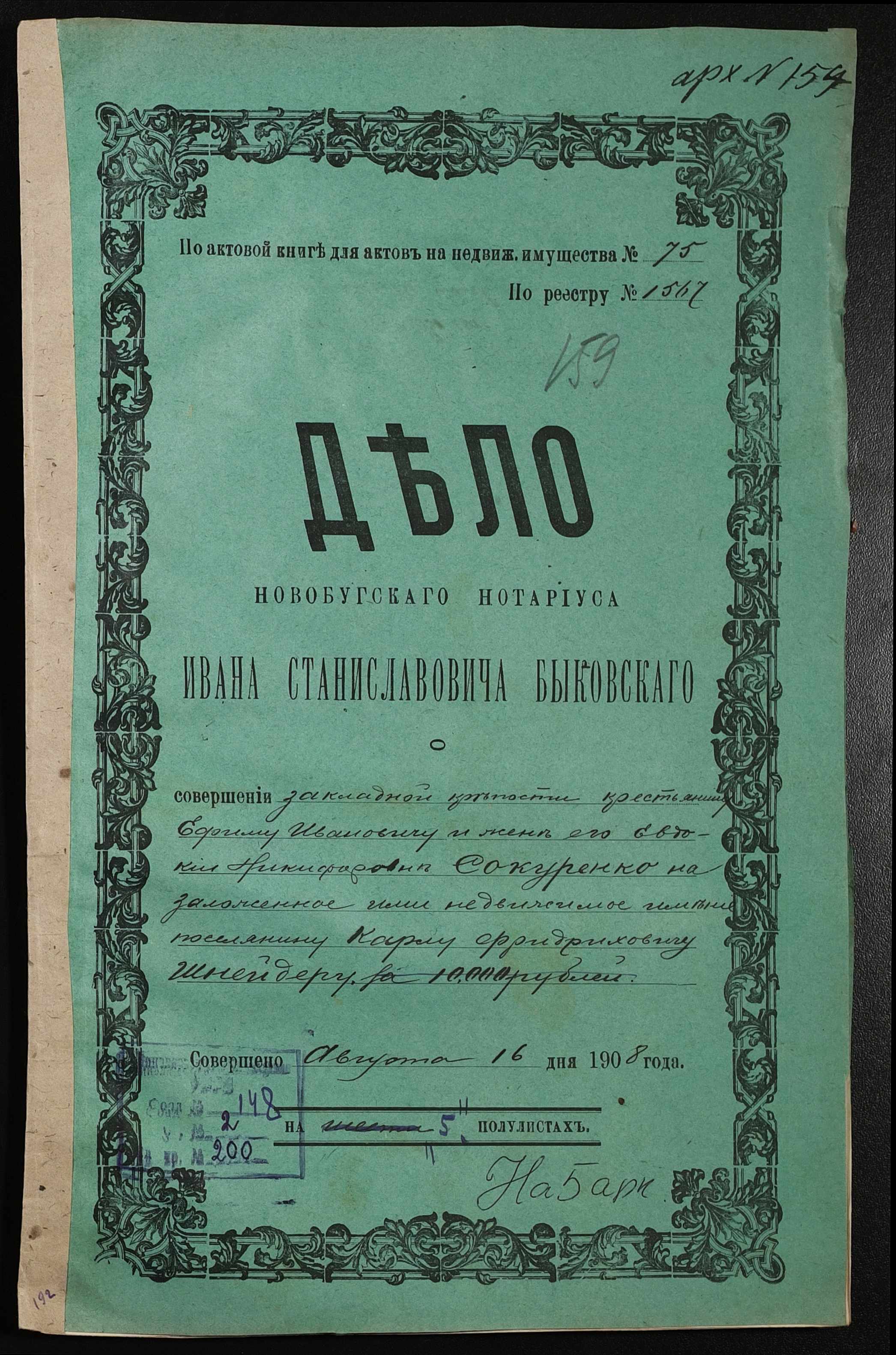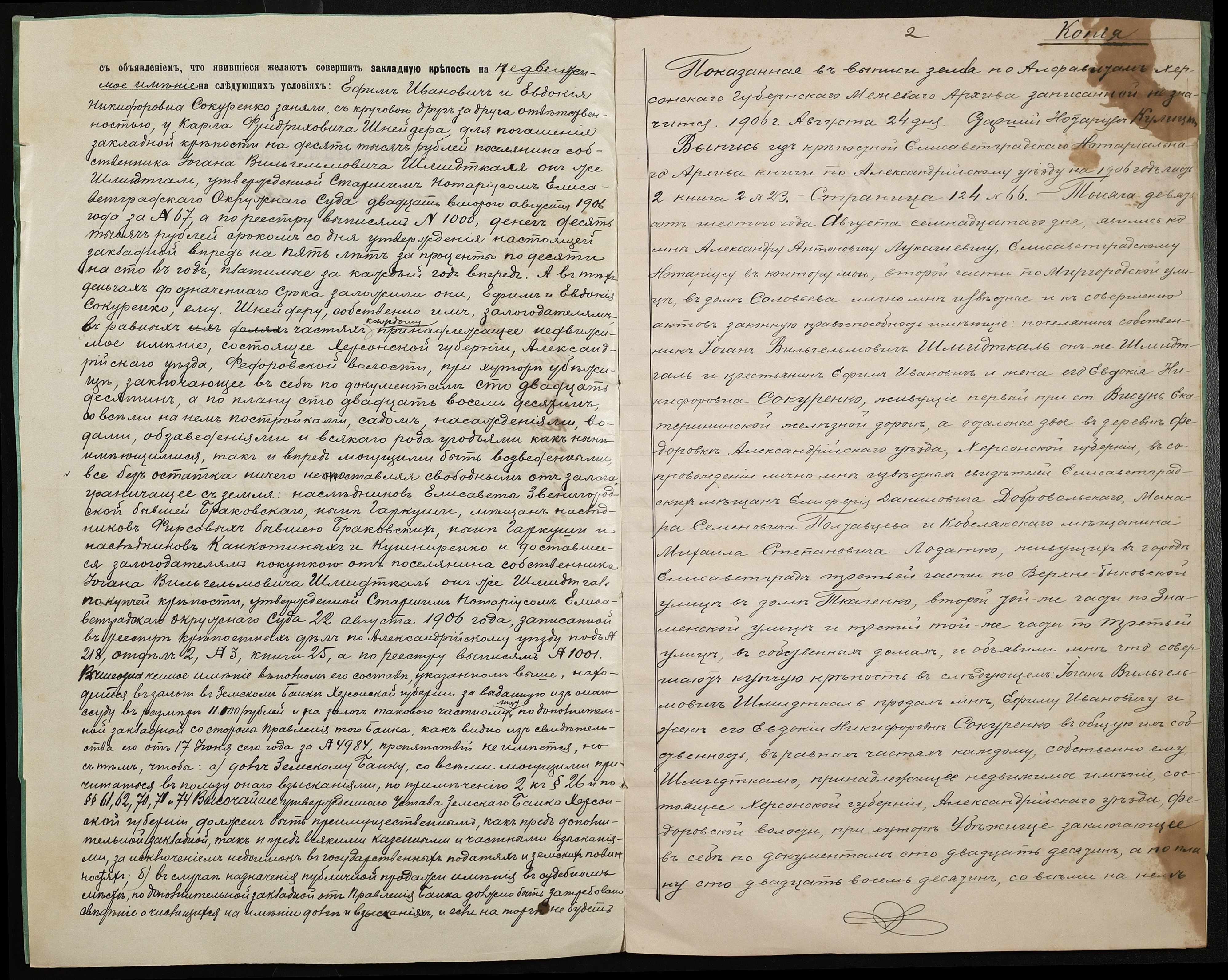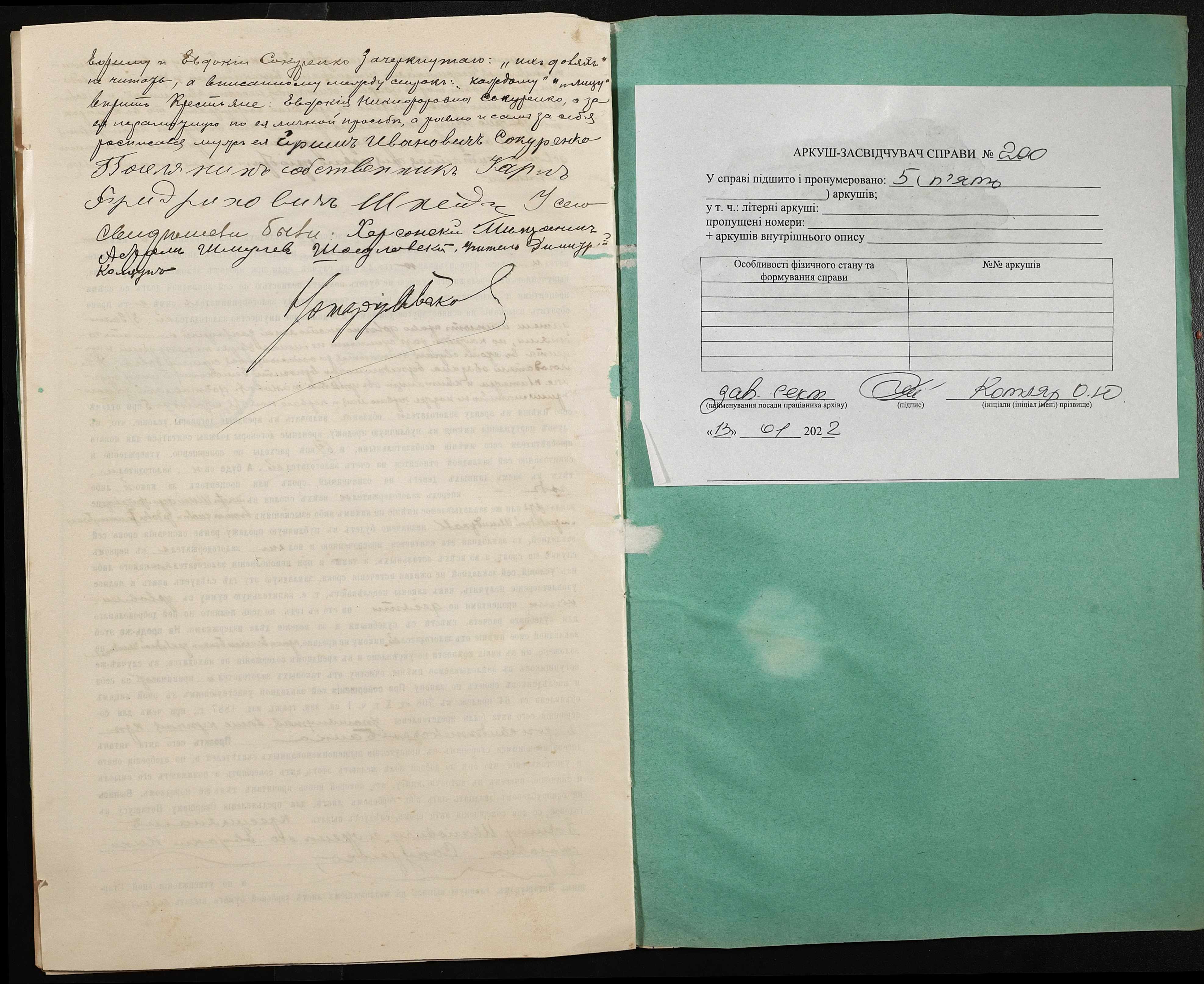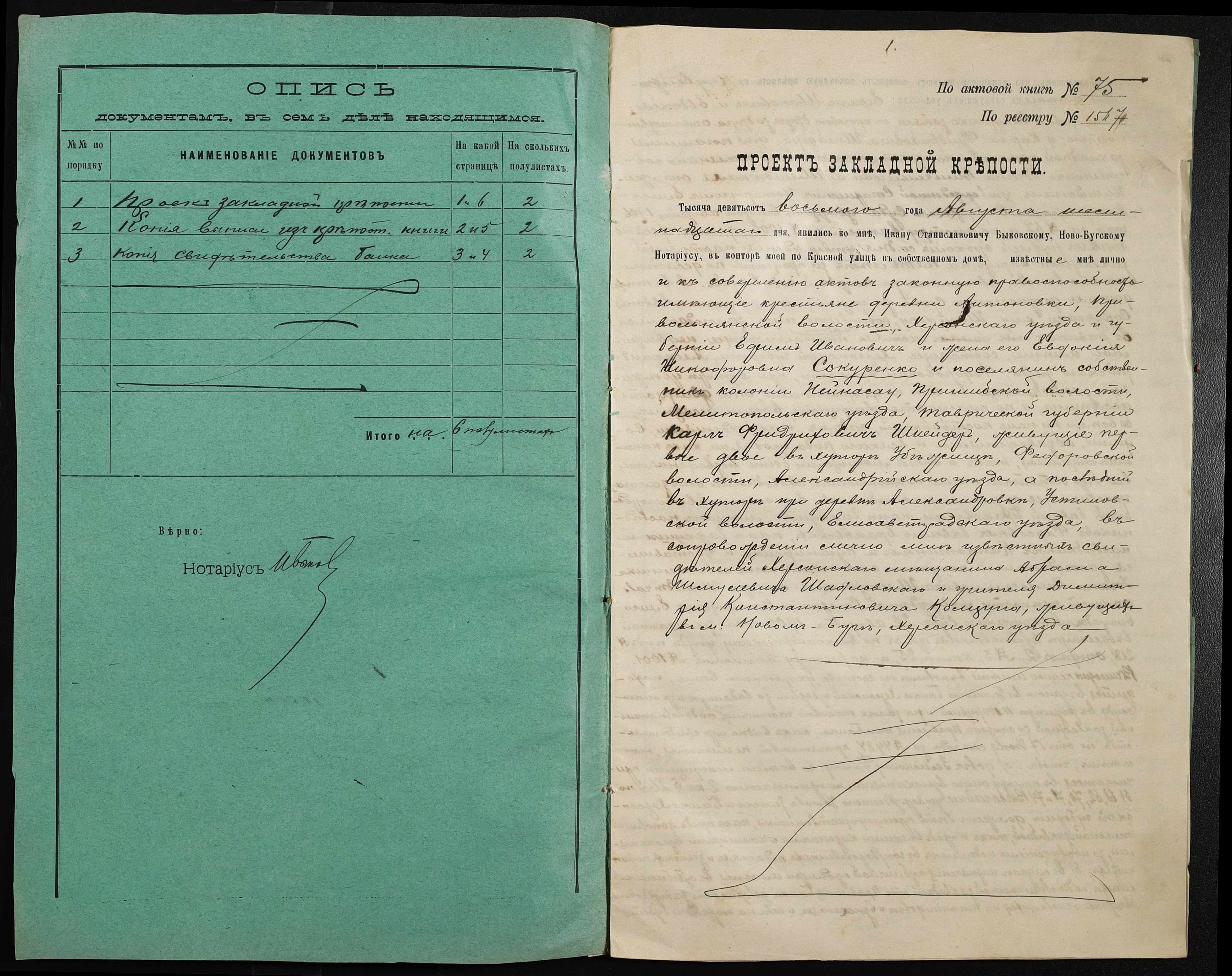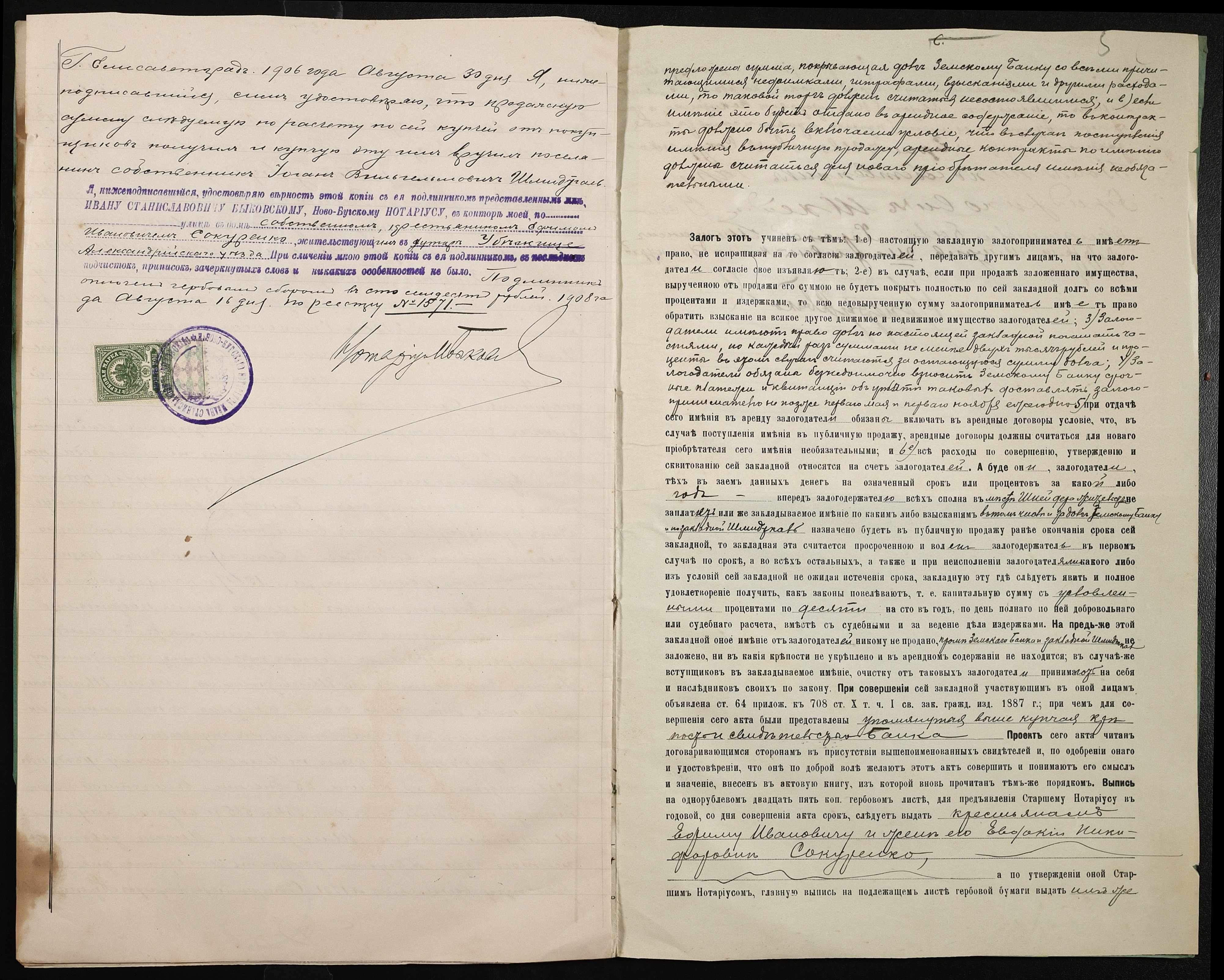• • • • Справа № 200 “Справа про вчинення заставної на нерухоме майно, закладене селянином Сокуренком Юхимом Івановичем (Сокуренко Ефимом Ивановичем) і його дружиною Євдокією Никифорівною (Евдокией Никифоровной) селянину-власнику Шнейдеру Карлу Фрідріховичу (Фридриховичу)”