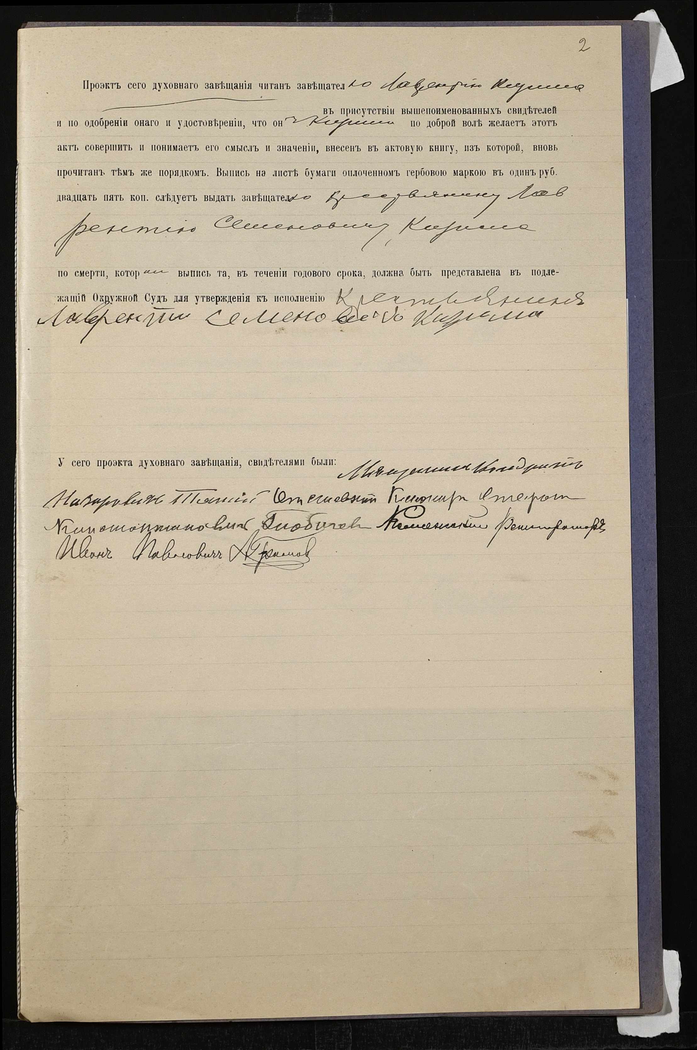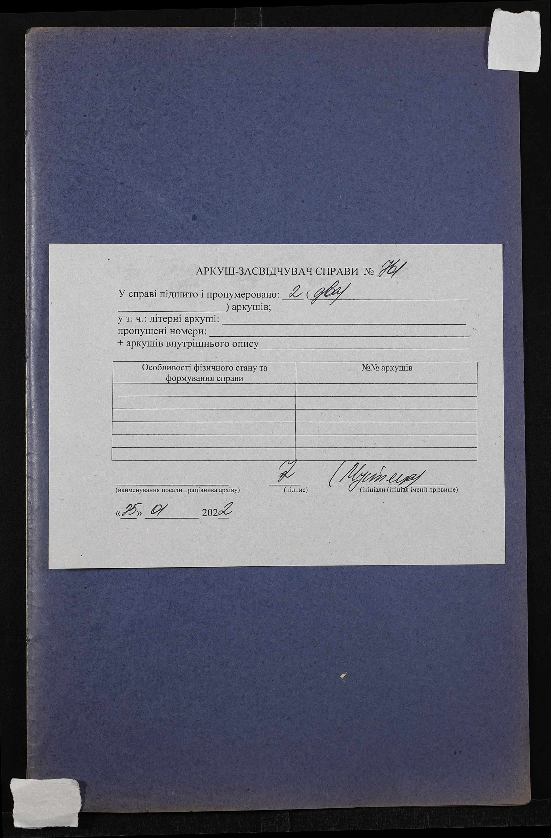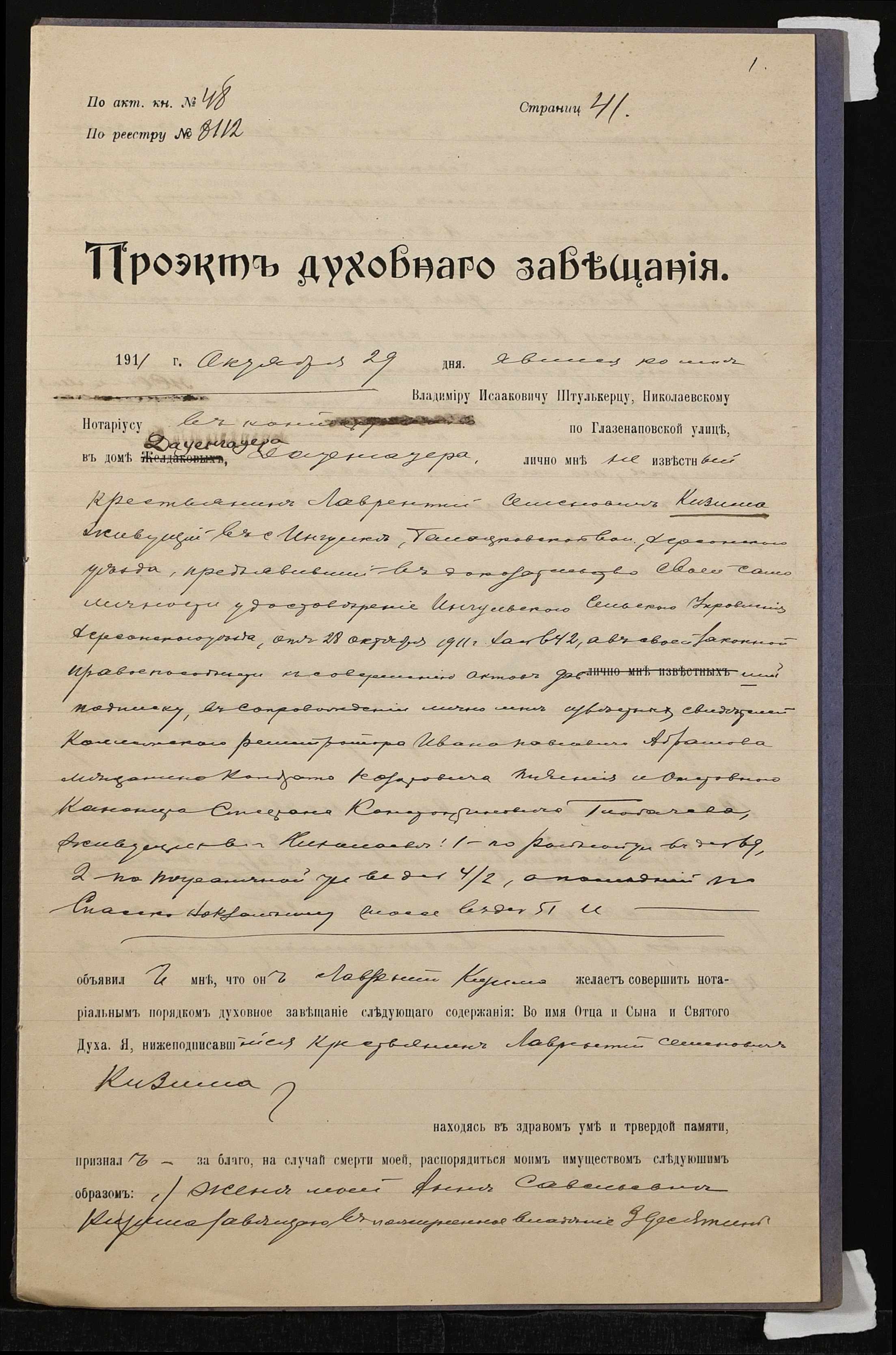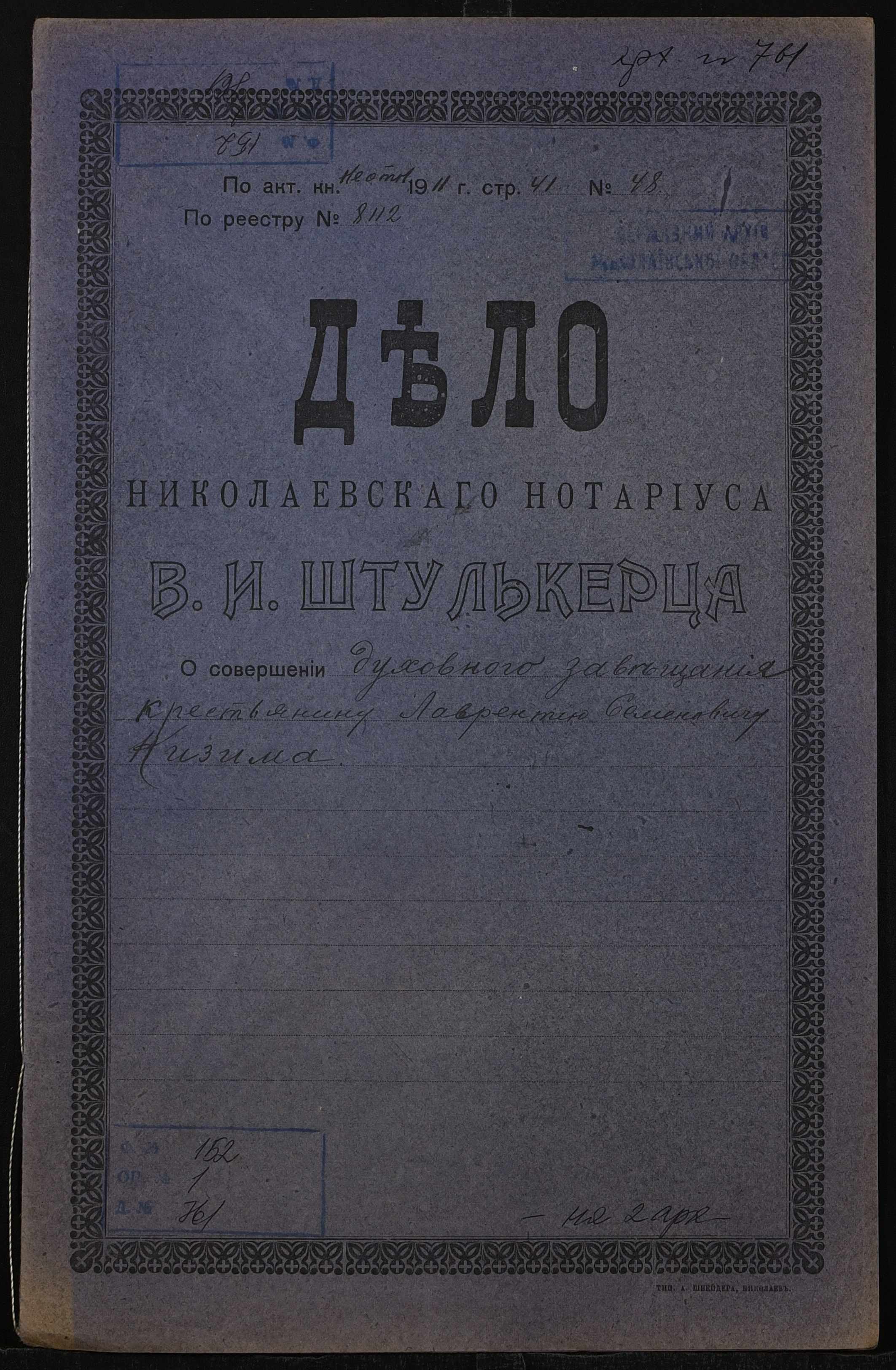 • • • • Справа № 761 “Проєкт духівниці удови селянина Кизими Лаврентія Семеновича (Кизимы Лаврентия Семеновича)”