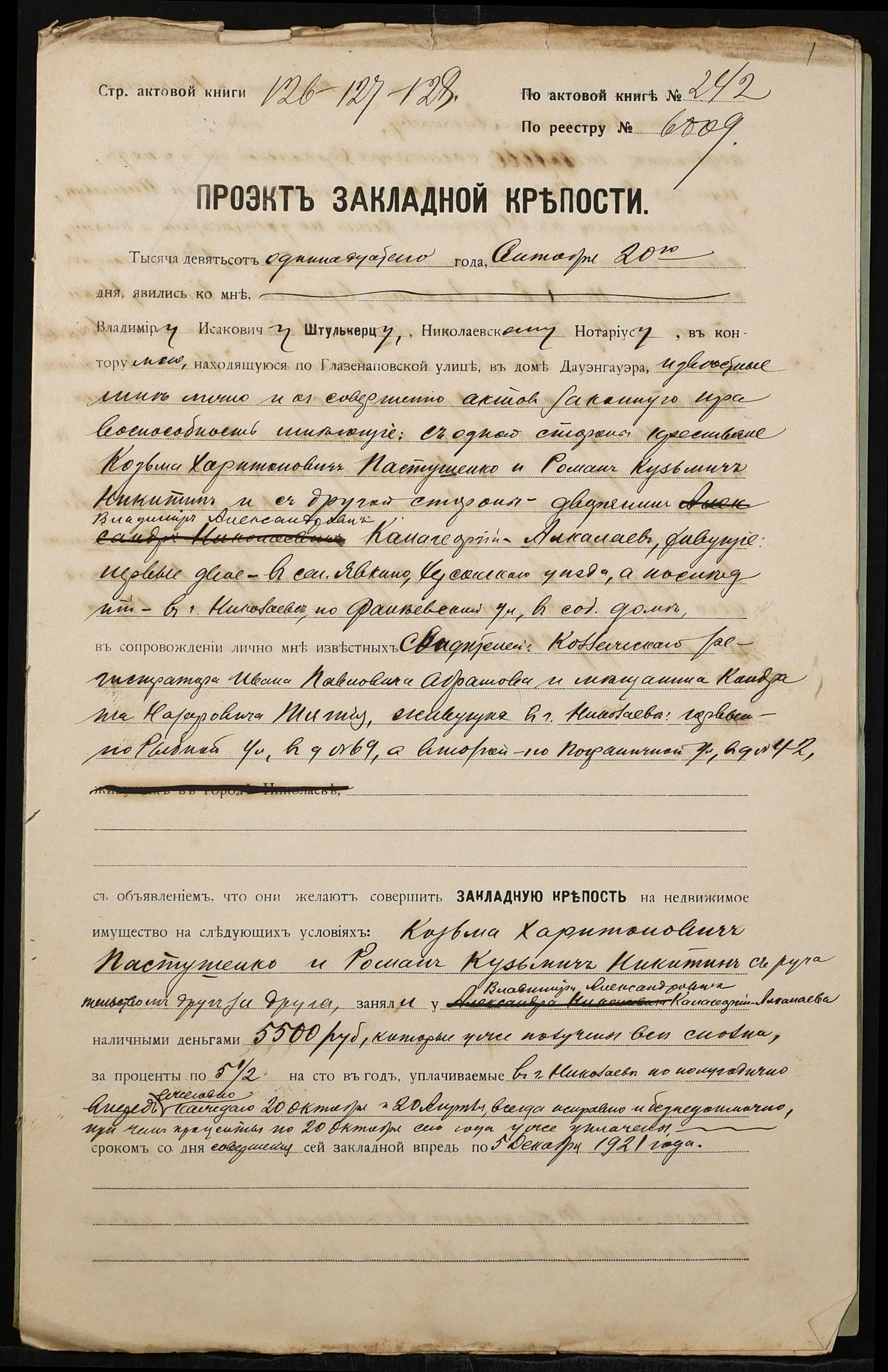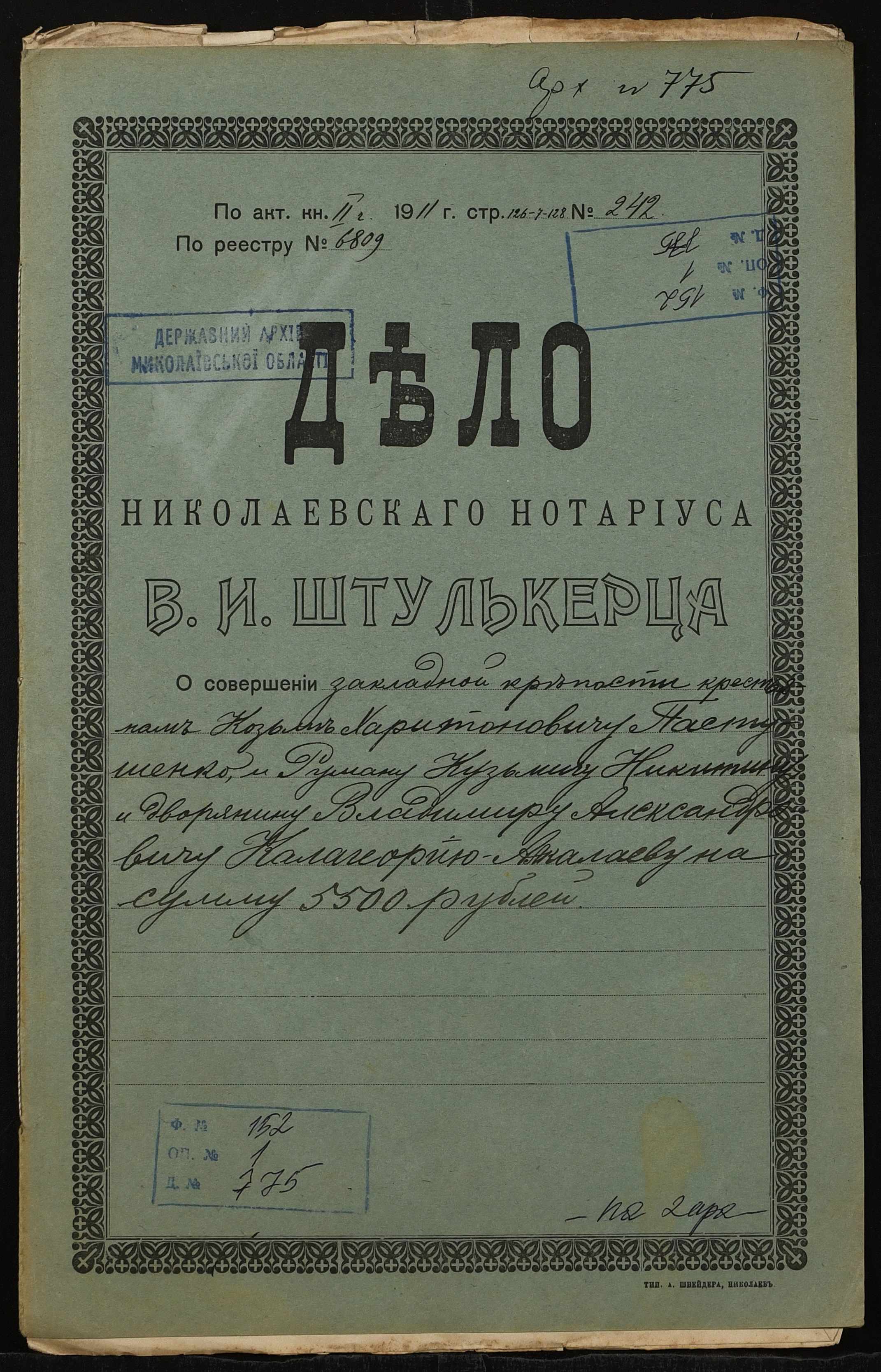 • • • • Справа № 775 “Справа про вчинення заставної на нерухоме майно, закладене селянами Нікітіним Романом Кузьмичем Кузьмичем (Никитиным Романом Кузьмичем) і Пастушенком Кузьмою Харитоновичем (Пастушенко Кузьмой Харитоновичем) – дворянину Калагеоргій-Алкалаєву Володимиру Олександровичу (Калагеоргий-Алкалаеву Владимиру Александровичу)”