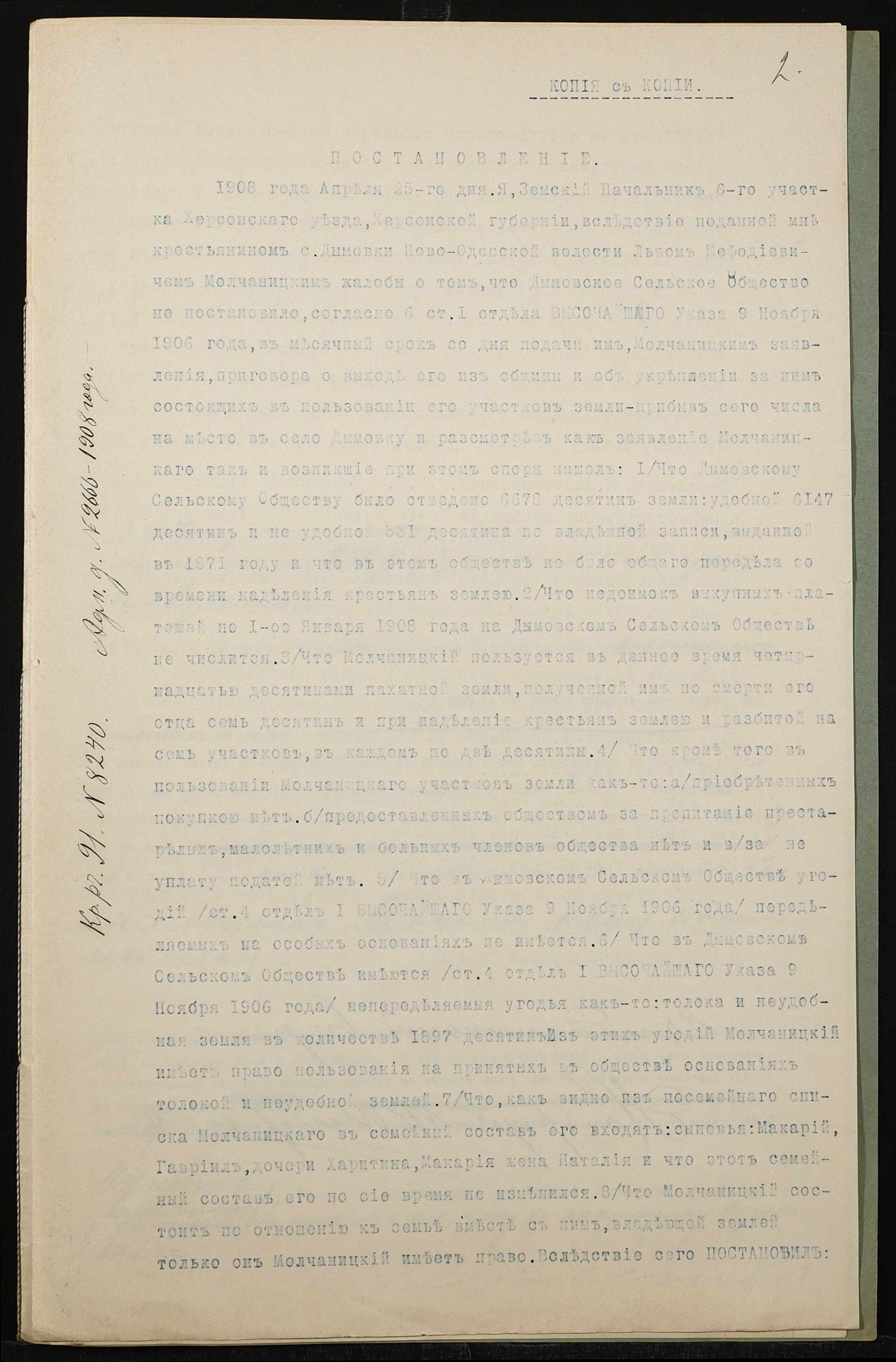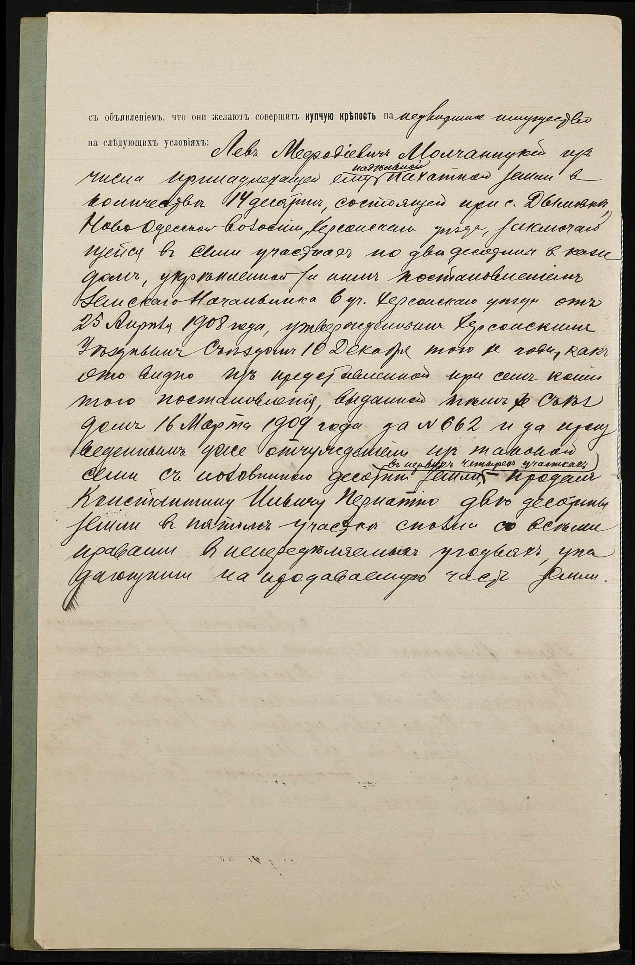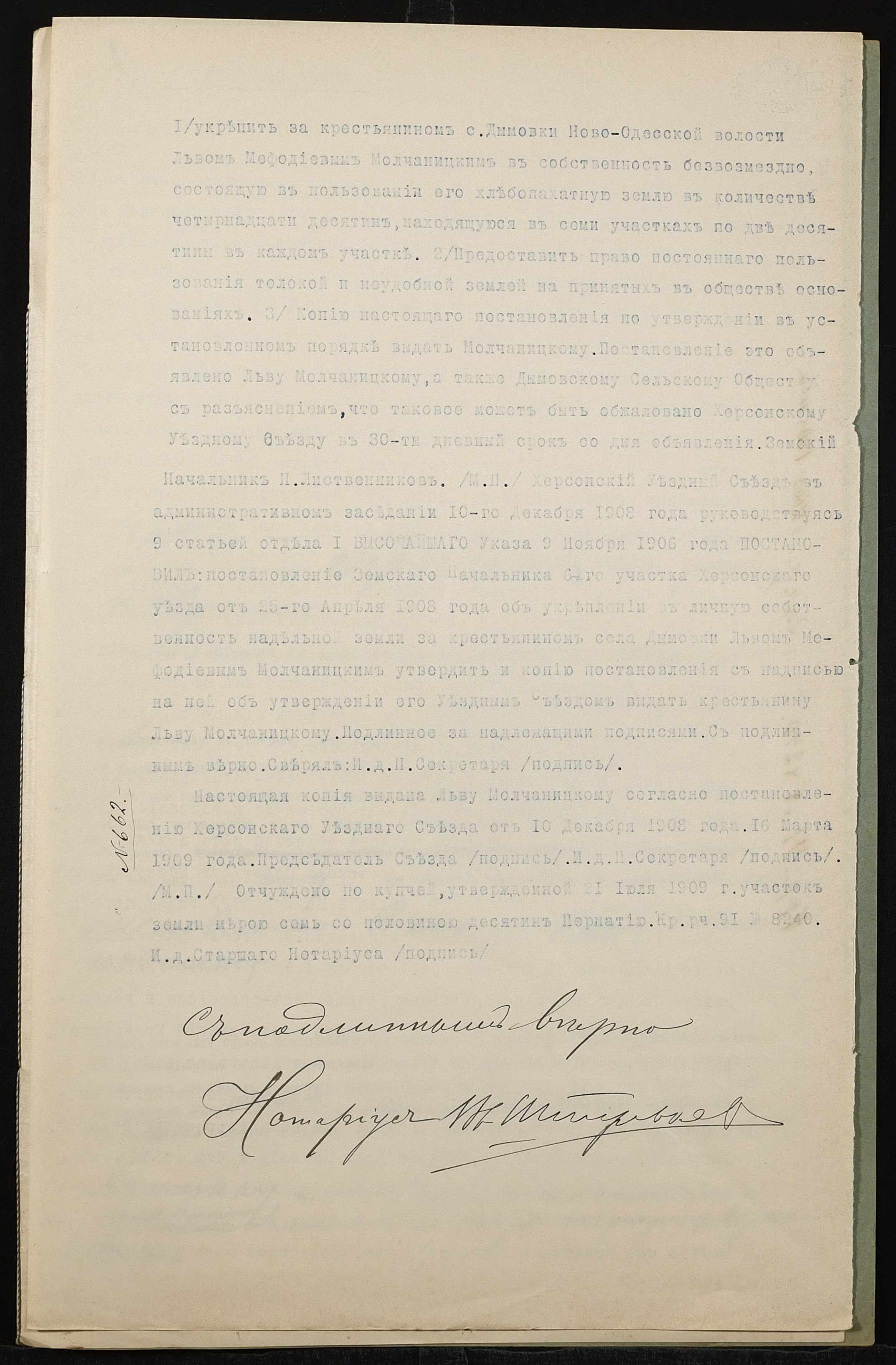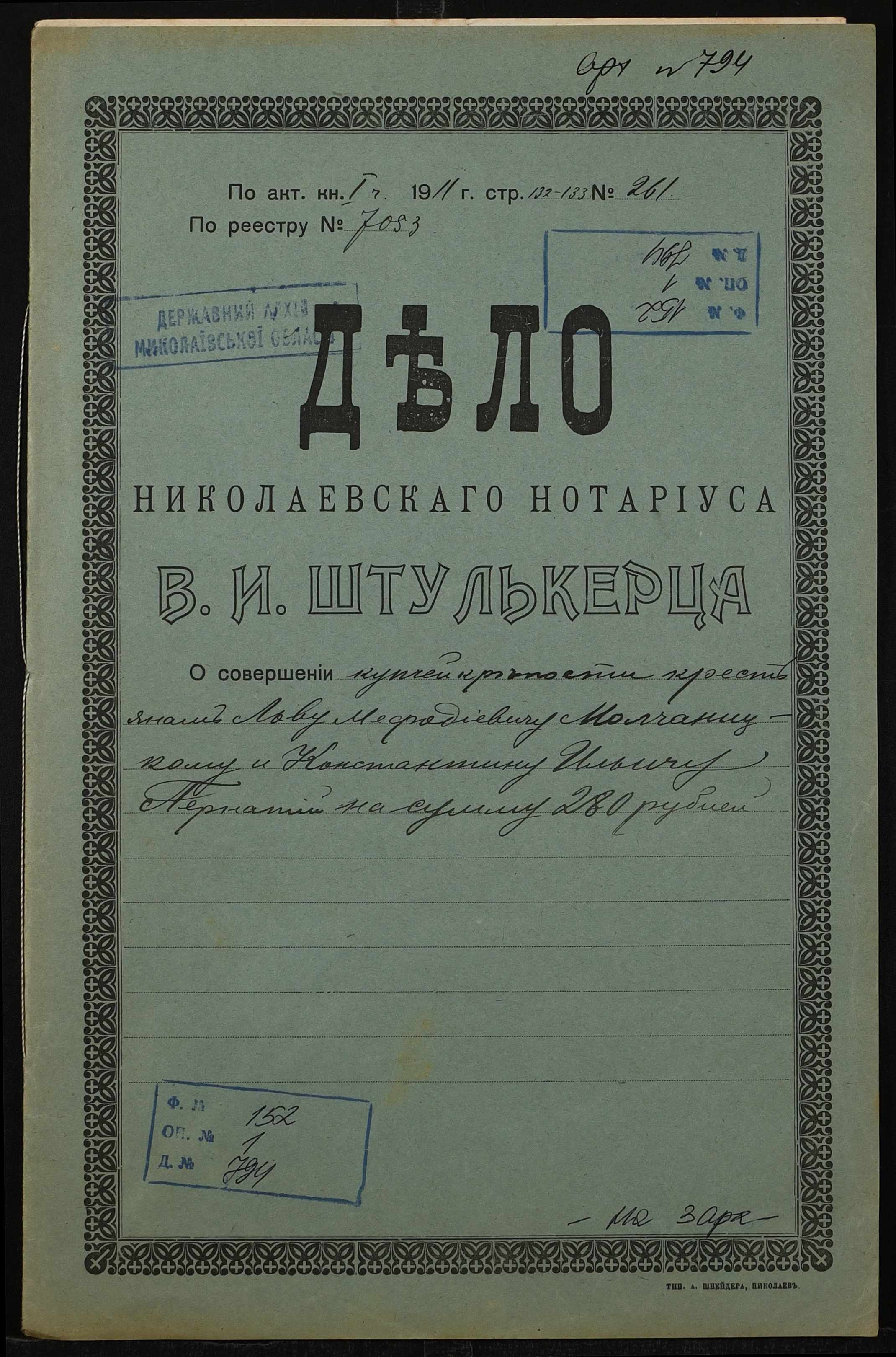 • • • • Справа № 794 “Справа про вчинення купчої про продаж нерухомого майна селянином Молчаницьким Львом Мефодійовичем (Молчаницким Львом Мефодьевичем) на користь селянина Пернатія Костянтина Ілліча (Пернатия Константина Ильича)”