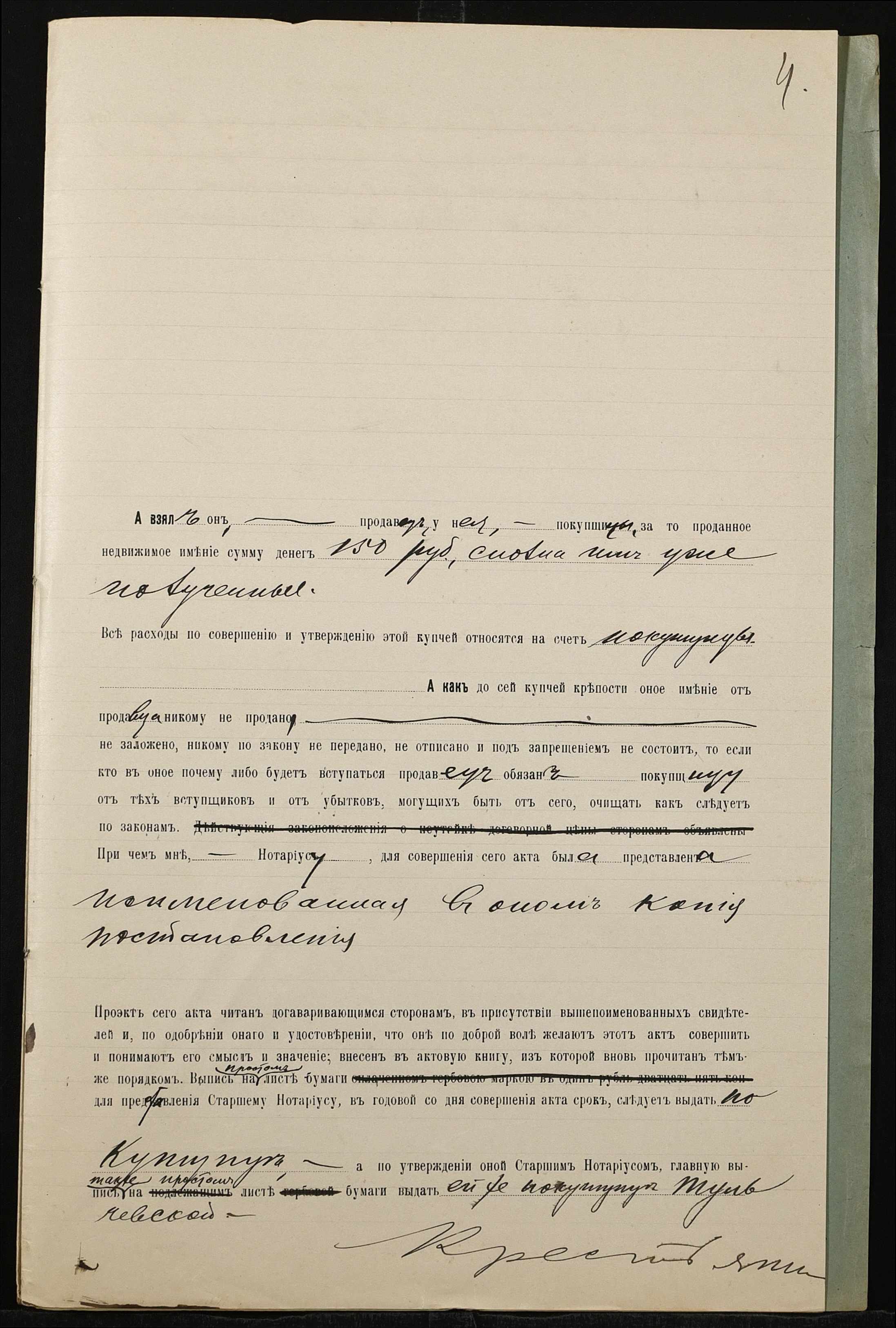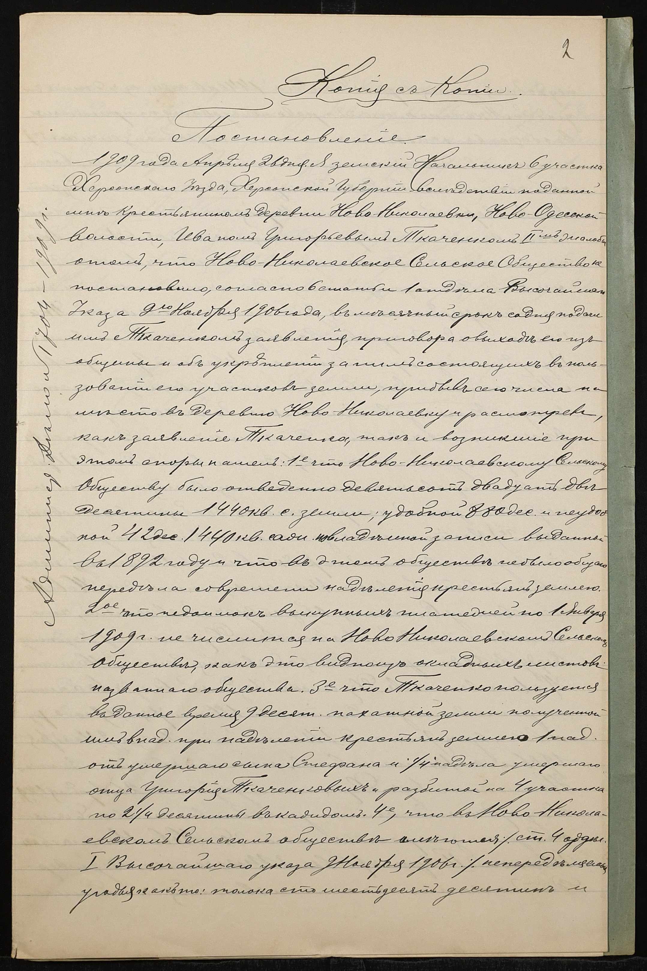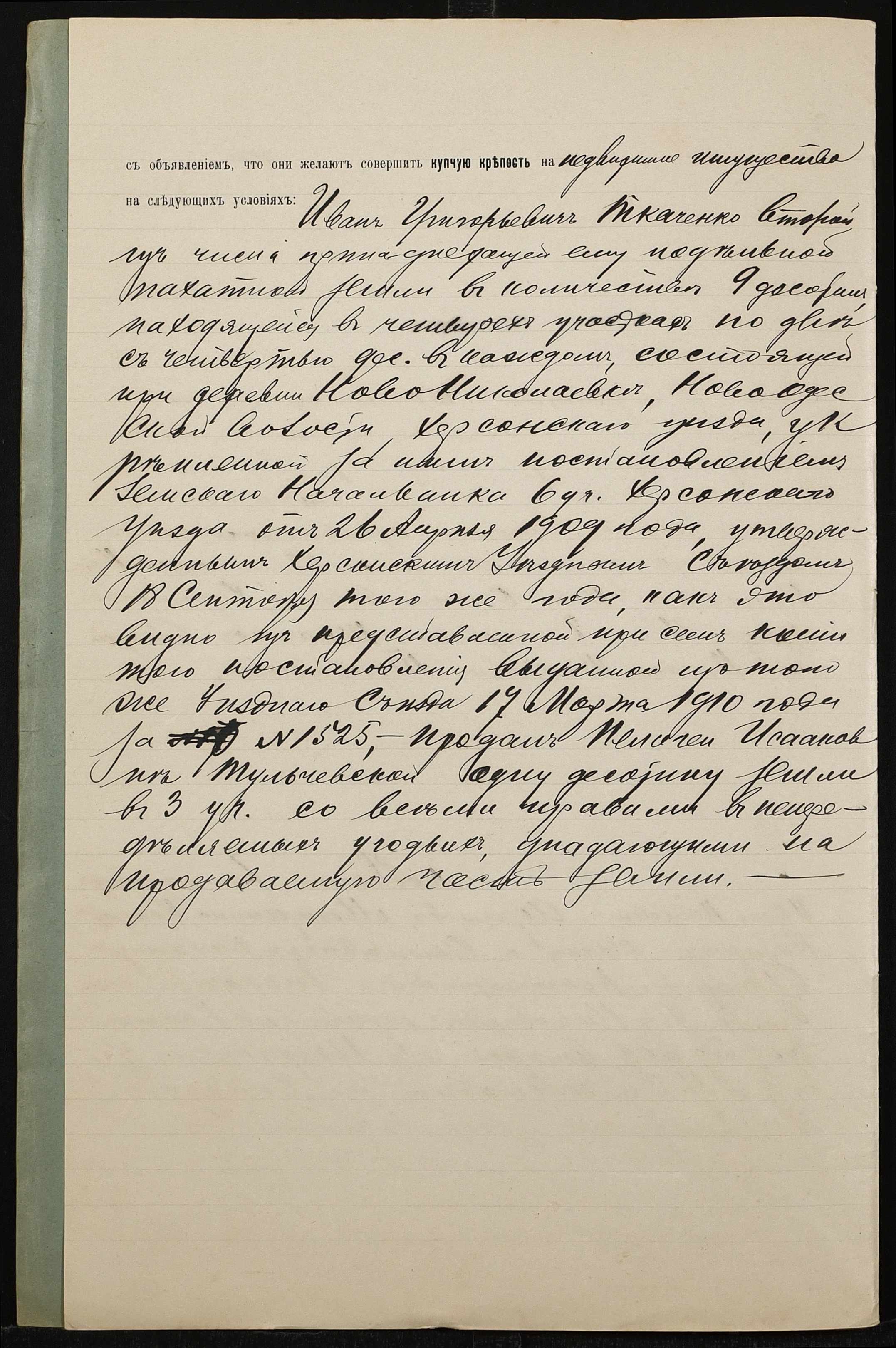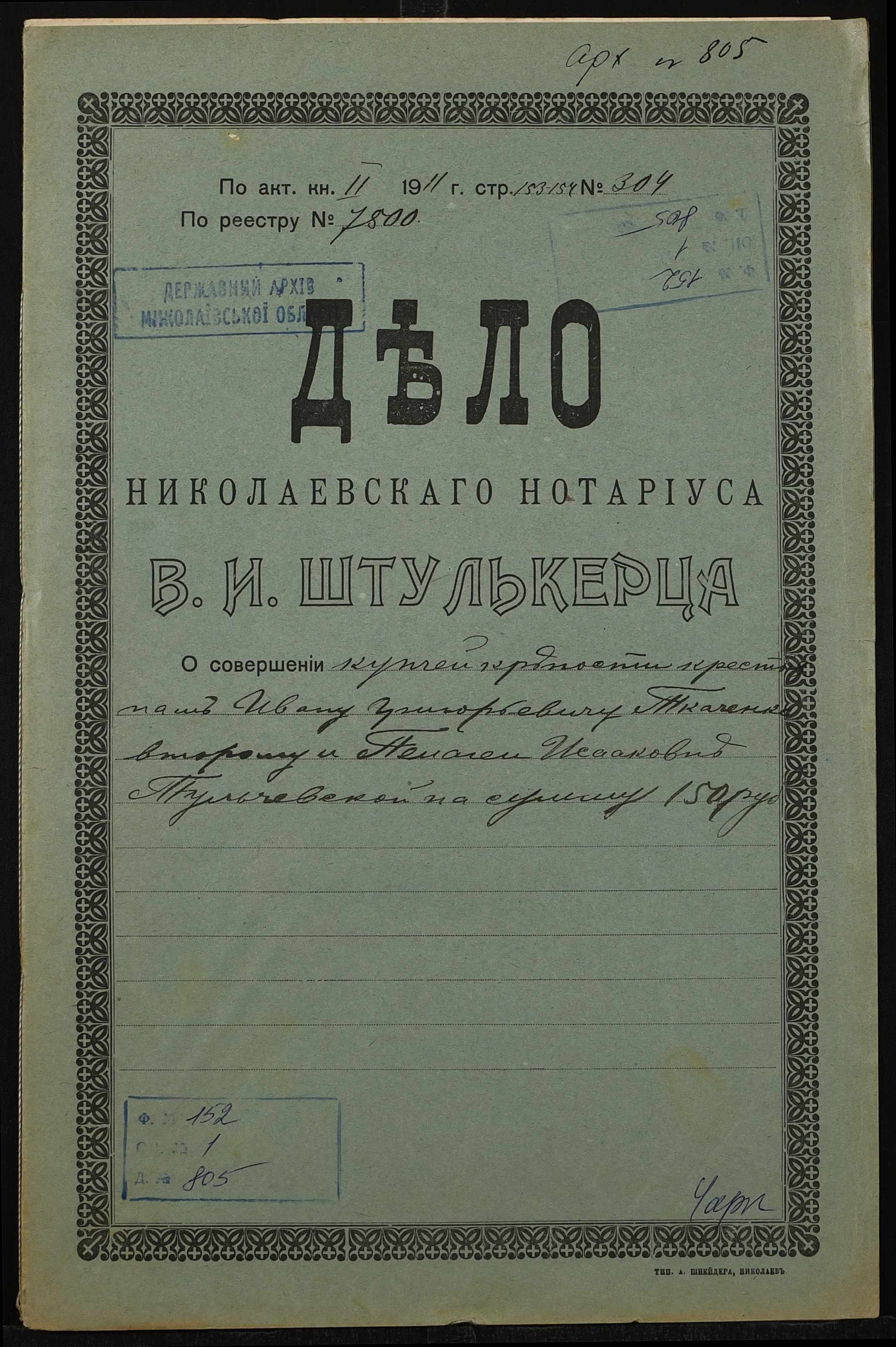 • • • • Справа № 805 “Справа про вчинення купчої про продаж нерухомого майна селянином Ткаченком Іваном Григоровичем 2-им (Ткаченко Иваном Григорьевичем 2-ым) на користь селянки Тульчевської Пелагеї Ісааківни (Тульчевской Пелагеи Исааковны)”