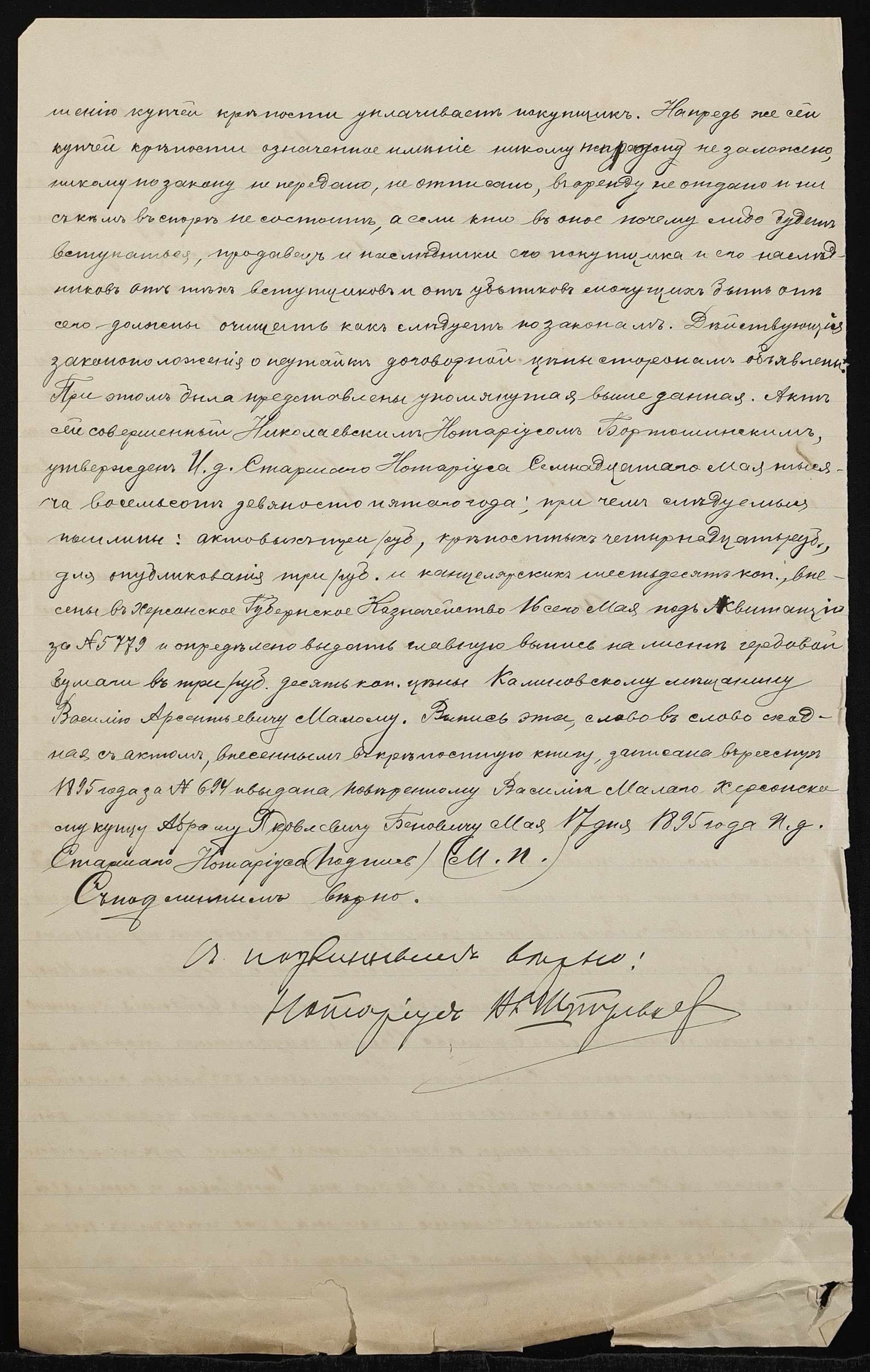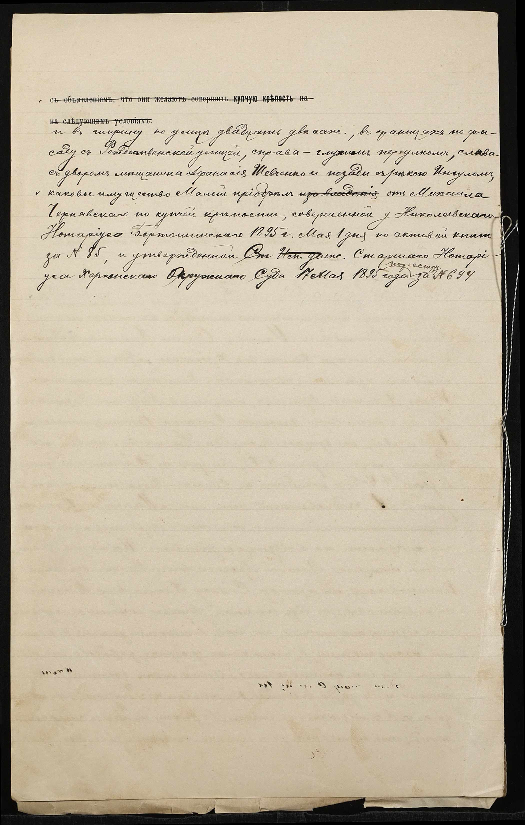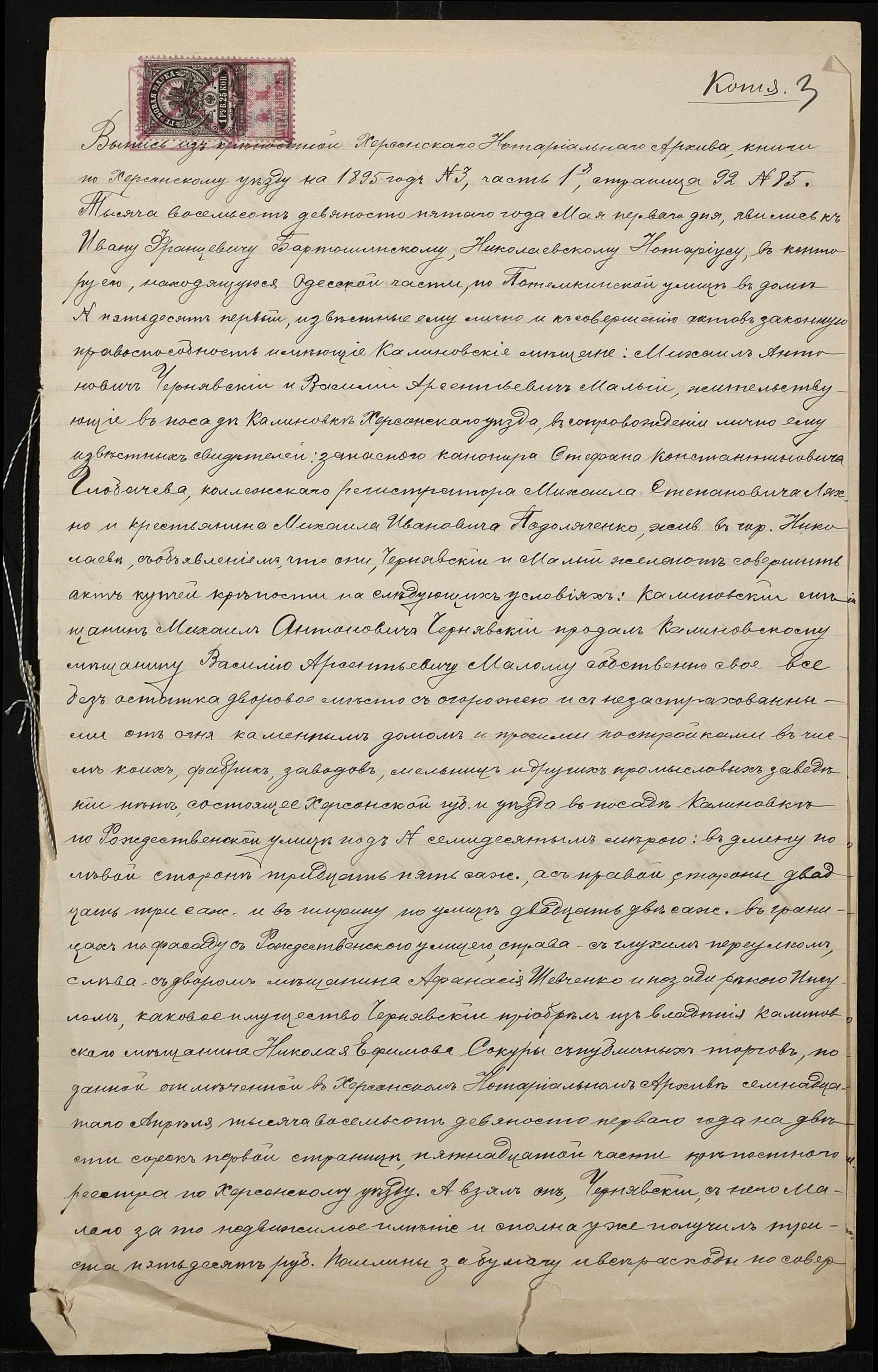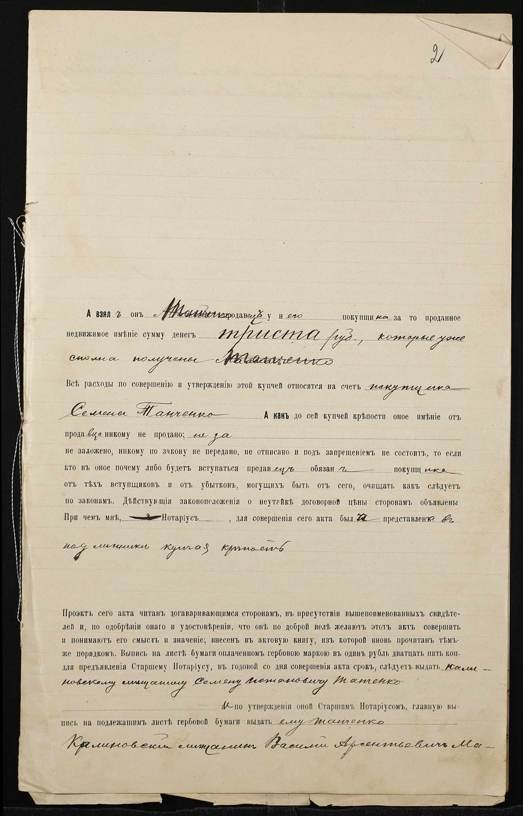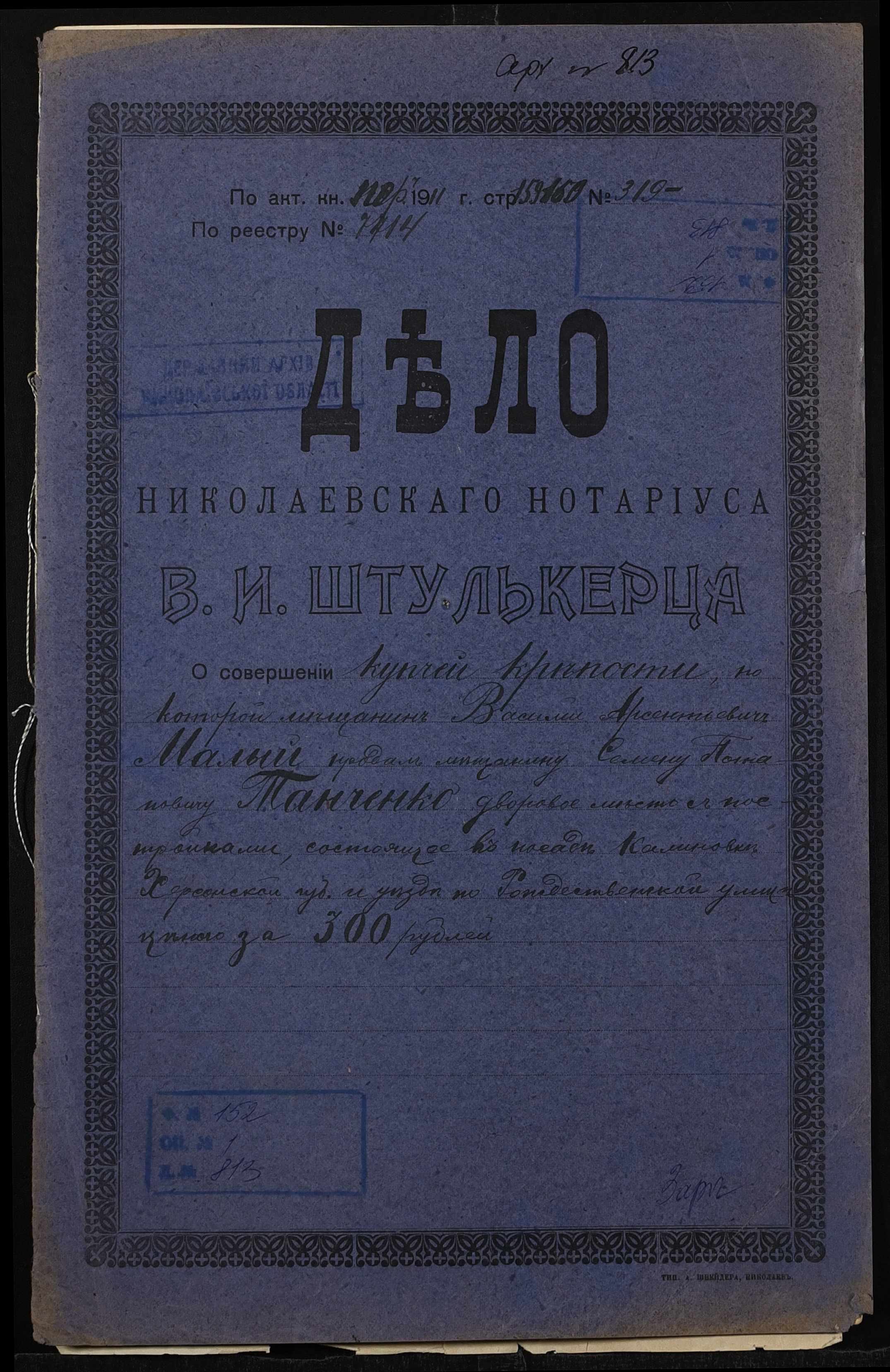 • • • • Справа № 813 “Справа про вчинення купчої про продаж дворового місця зі спорудами у посаді Калинівка Херсонського повіту і губернії на вул. Різдвяній міщанином Малим Василем Арсентійовичем (Малым Василием Арсентиевичем) на користь міщанина Панченка Семена Потаповича (Панченко Семена Потаповича)”