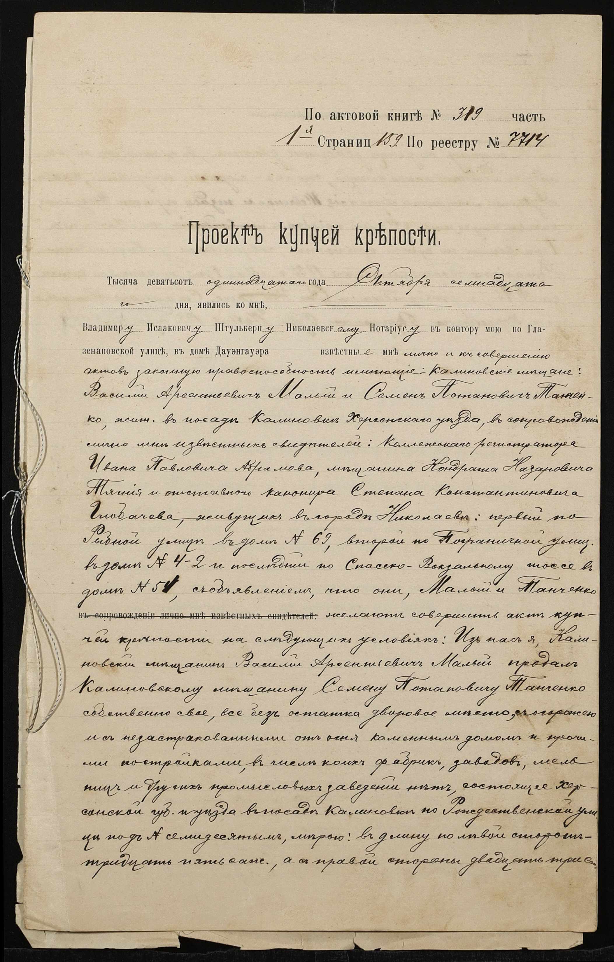 ◦ ◦ Фонд № 152 “Контора миколаївського нотаріуса Херсонського окружного суду Штулькерца Володимира Ісааковича”
