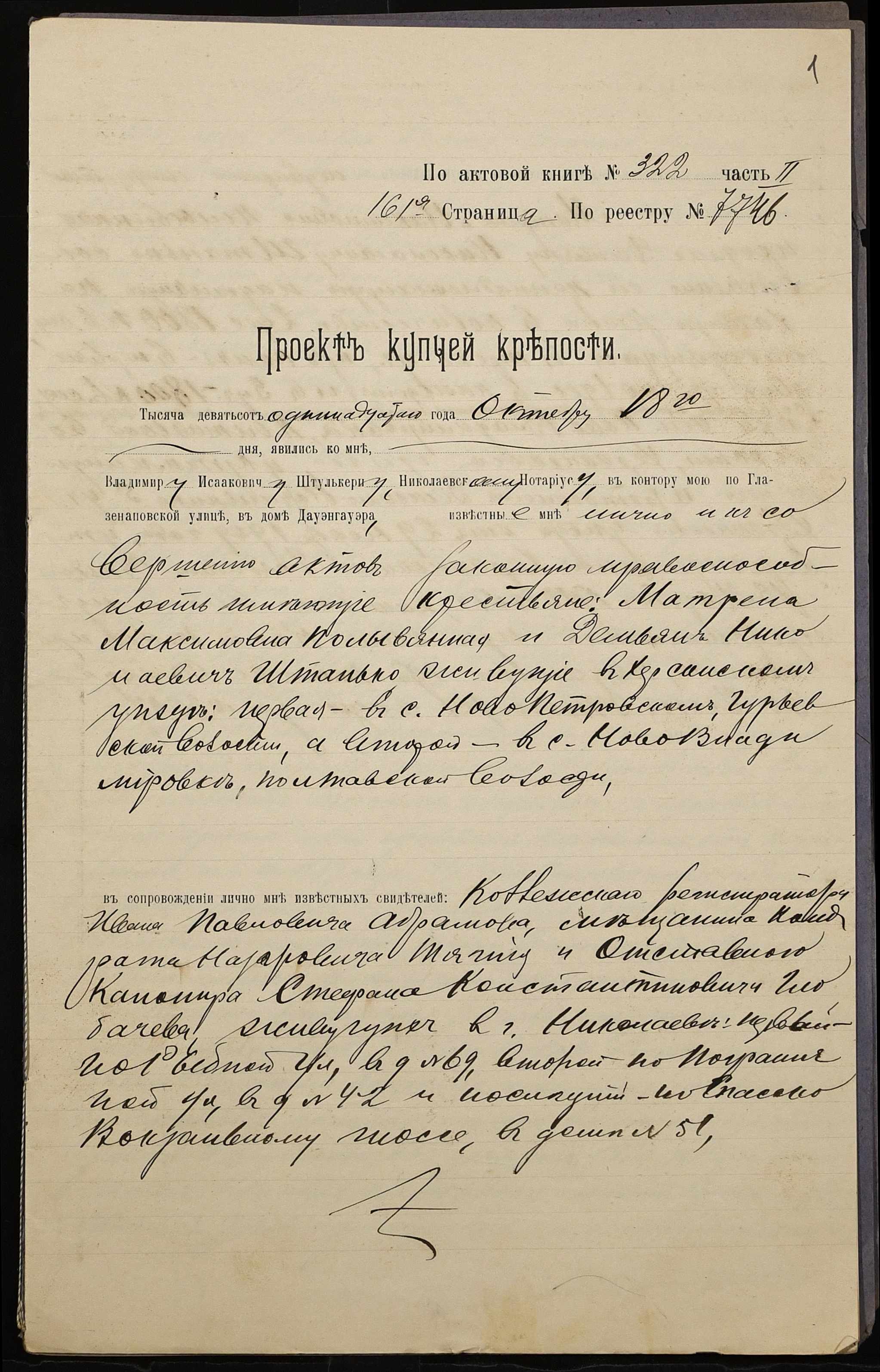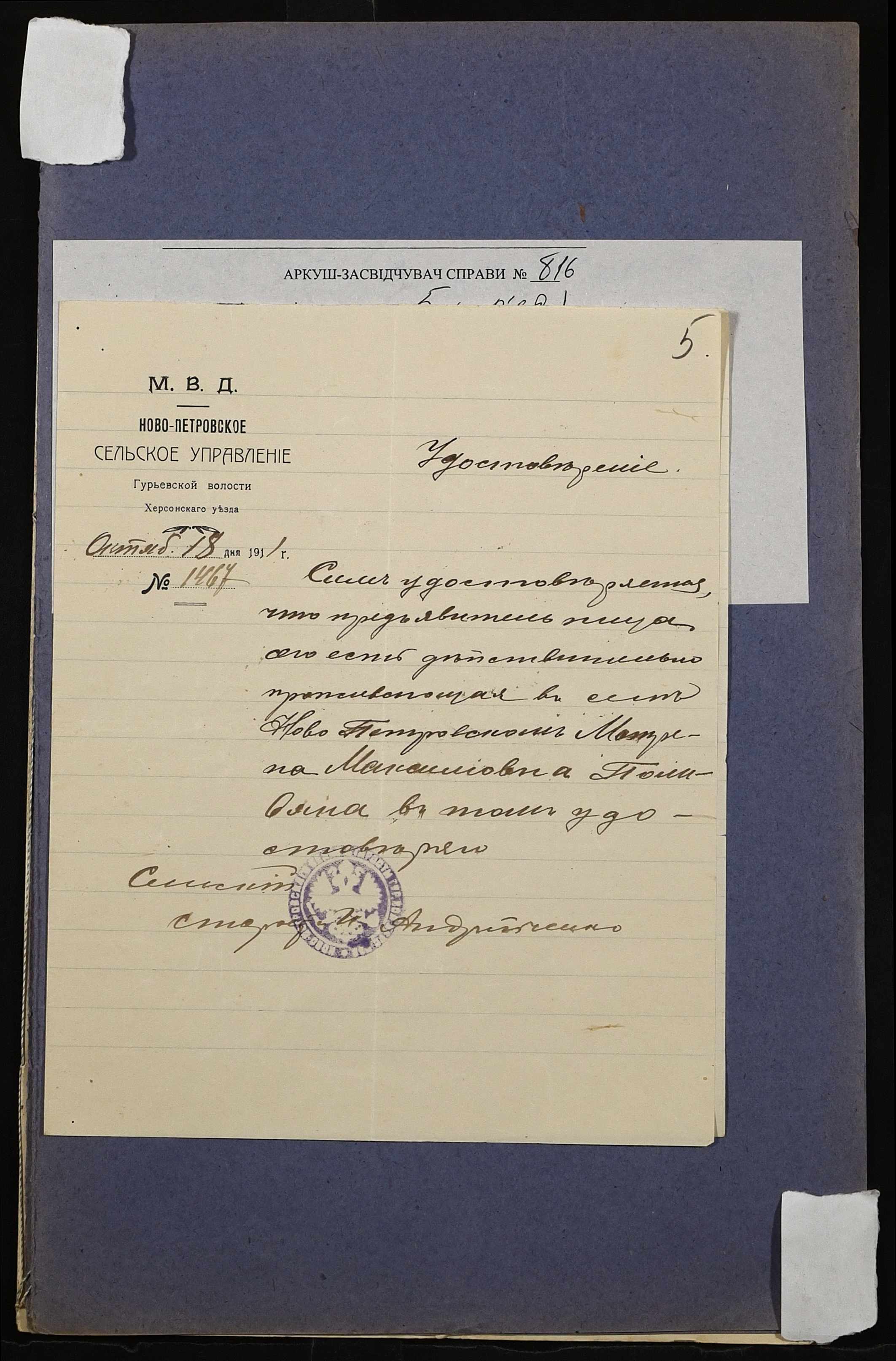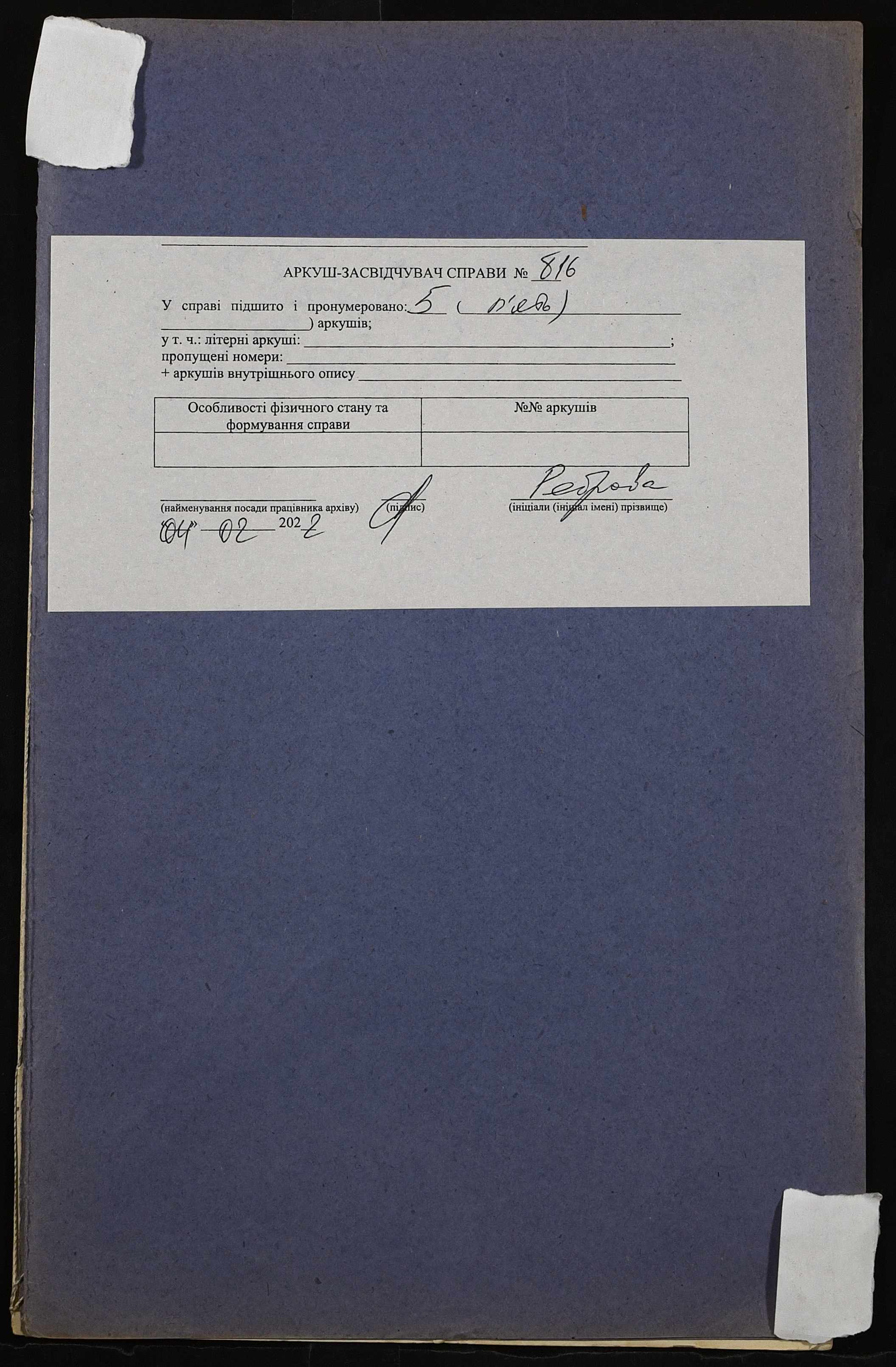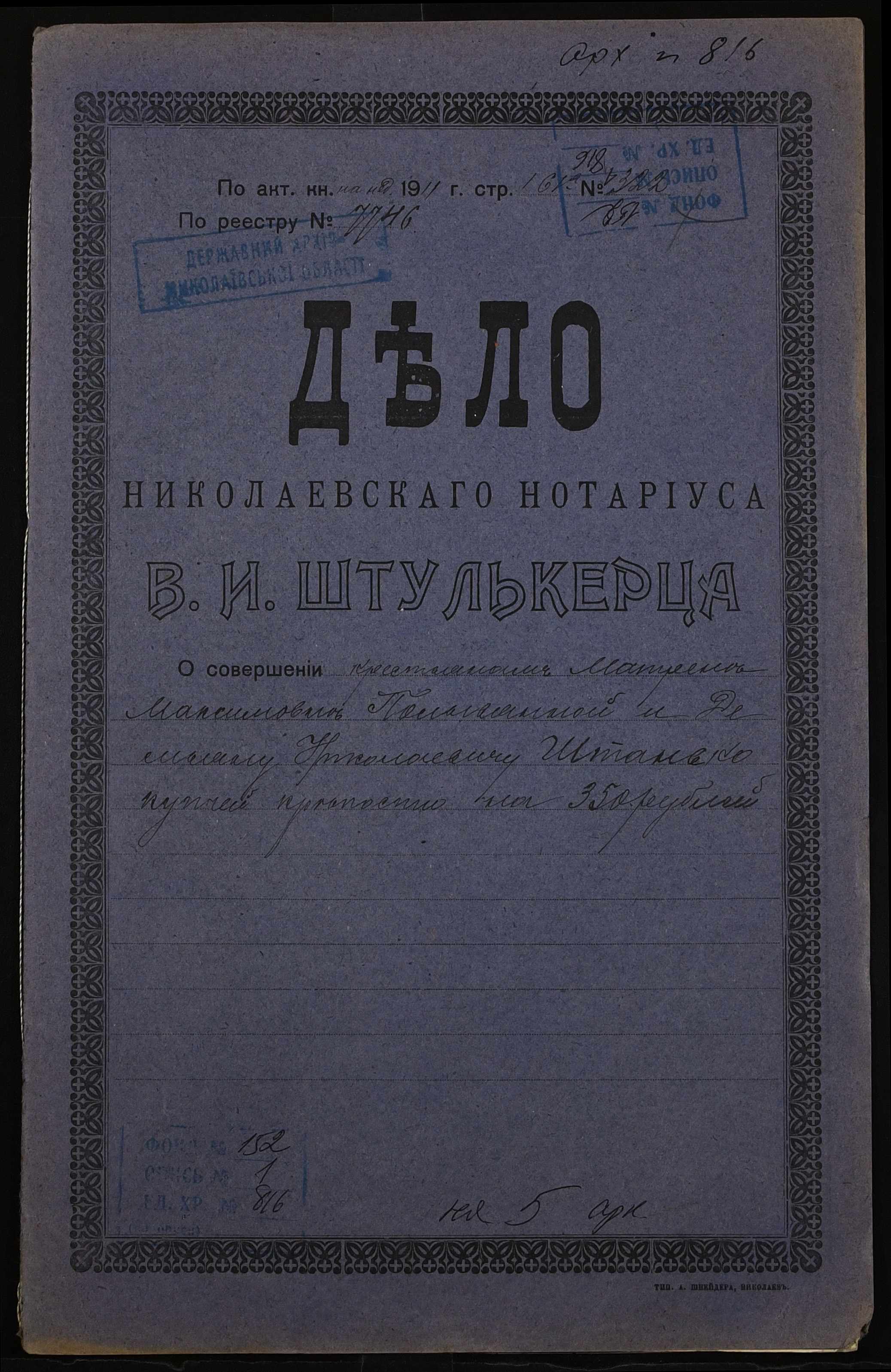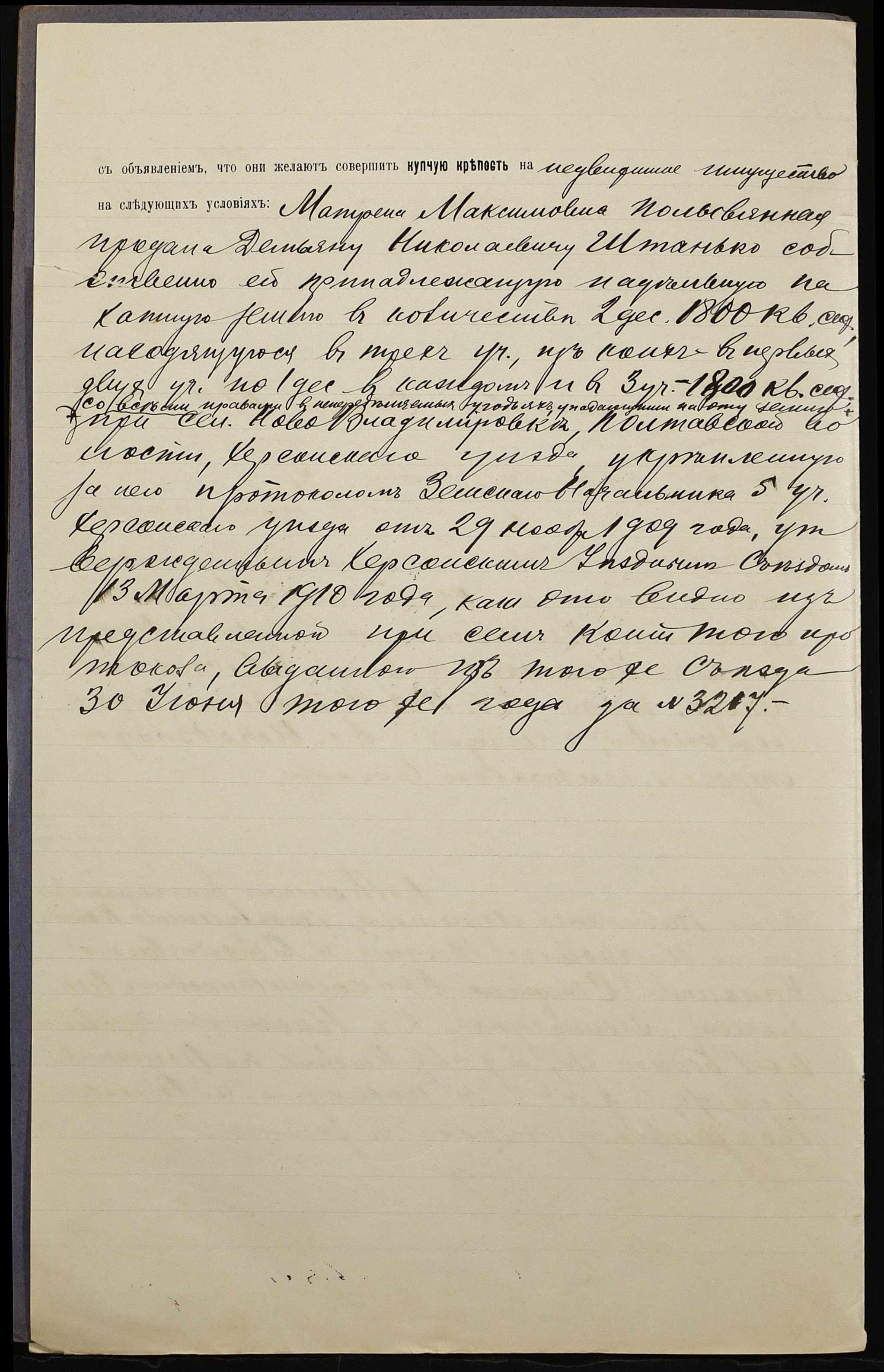 • • • • Справа № 816 “Справа про вчинення купчої про продаж нерухомого майна селянкою Поливянною Матроною Максимівною (Полывянной Матреной Максимовной) на користь селянина Штанька Дем’яна Миколайовича (Штанько Демьяна Николаевича)”