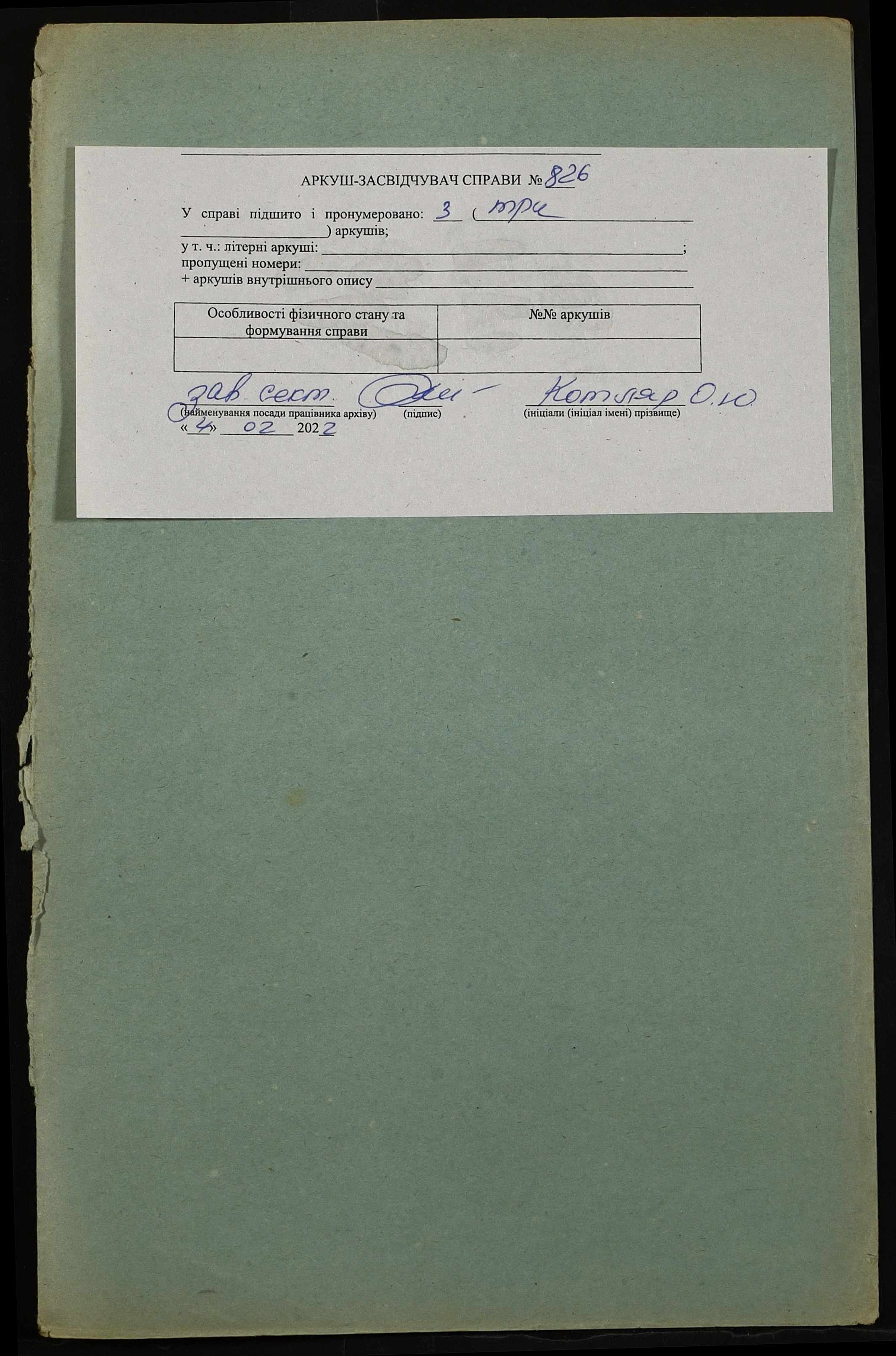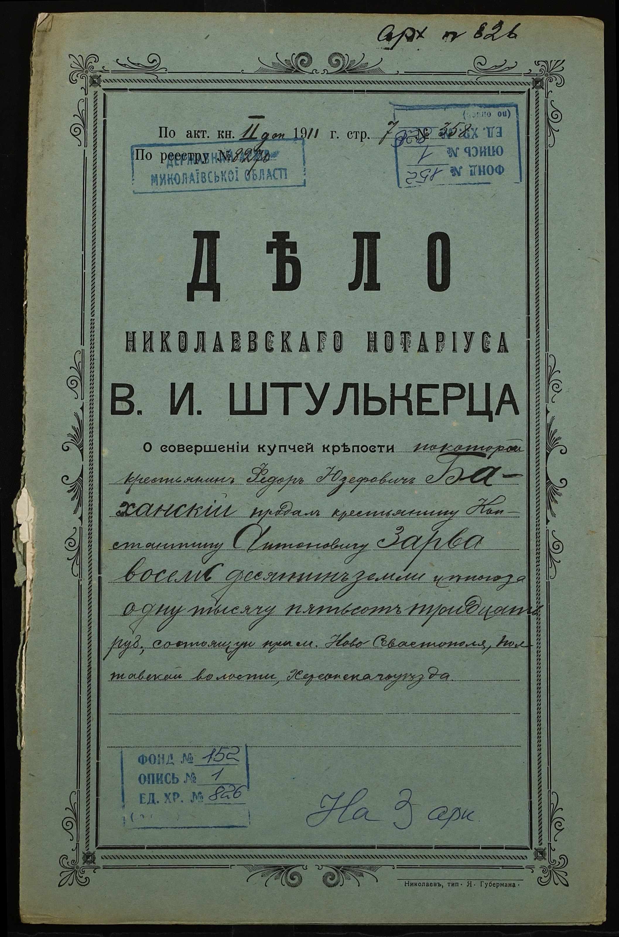 • • • • Справа № 826 “Справа про вчинення купчої про продаж землі біля м. Ново-Севастополя Полтавської волості Херсонського повіту селянином Баханським Федором Юзефовичем (Баханским Федором Юзефовичем) на користь селянина Зарви Костянтина Антоновича (Зарвы Константина Антоновича)”