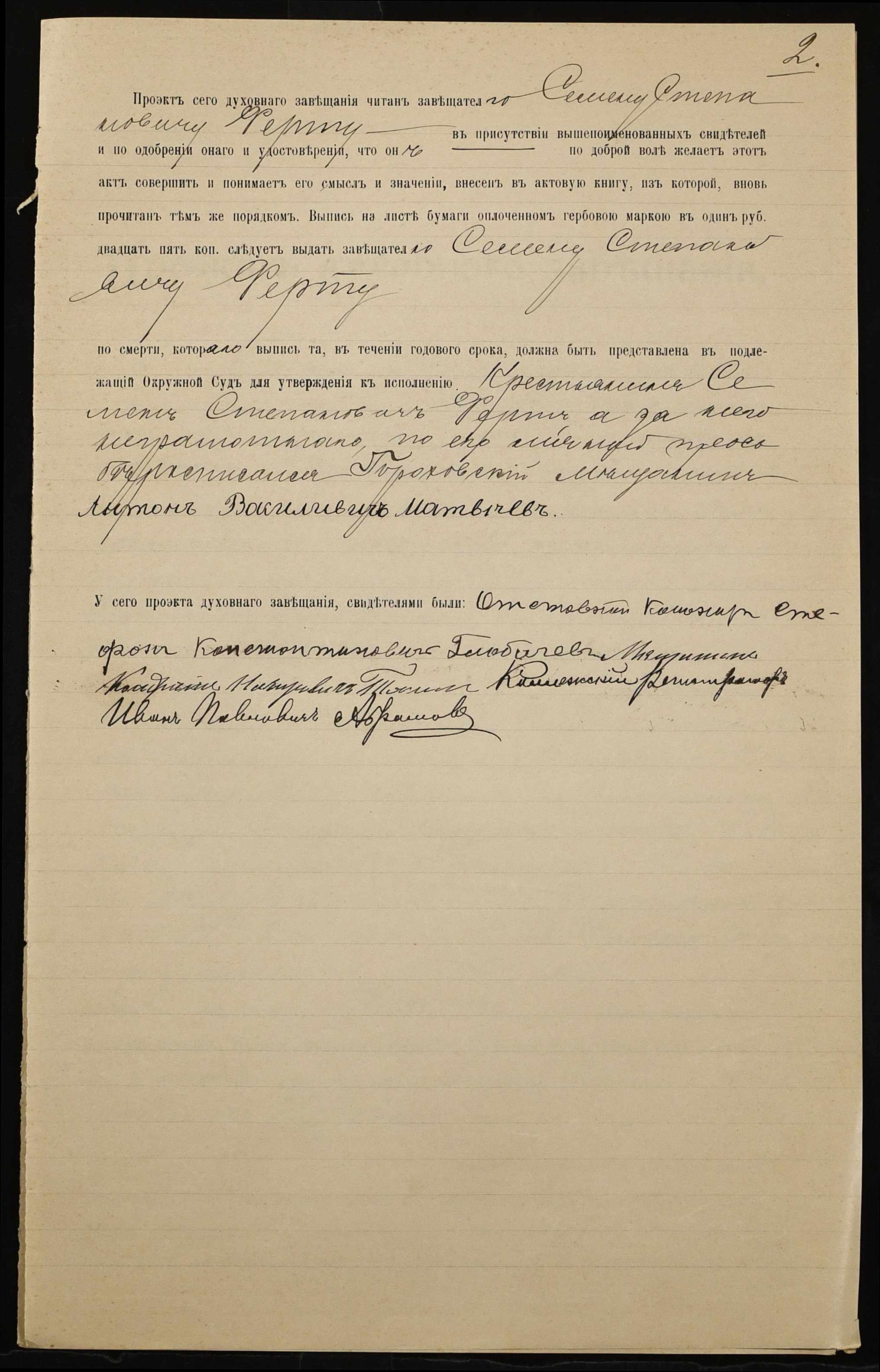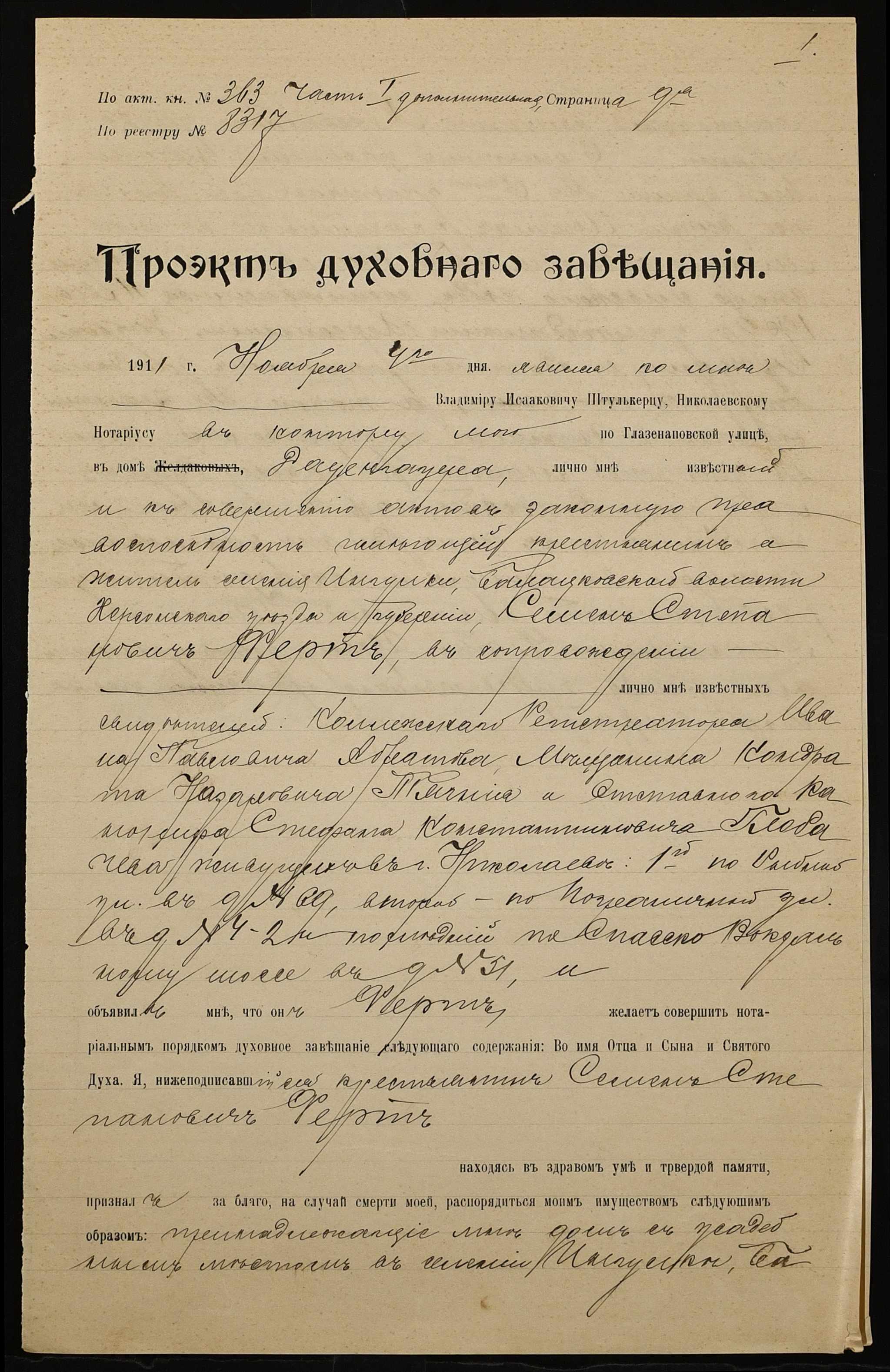 • • • • Справа № 831 “Проєкт духівниці Ферта Семена Степановича (Ферта Семена Степановича)”