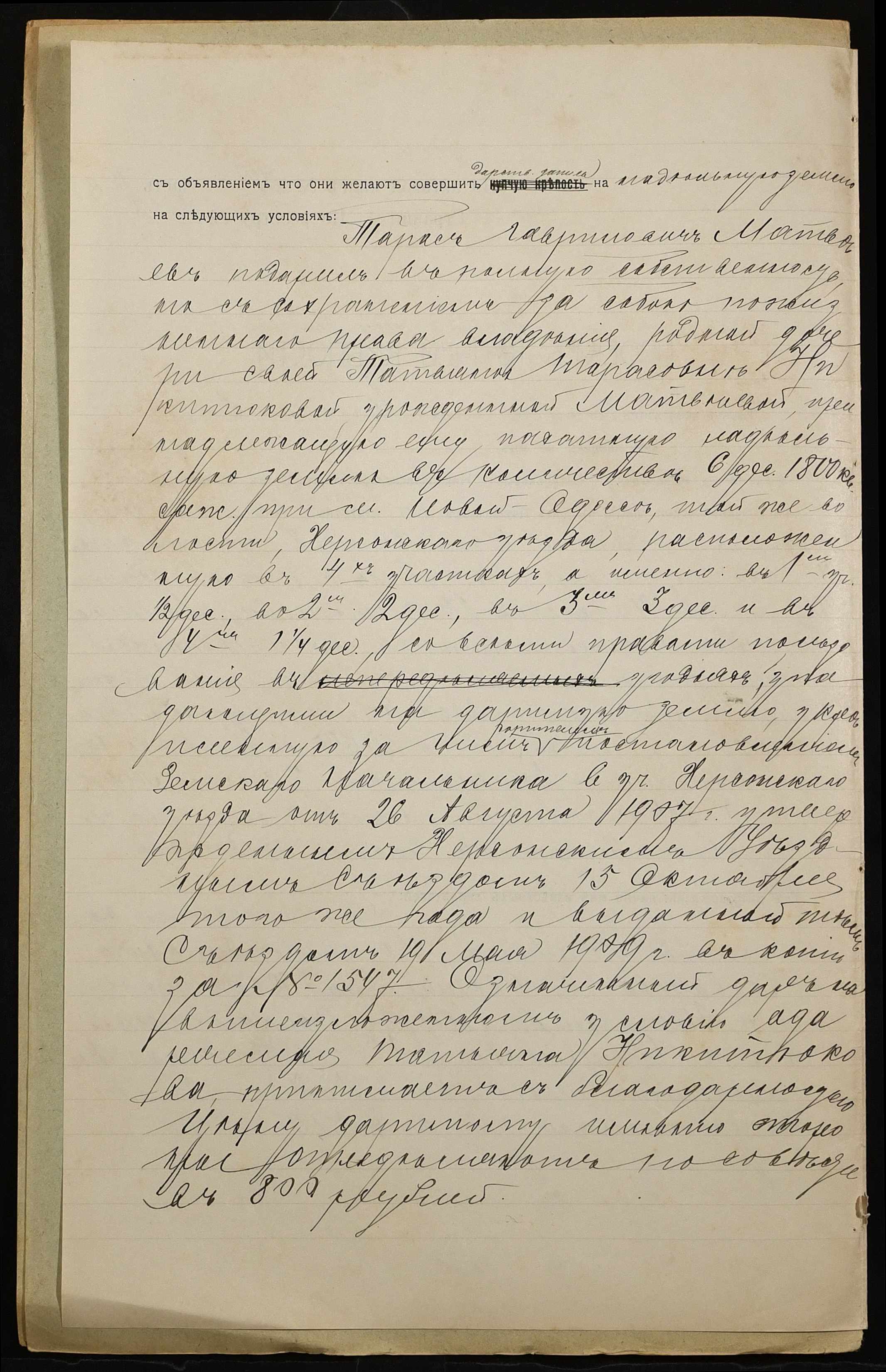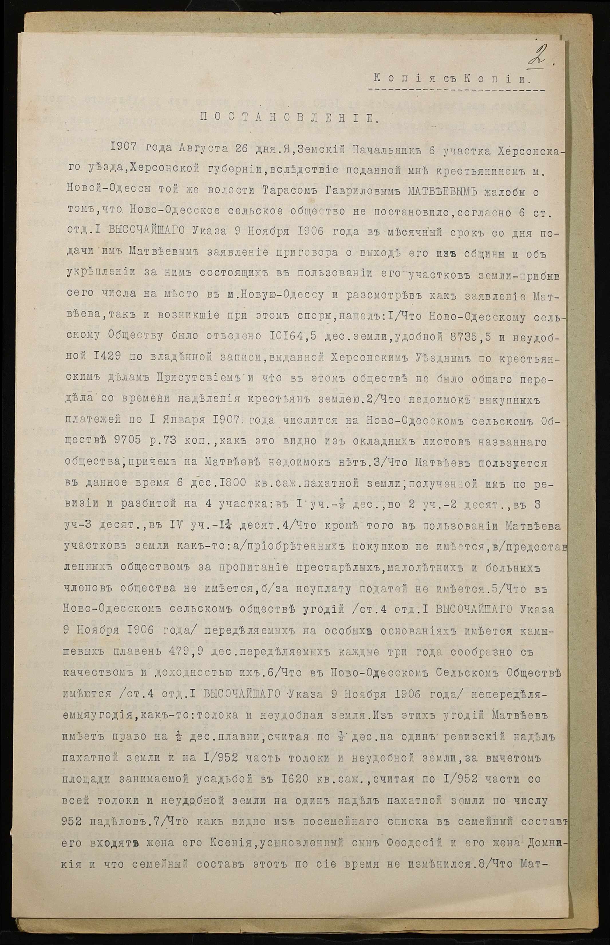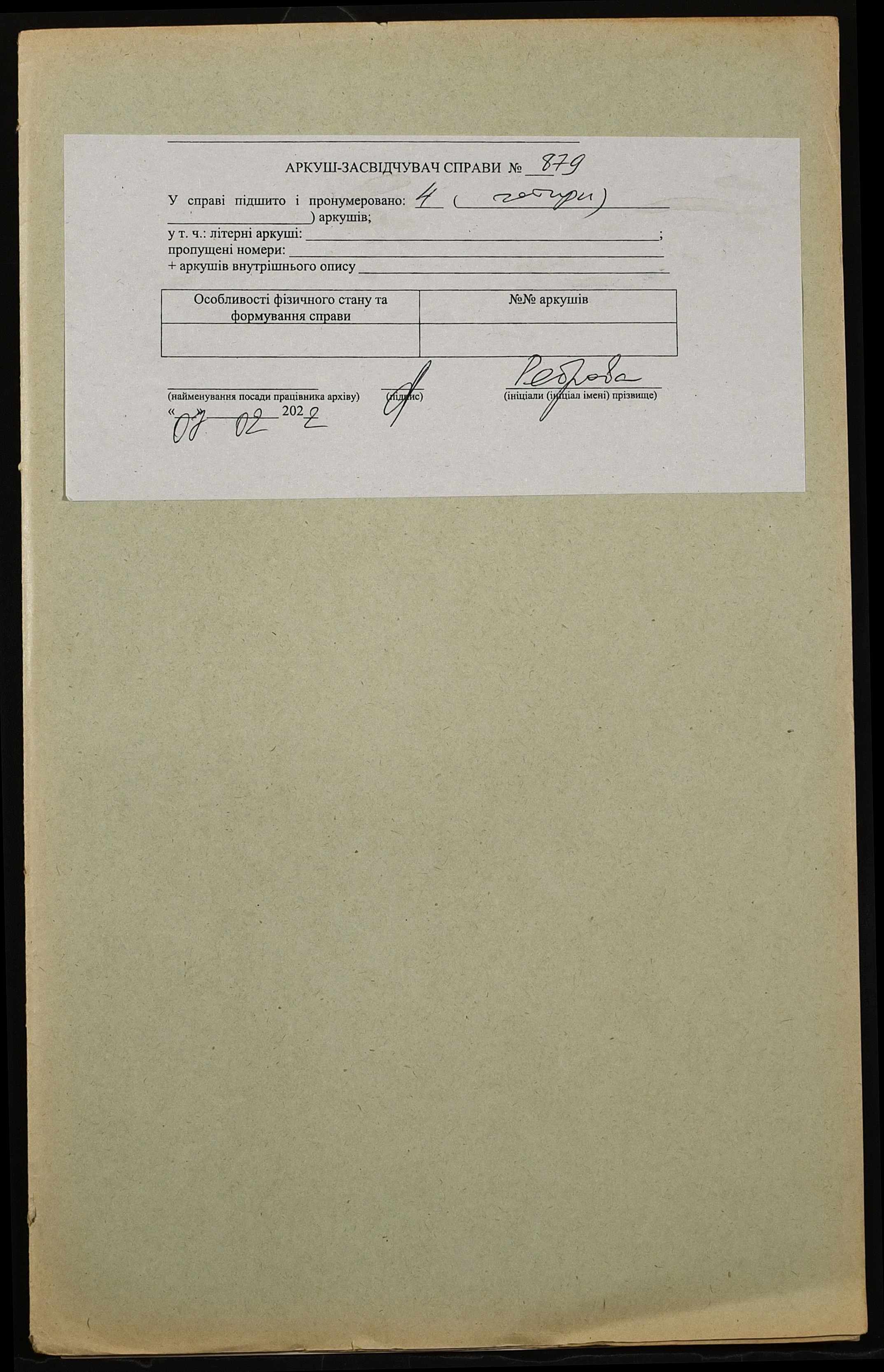• • • • Справа № 879 “Справа про вчинення дарчої на землю, передану селянином Матвєєвим Тарасом Гавриловичем (Матвеевым Тарасом Гаврииловичем) у власність селянки Нікітюкової Тетяни Тарасівни (Никитюковой Татьяны Тарасовны), уродженої Матвєєвої (Матвеевой)”