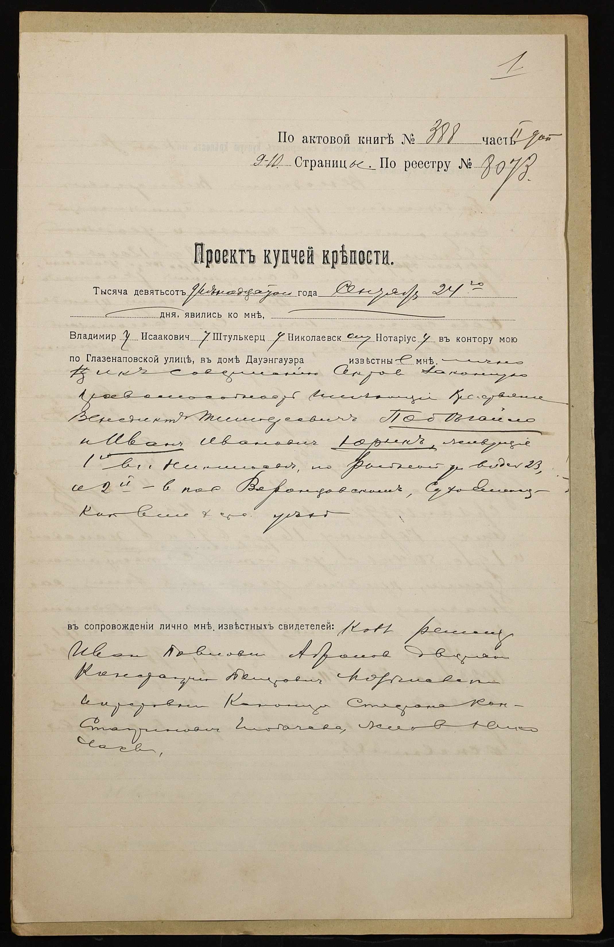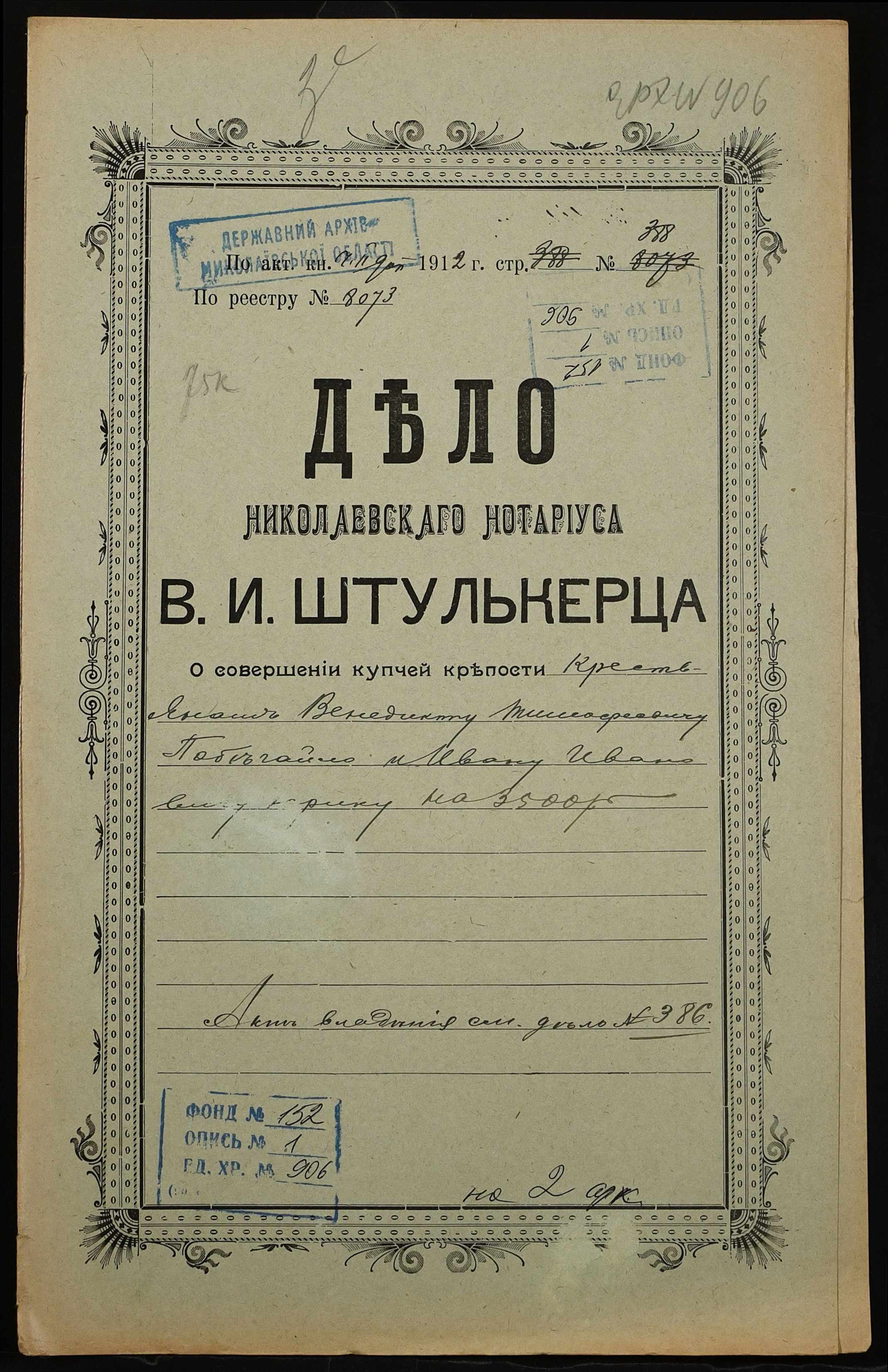 • • • • Справа № 906 “Справа про вчинення купчої про продаж землі селянином Побєгайлом Венедиктом Тимофійовичем (Побегайло Венедиктом Тимофеевичем) на користь селянина Юрика Івана Івановича (Юрика Ивановича Ивановича)”