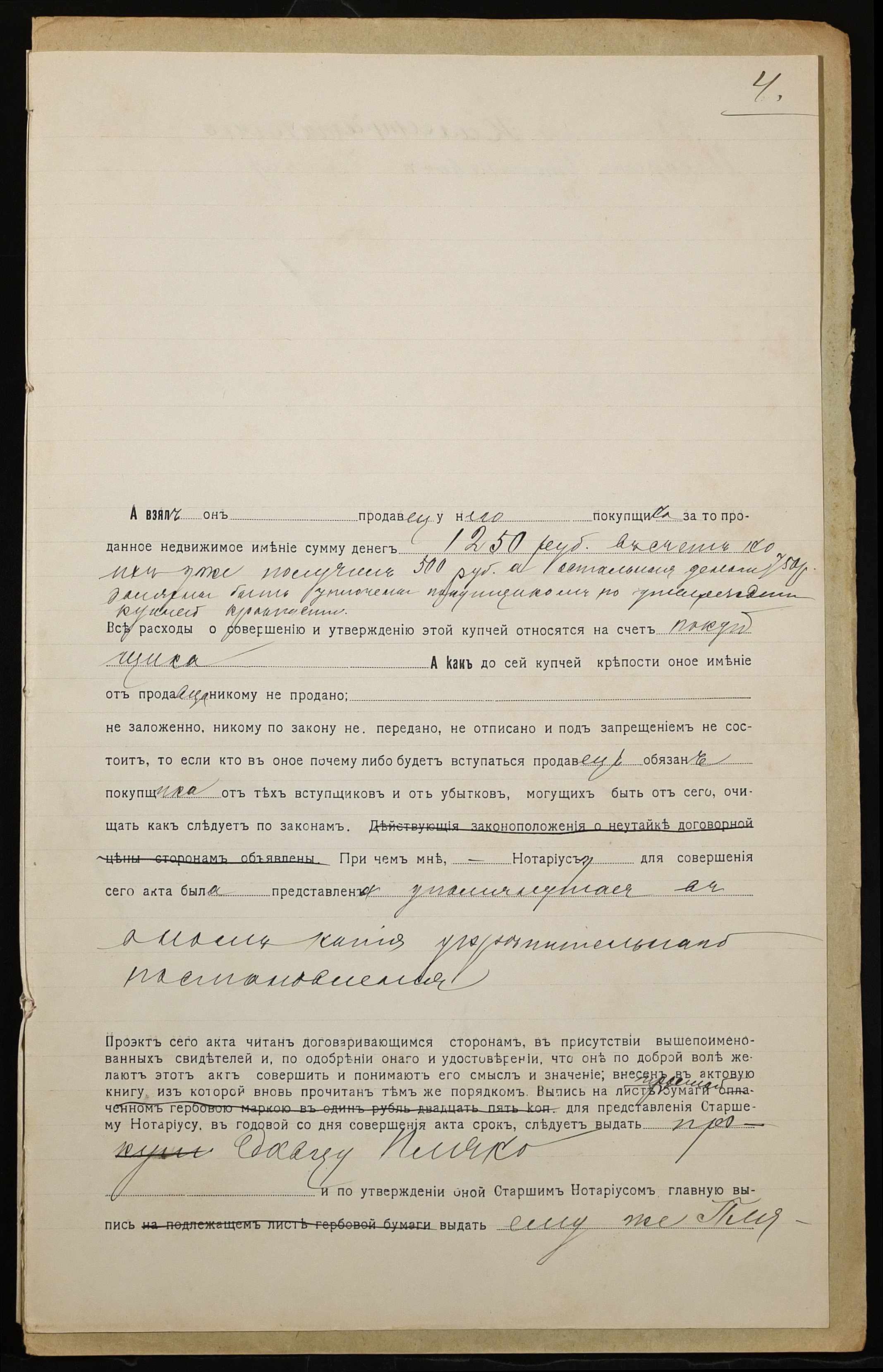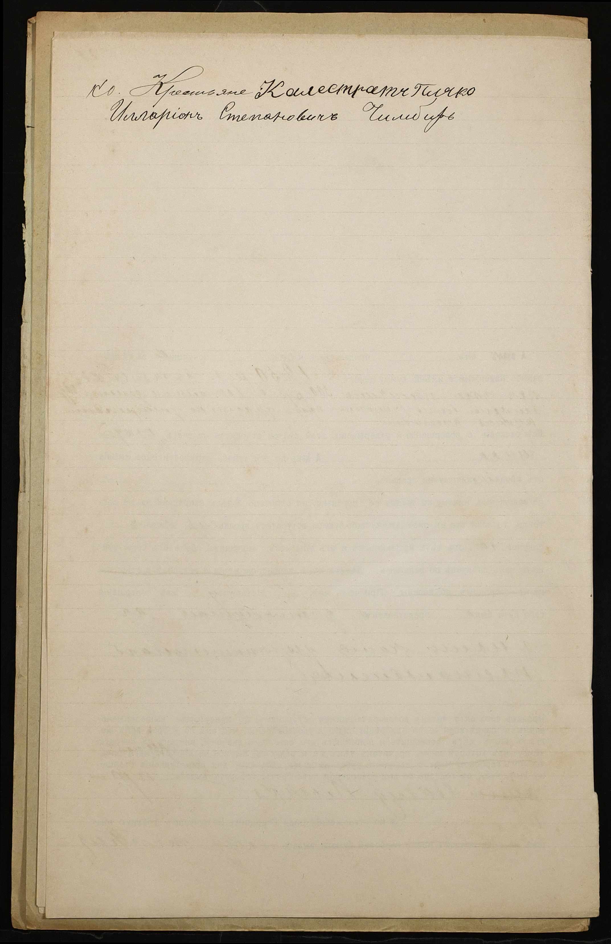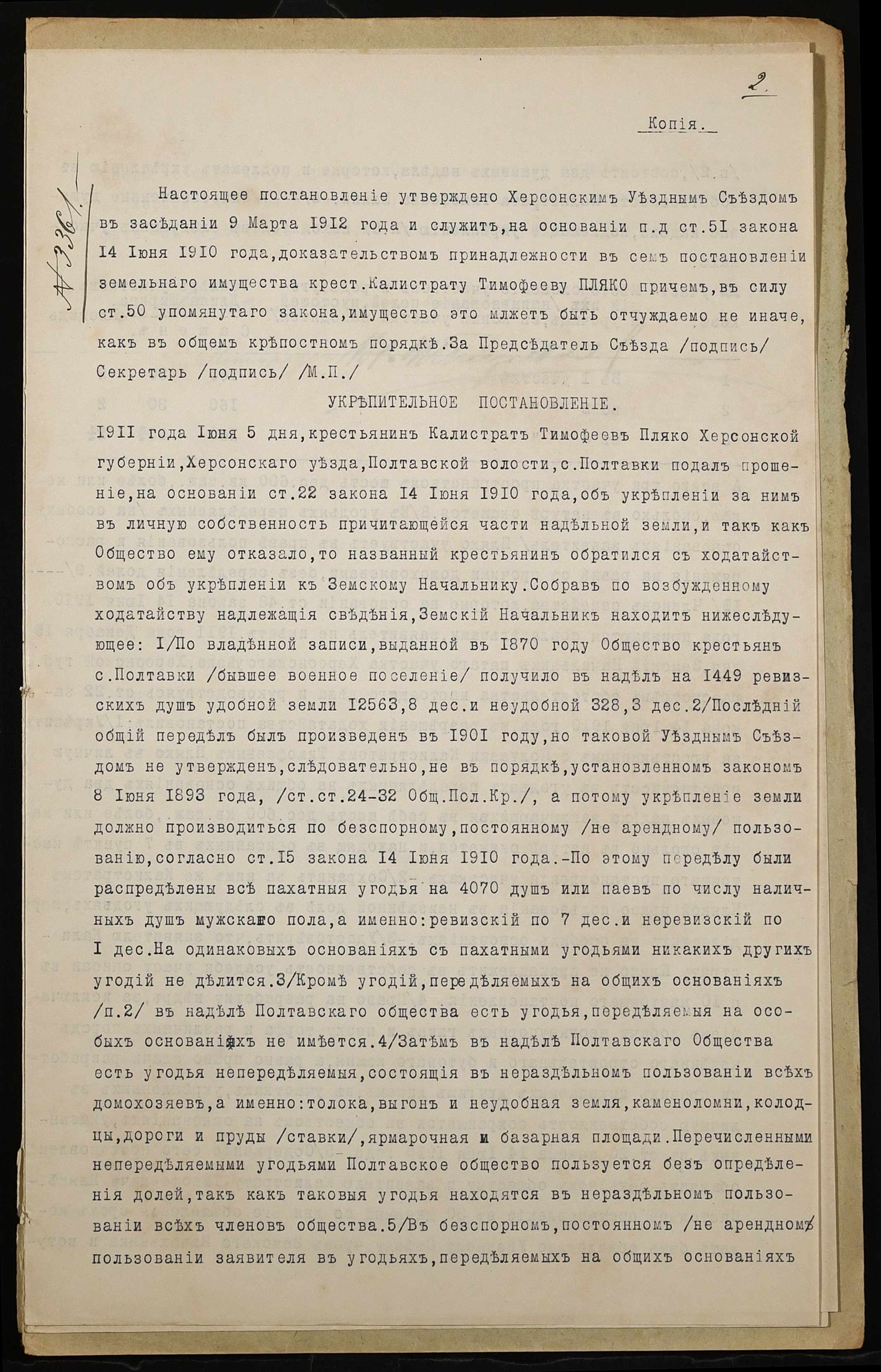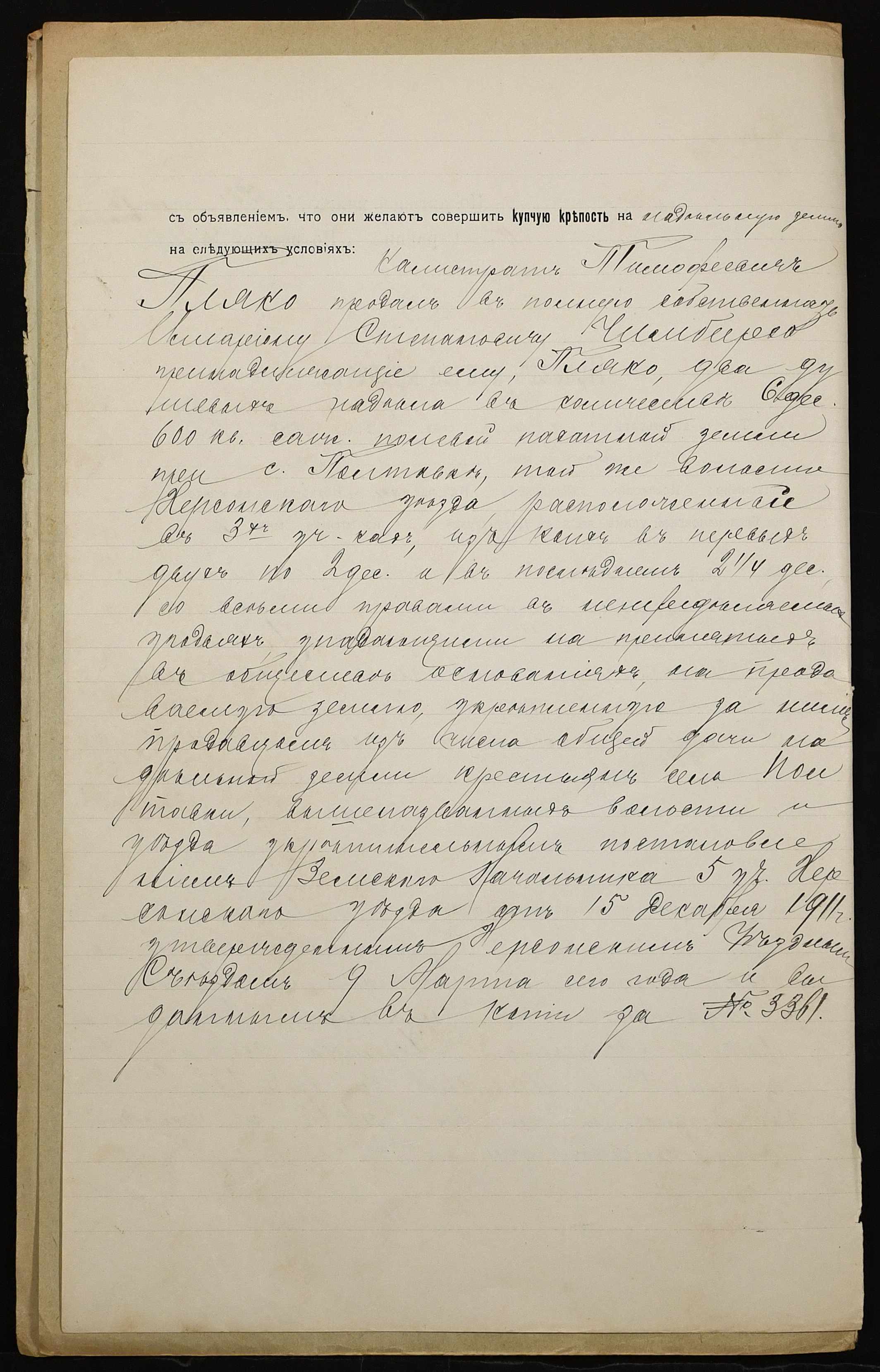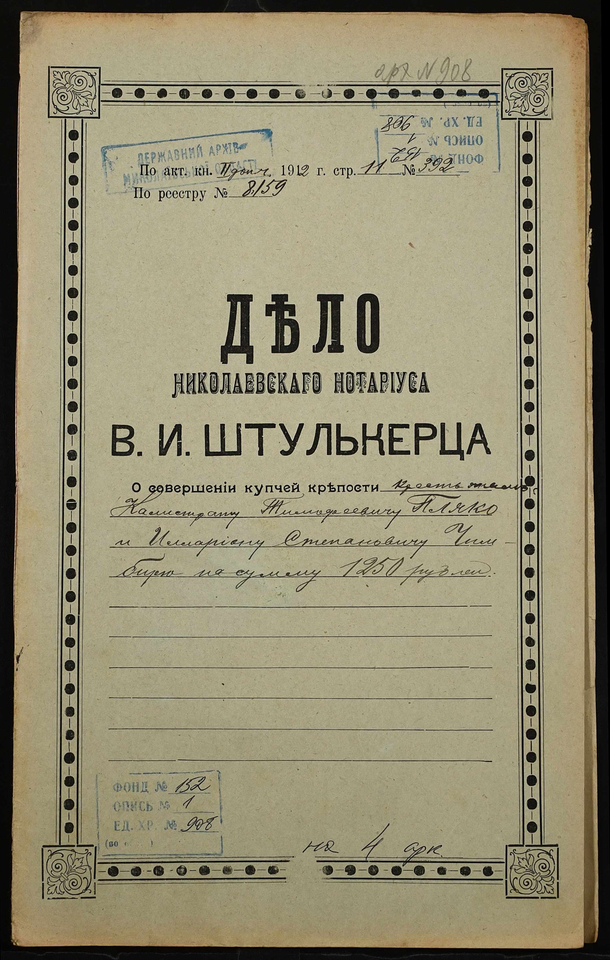 • • • • Справа № 908 “Справа про вчинення купчої про продаж землі селянином Пляко Калістратом Тимофійовичем (Пляко Калистратом Тимофеевичем) на користь селянина Чимбиря Іларіона Степановича (Чимбиря Иллариона Степановича)”