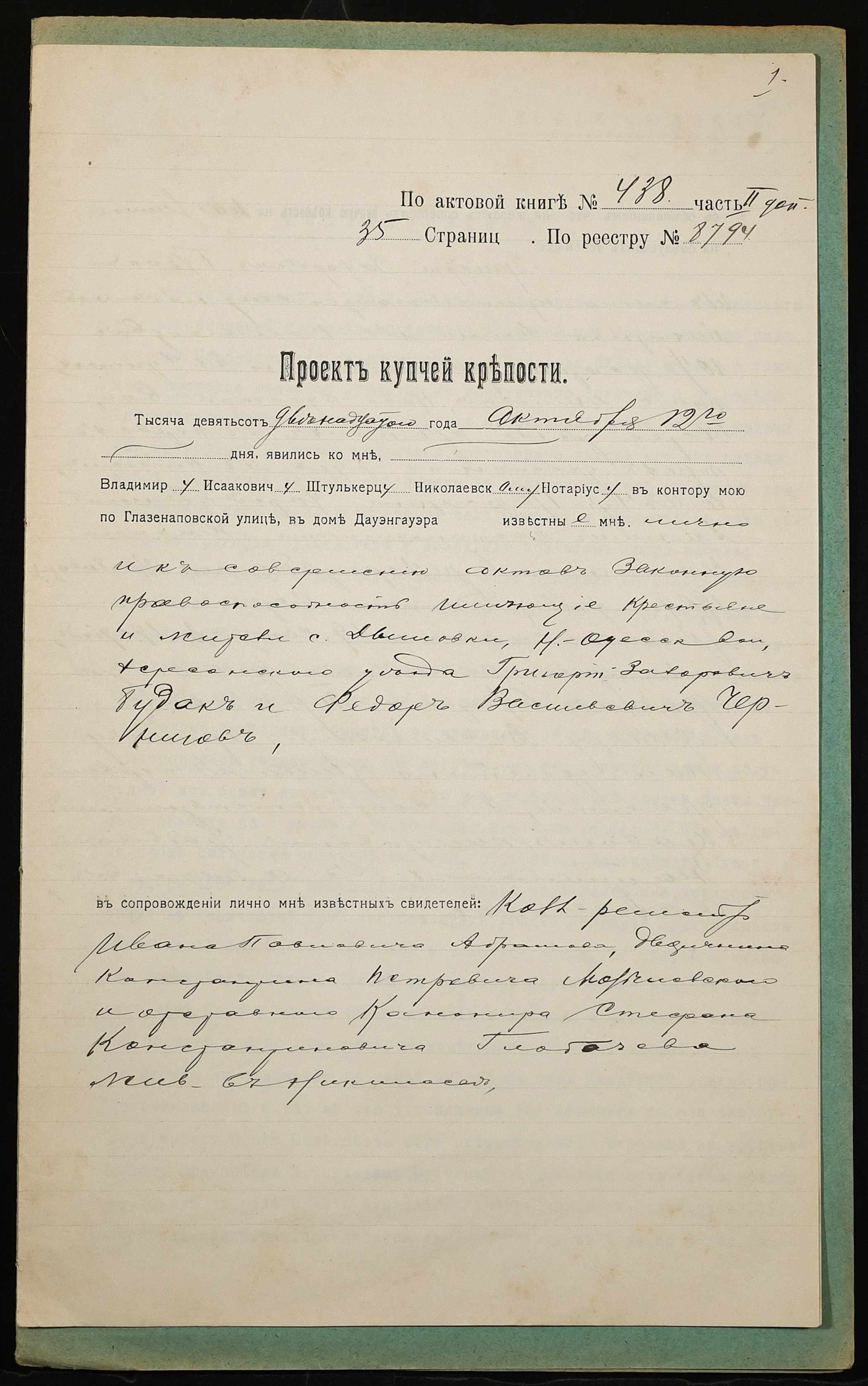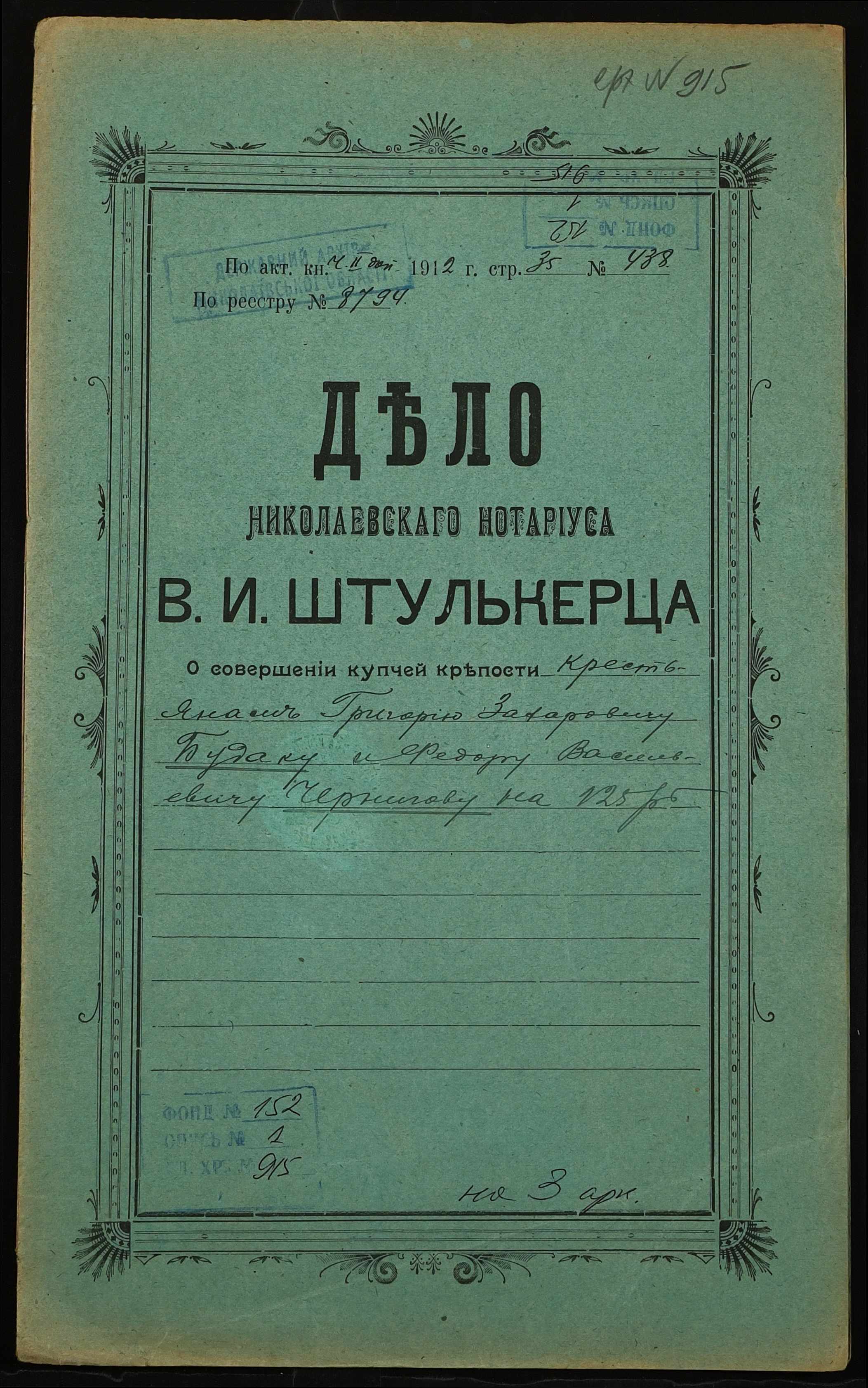 ◦ ◦ Фонд № 152 “Контора миколаївського нотаріуса Херсонського окружного суду Штулькерца Володимира Ісааковича”