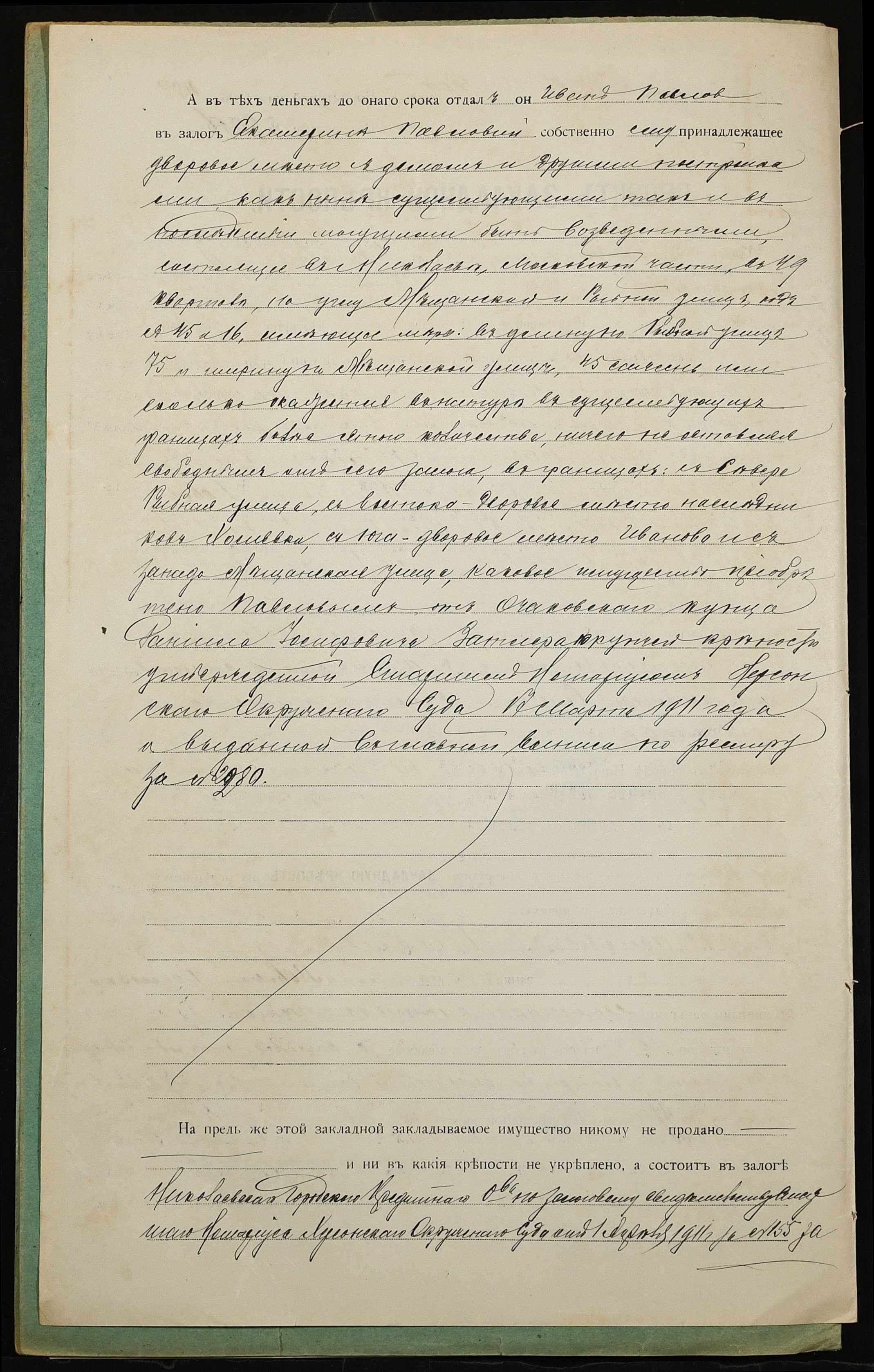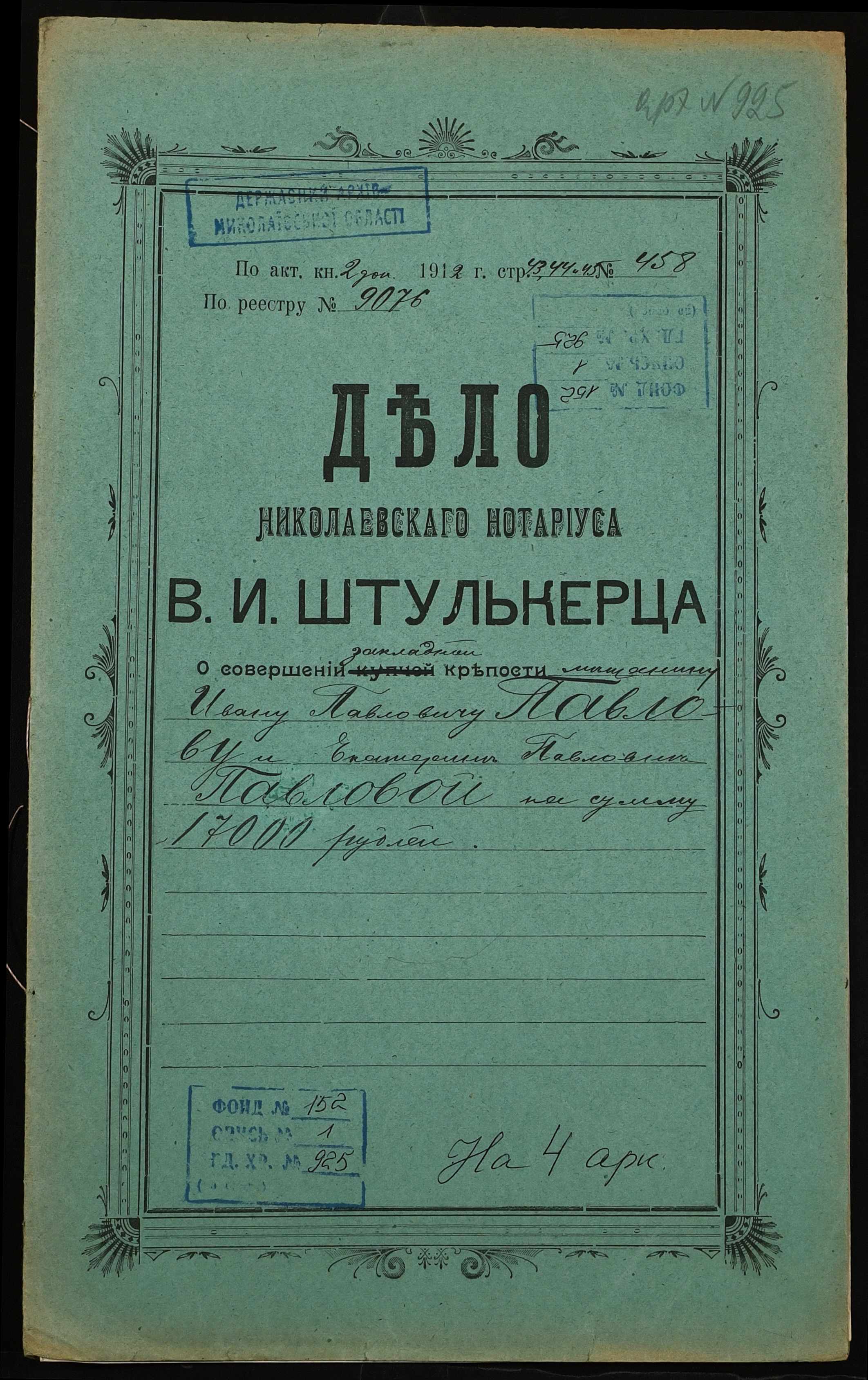 • • • • Справа № 925 “Справа про вчинення заставної на дворове місце з будинком та усіма спорудами, закладене Павловим Іваном Павловичем (Павловым Иваном Павловичем) – Павловій Катерині Павлівні (Павловой Екатерине Павловне)”