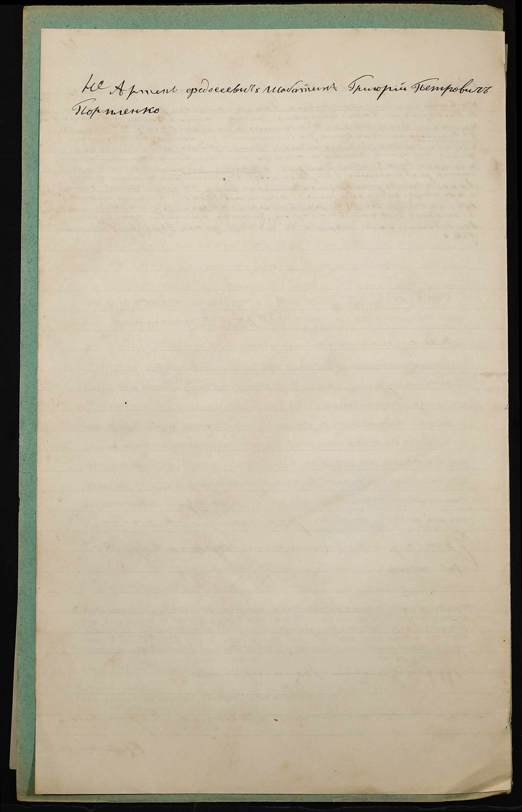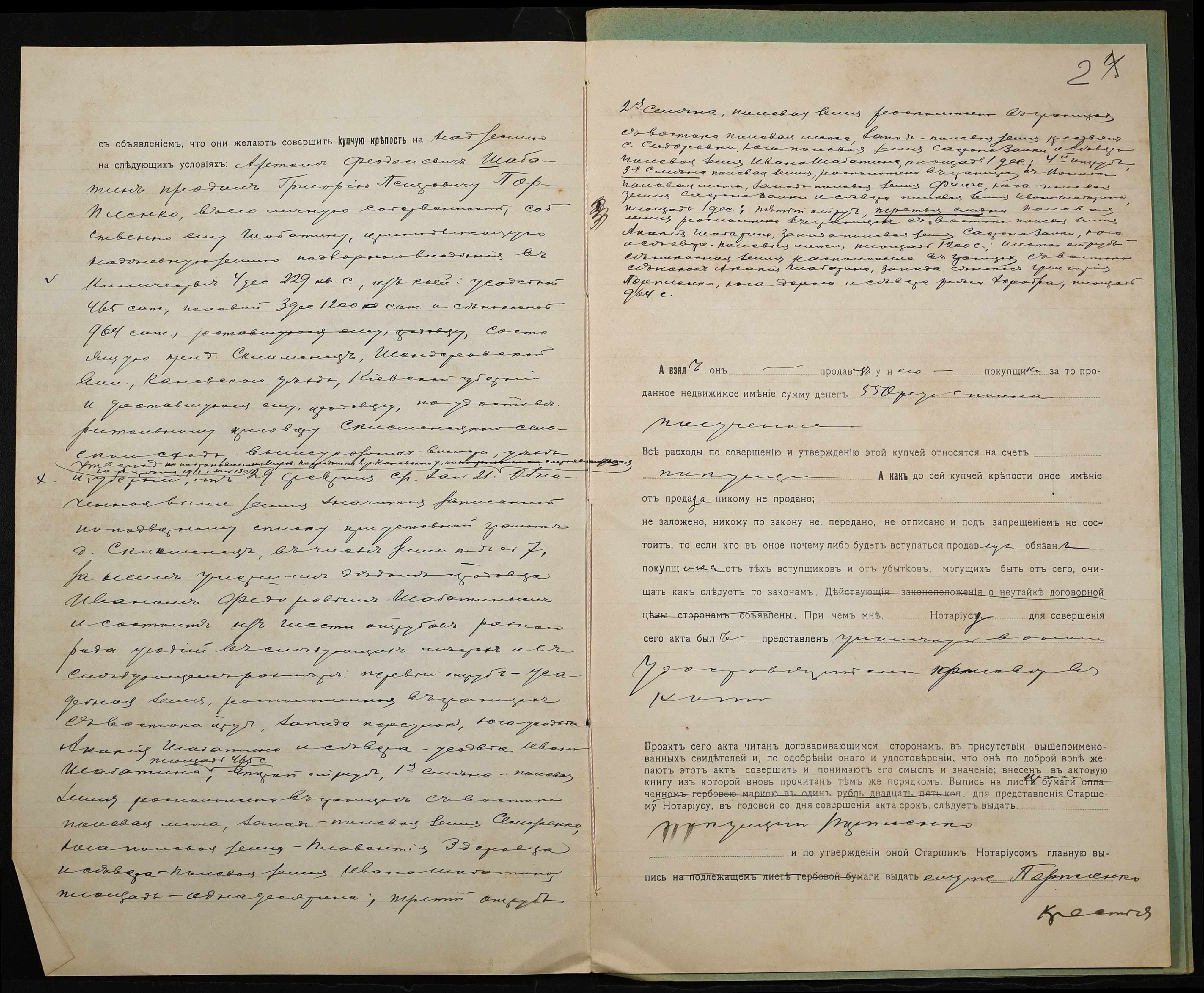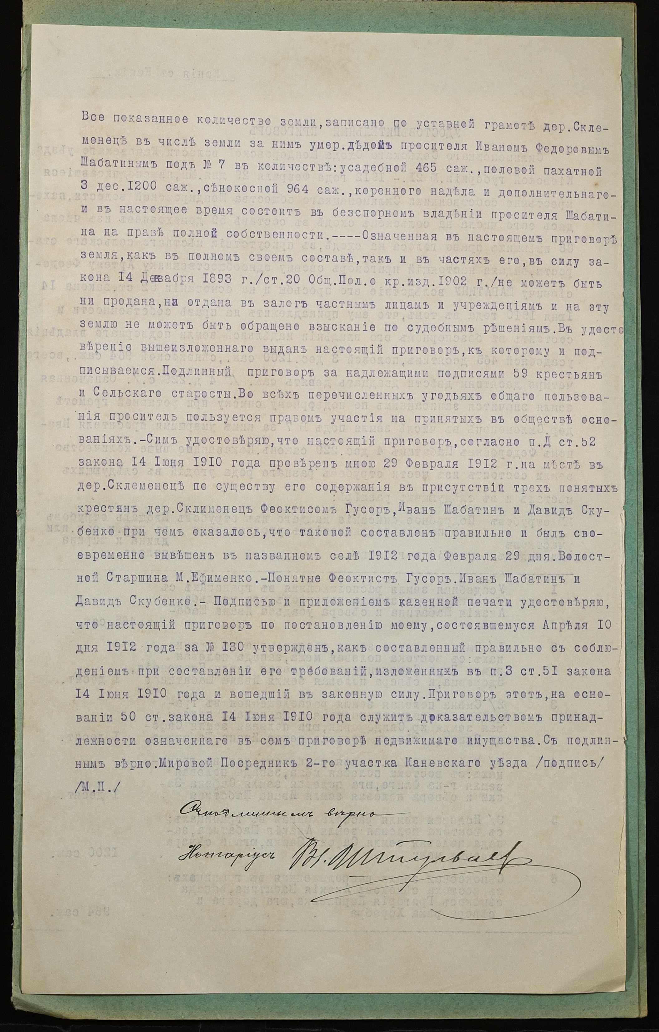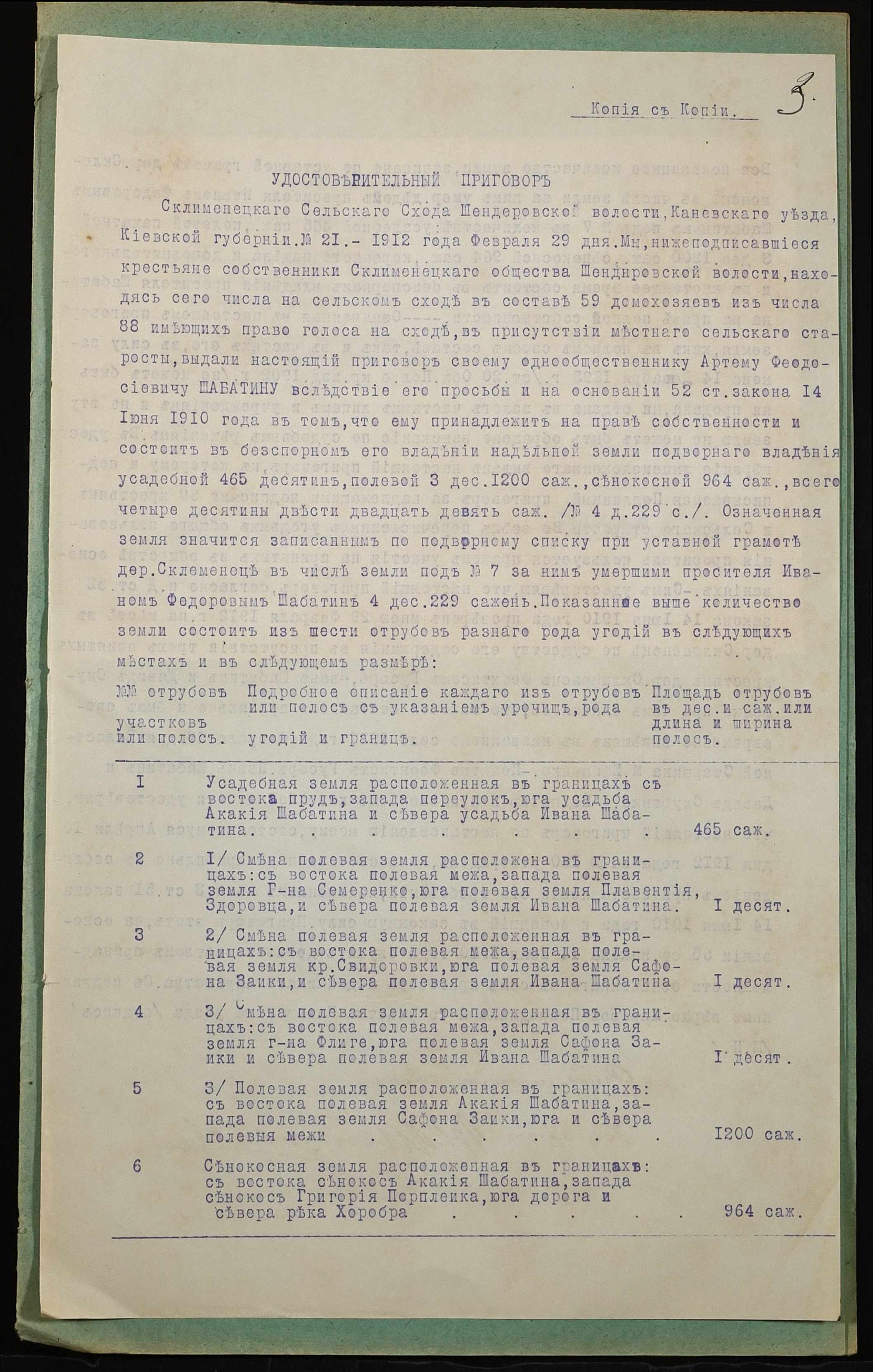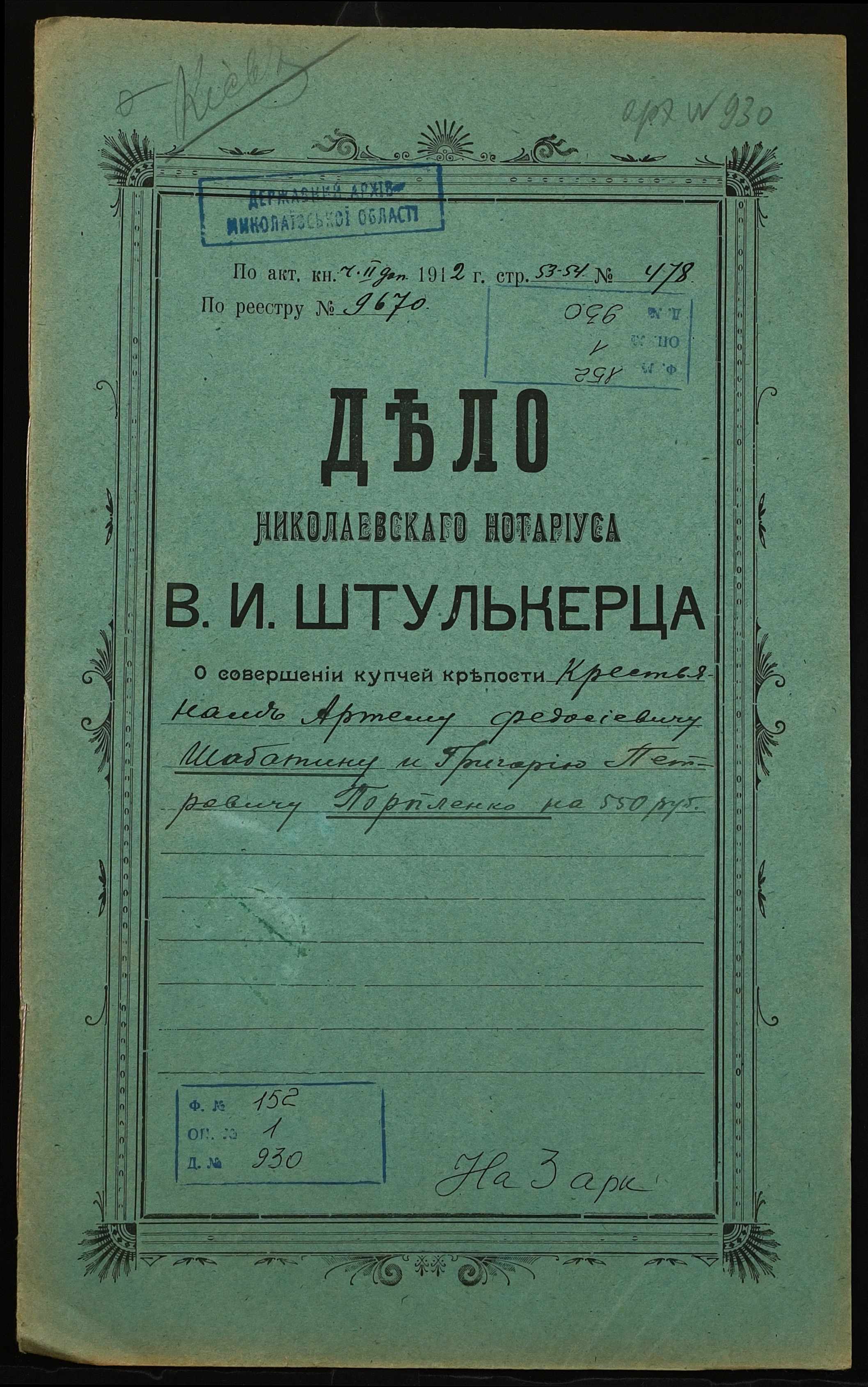 • • • • Справа № 930 “Справа про вчинення купчої про продаж землі селянином Шабатіним Артемом Феодосійовичем (Шабатиным Артемом Феодосьевичем) на користь селянина Порпленка Григорія Петровича (Порпленко Григория Петровича)”