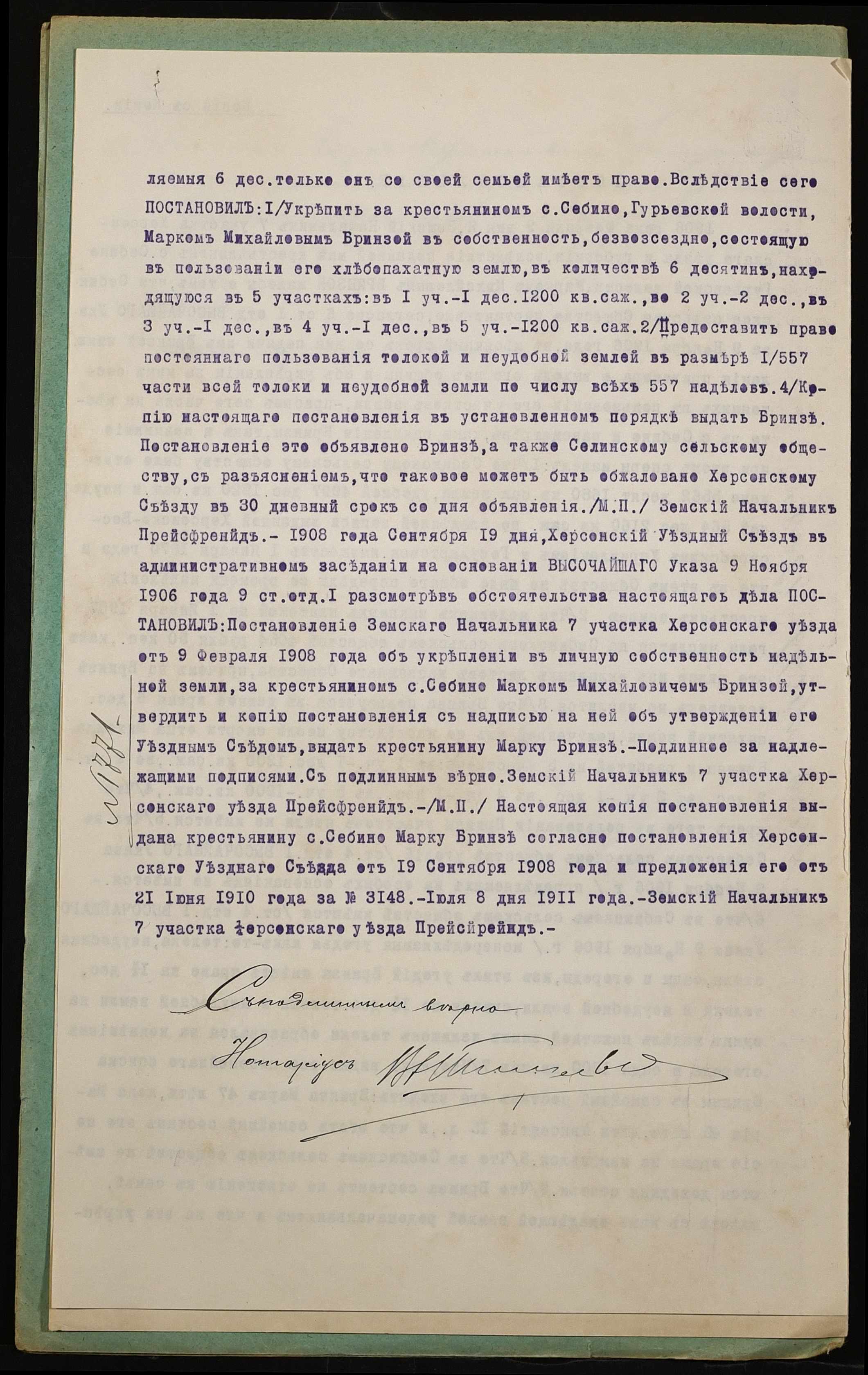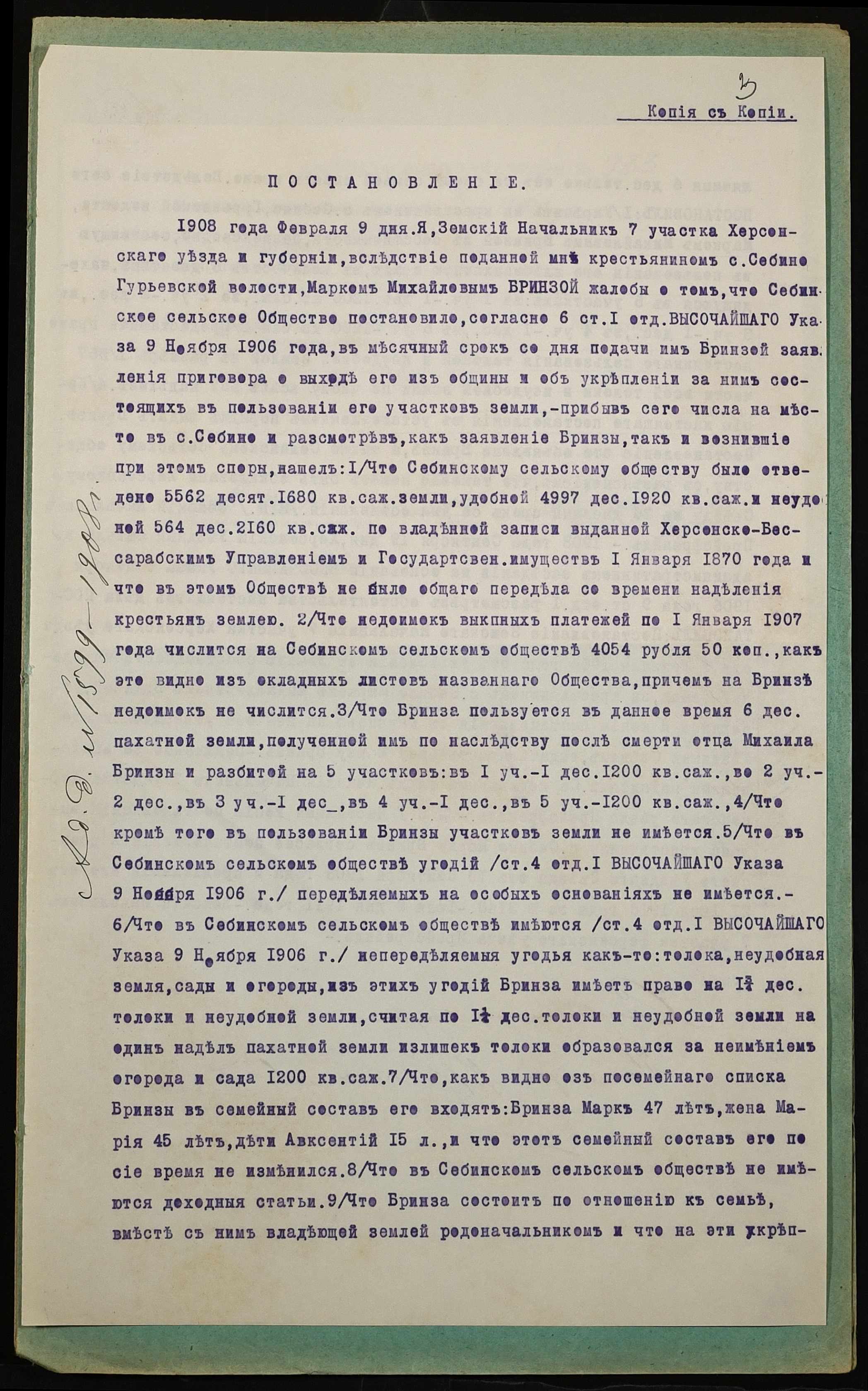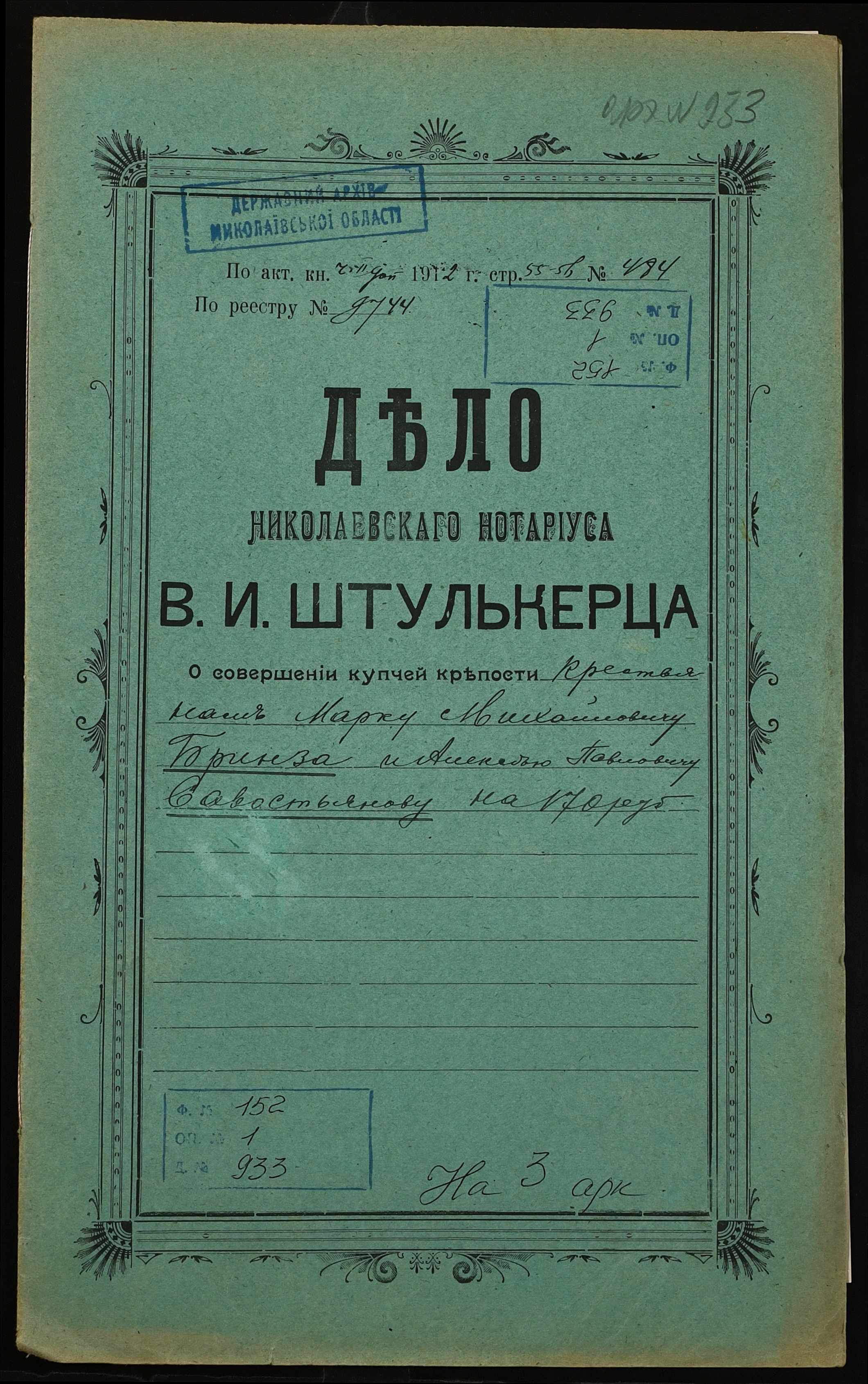 • • • • Справа № 933 “Справа про вчинення купчої про продаж землі селянином Бринзою Марком Михайловичем (Брынзой Марком Михайловичем) на користь селянина Савостьянова Олексія Павловича (Савостьянова Алексея Павловича)”