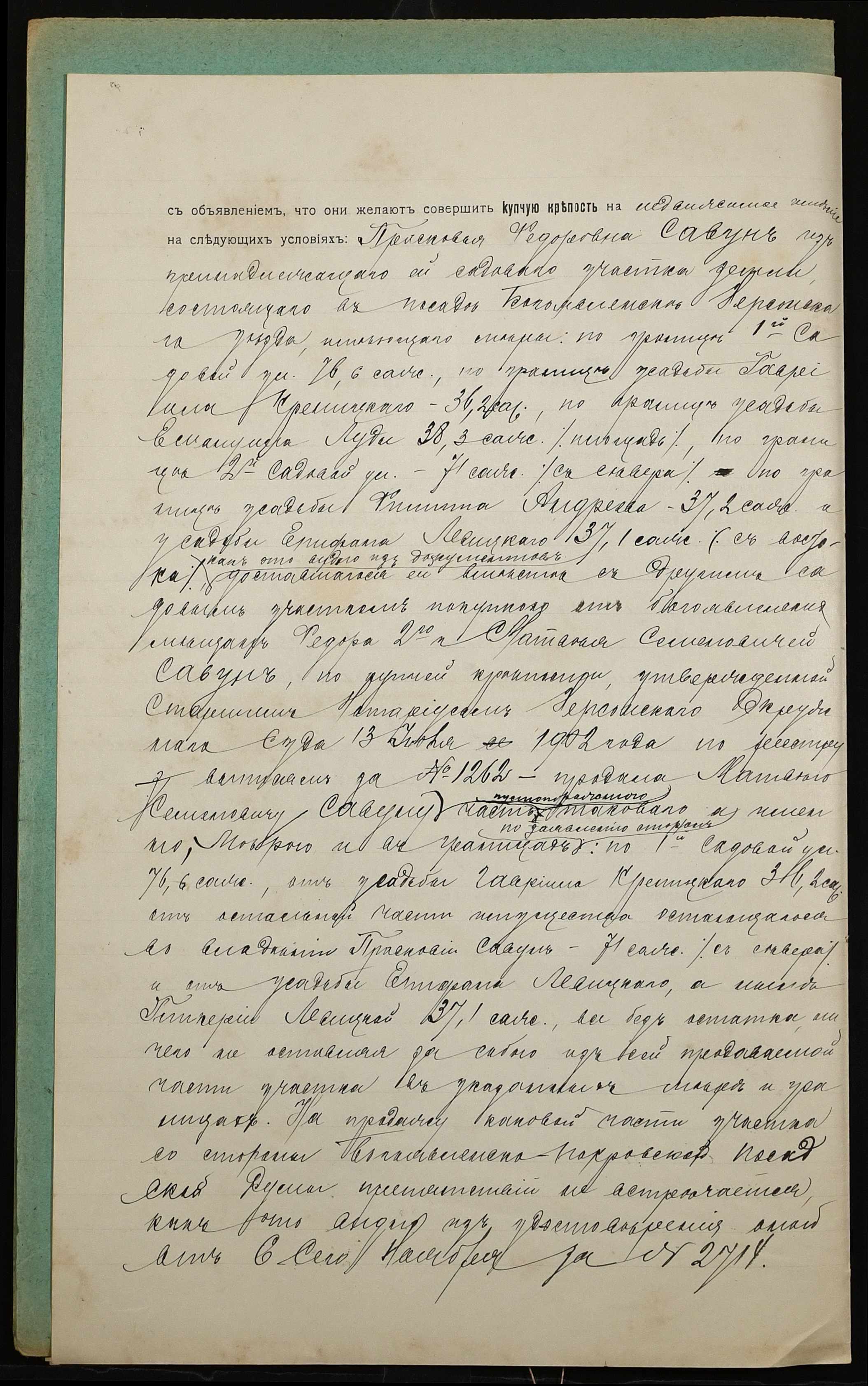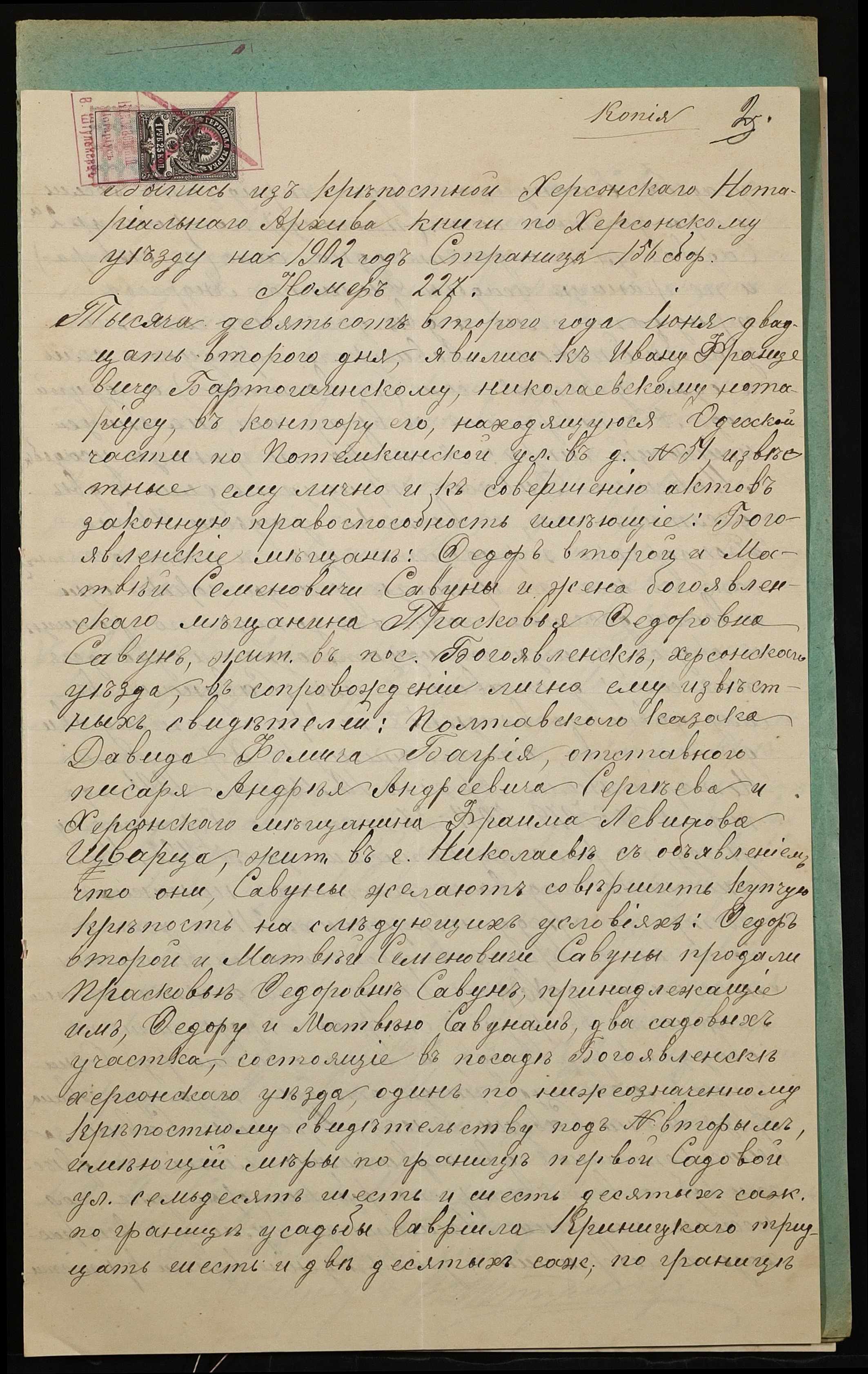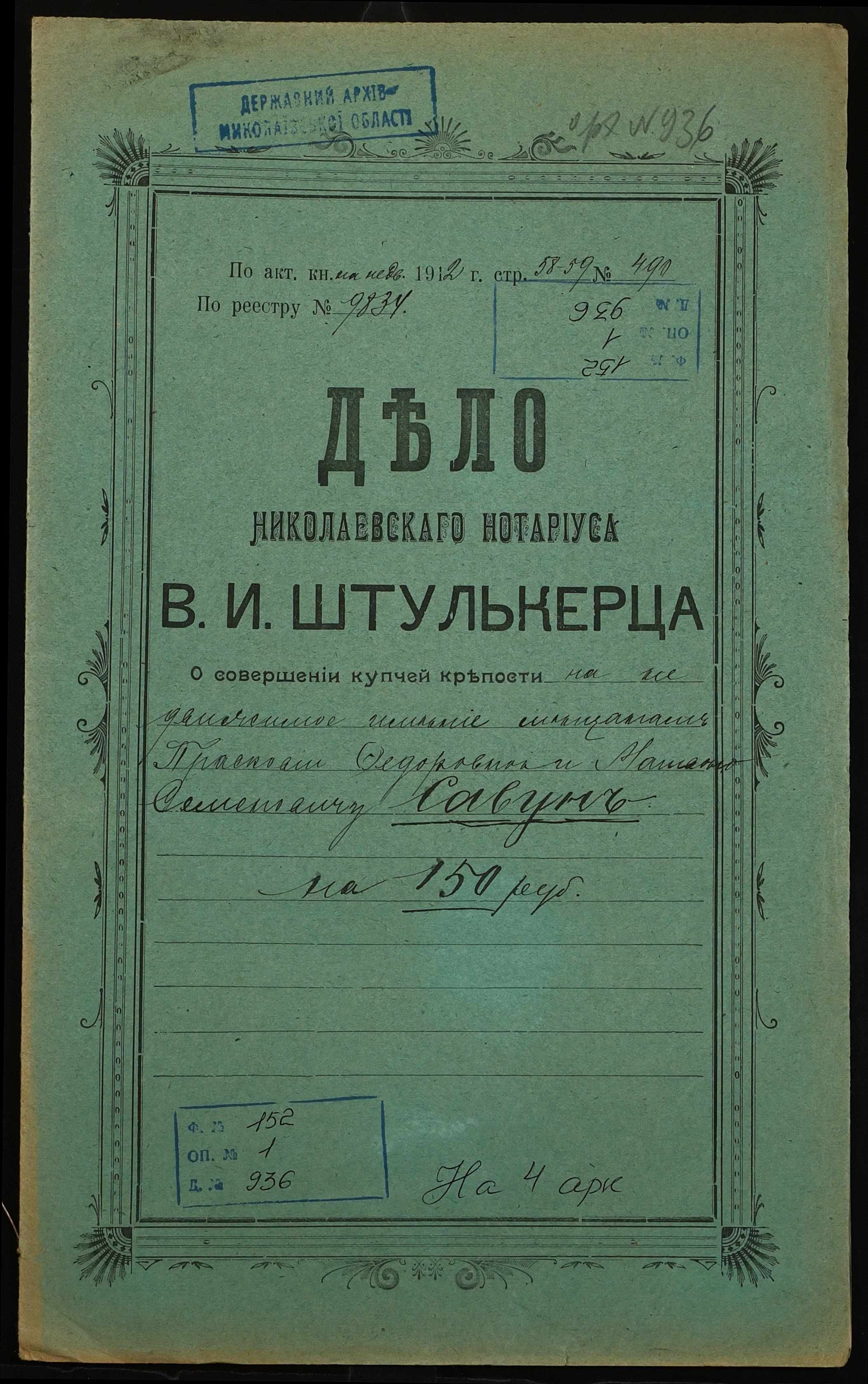 • • • • Справа № 936 “Справа про вчинення купчої про продаж нерухомого майна міщанкою Савун Парасковією Федорівною (Савун Прасковьей Федоровной) на користь міщанина Савуна Матвія Семеновича (Савуна Матвея Семеновича)”