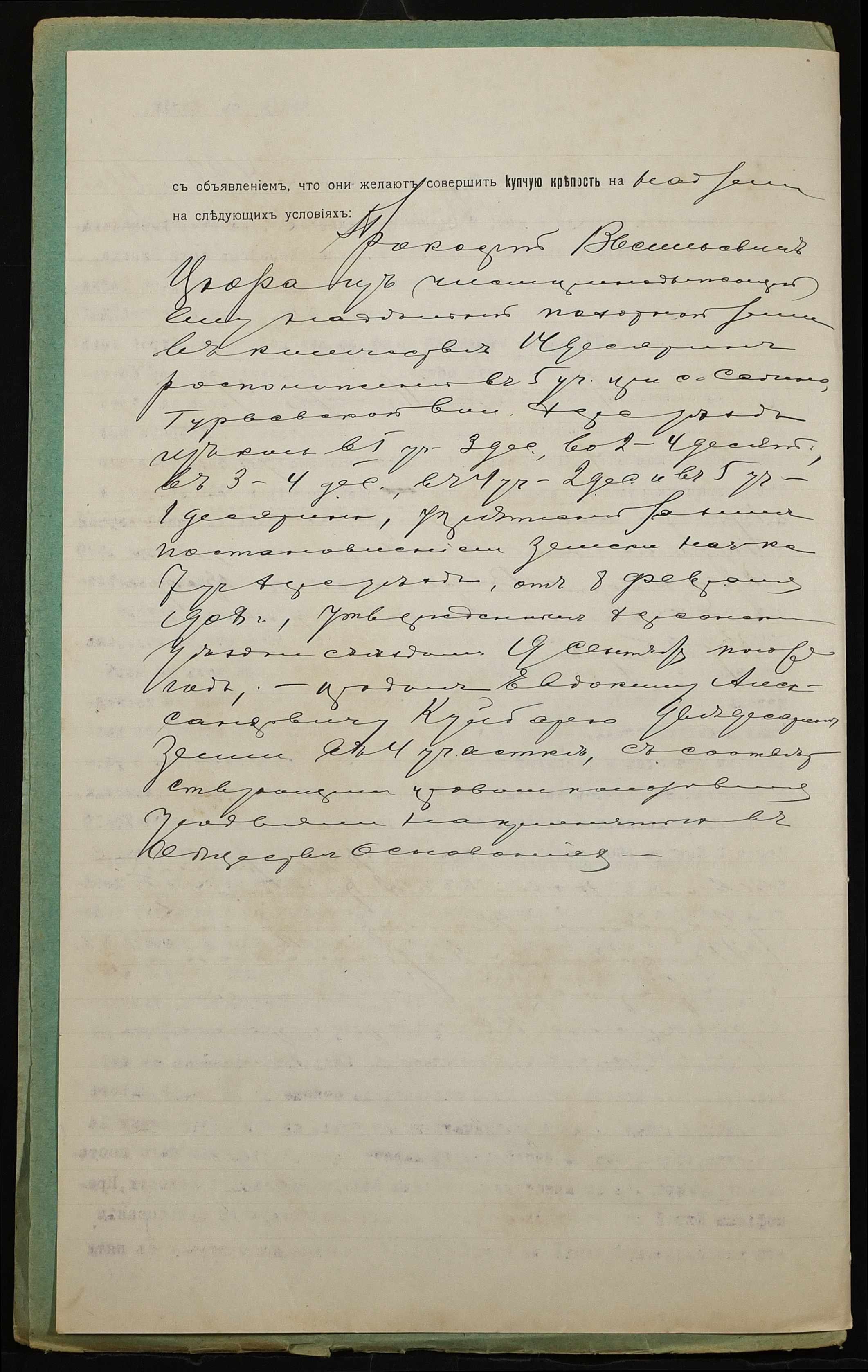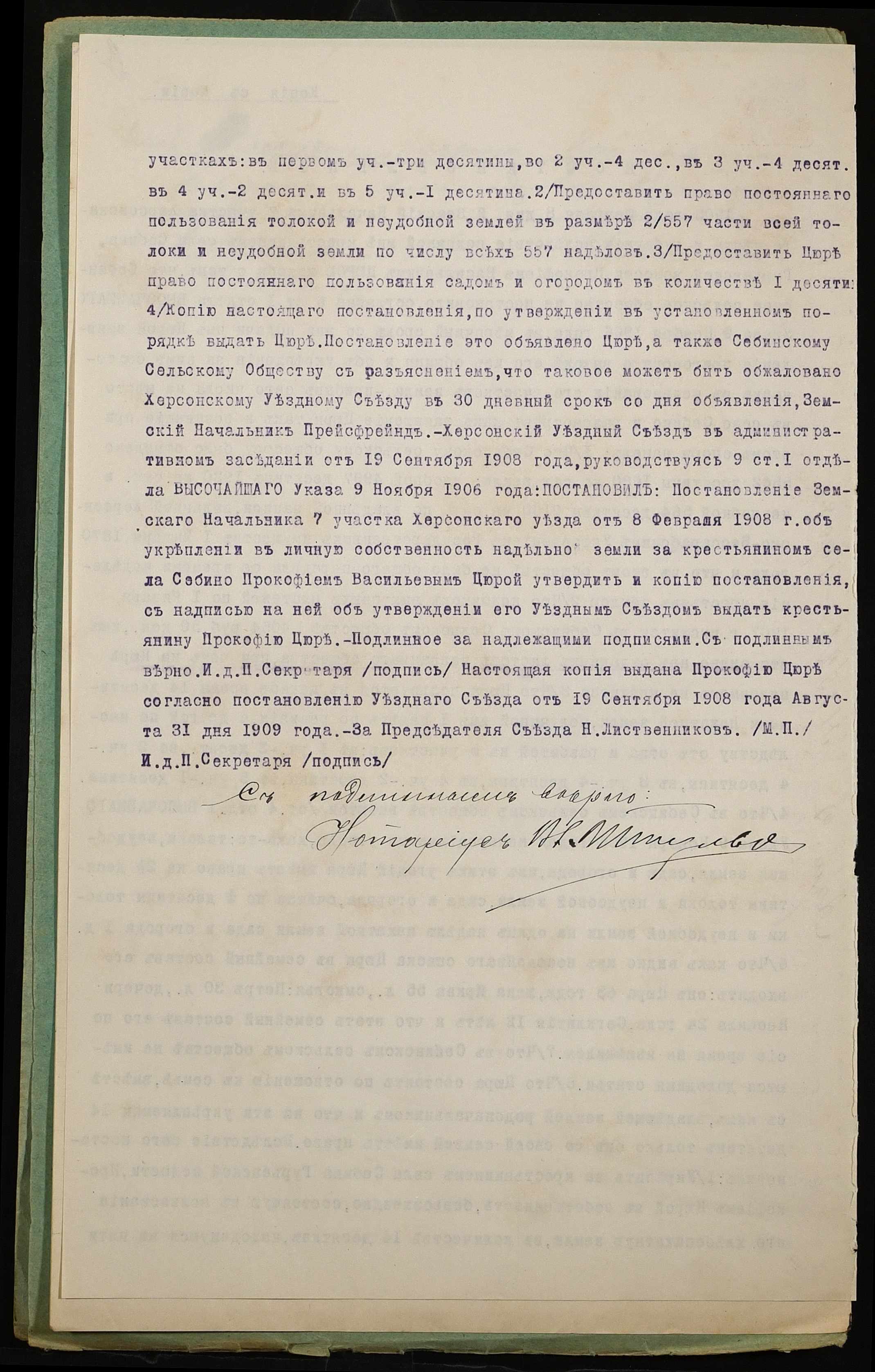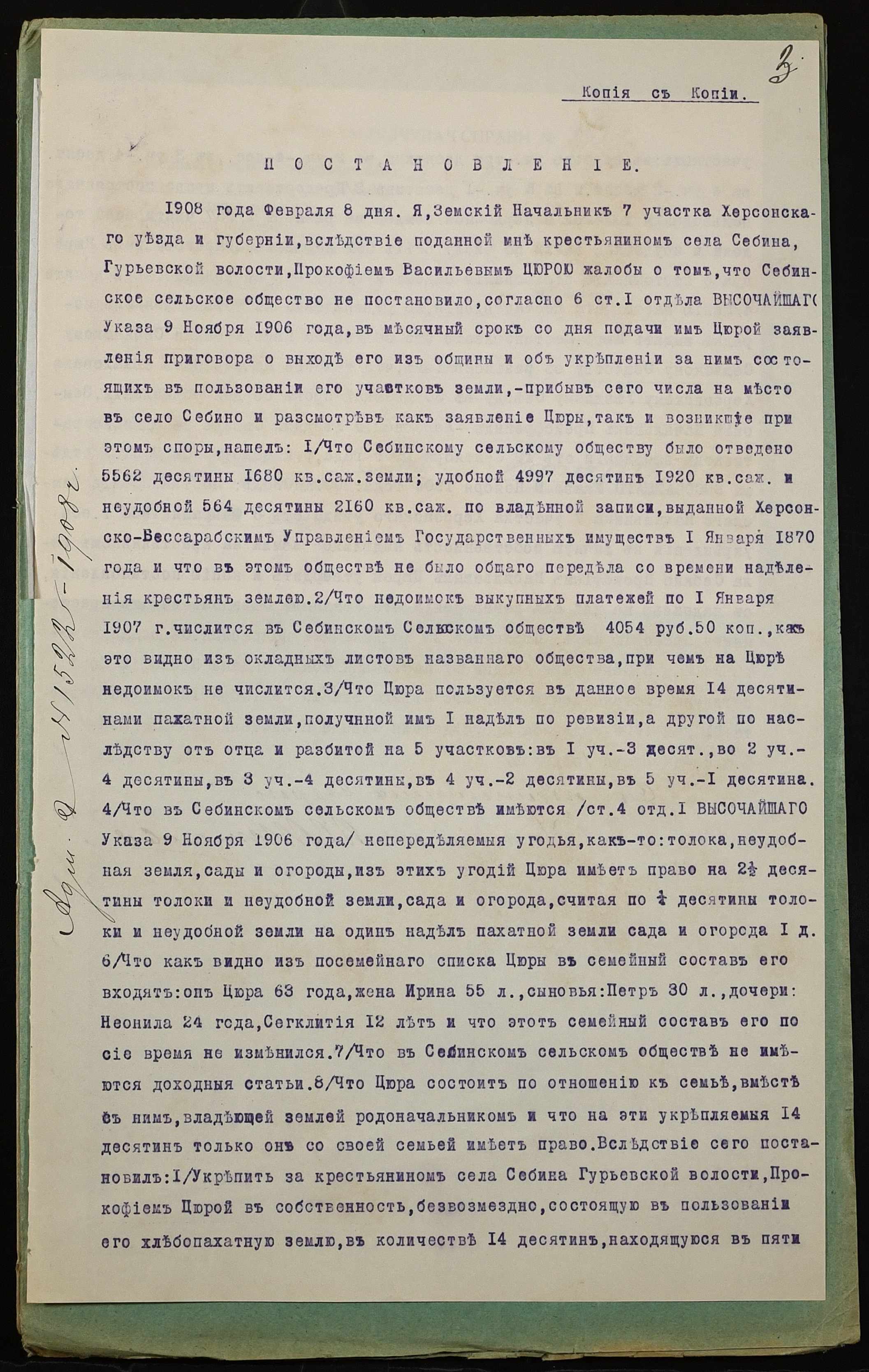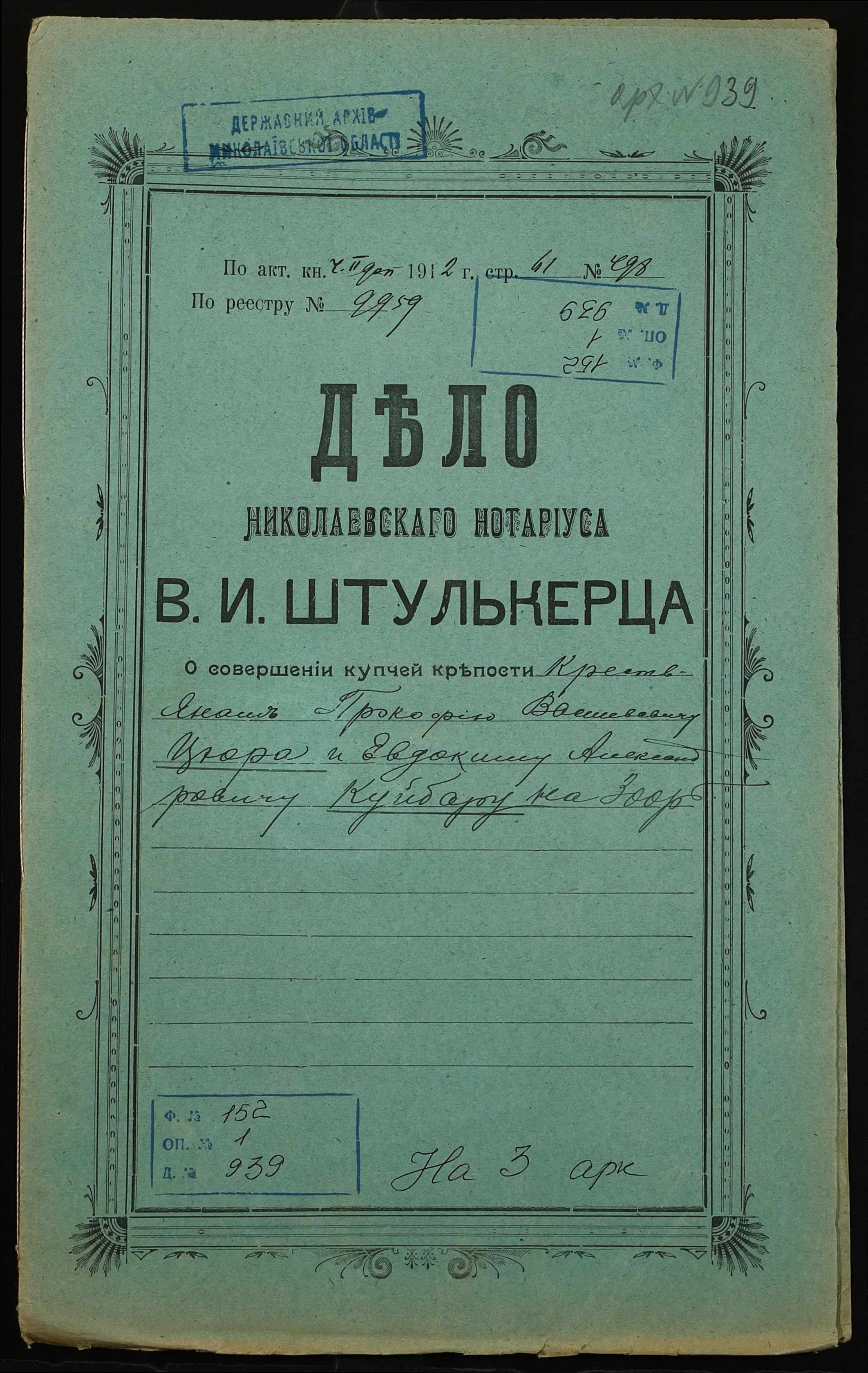 • • • • Справа № 939 “Справа про вчинення купчої про продаж землі селянином Цюрою Прокопом Васильовичем (Цюрой Прокофием Васильевичем) на користь селянина Куйбара Євдокима Олександровича (Куйбара Евдокима Александровича)”