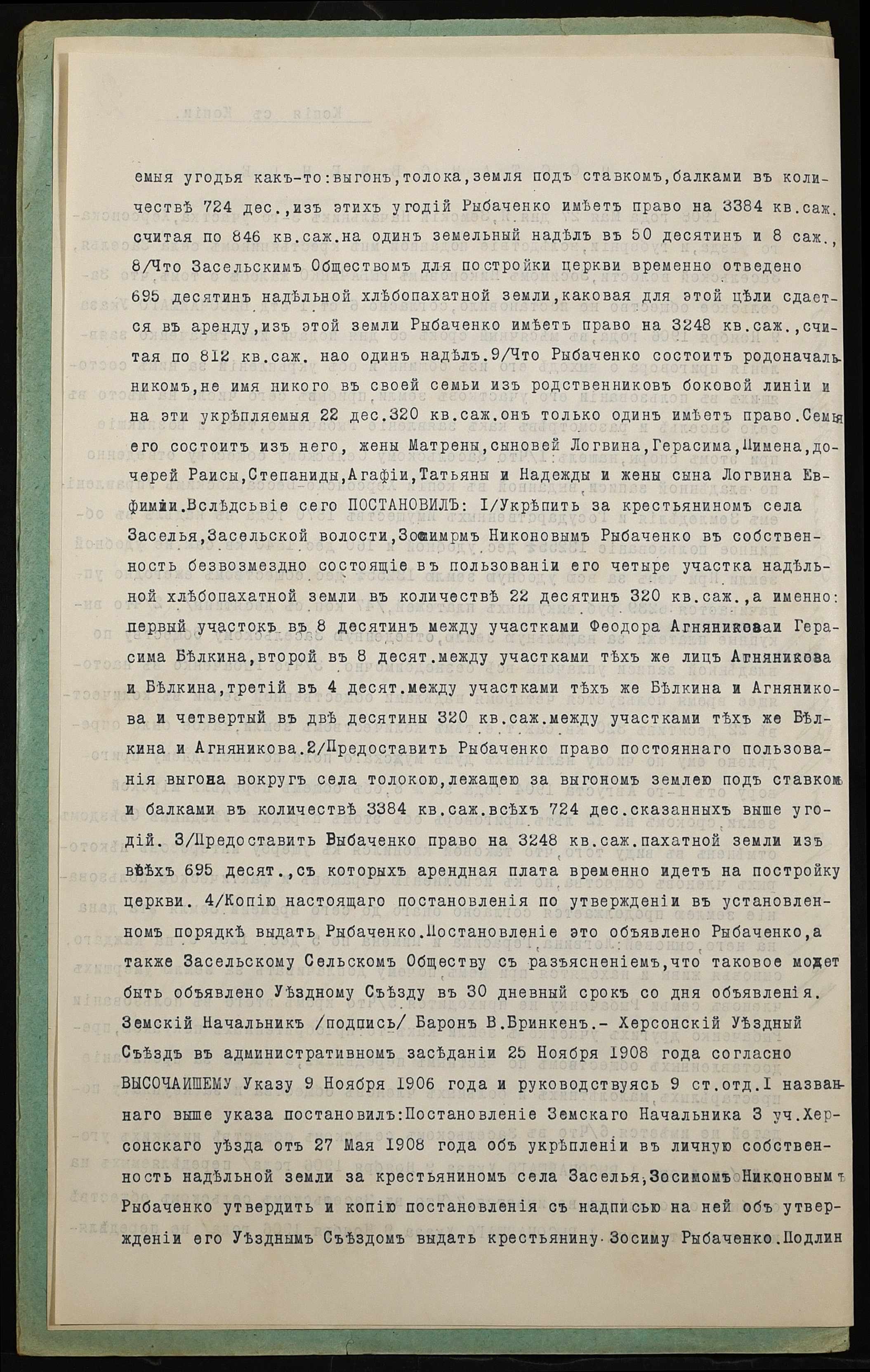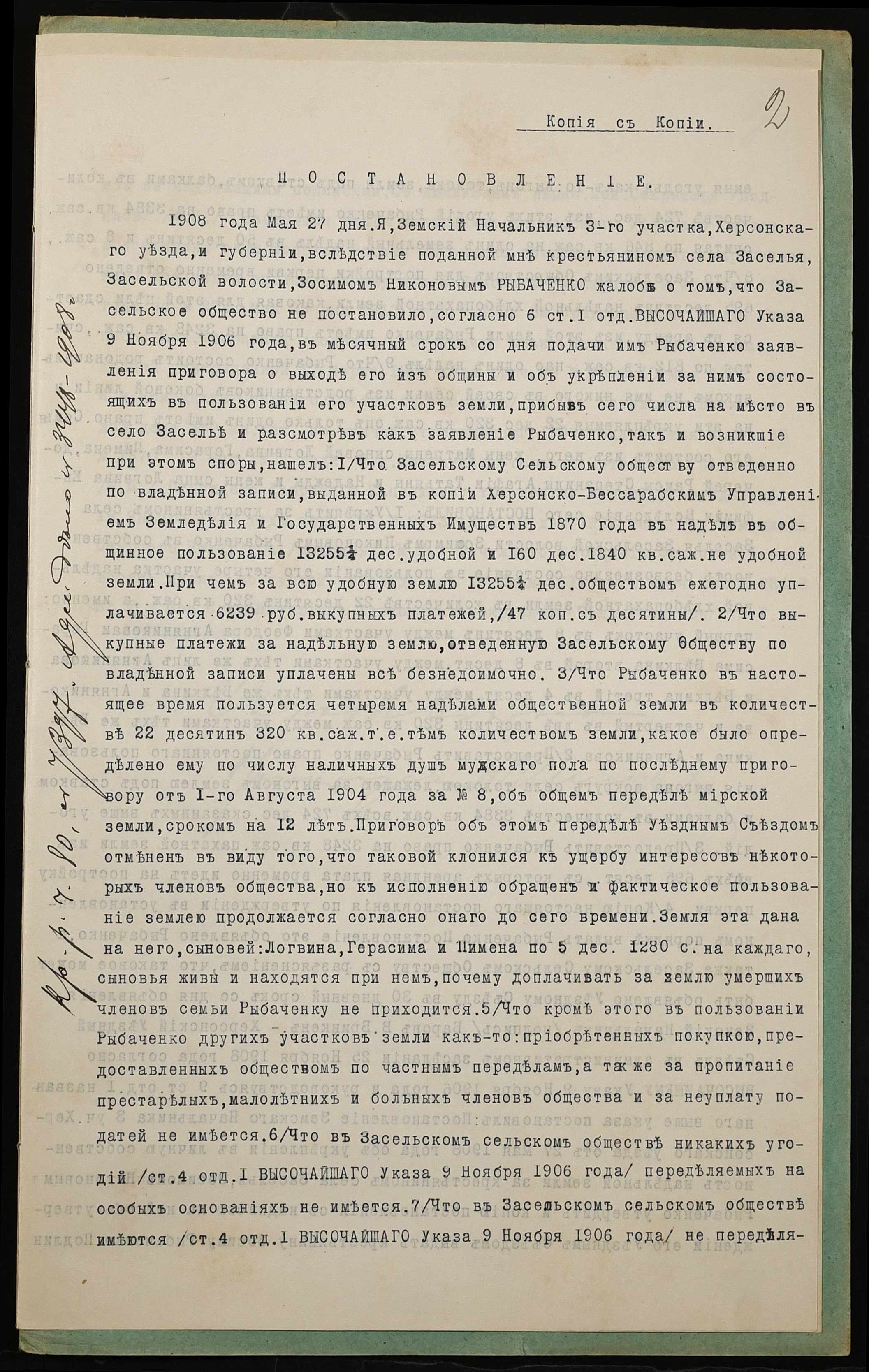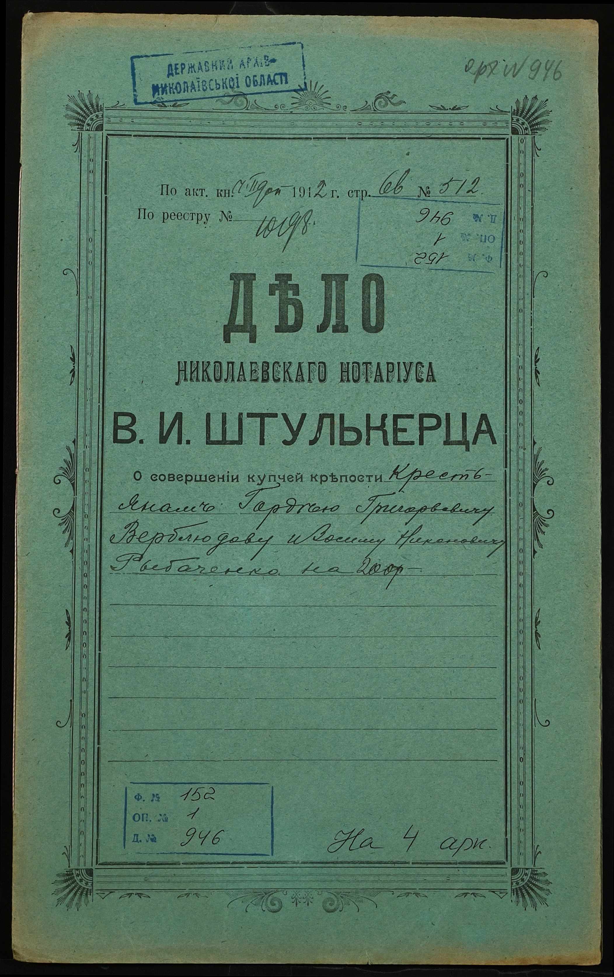 • • • • Справа № 946 “Справа про вчинення купчої про продаж землі селянином Верблюдовим Гордієм Григоровичем (Верблюдовым Гордеем Григорьевичем) на користь селянина Рибаченка Василя Никоновича (Рыбаченко Василия Никоновича)”