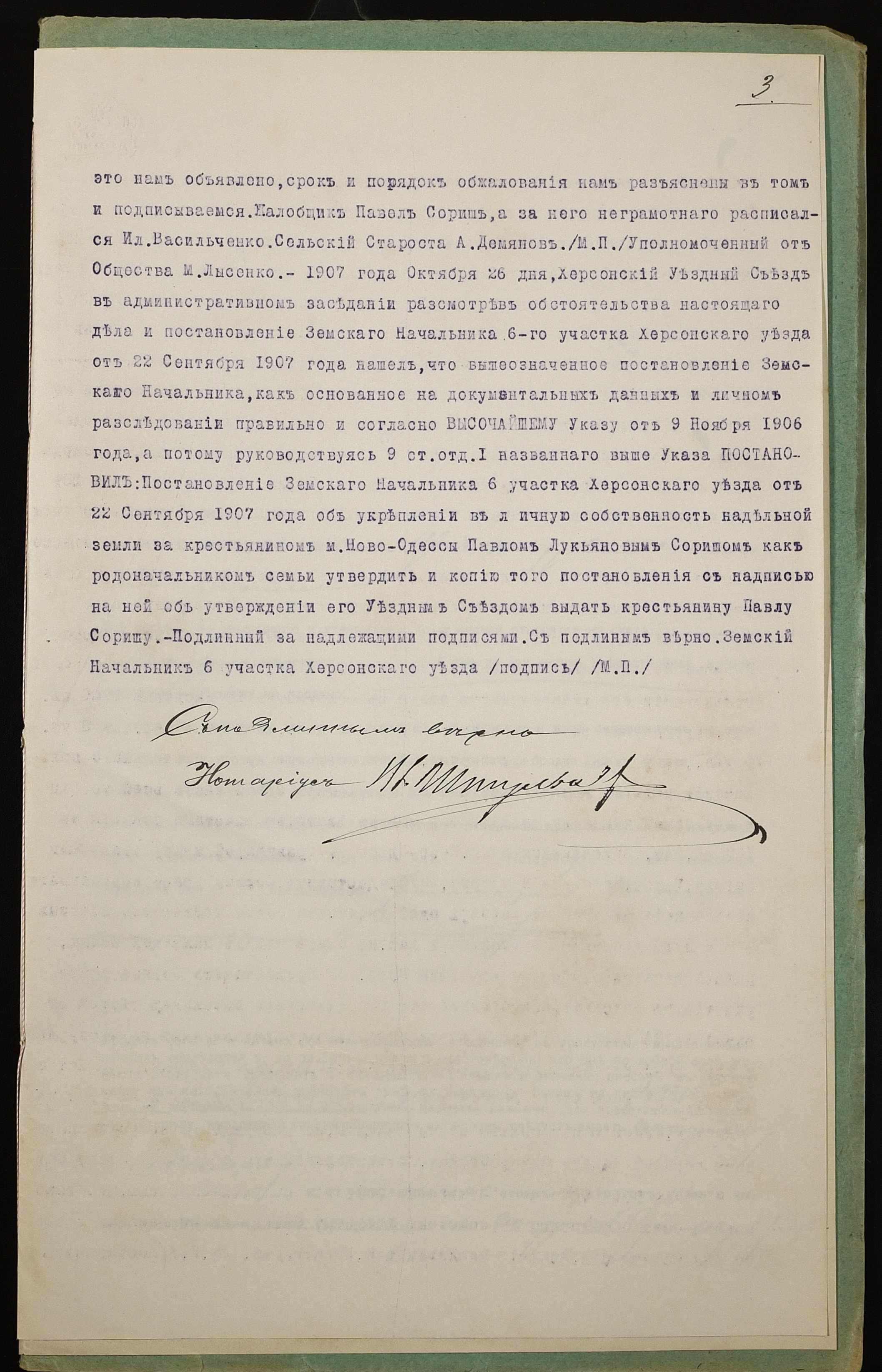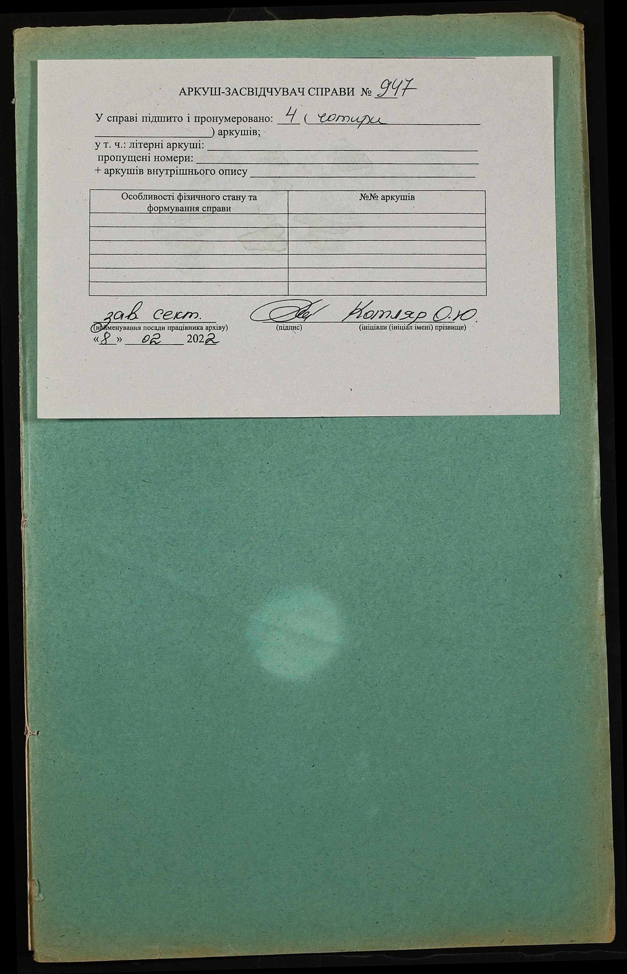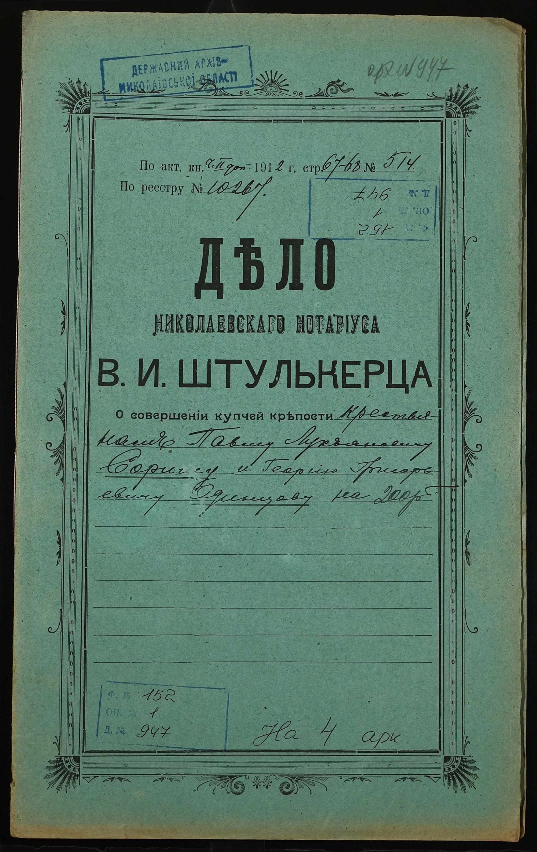 • • • • Справа № 947 “Справа про вчинення купчої про продаж землі селянином Соришем Павлом Лук’яновичем (Соришем Павлом Лукьяновичем) на користь селянина Одинцова Георгія Григоровича (Одинцова Георгия Григорьевича)”