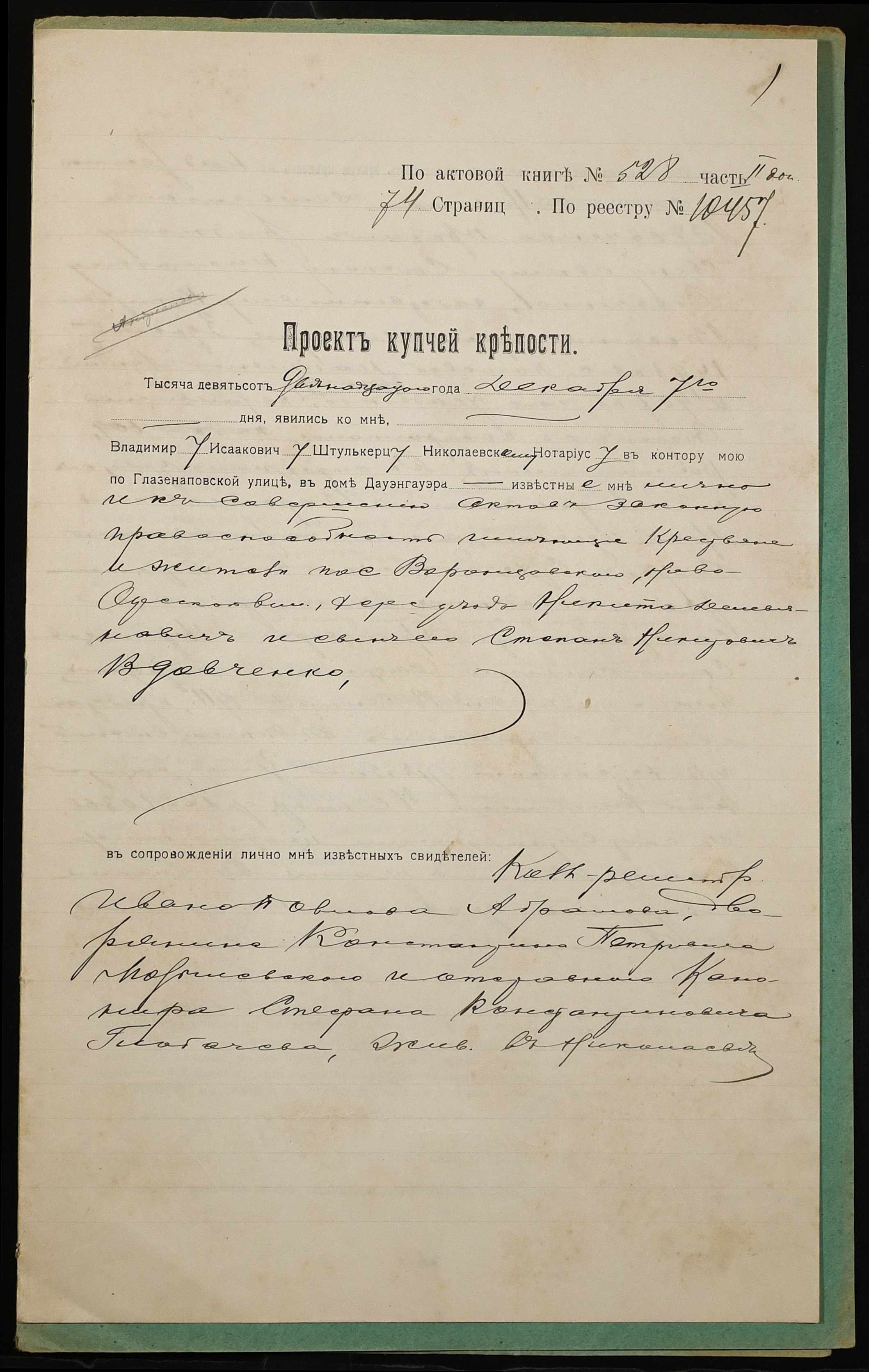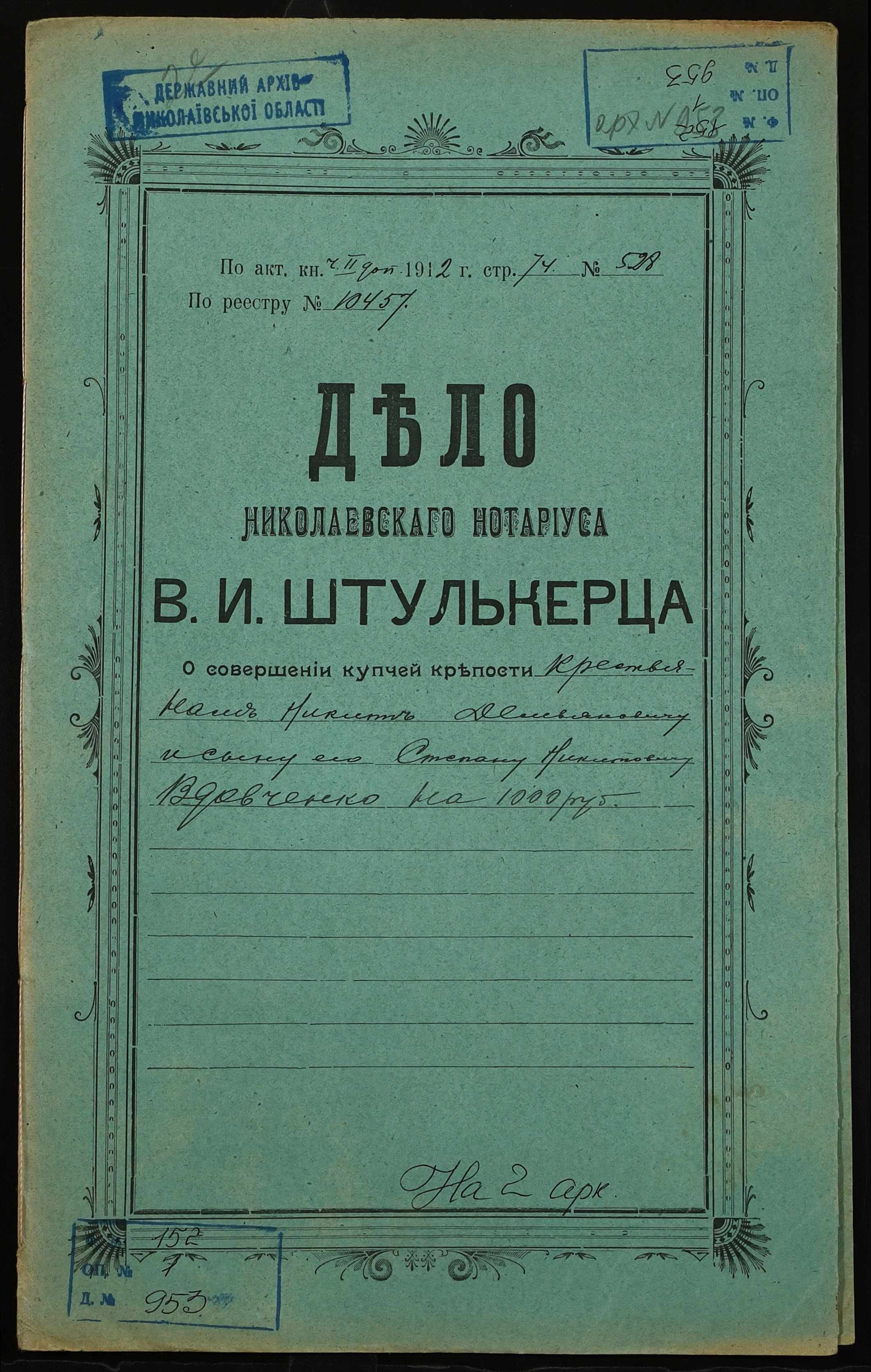 ◦ ◦ Фонд № 152 “Контора миколаївського нотаріуса Херсонського окружного суду Штулькерца Володимира Ісааковича”