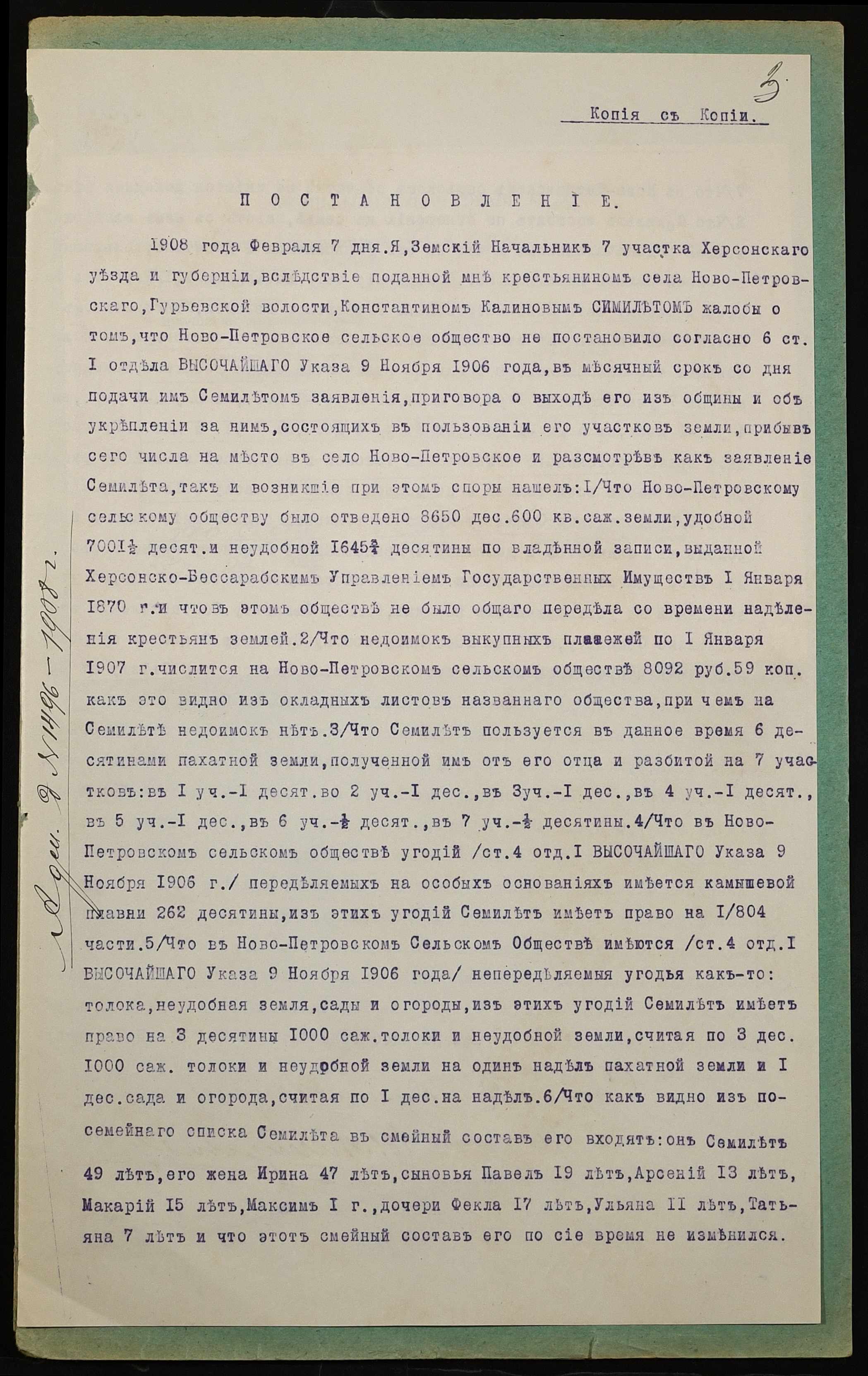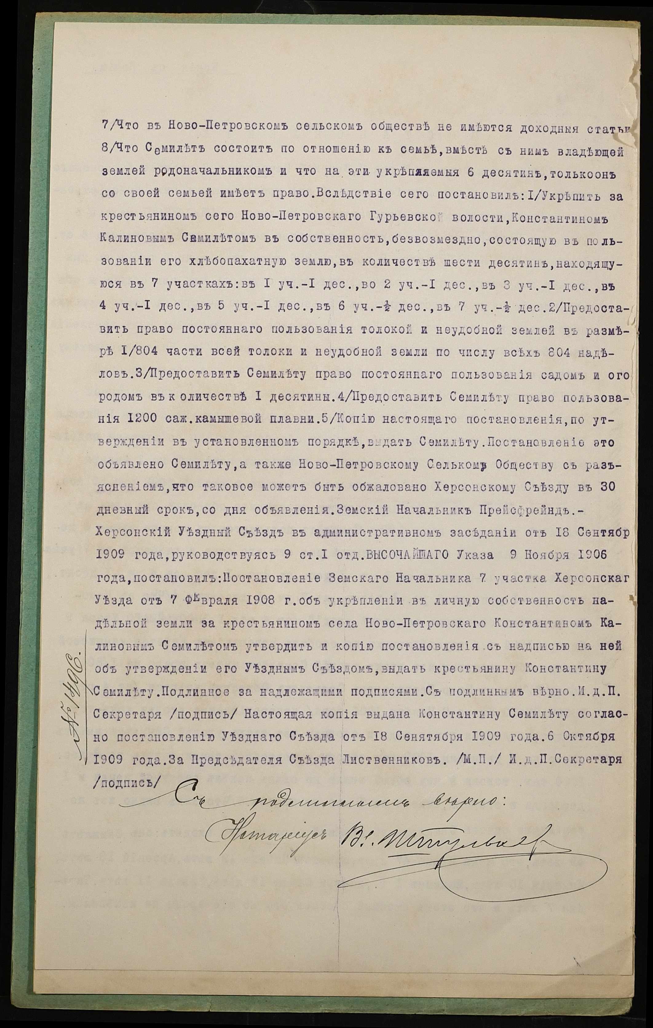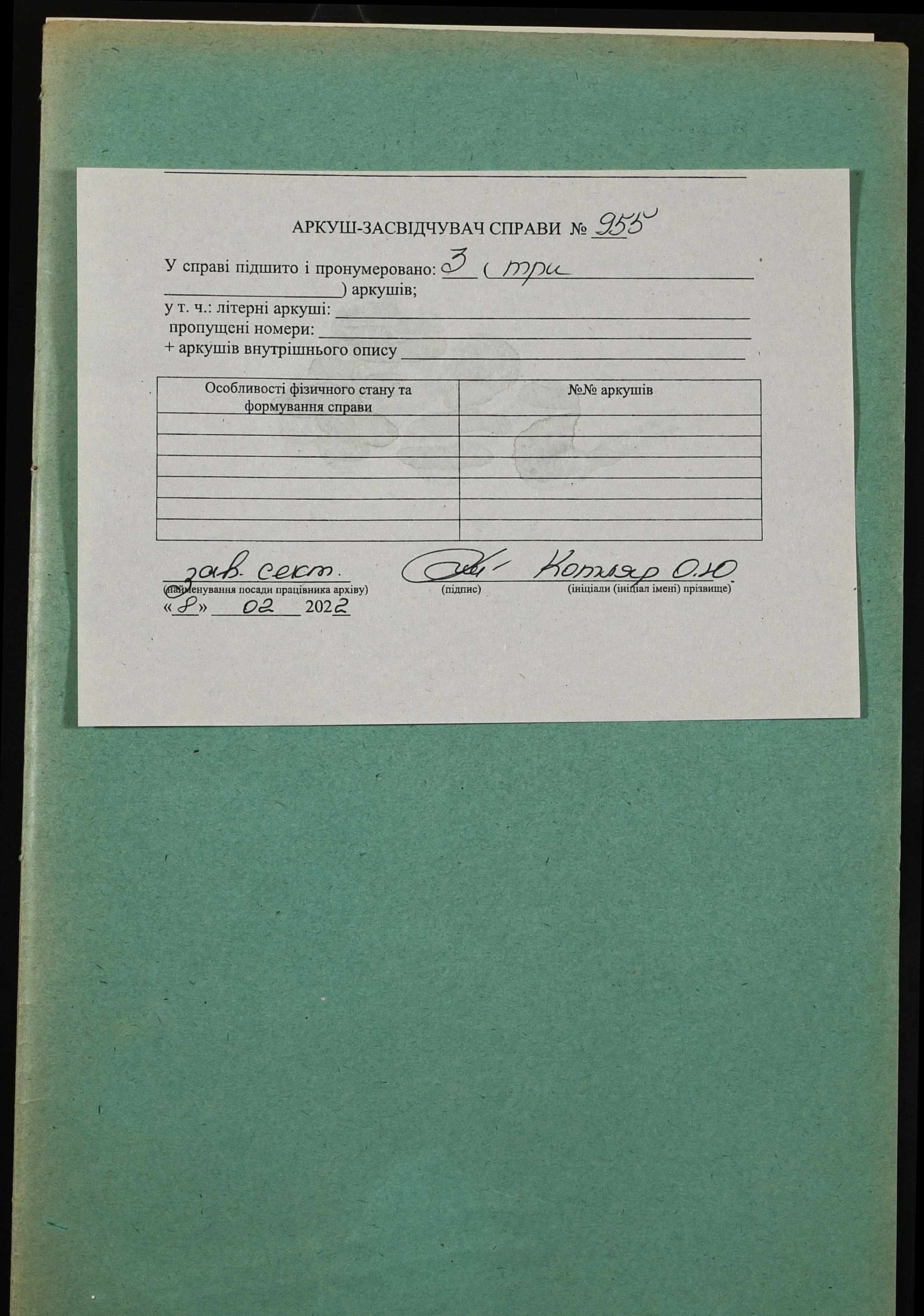 • • • • Справа № 955 “Справа про вчинення купчої про продаж землі селянином Семілетом Костянтином Калиновичем (Семилетом Константином Калиновичем) на користь селянина Одинцова Олександра Григоровича (Одинцова Александра Григорьевича)”