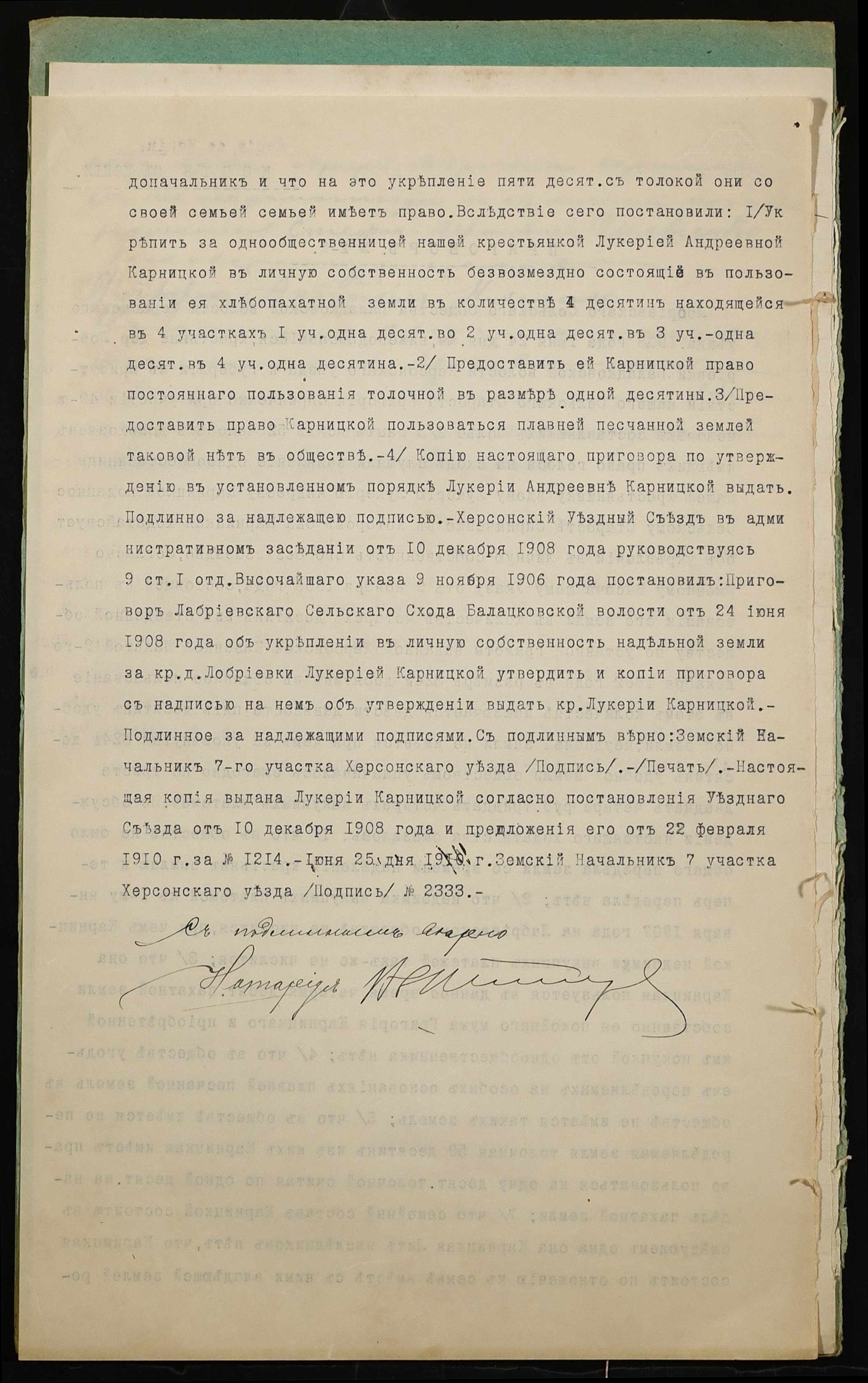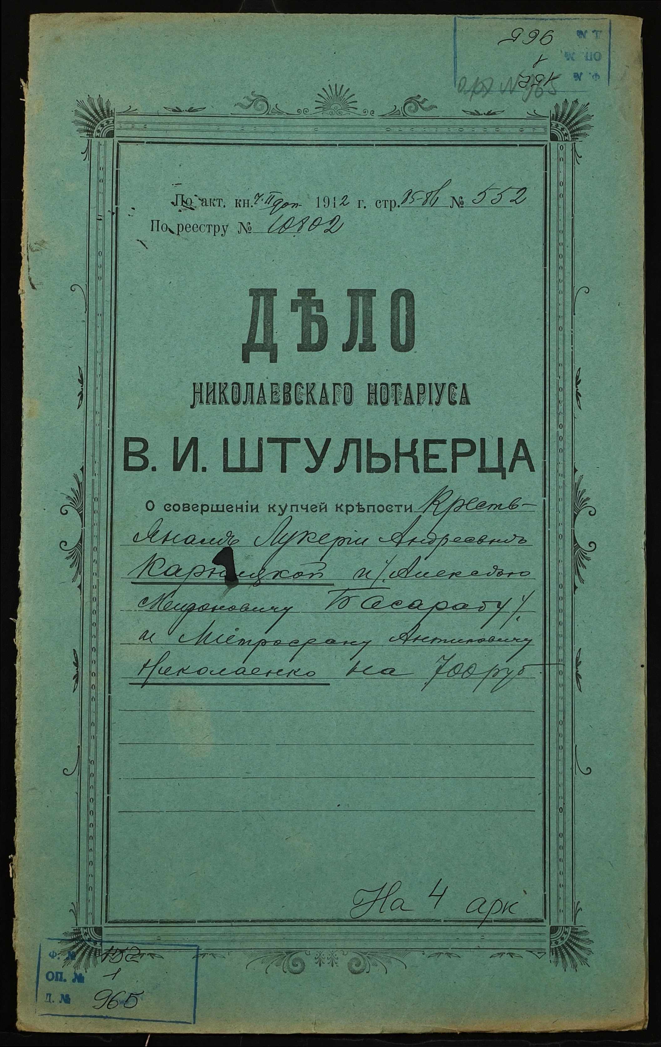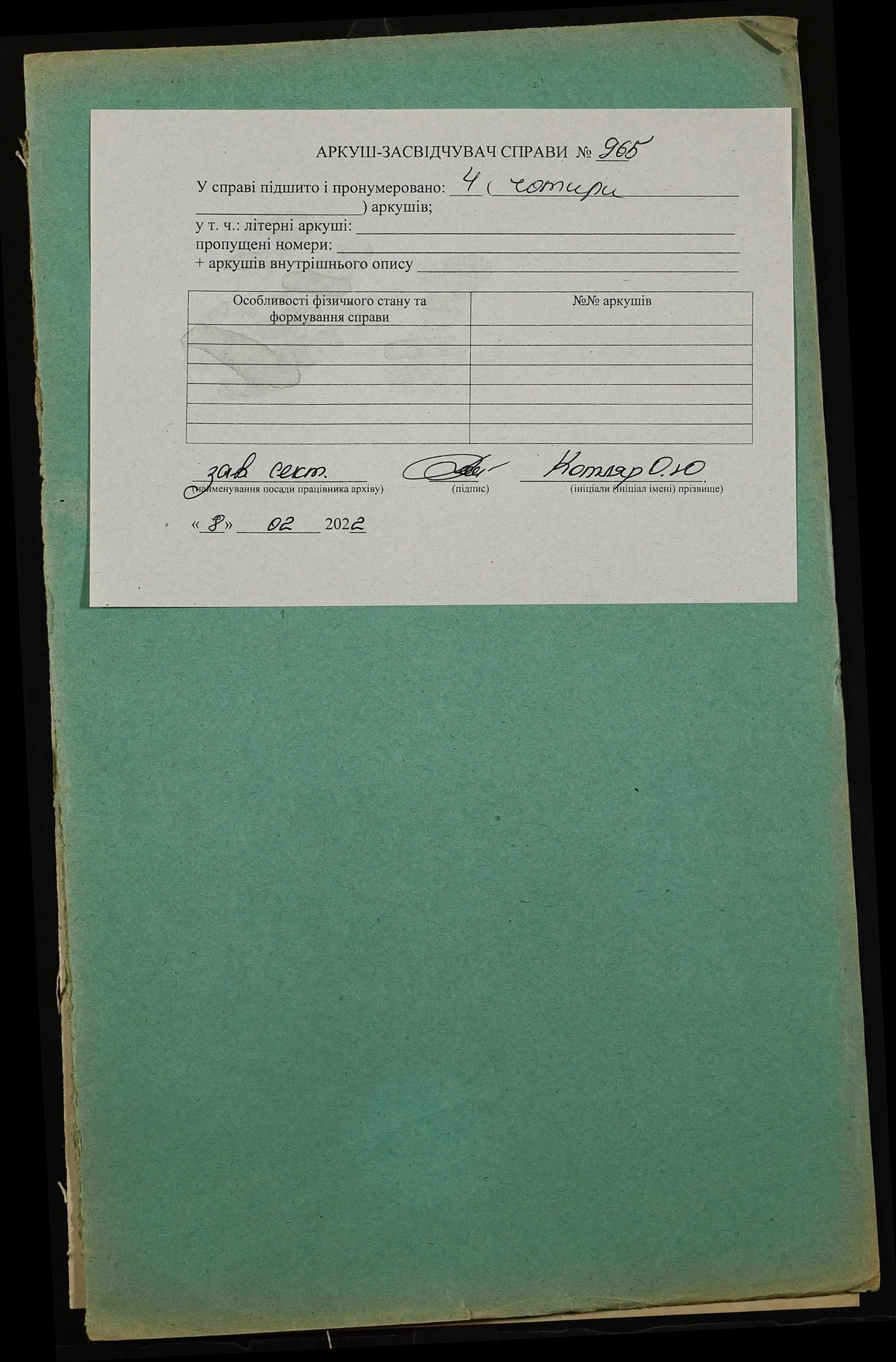 • • • • Справа № 965 “Справа про вчинення купчої про продаж землі селянкою Карницькою Лукерією Андріївною (Карницкой Лукерией Андреевной) на користь Бесараба Олексія Мироновича (Бессараба Алексея Мироновича), повіреного неповнолітнього селянина Ніколаєнка Митрофана Антиповича (Николаенко Митрофана Антиповича)”