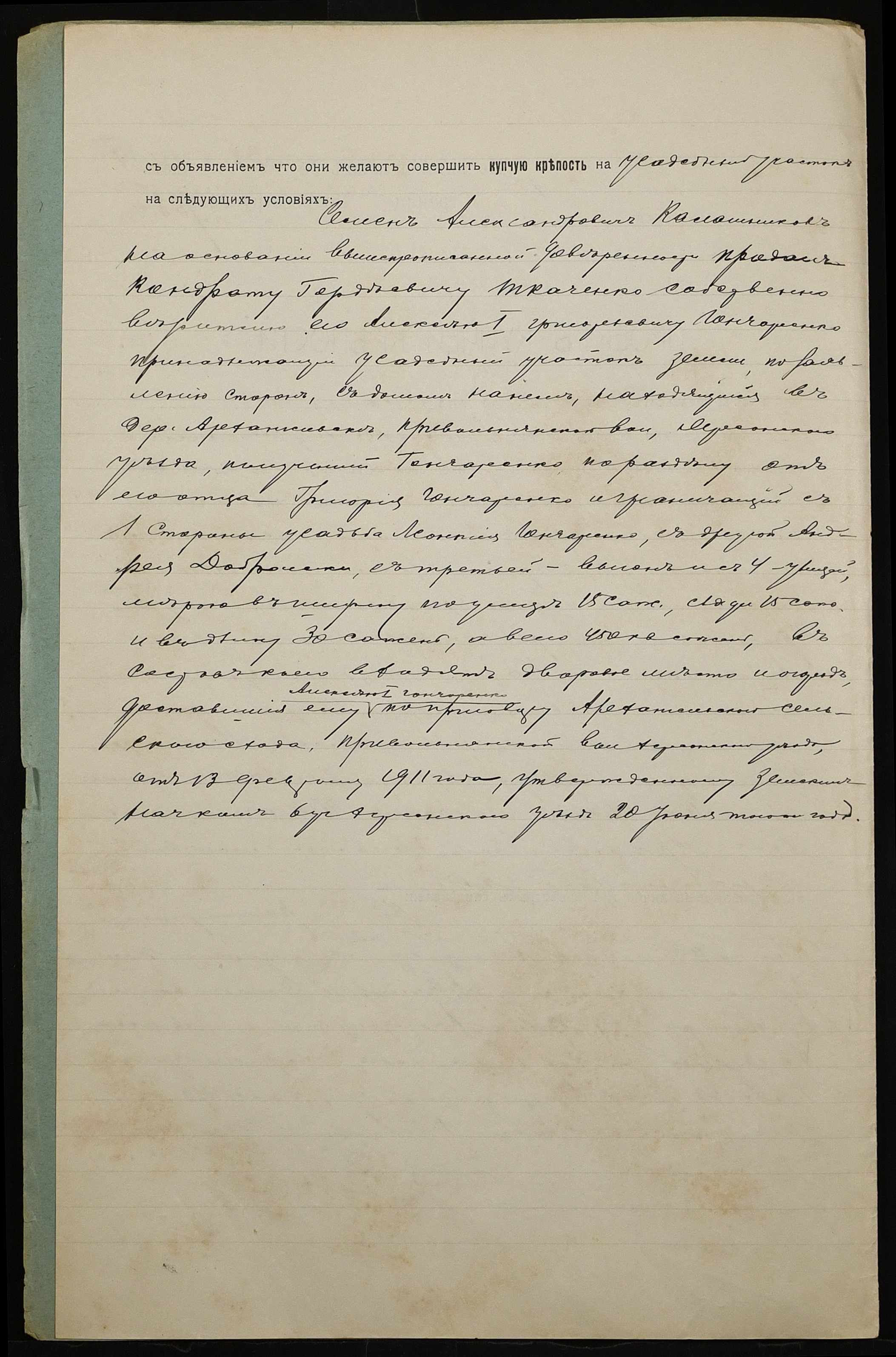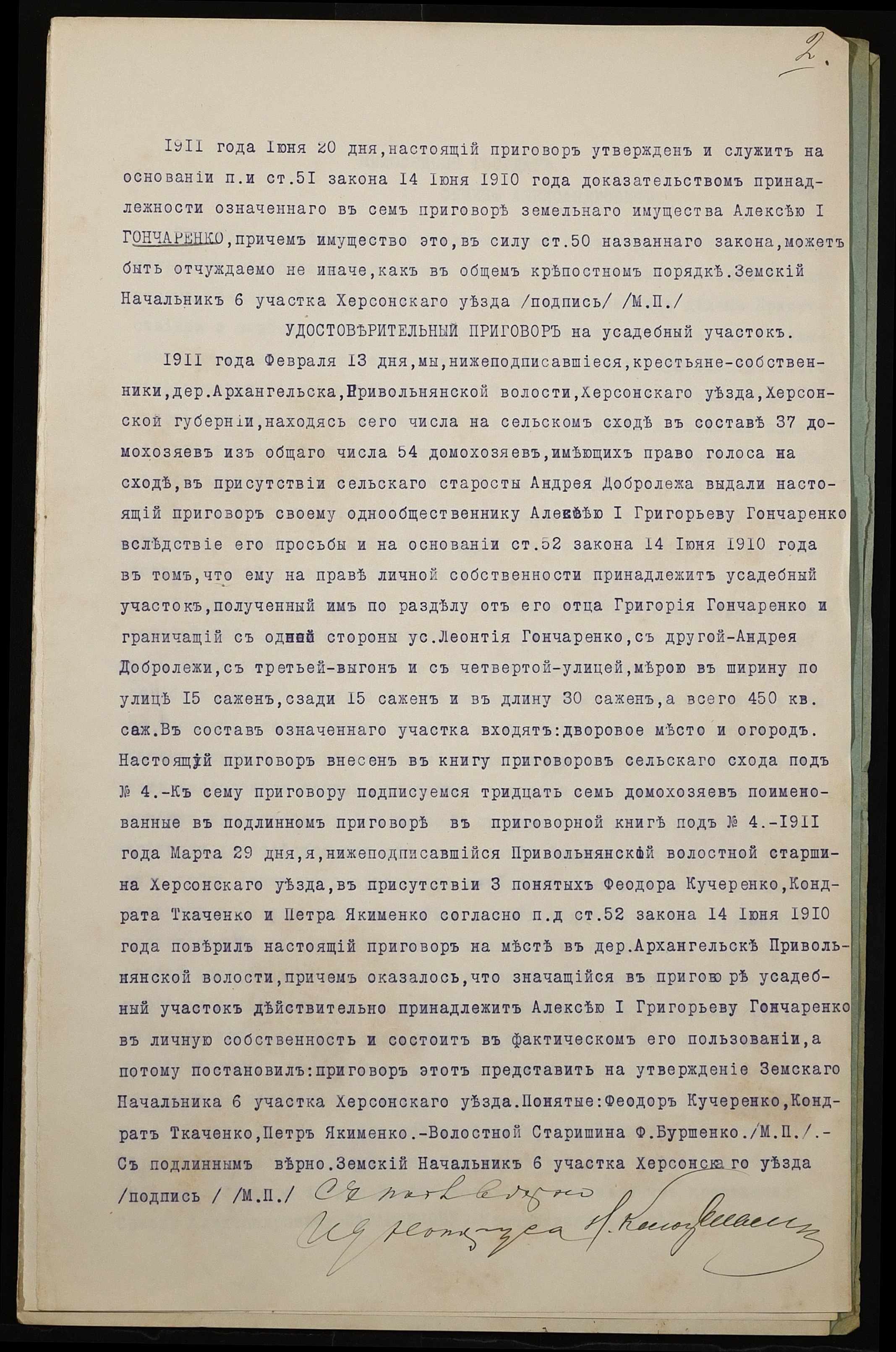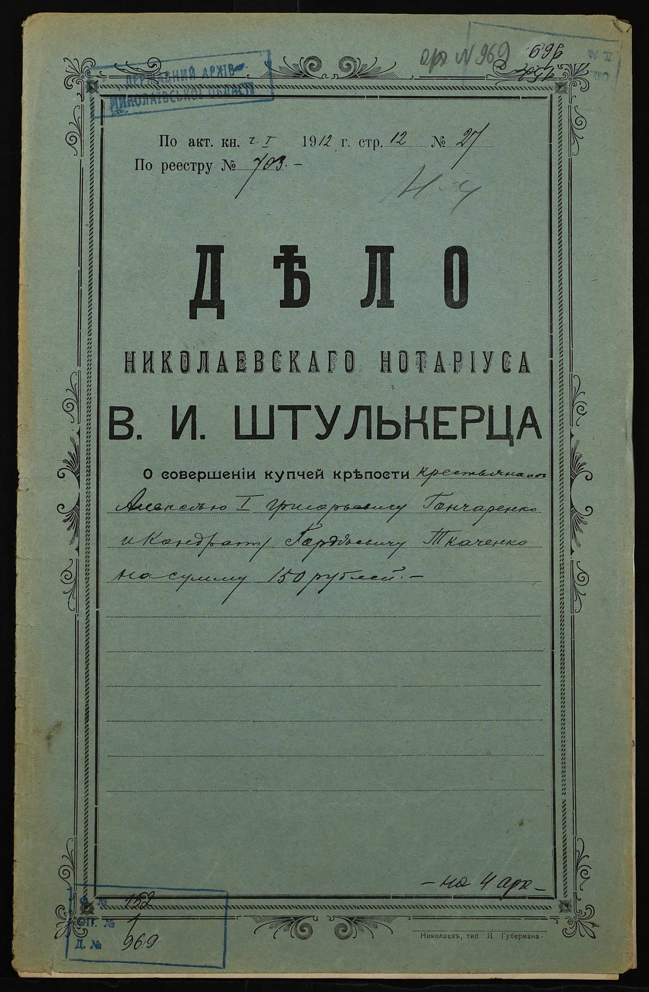 • • • • Справа № 969 “Справа про вчинення купчої про продаж землі селянином Гончаренком Олексієм 1-им Григоровичем (Гончаренко Алексеем 1-ым Григорьевичем) на користь селянина Ткаченка Кіндрата Гордійовича (Ткаченко Кондрата Гордеевича)”