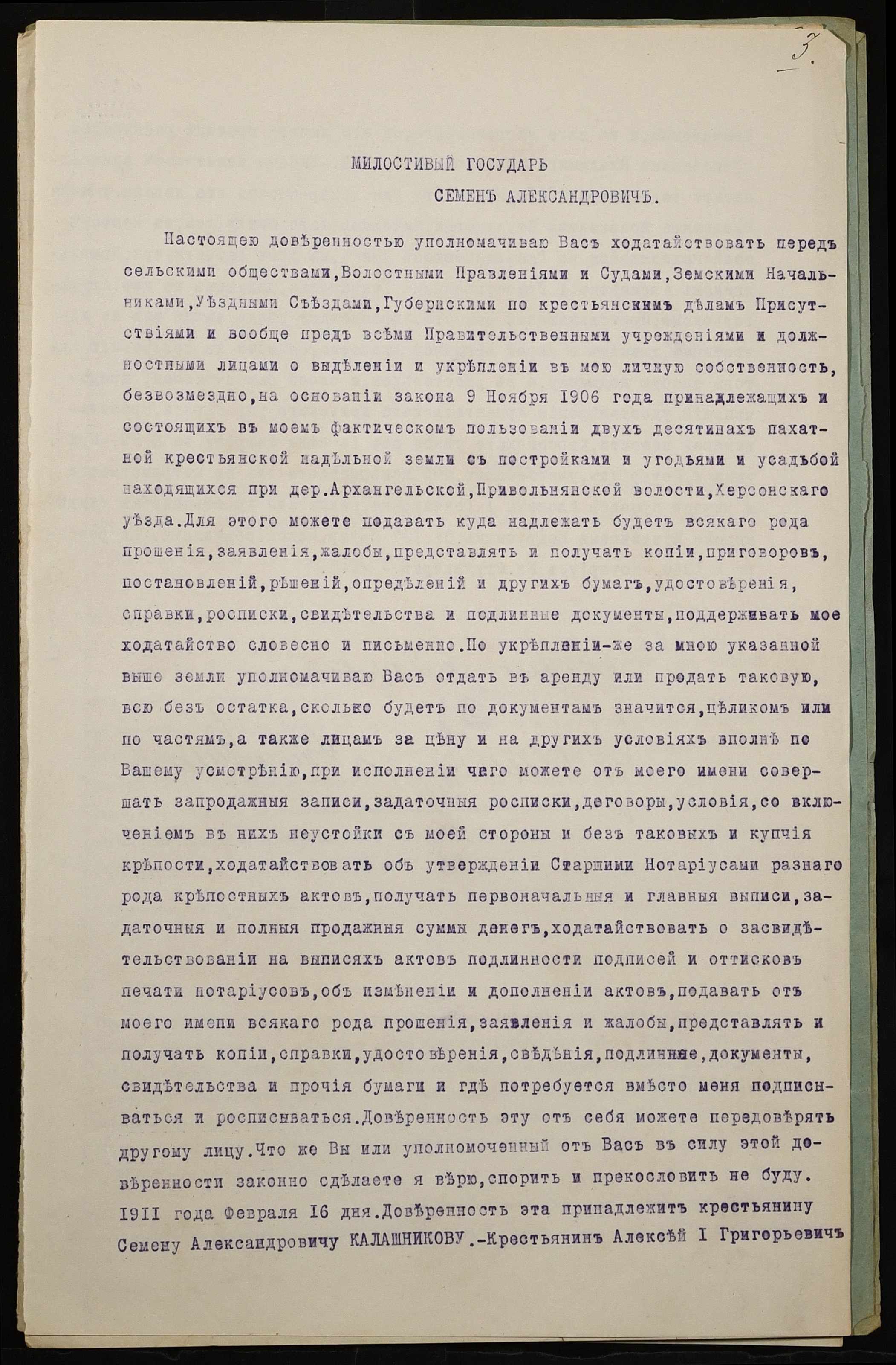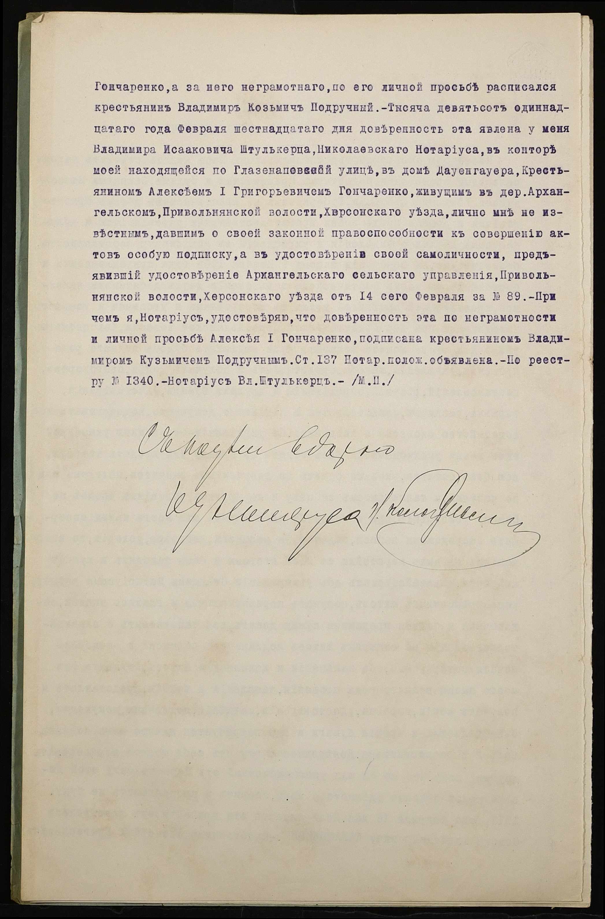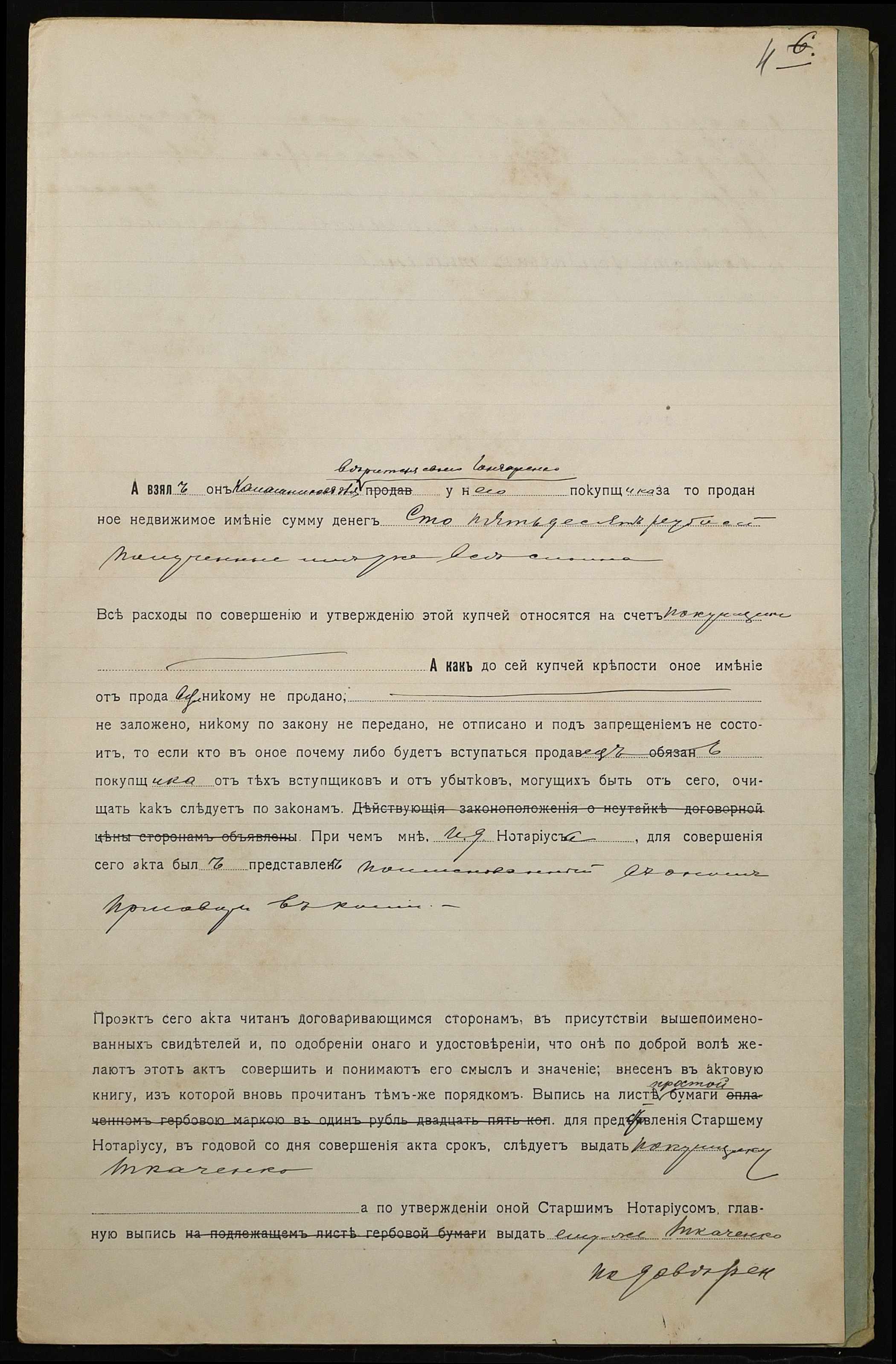 • • • • Справа № 969 “Справа про вчинення купчої про продаж землі селянином Гончаренком Олексієм 1-им Григоровичем (Гончаренко Алексеем 1-ым Григорьевичем) на користь селянина Ткаченка Кіндрата Гордійовича (Ткаченко Кондрата Гордеевича)”