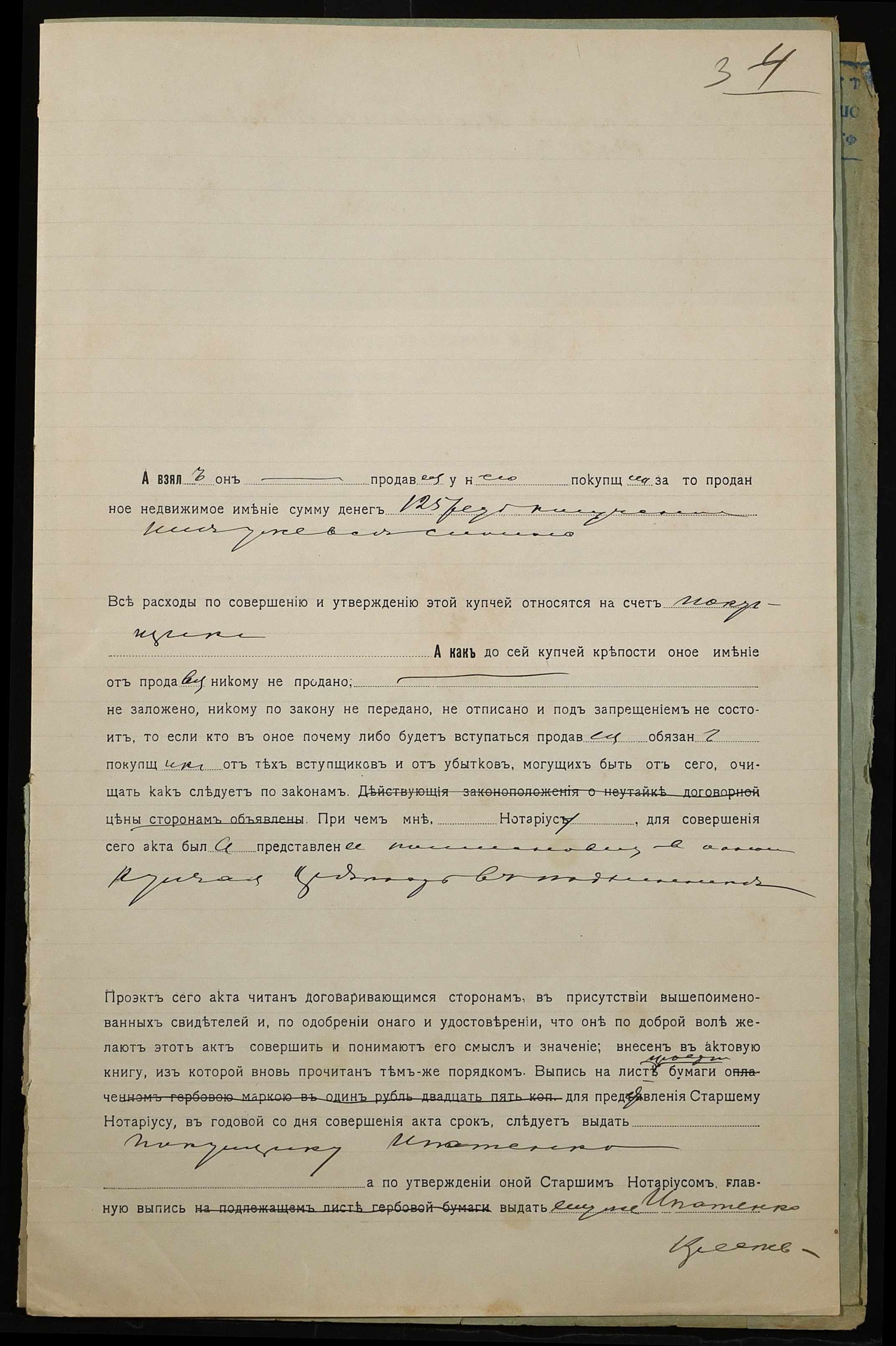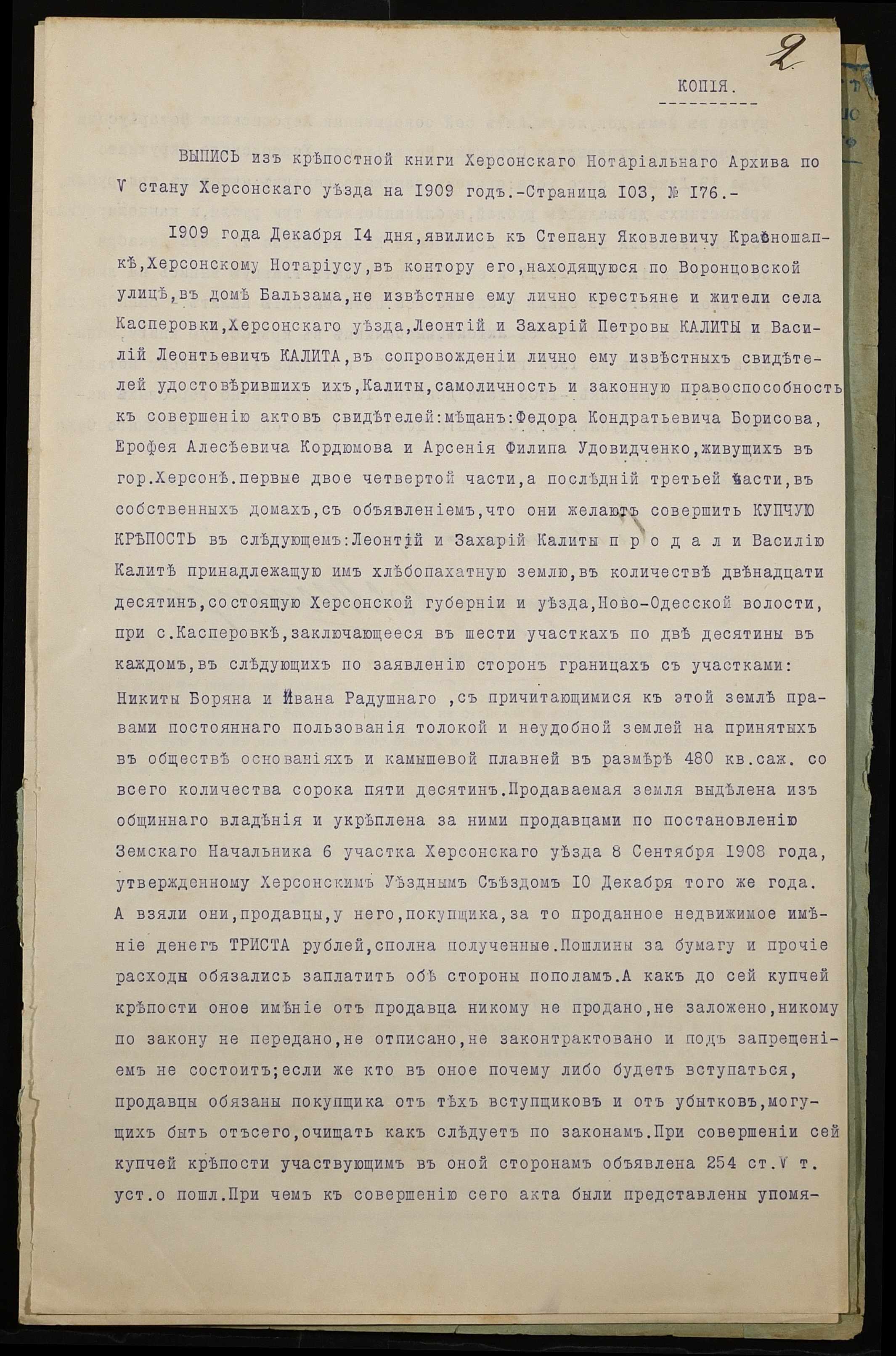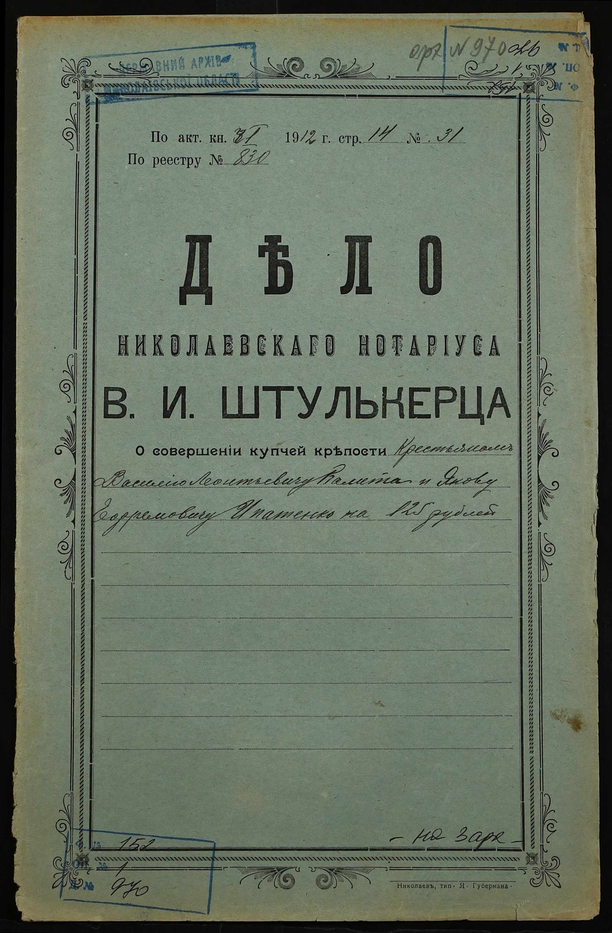 • • • • Справа № 970 “Справа про вчинення купчої про продаж землі селянином Калітою Василем Леонтійовичем (Калитой Василием Леонтьевичем) на користь селянина Іпатенка Якова Єфремовича (Ипатенко Якова Ефремовича)”